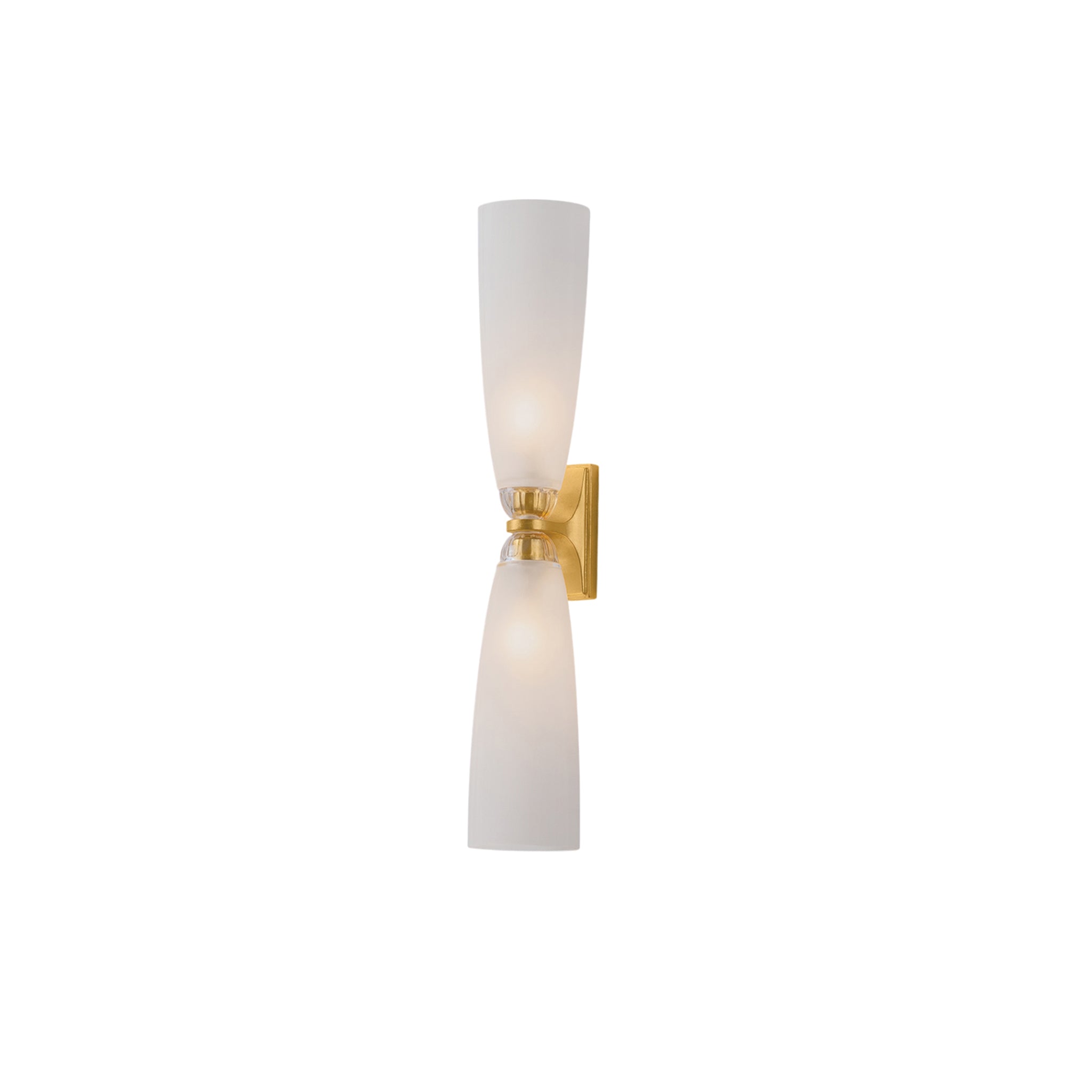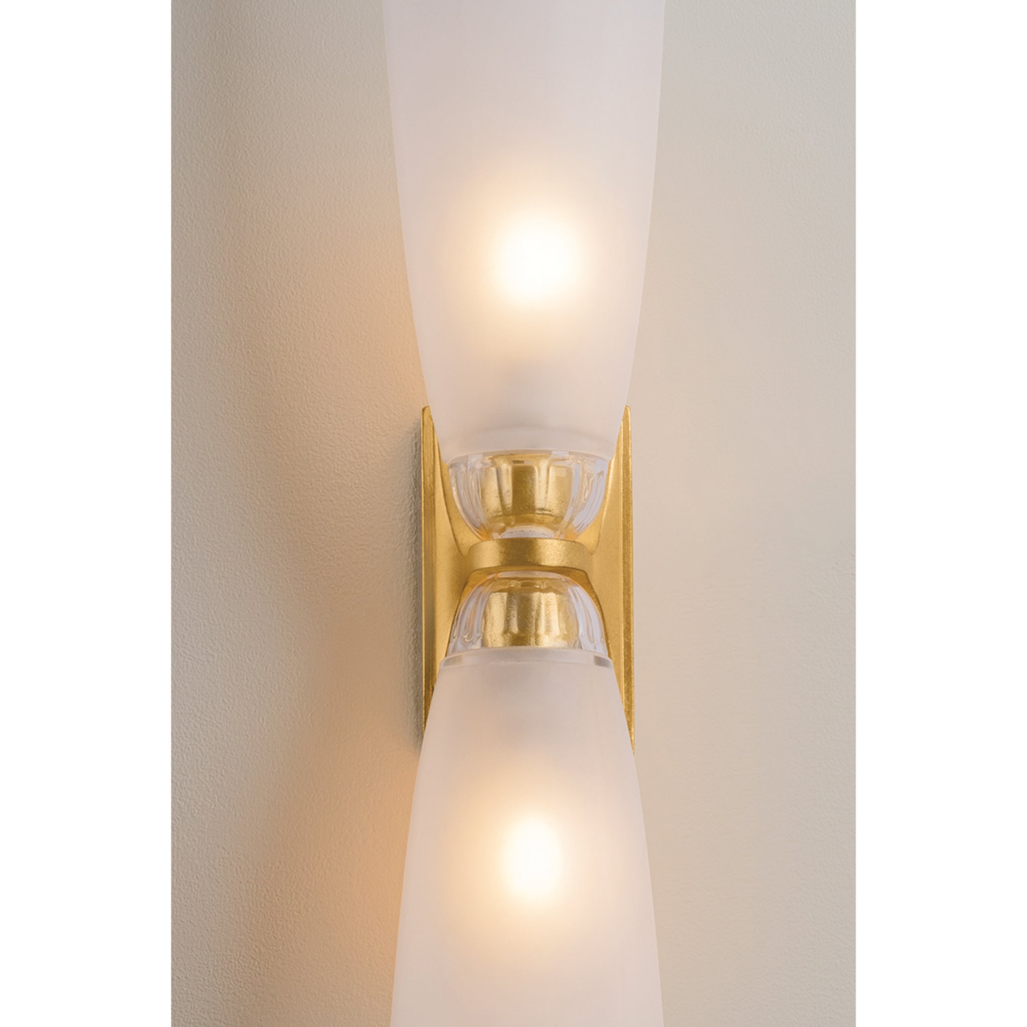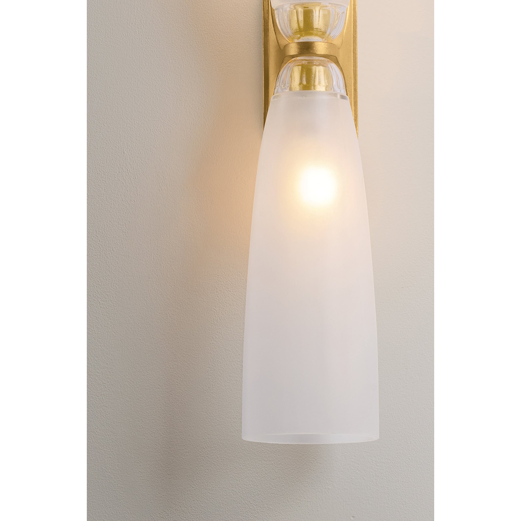 The Ravenswood sconce leans into pleasing symmetry. With one or two lights, this hallway-to-bath crossover features translucent clear etched glass that lets the light filter through with an inviting glow. The shades are supported by Vintage Gold Leaf-finished caps with rounded edges, adding a decorative, upscale flourish.