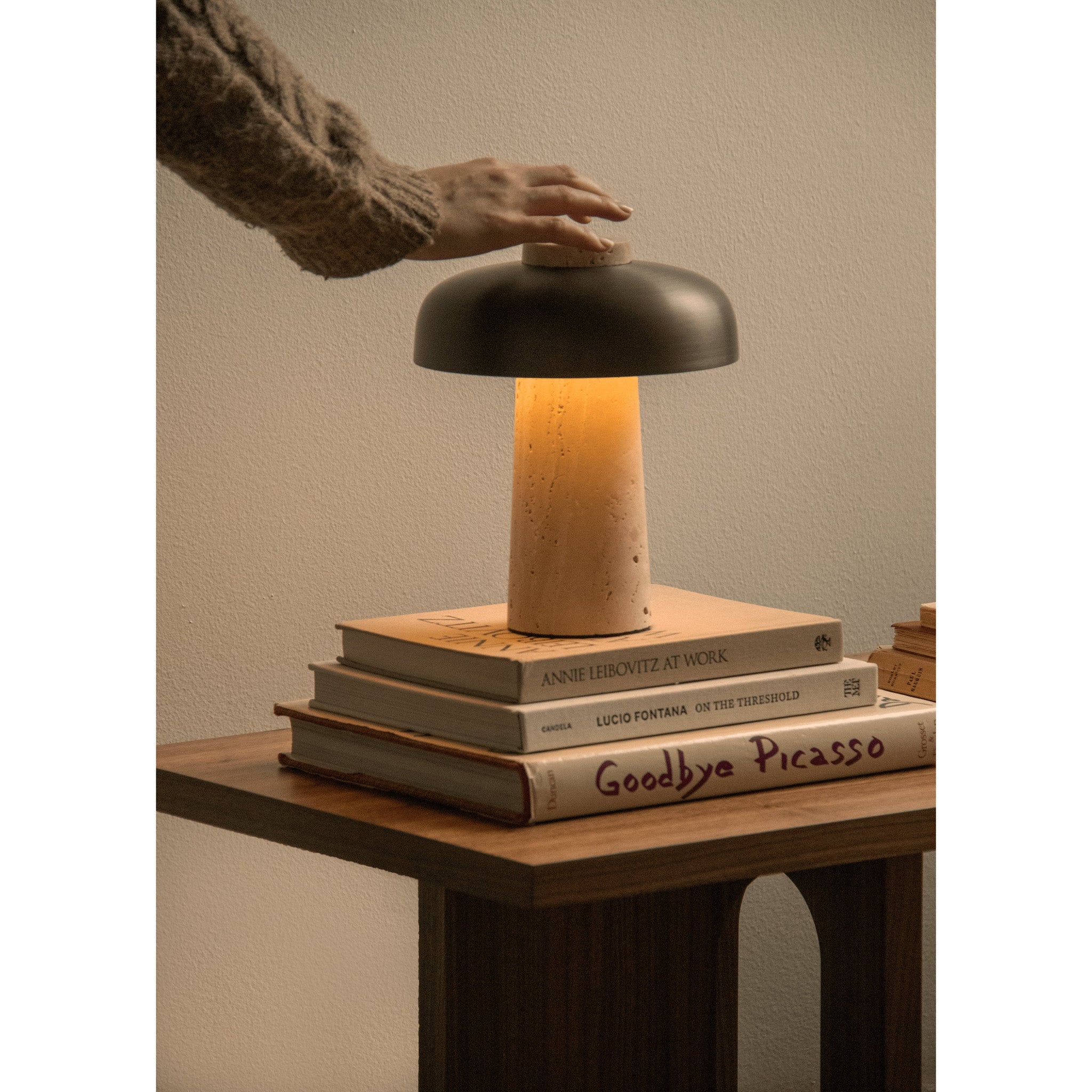 The portable iteration of the Reverse Table Lamp masterfully combines raw and refined elements, drawing inspiration from the structural play of geometric constraints. The conical base is made from untreated stone, with natural imperfections that highlight its organic beauty. The base is complemented by a curved, bronzed aluminium shade with a smooth, polished finish, creating a striking contrast of textures. An opal diffuser provides soft, even light, ideal for creating a warm atmosphere in any setting. With a dimmer switch adjustable to three brightness settings, the lamp offers flexibility for different lighting needs. IP44-approved, it is suitable for use in wet rooms and outdoor spaces. To ensure longevity, it should be stored indoors when not in use.
