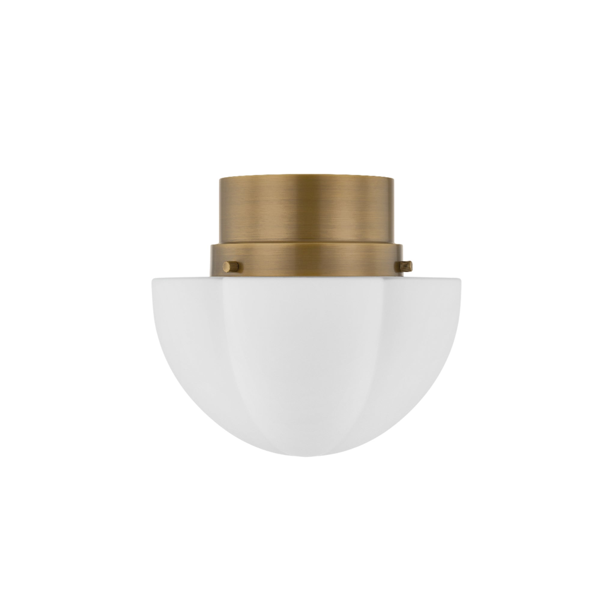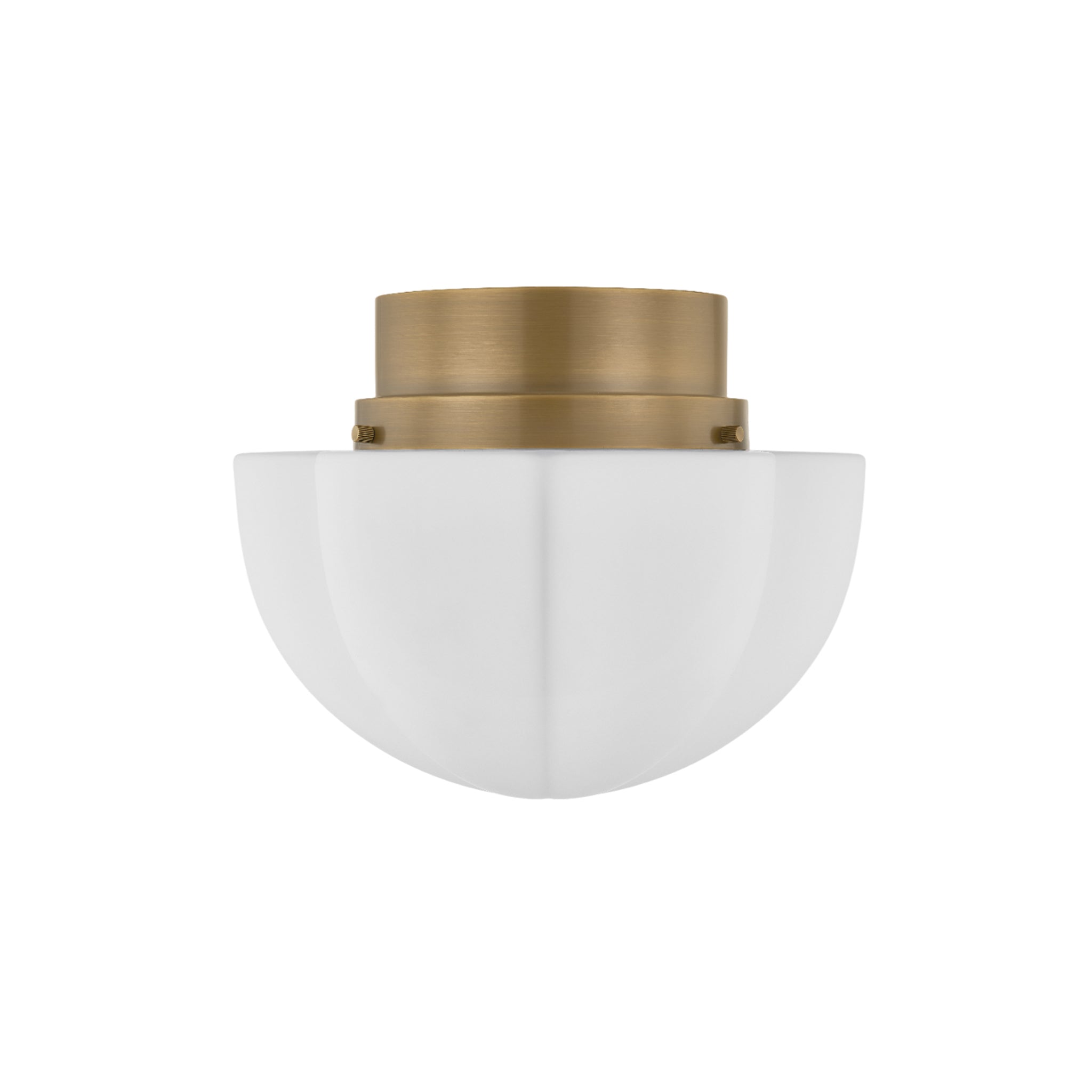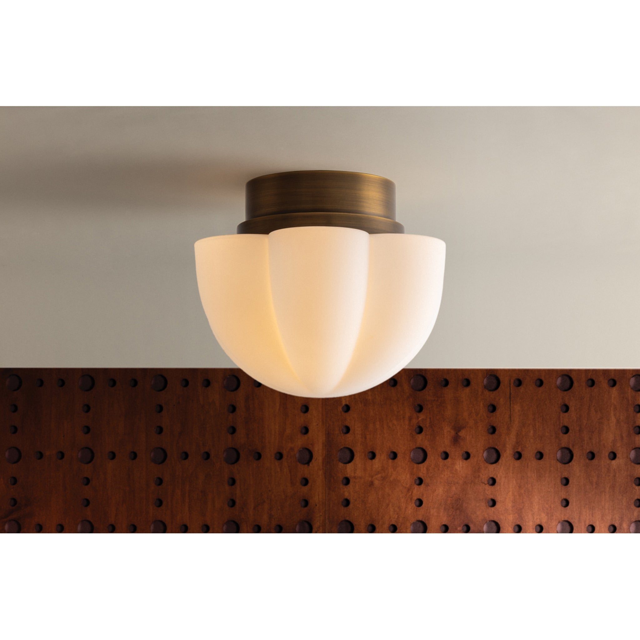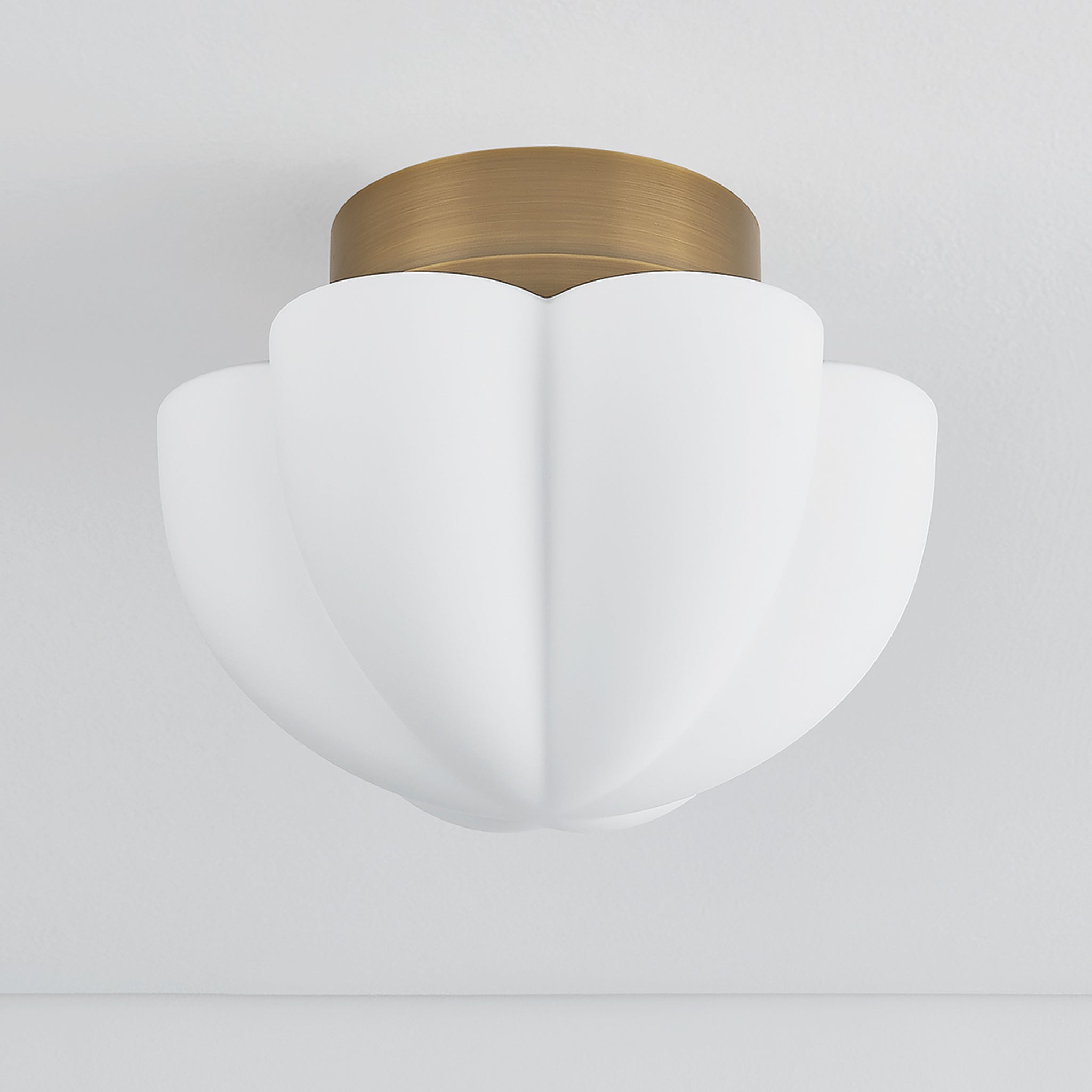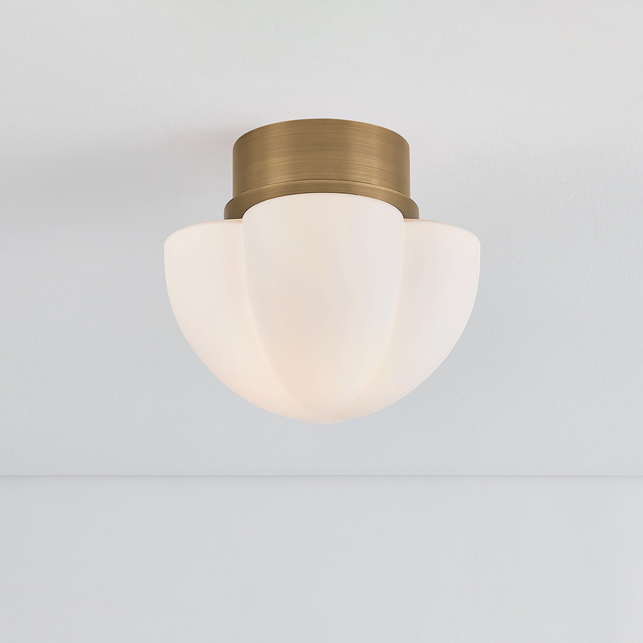 A stylish alternative to can lighting, Seabrook introduces thoughtful forms to spaces that deserve more than a passing glance. Available in two sizes, this charming flush mount features a gently scalloped botanical shade that adds a soft touch to any room. The opal glass creates a diffused glow, while the Heritage Bronze finish of the metalwork lends a warm tone. Designed as a transition piece, Seabrook enhances vestibules between bedrooms and bathrooms as well as landing spaces. Cortney Bishop for Hudson Valley Lighting.