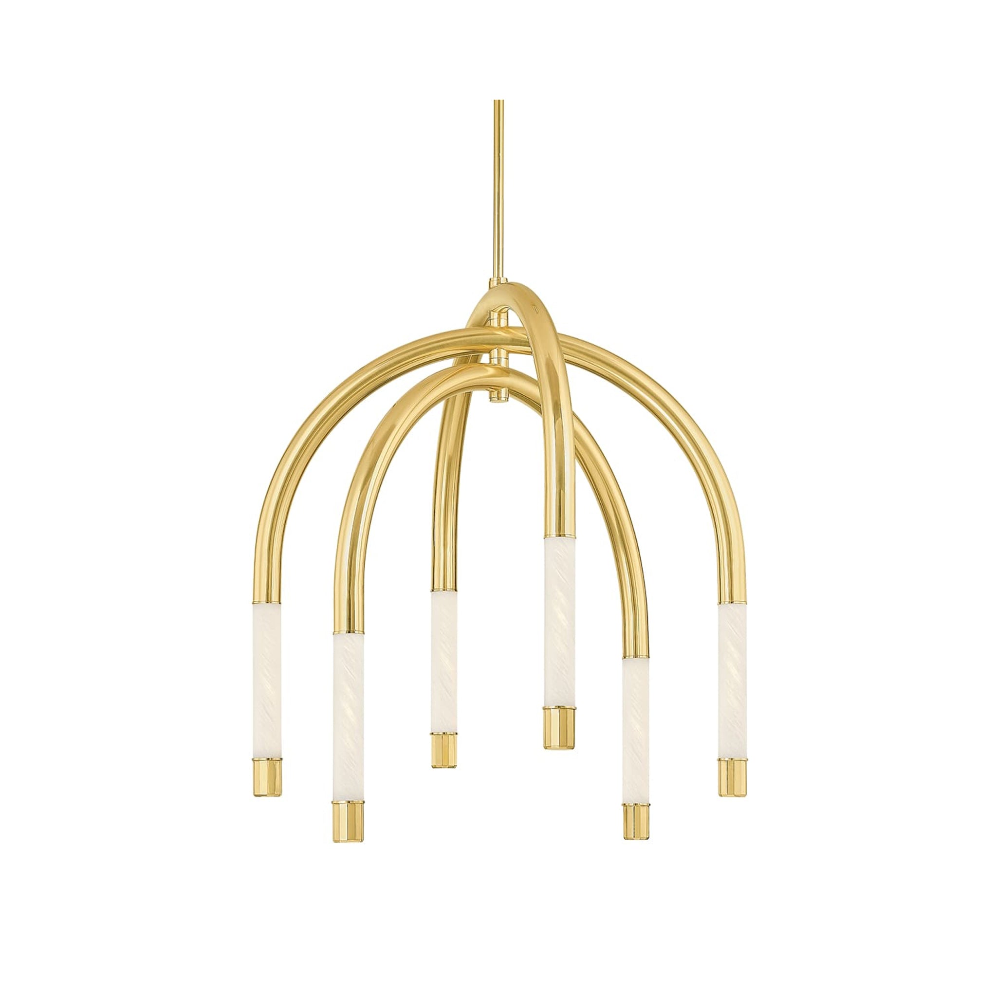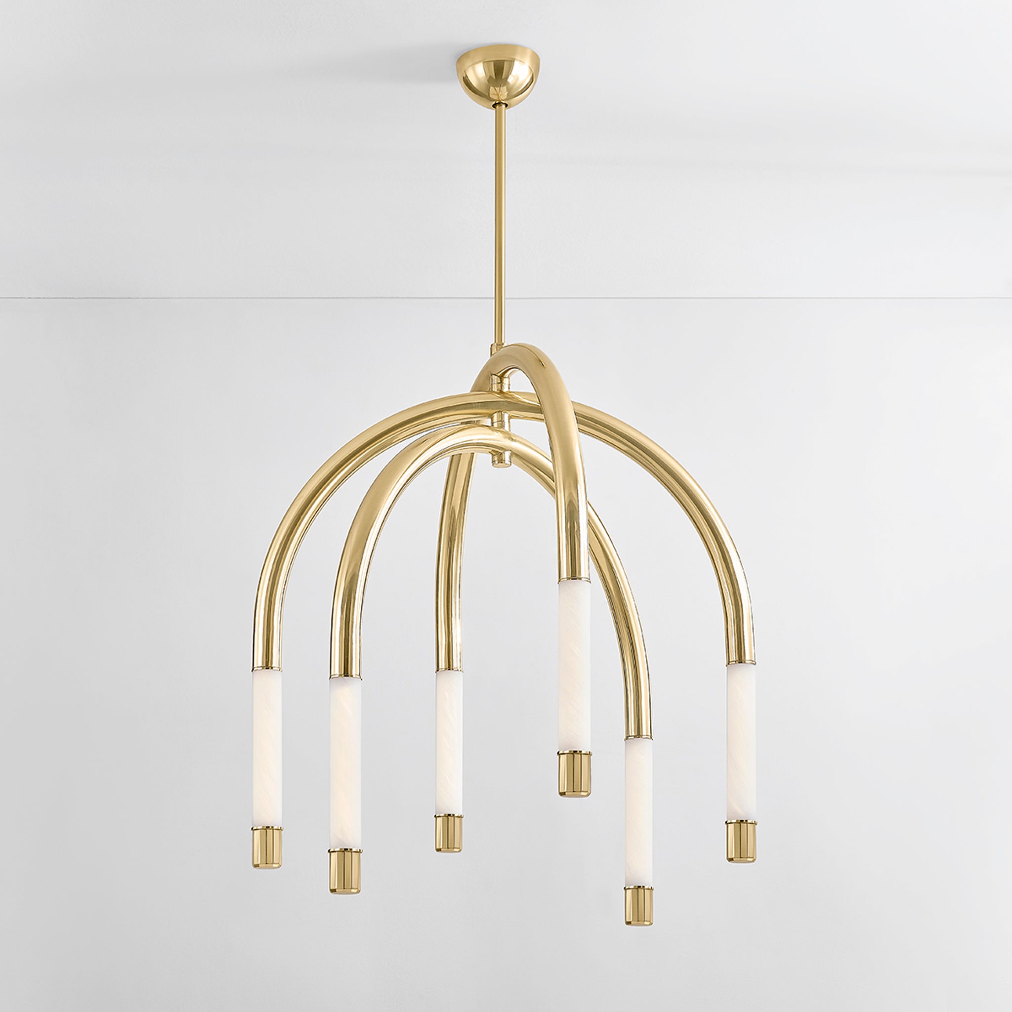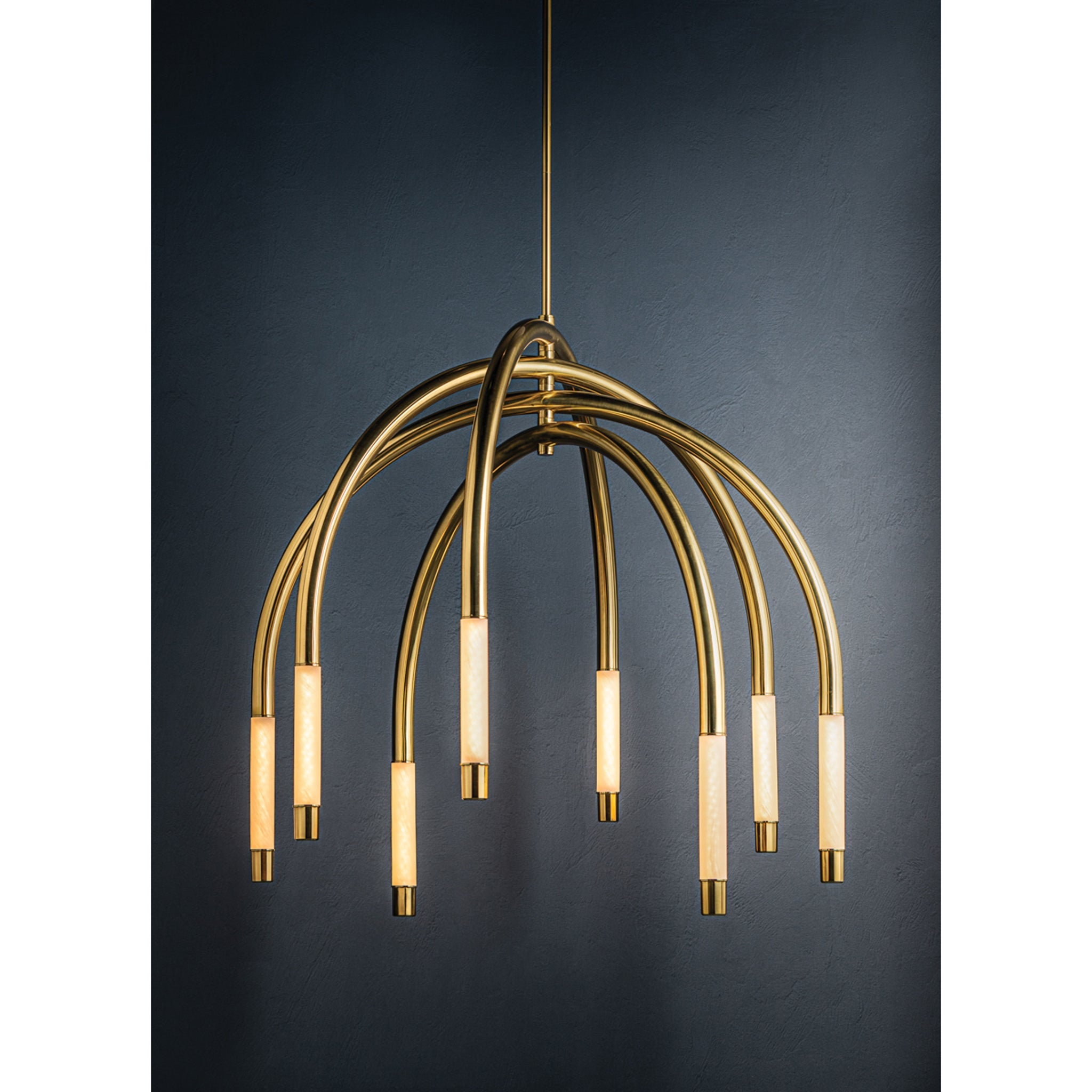 Reminiscent of a chunky, individual chain link or a beautiful modern earring, Zeme is instantly recognizable as a creation of Noz Nozawa. The simple yet exaggerated silhouette feels new and fresh yet understandable. The integrated LED light introduces a touch of innovation, while the etched cloud glass and Vintage Polished Brass finish nod to vintage glamor. Zeme is available as a 6-light or 8-light chandelier, as well as a 2-light sconce. Noz Nozawa for Corbett Lighting.