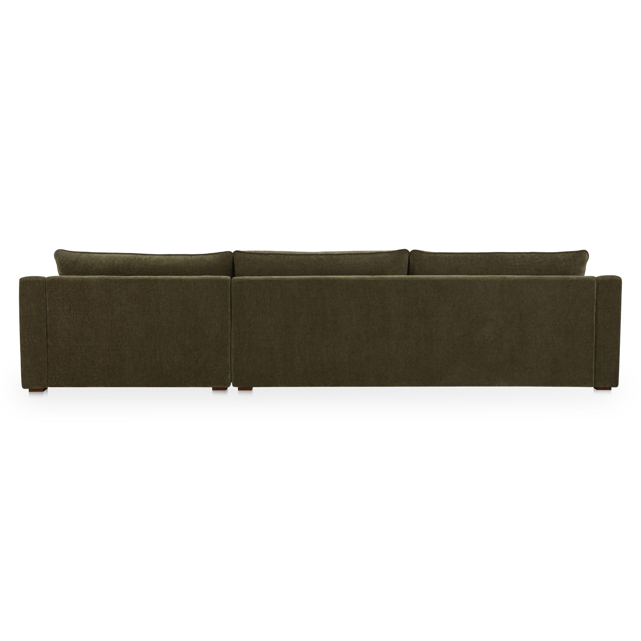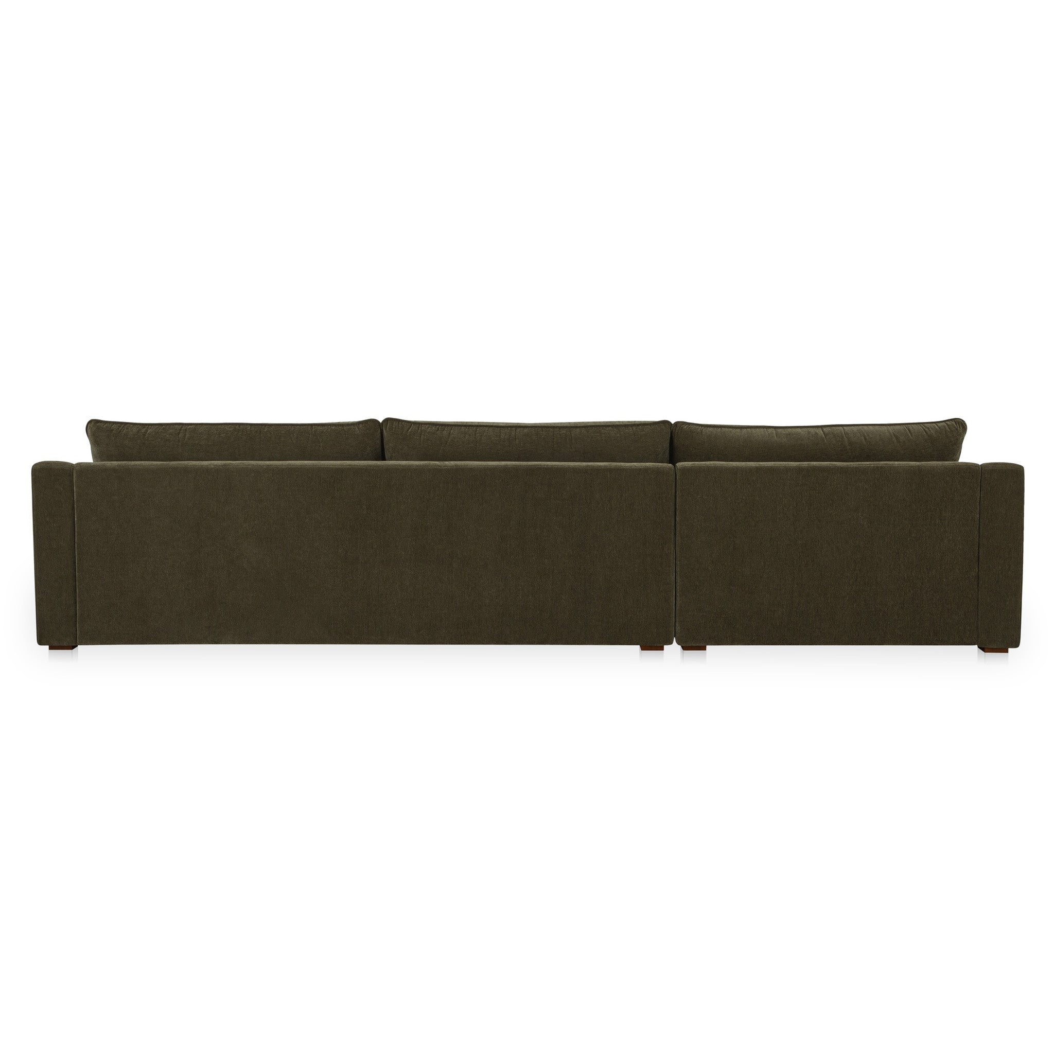 Seating that doubles as a mood-setter. The Farrow Sectional pairs deep, fiber-filled cushions with sloped arms and piped edges for polish. Upholstered in velvety cedar green with a subtle sheen, it's fully wrapped and balanced on an invisible base for a clean-lined look. Designed with the right and left-facing chaise, this sectional shifts easily between classic and contemporary, always landing on timeless comfort.