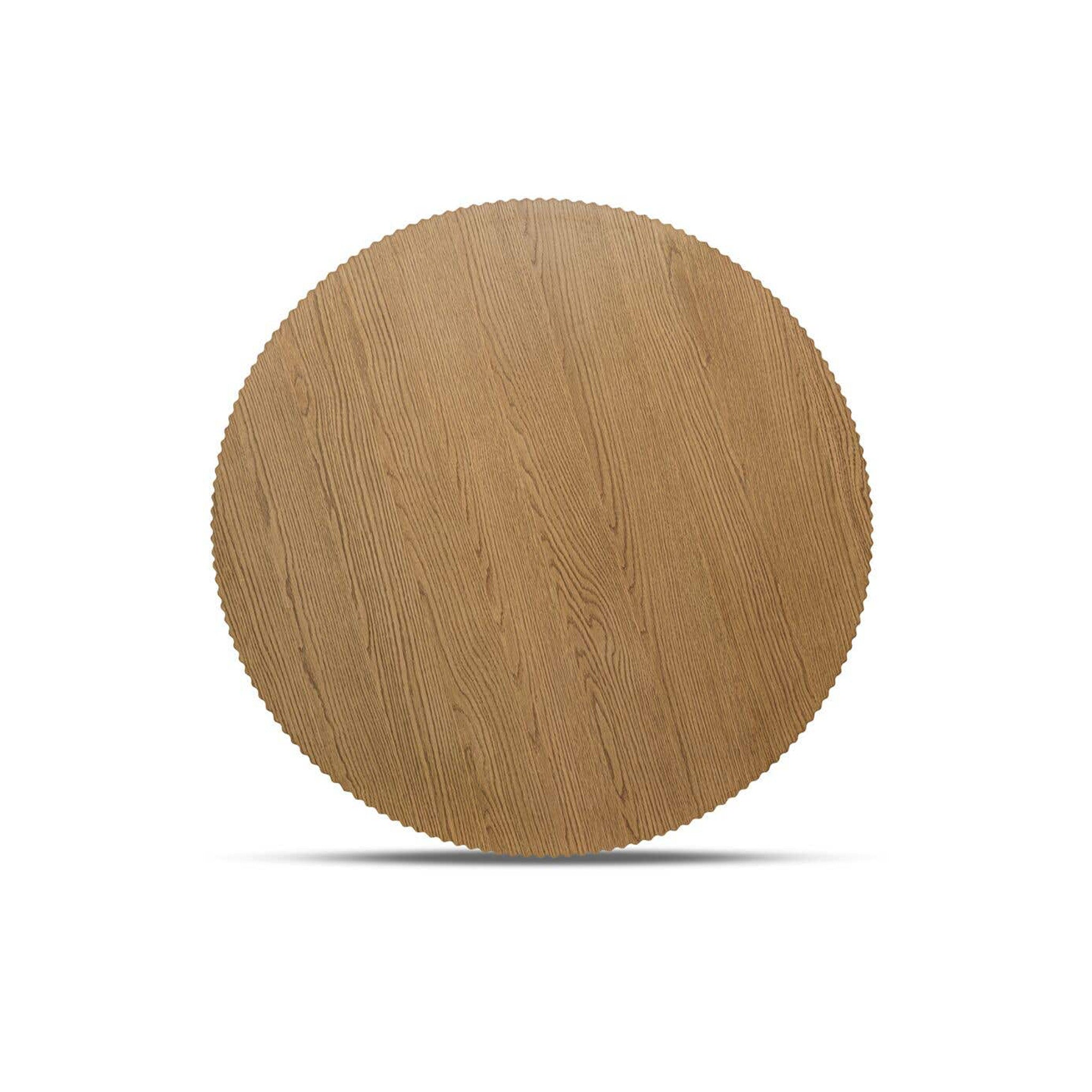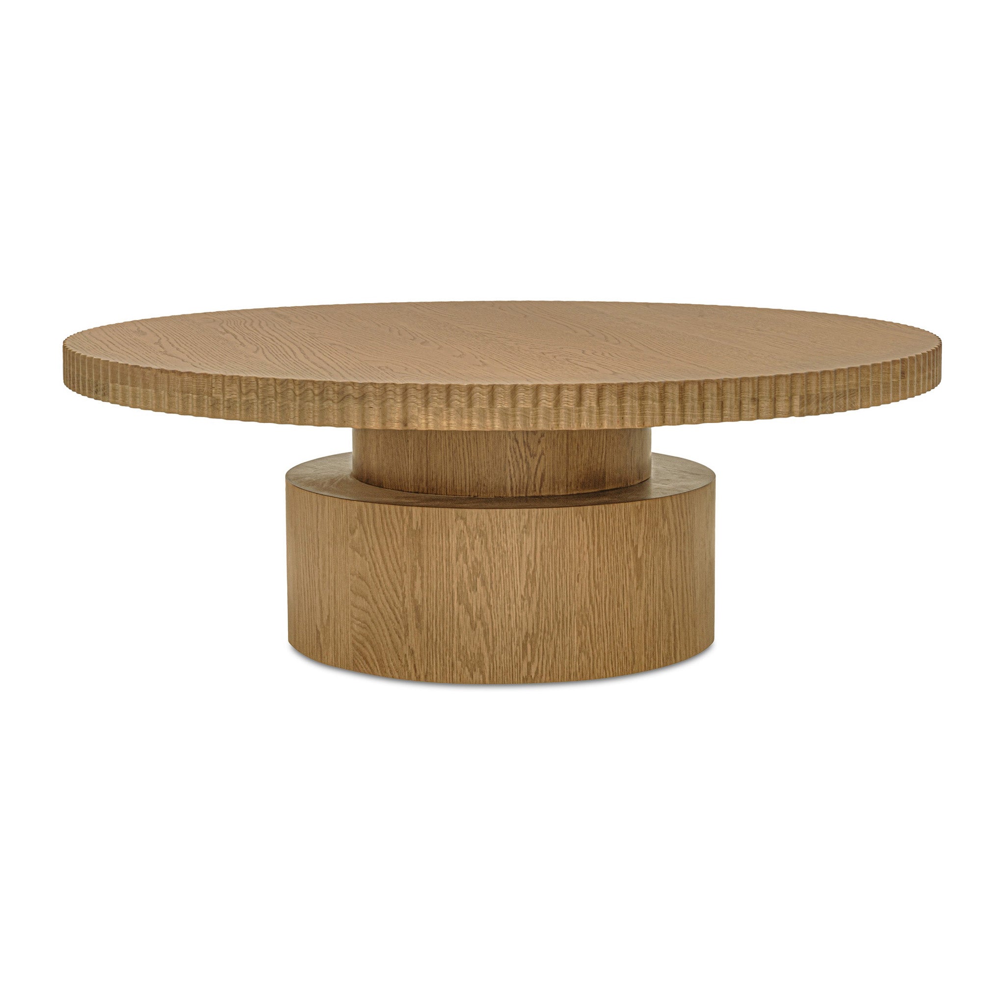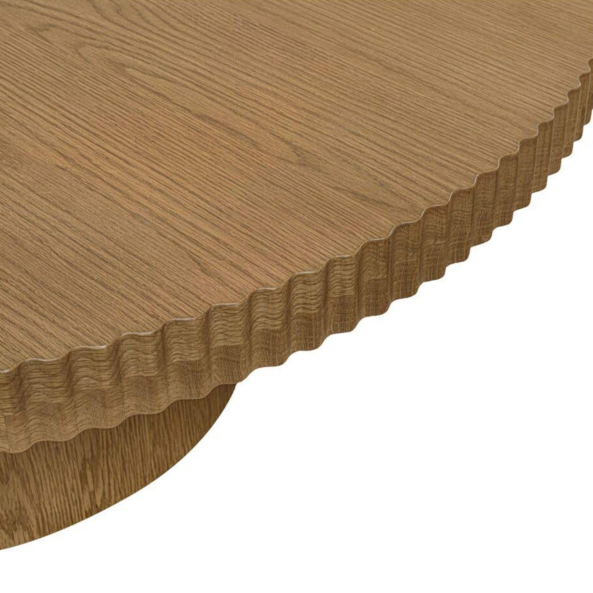 Not your average coffee table. Leigh makes a bold statement with a thick, round table top edged in a playful scalloped detail. Its stacked cylindrical base balances lightness with grounding presence, finished in oak veneer over MDF with a solid oak edge. Built for everyday living