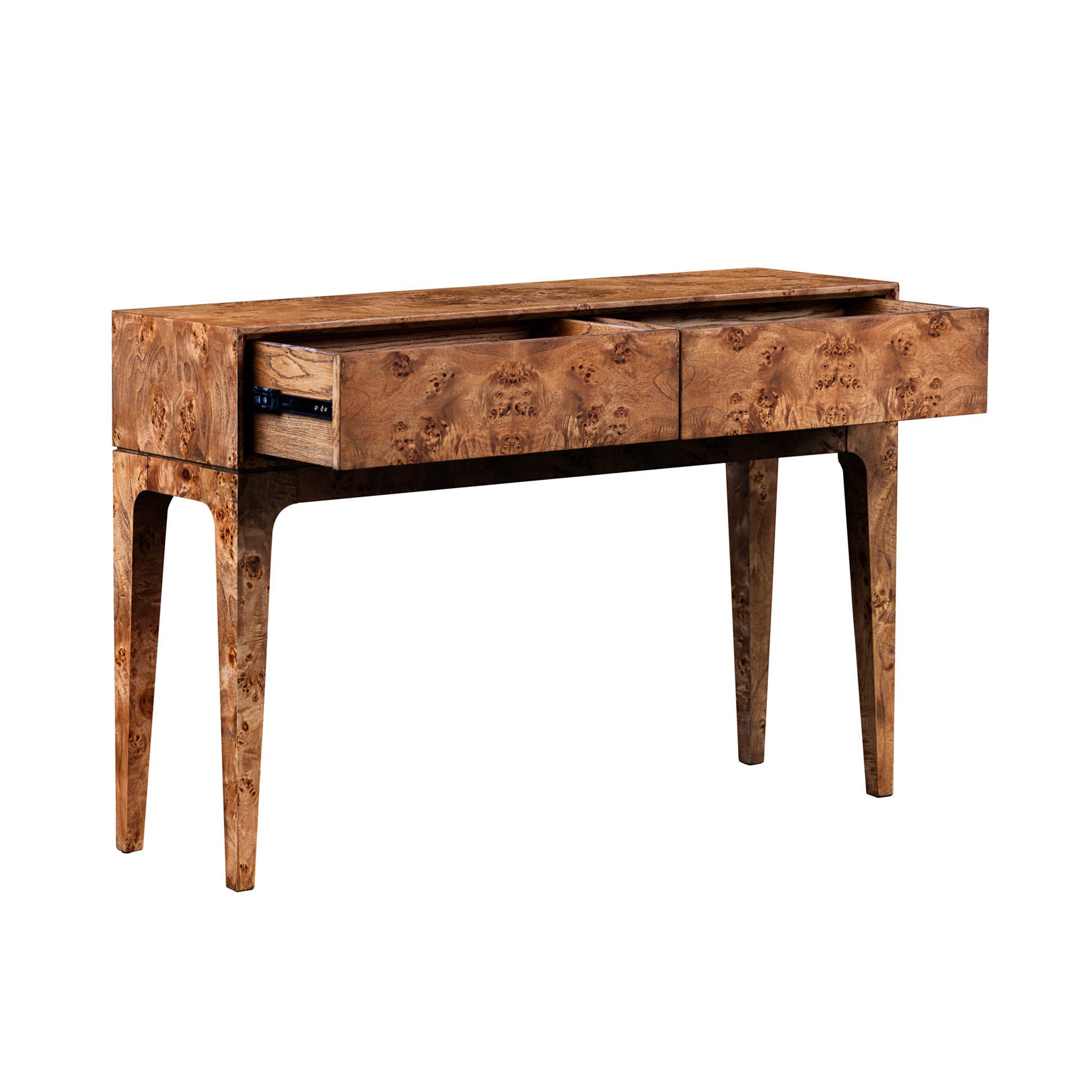 The Manuela Console Table features a sleek shape and eye-catching wood grain that lifts any space. The top can display photos or vases, and smaller items can be stored in the easy-to-open drawers. It fits well in hallways, living rooms, or behind a sofa.