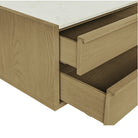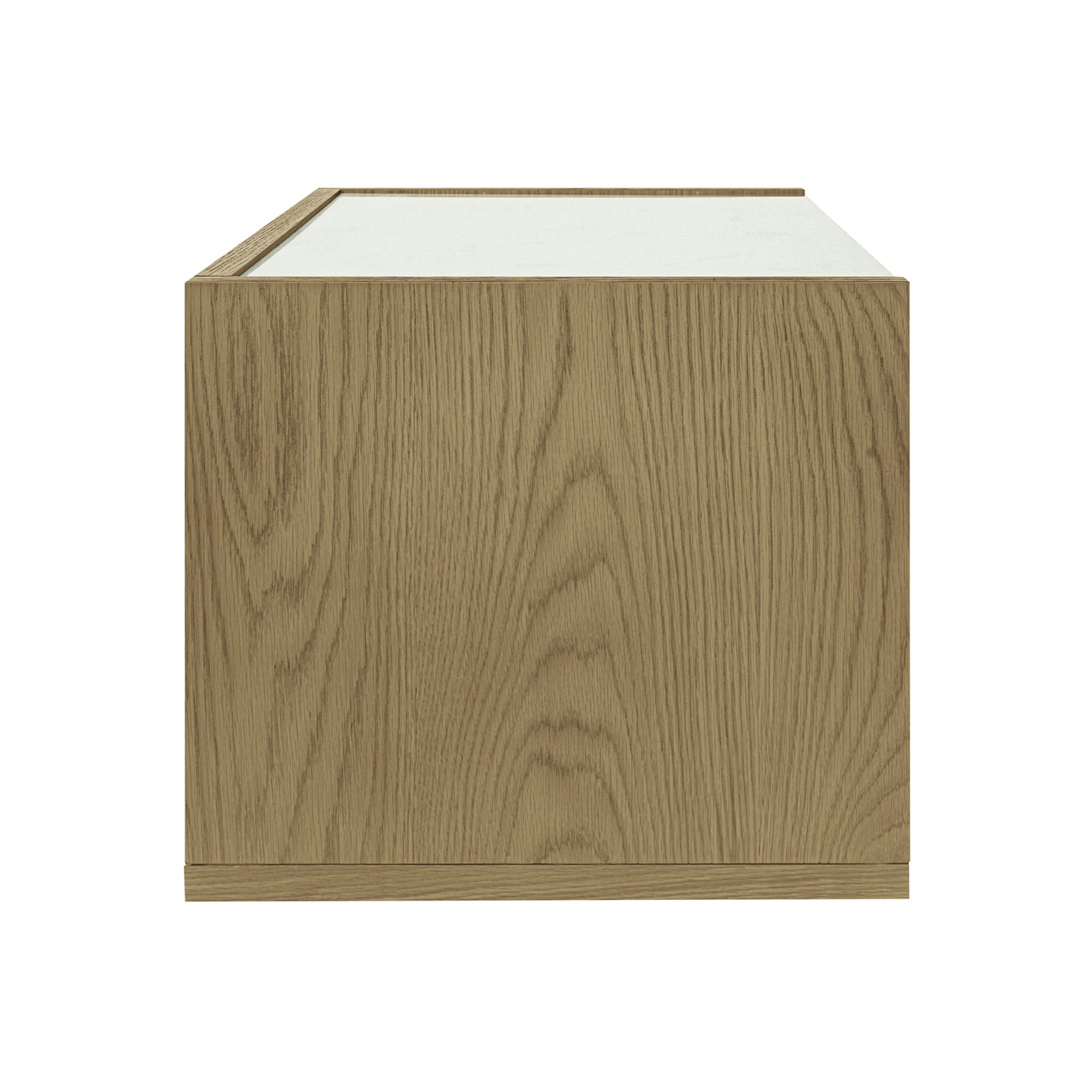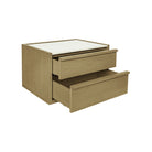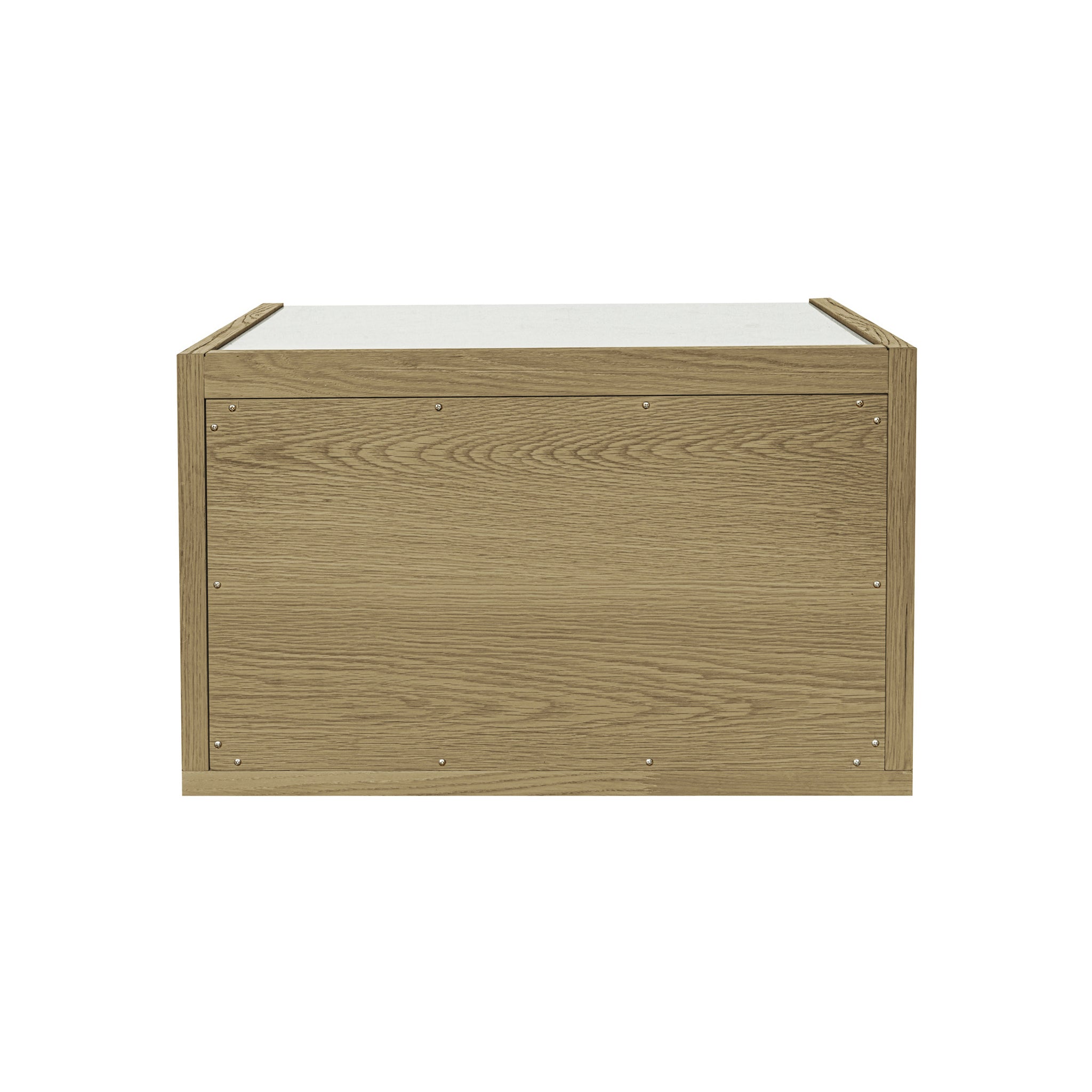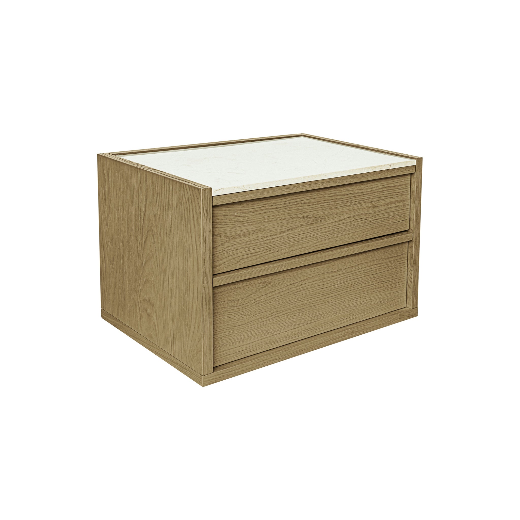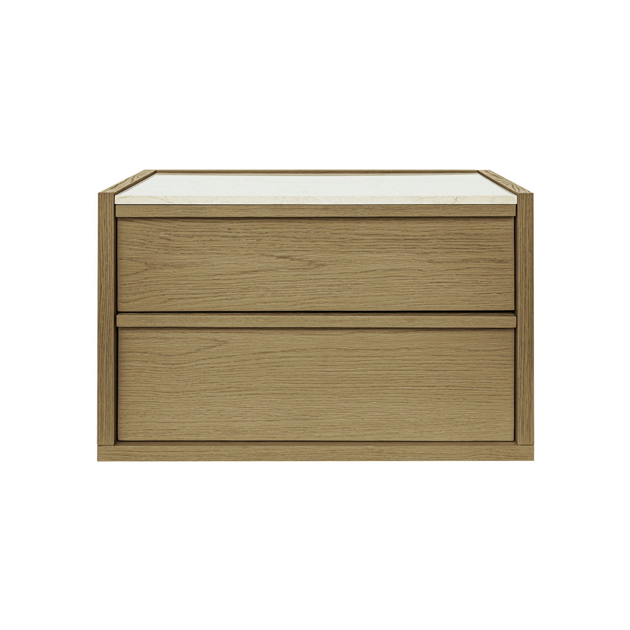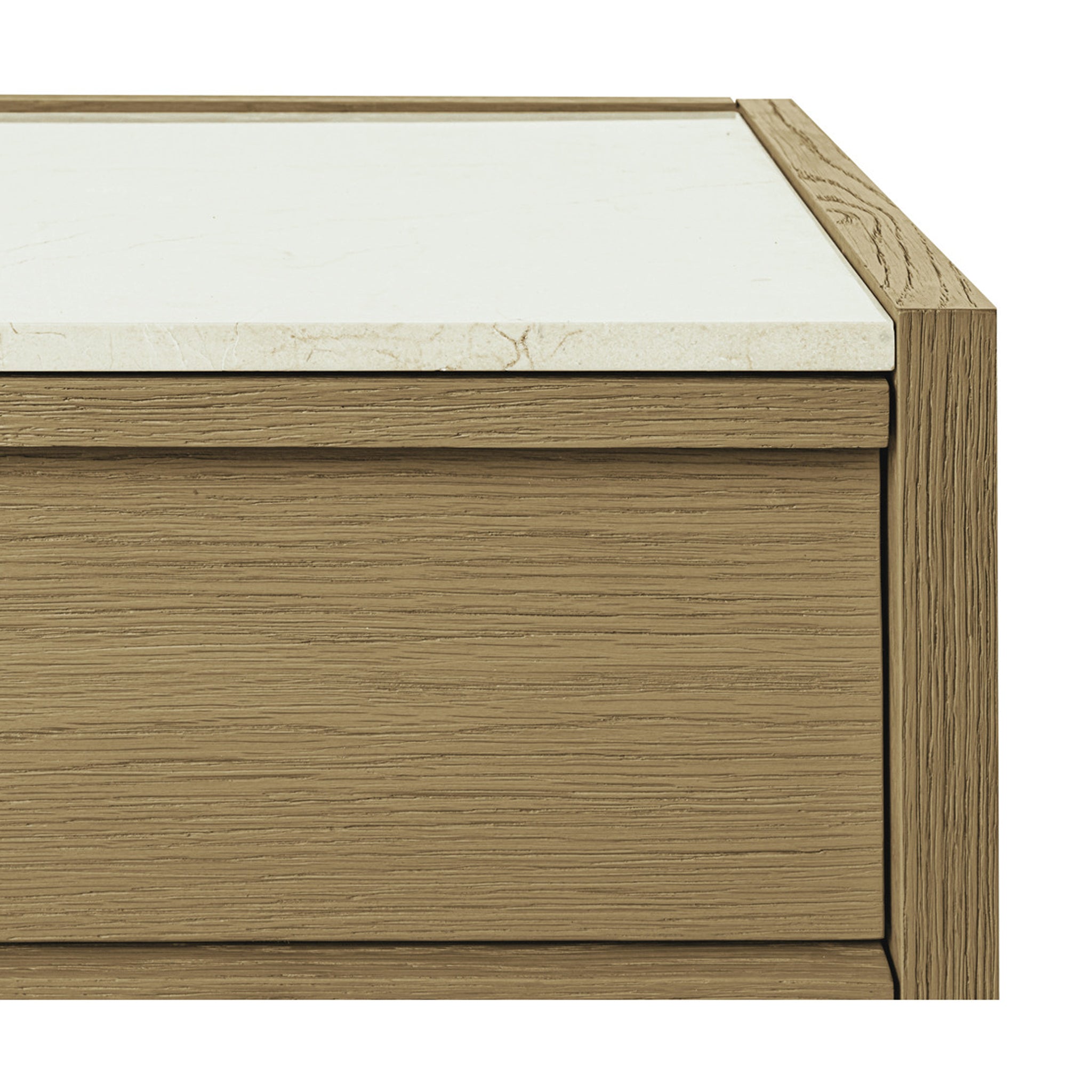 The perfect bedroom companion. A light rosa marble tabletop lies firmly over solid oak frame and oak veneer drawers. Its two soft-close compartments provide ample space for bedside needs.