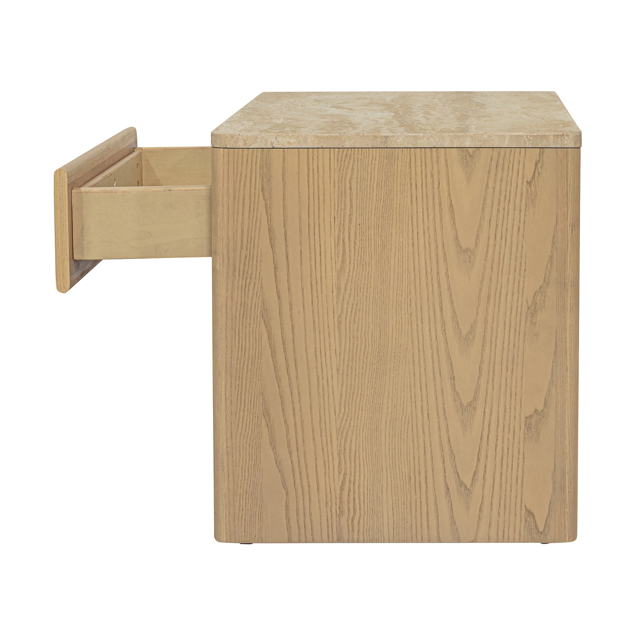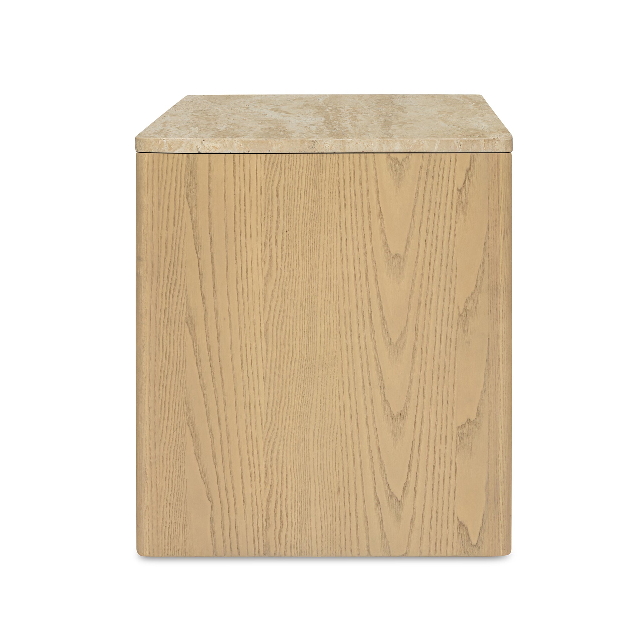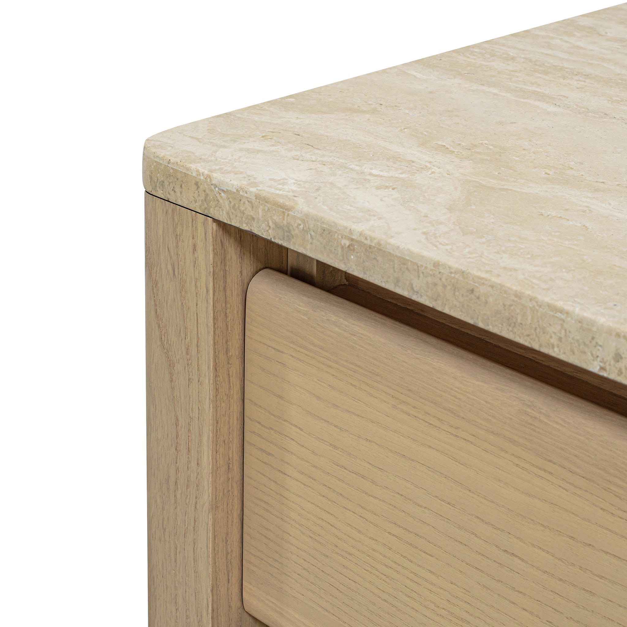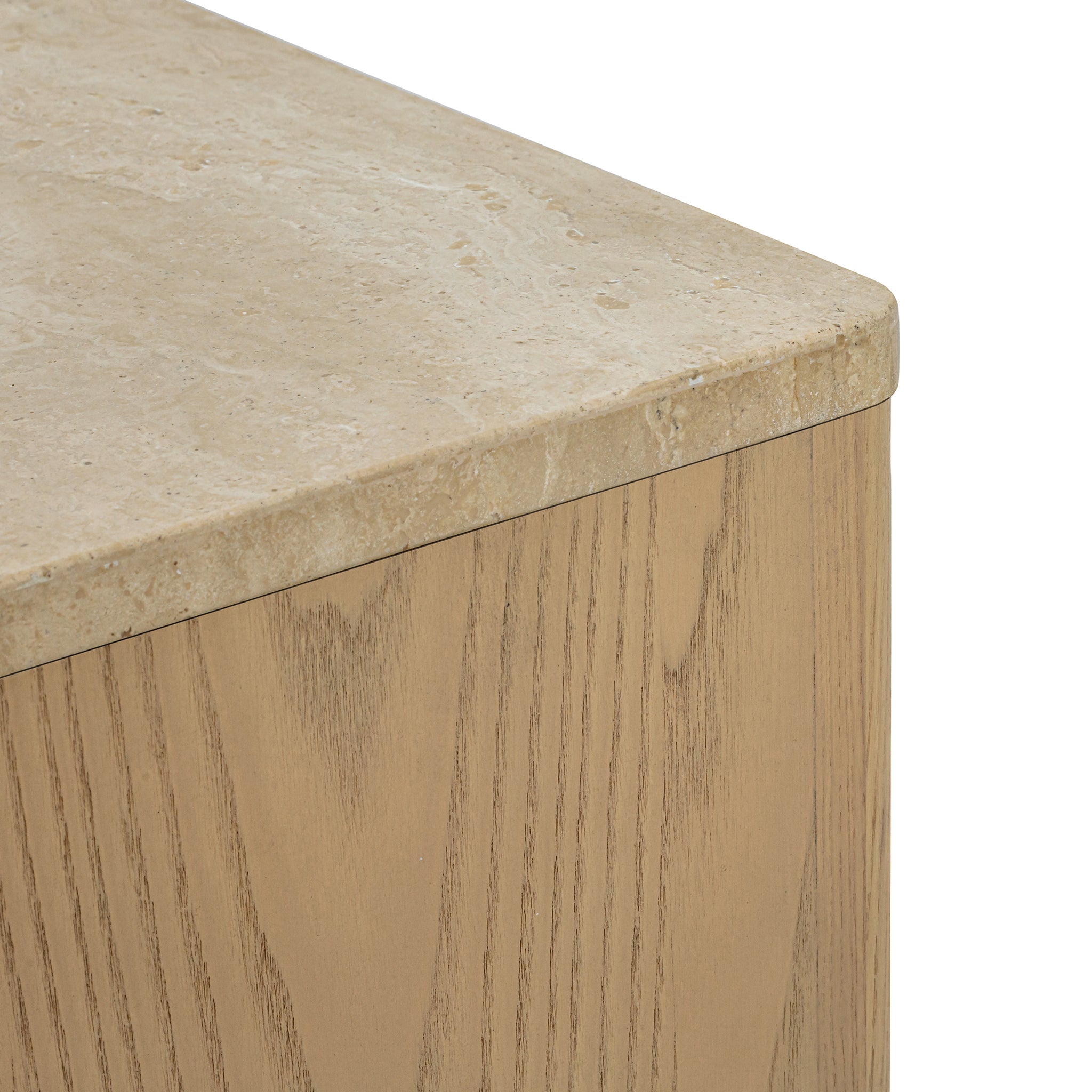 The Everett nightstand blends natural beauty and graceful design with its travertine top. Meticulously crafted, the base features a solid ash and bullnose -rounded edge. This soft design element adds a touch of elegance that is gentle and refined, harmoniously complementing the warm, earthy hues of the travertine top.