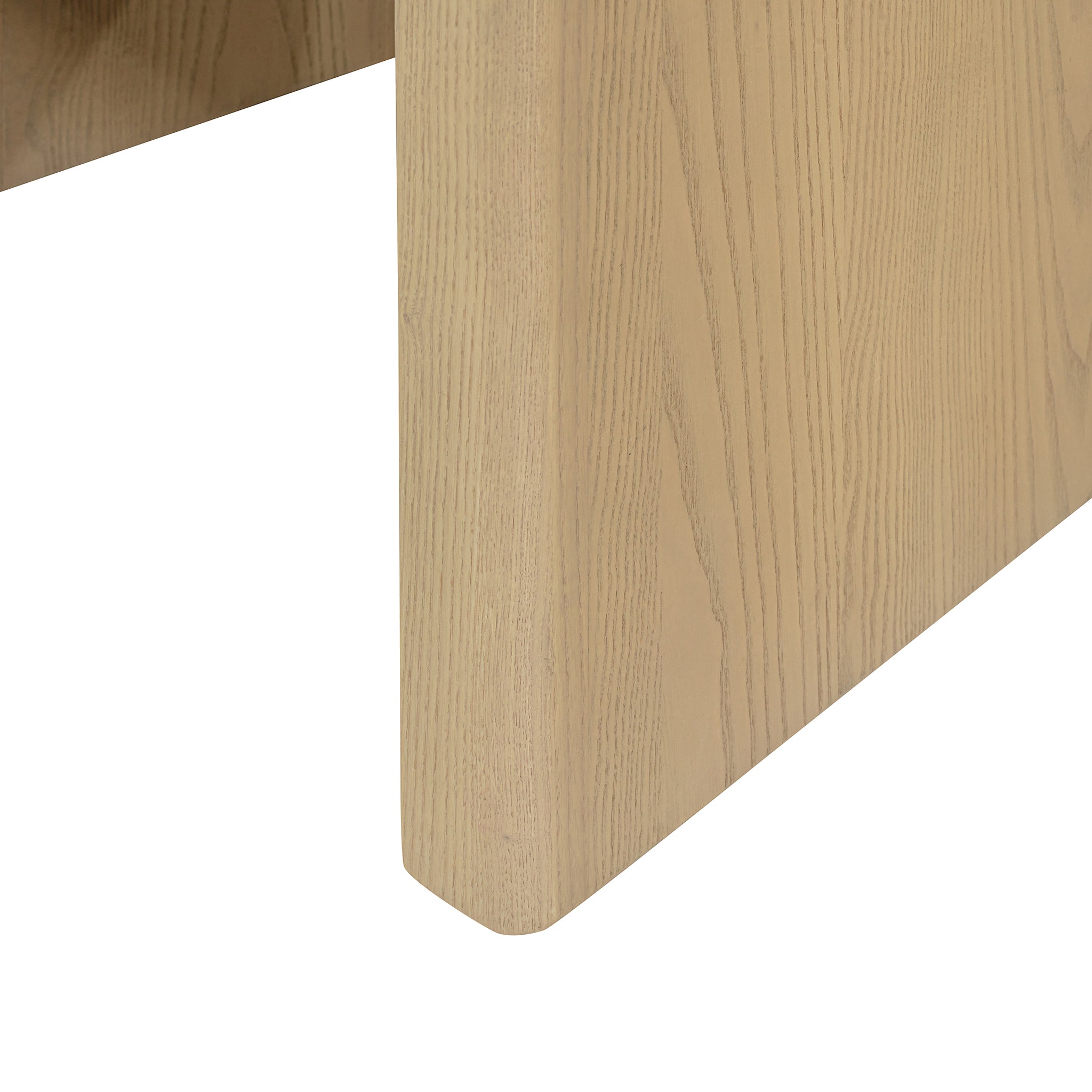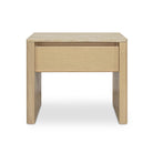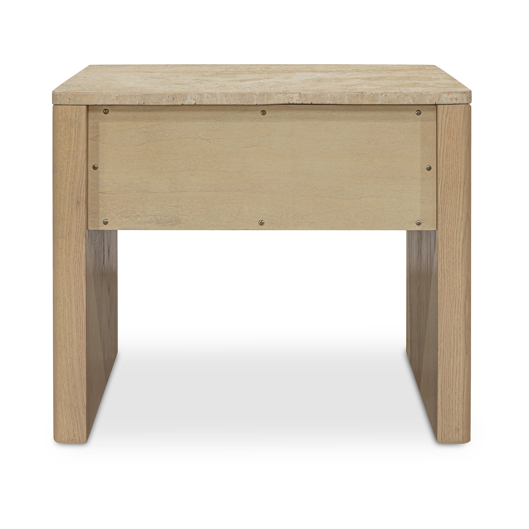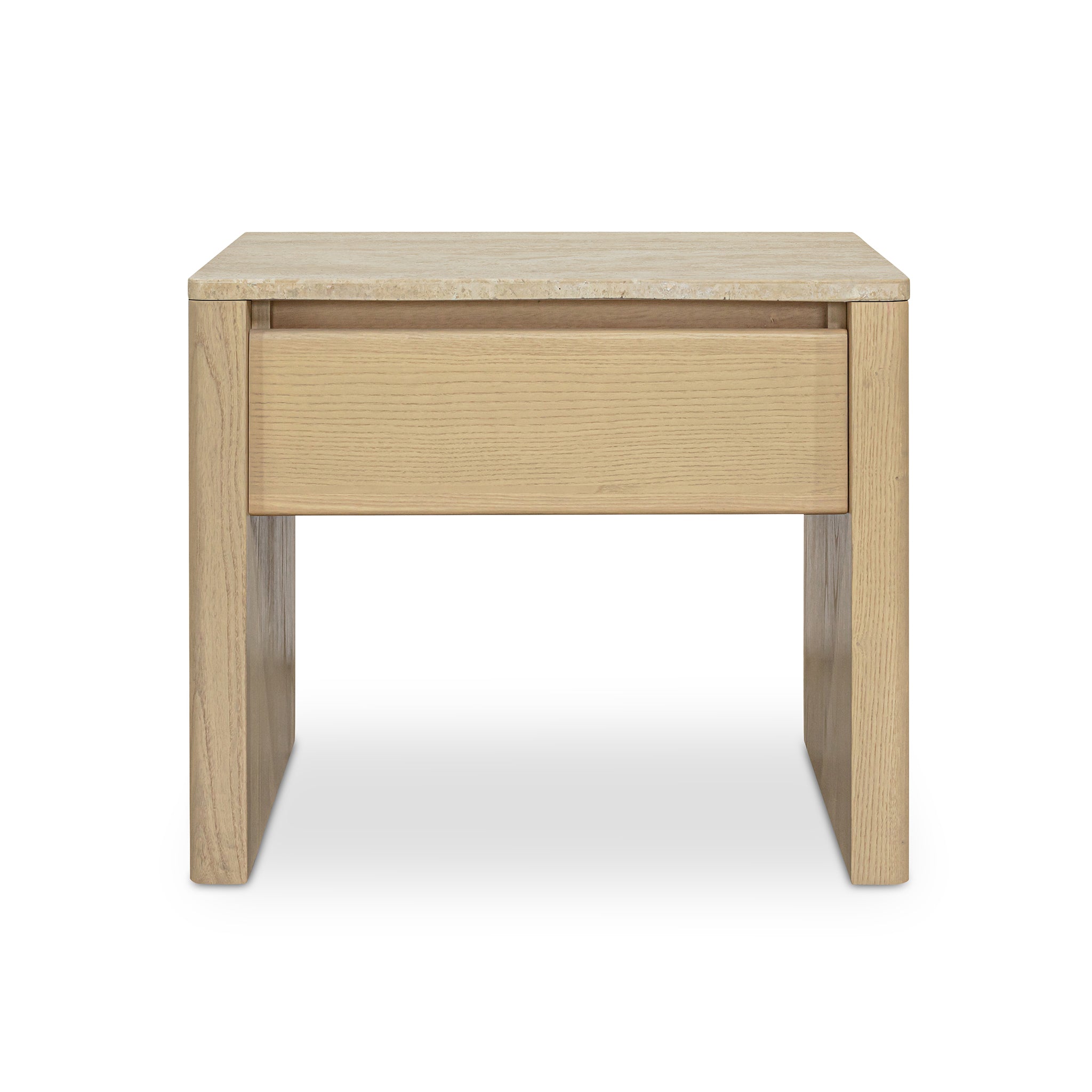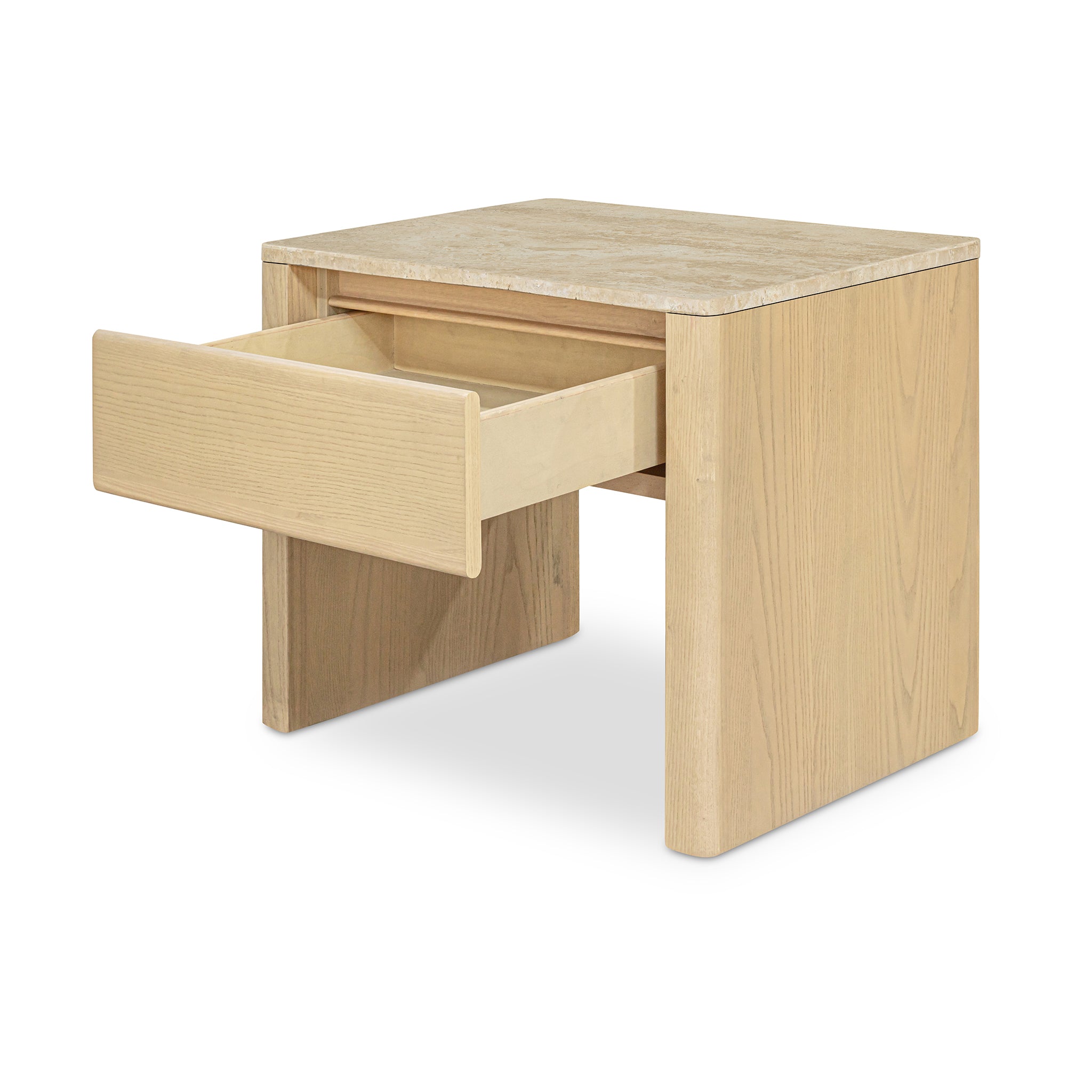 The Everett nightstand blends natural beauty and graceful design with its travertine top. Meticulously crafted, the base features a solid ash and bullnose -rounded edge. This soft design element adds a touch of elegance that is gentle and refined, harmoniously complementing the warm, earthy hues of the travertine top.