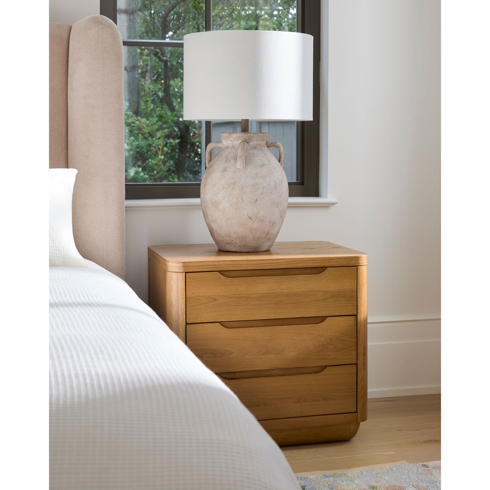 Introduce a touch of minimalist modern style to your bedroom with our Hundley Nightstand. Made in Vietnam, the nightstand features a sleek top crafted from white oak veneer and manufactured wood, coupled with a sturdy base made of oak. This unique blend of materials ensures durability while adding an air of sophistication to any space. The clean design makes it versatile enough to blend well with any decor style. Its easy-care nature is another reason why it's a must-have; simply wipe it clean with a dry cloth to maintain its fresh look and avoid harsh cleaners which may damage its finish. Upgrade your bedside storage solution with this chic yet practical piece!