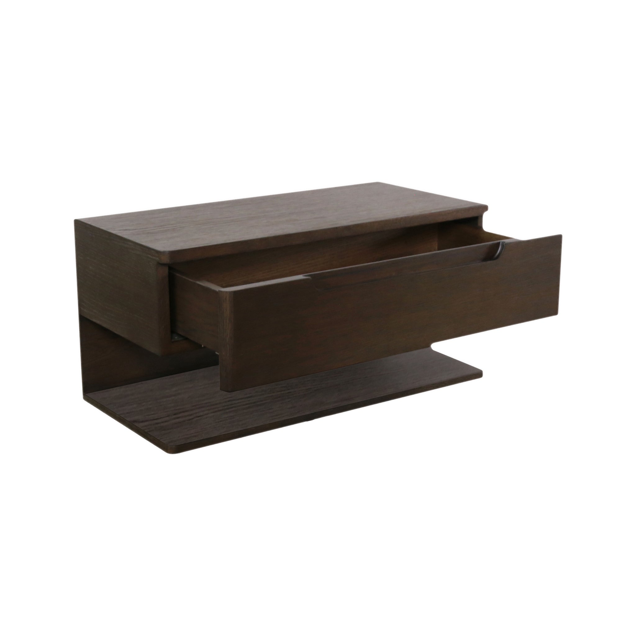 The versatile Joshua nightstand embodies midcentury style with its dark walnut finish and substantial form. Wall-mounted with a French cleat that creates a sleek, floating effect and featuring a drawer and an open shelf, ample storage allows this piece to serve as a nightstand or an entryway table.