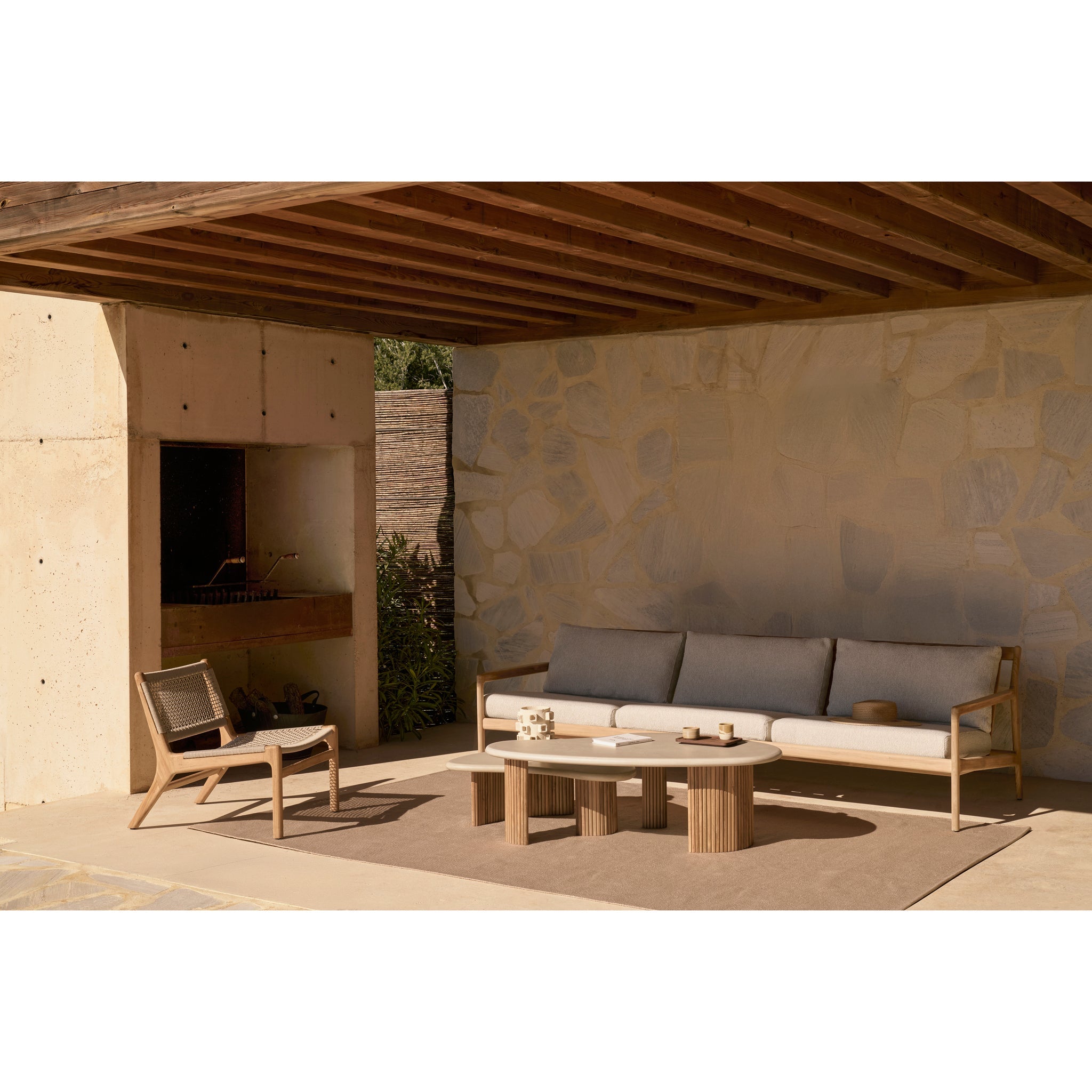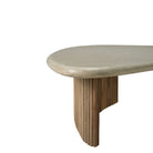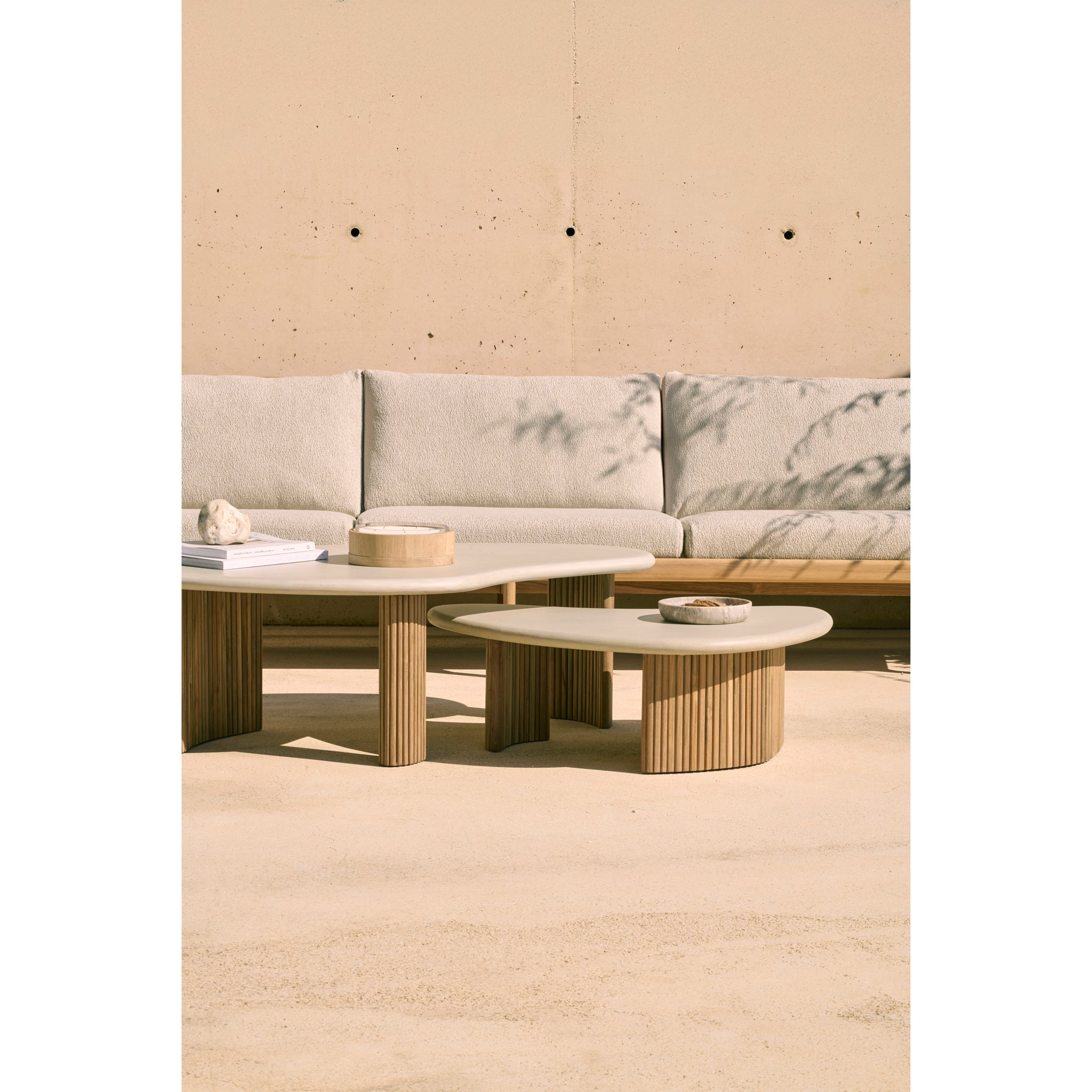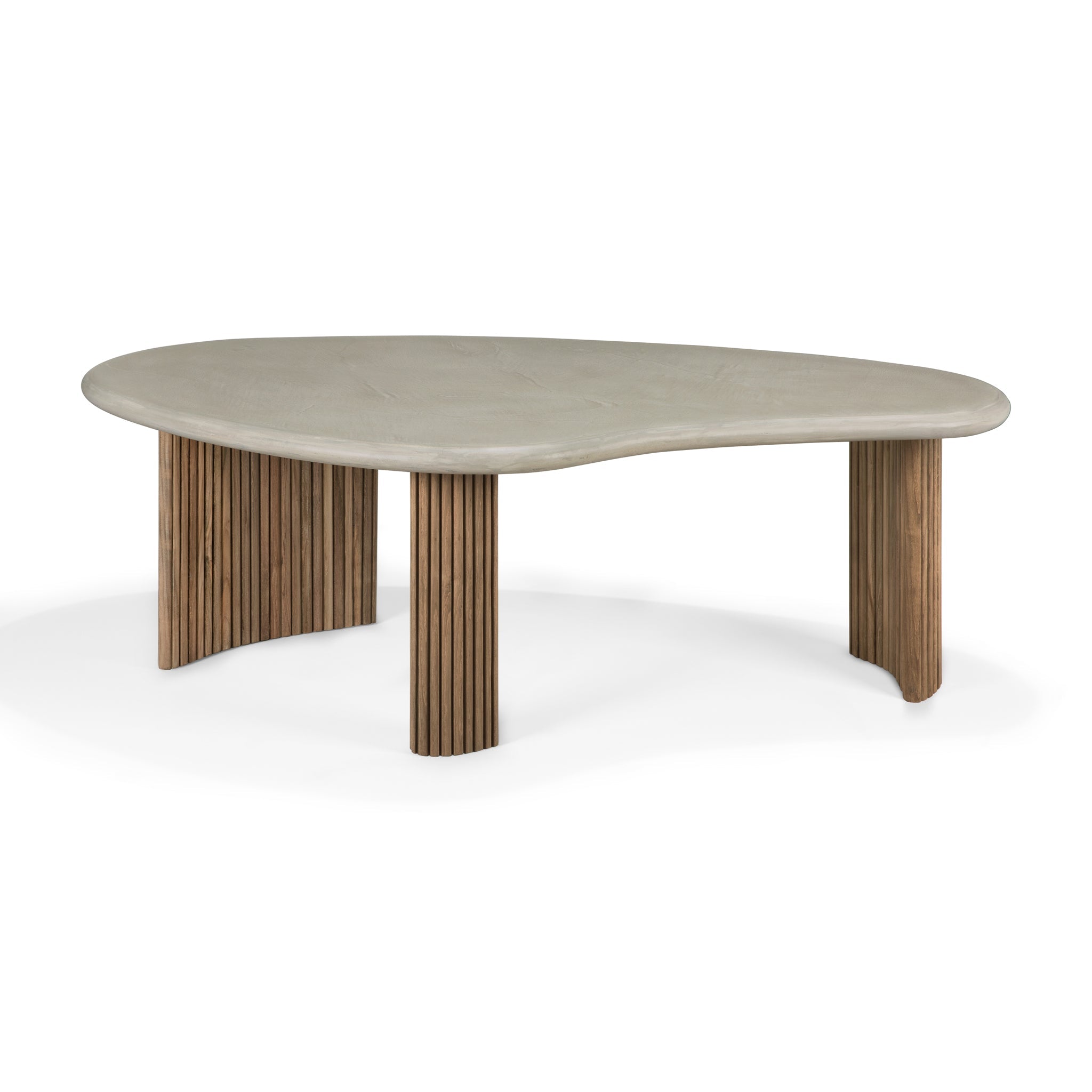 Playful, pebble shapes set on a beautiful, folded, base. Inspired by its popular indoor design, the Boomerang outdoor coffee table features a hand-finished concrete top, paired with a reclaimed solid teak base, a beautiful material mix provides durable practicality to both indoor and outdoor spaces. Configured with the two sizes together, or as a stand-alone, this well-proportioned design is sure to capture attention.