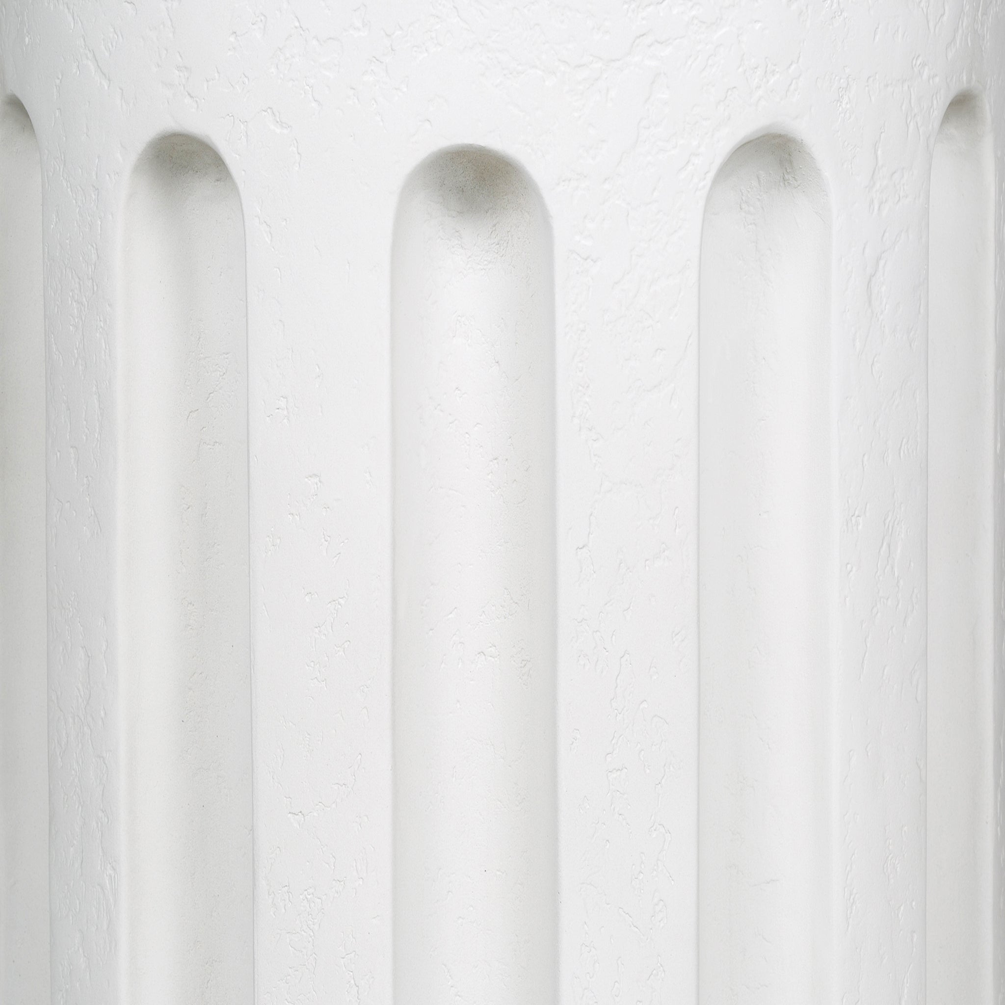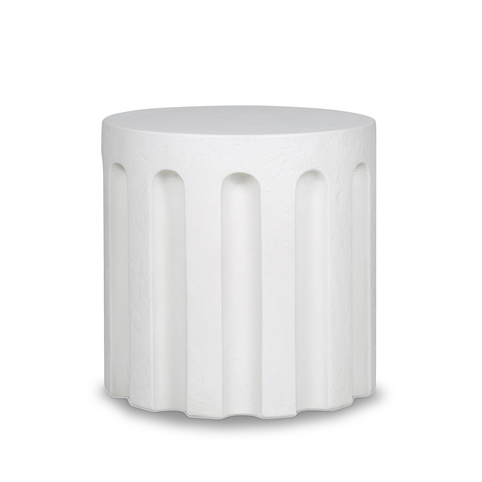 A striking interplay of shapes, the Nolan outdoor accent table embraces round forms with a column-like fluted side. The rough concrete texture adds depth and complexity to an otherwise simplistic form, making it a statement piece suitable indoors and out. Exceptionally composed of Glass Fiber Reinforced Concrete (a fusion of cement, glass fiber, and Styrofoam), this table offers unique aesthetics while maintaining its beauty.