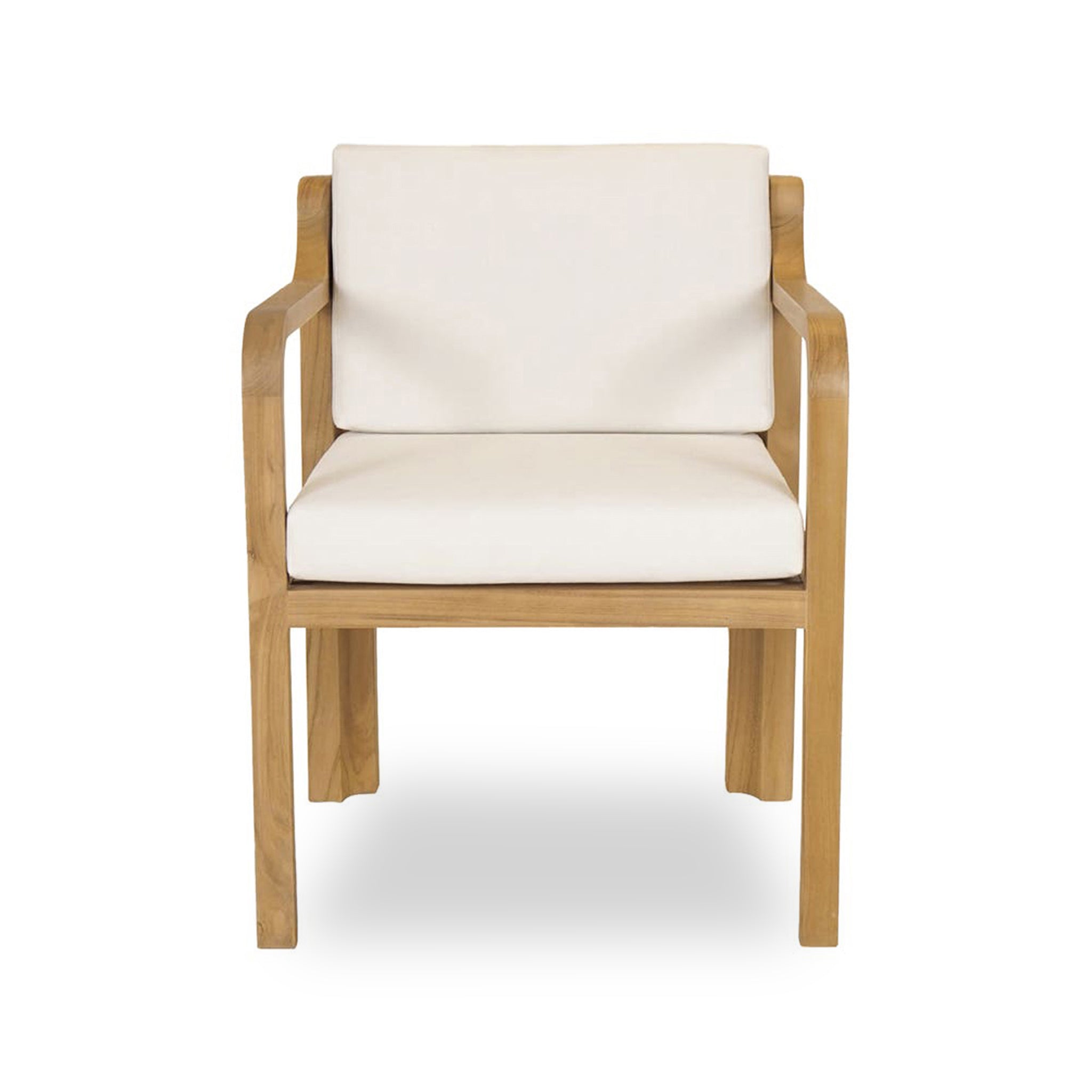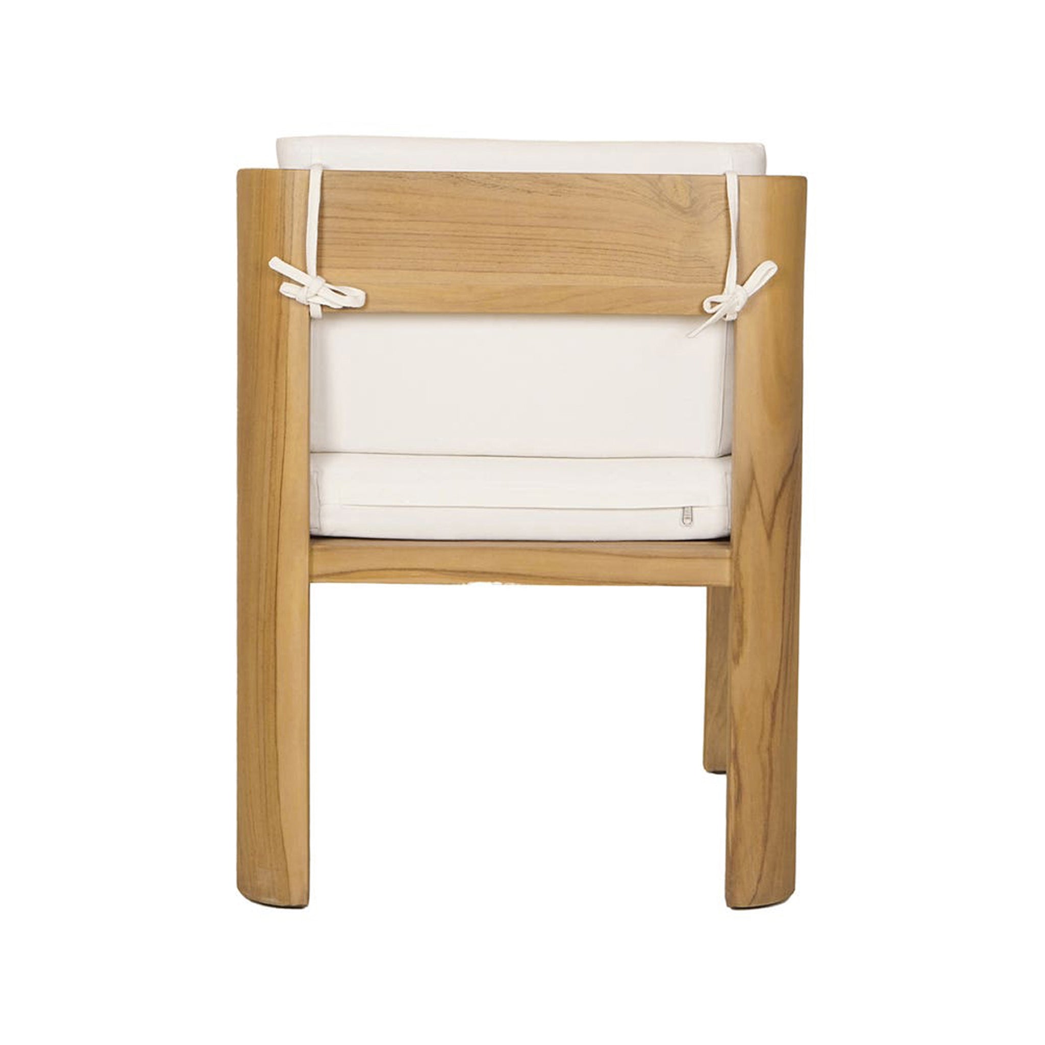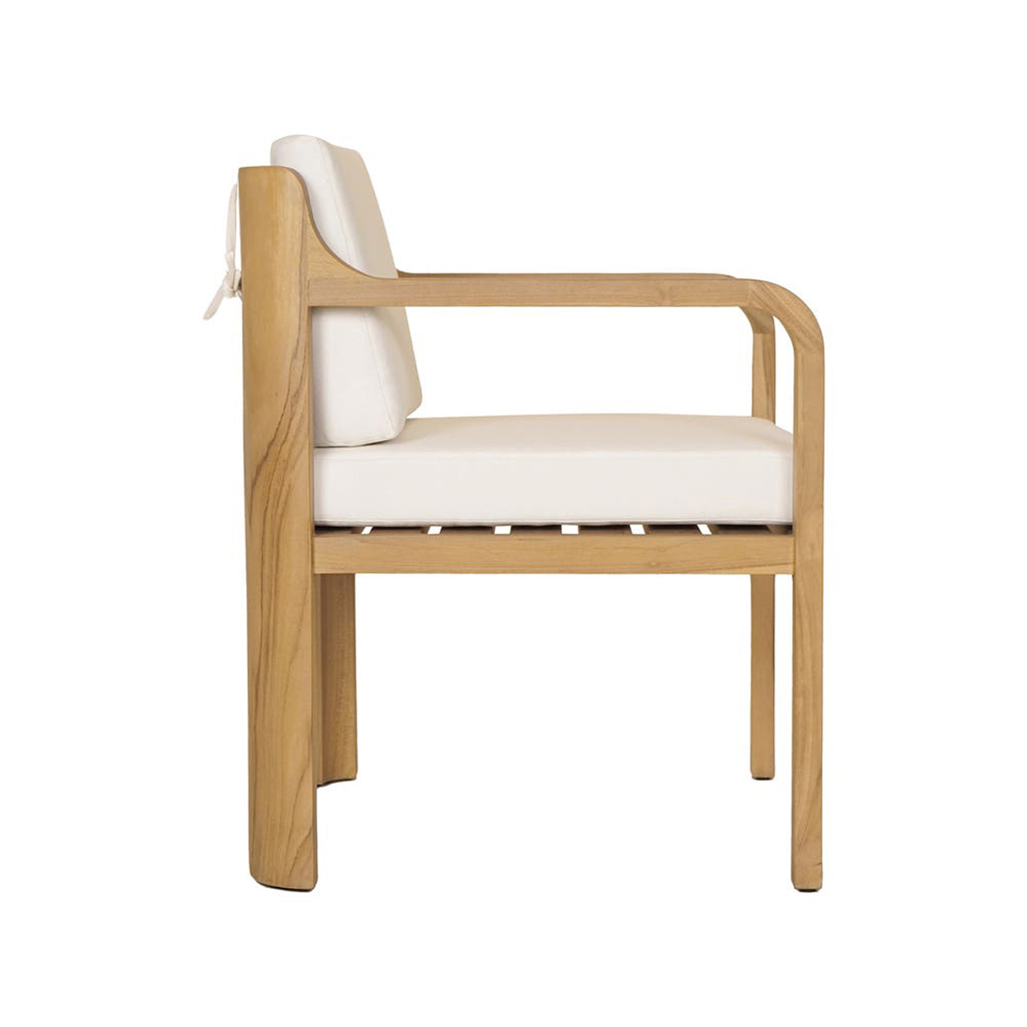 The Noemi outdoor dining chair elevates outdoor dining with comfort and enduring style. This foundational piece features a solid teak frame with quick-dry foam cushions upholstered in white 100% Olefin fabric. The curved back with gradually sloping arms creates a welcoming silhouette whose form is durable and weather resistant.