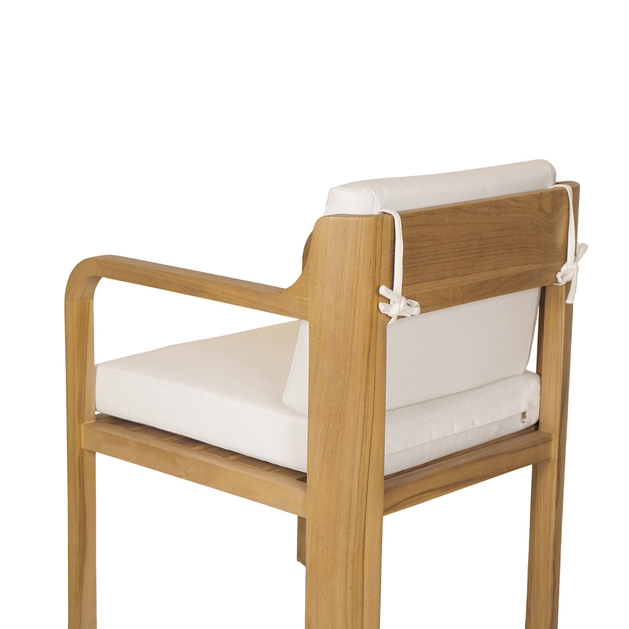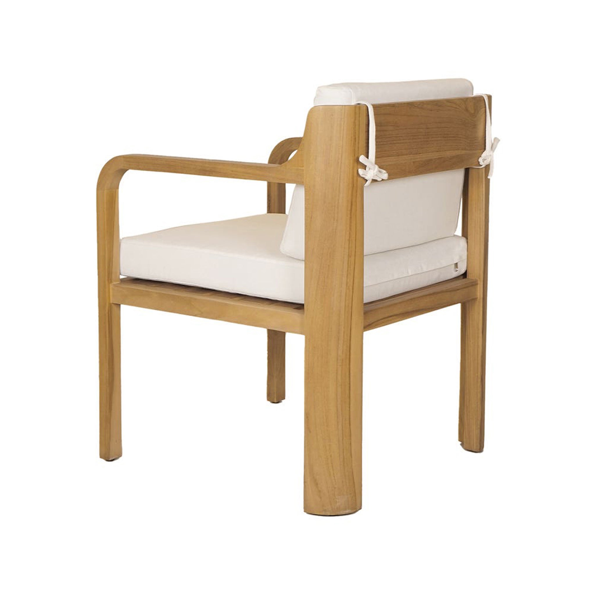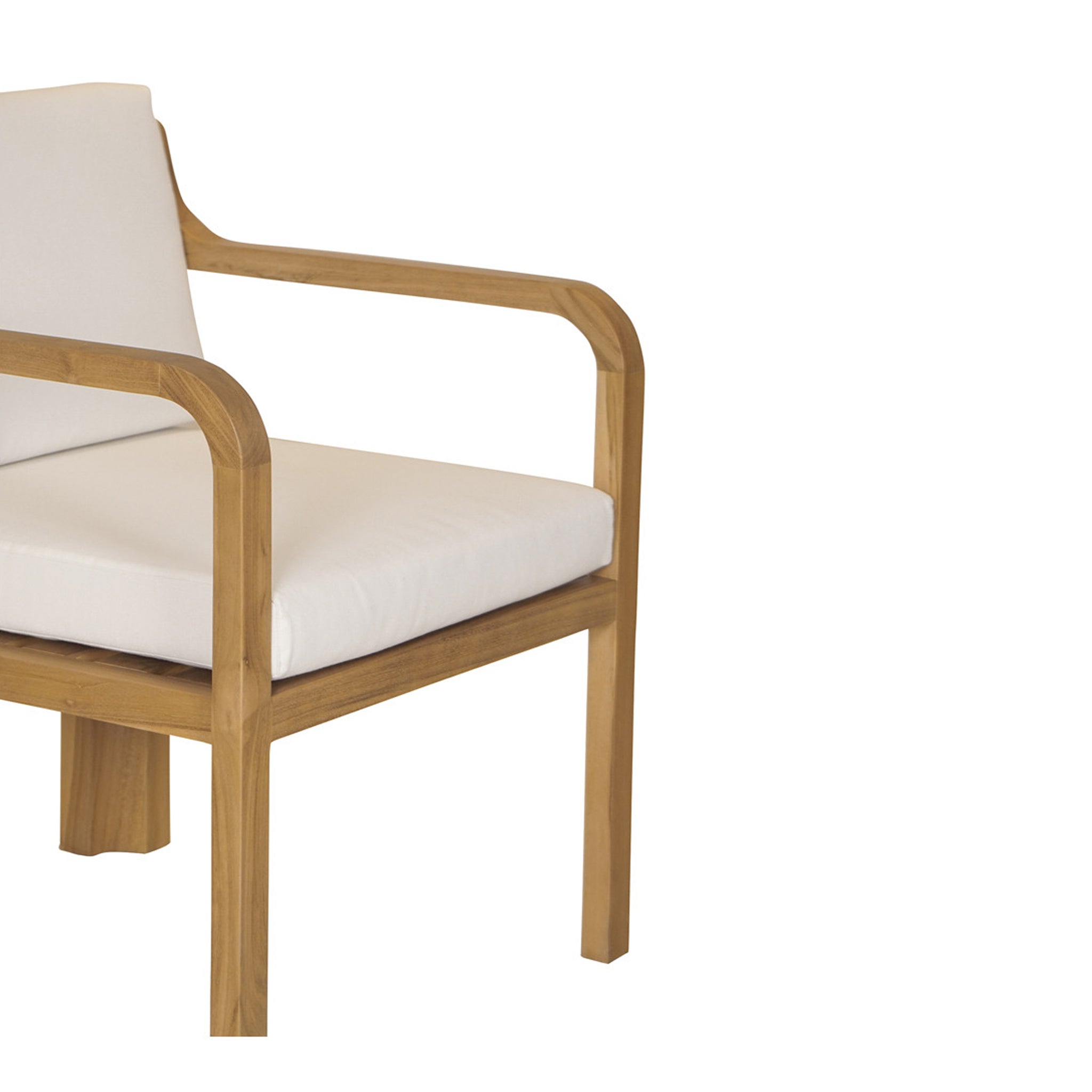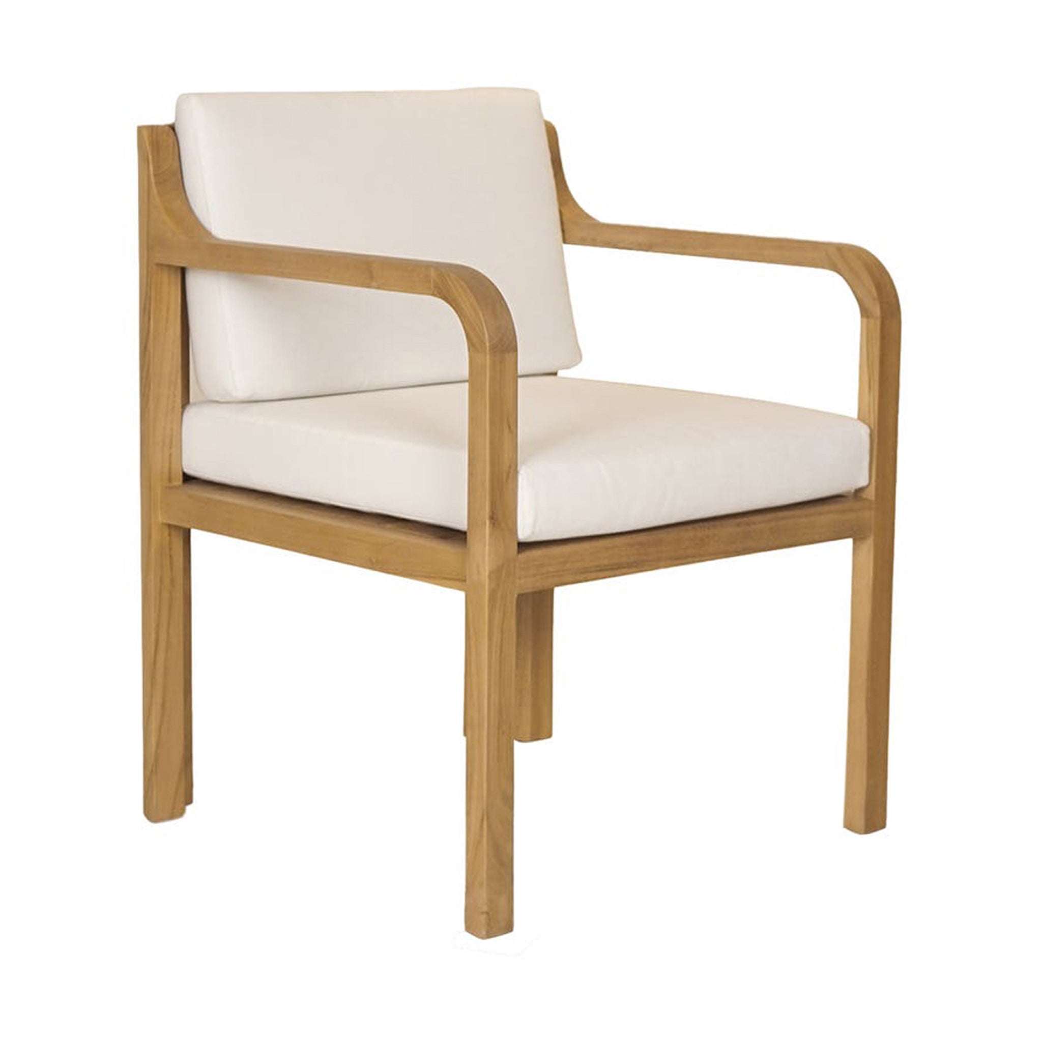 The Noemi outdoor dining chair elevates outdoor dining with comfort and enduring style. This foundational piece features a solid teak frame with quick-dry foam cushions upholstered in white 100% Olefin fabric. The curved back with gradually sloping arms creates a welcoming silhouette whose form is durable and weather resistant.