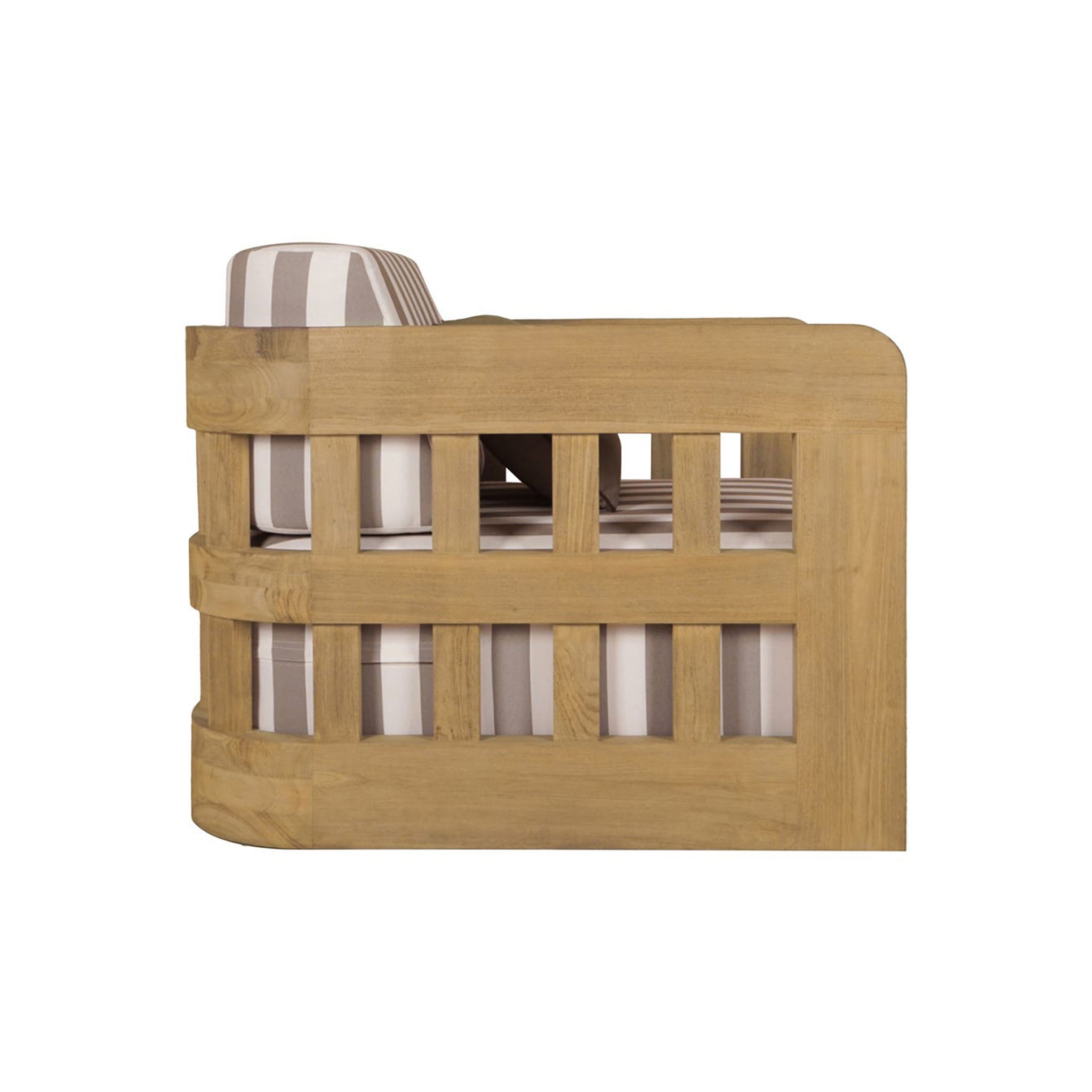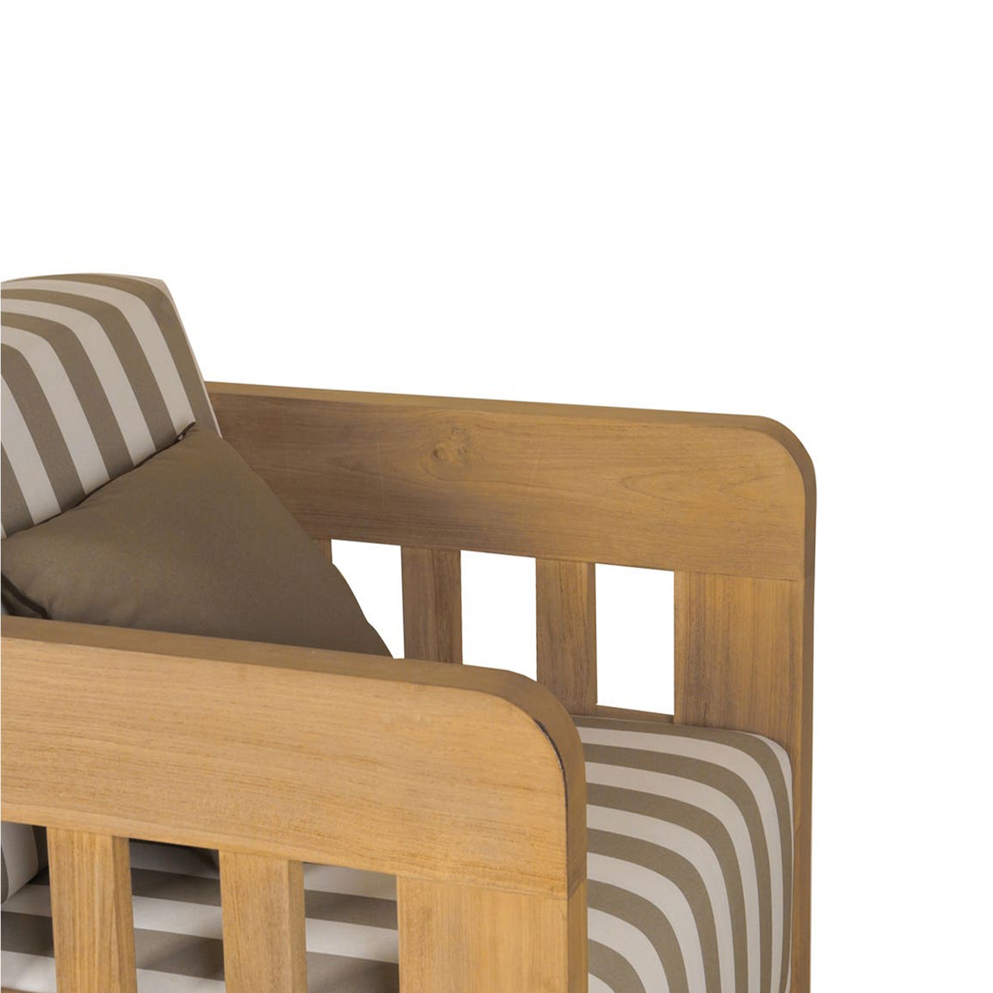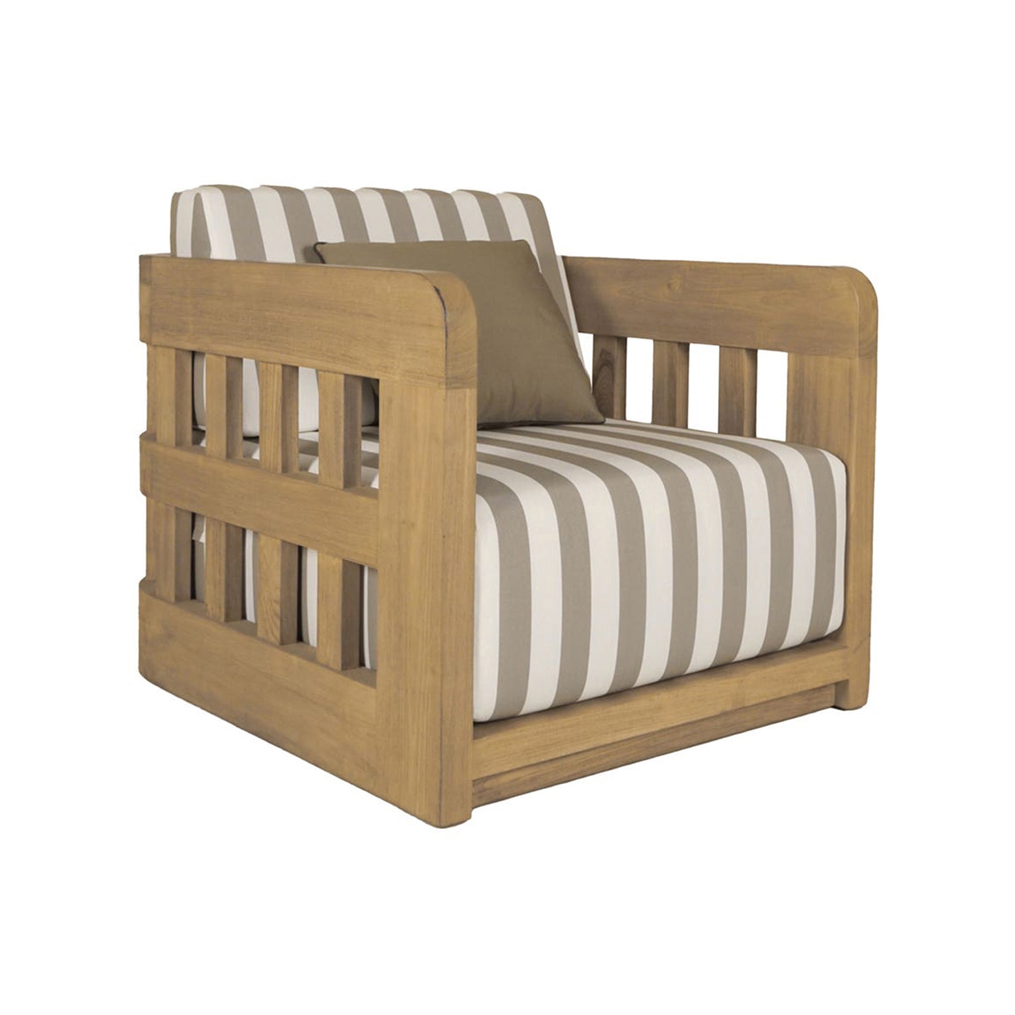 The Adriana outdoor accent chair infuses the outdoor space with vintage-inspired charm. This contemporary accent chair features a solid teak frame and quick-dry foam cushions upholstered in 100% Olefin fabric. The brown and white striped cushions, accented with a solid tone toss pillow, create visual interest without overwhelming. The curved windowpane detailing nods to vintage designs while maintaining a modern aesthetic.
