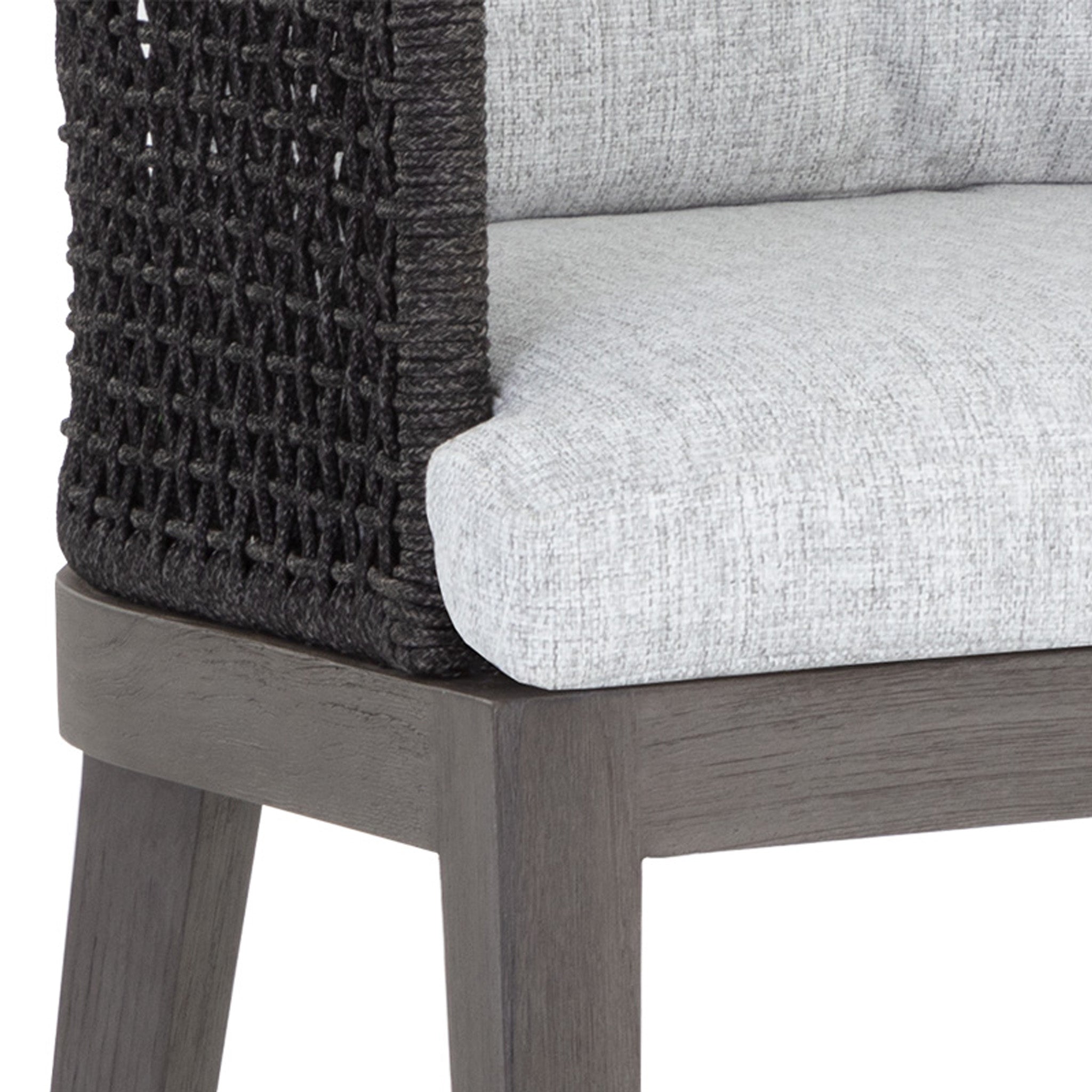 Material: Solid Teak Wood, Powder Coated Aluminum, Dark Greymix Weave on Black Aluminum Frame