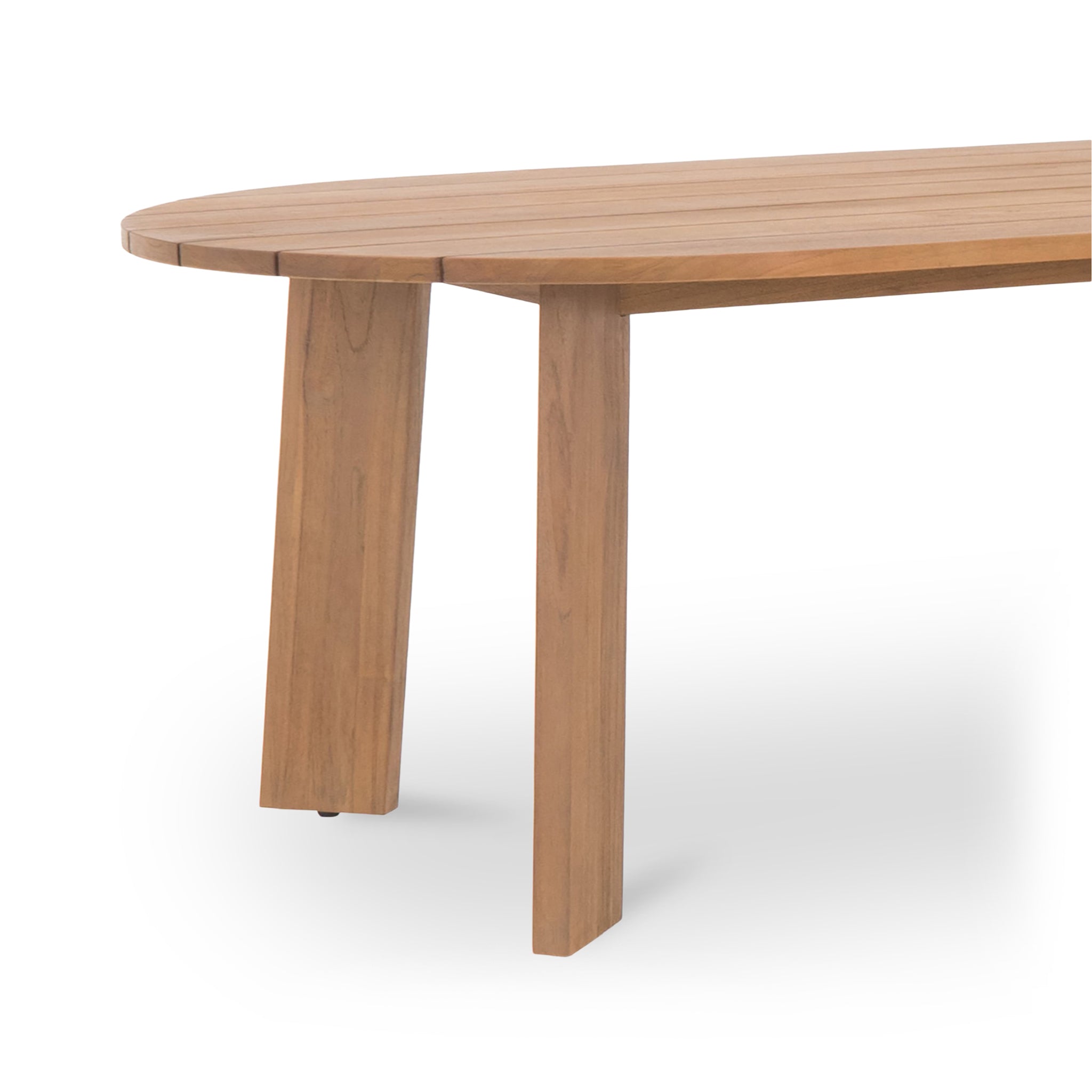 Embodying contemporary sophistication, this solid teak table celebrates natural material. The Donald outdoor dining table's angular legs provide a striking contrast to the oval, curved top, creating a minimalist yet elegant aesthetic. Over time, the table embraces a unique silver-grey patina as the teak and oils naturally weather. Though the process lends to its character, a teak sealer can be applied to maintain its original allure.