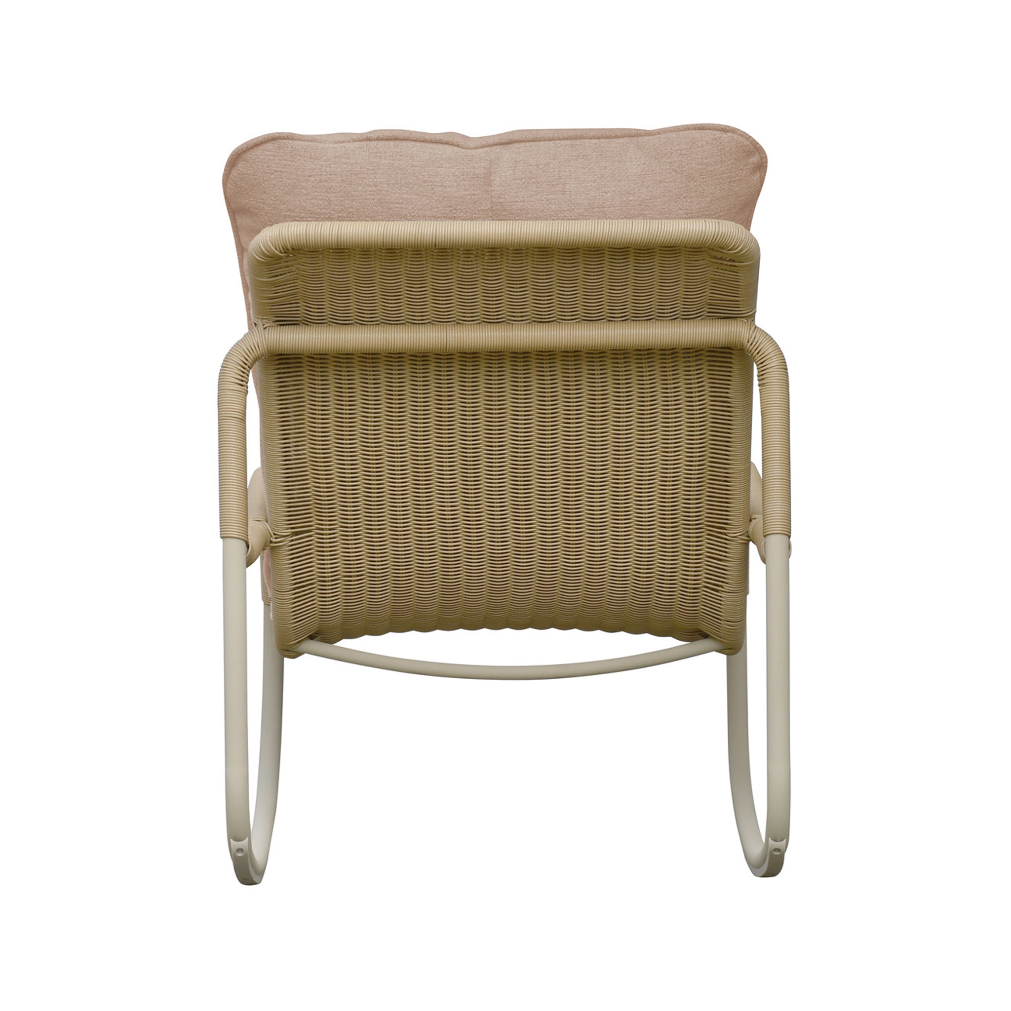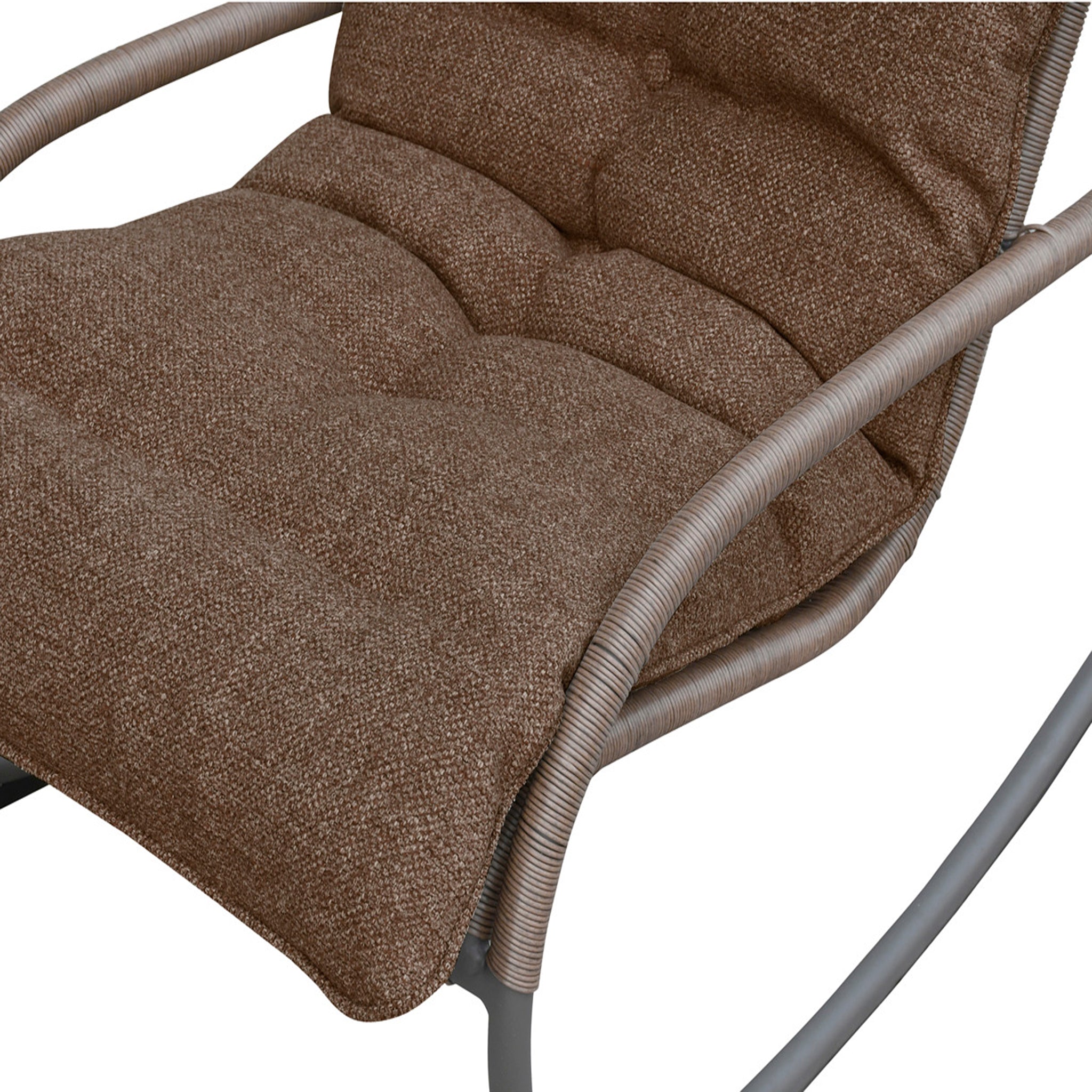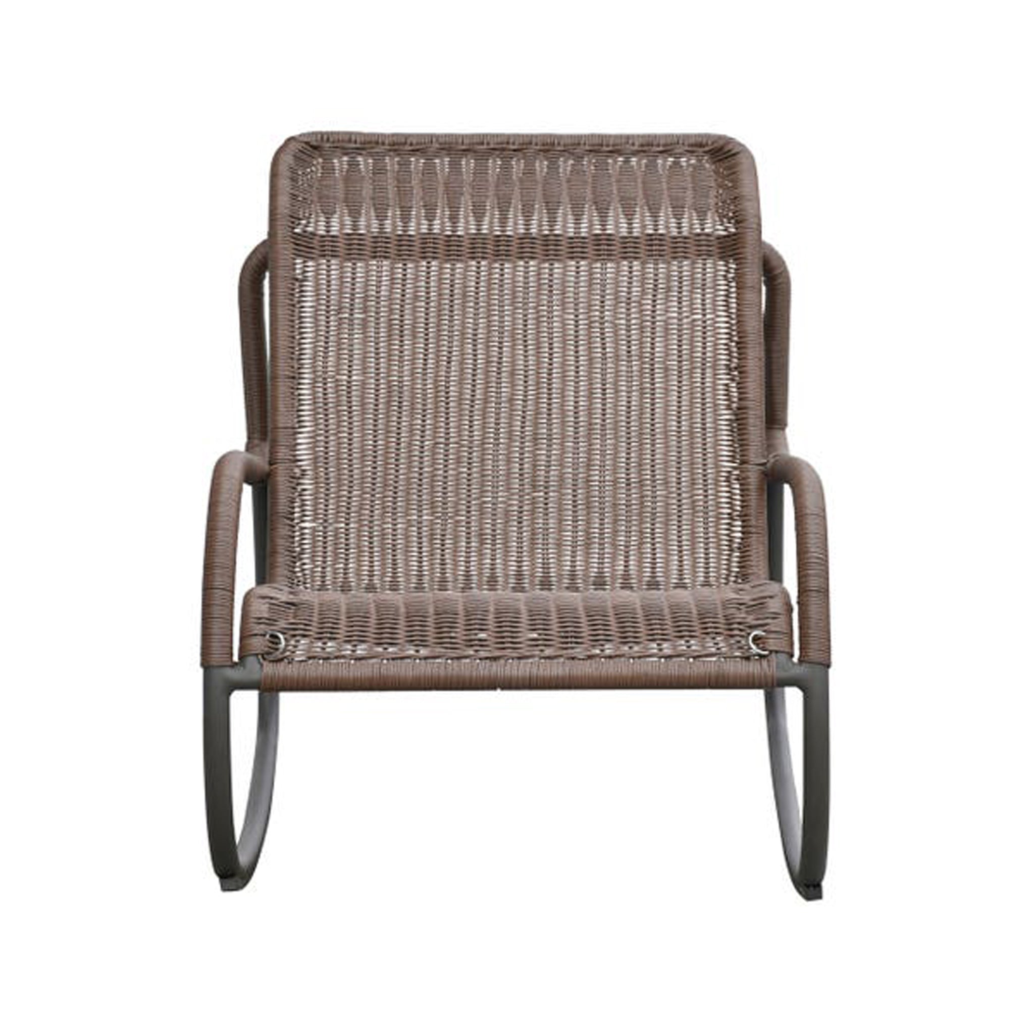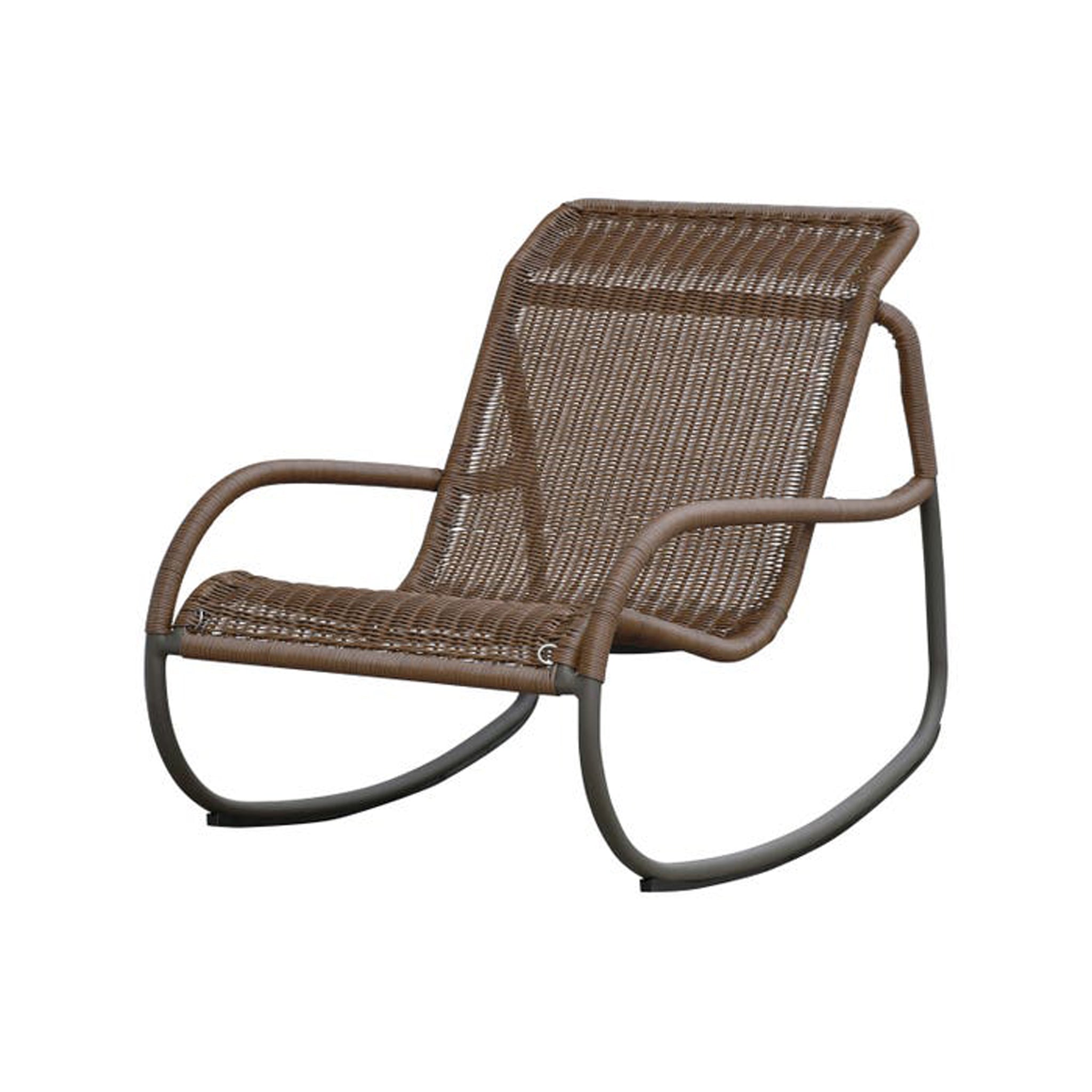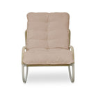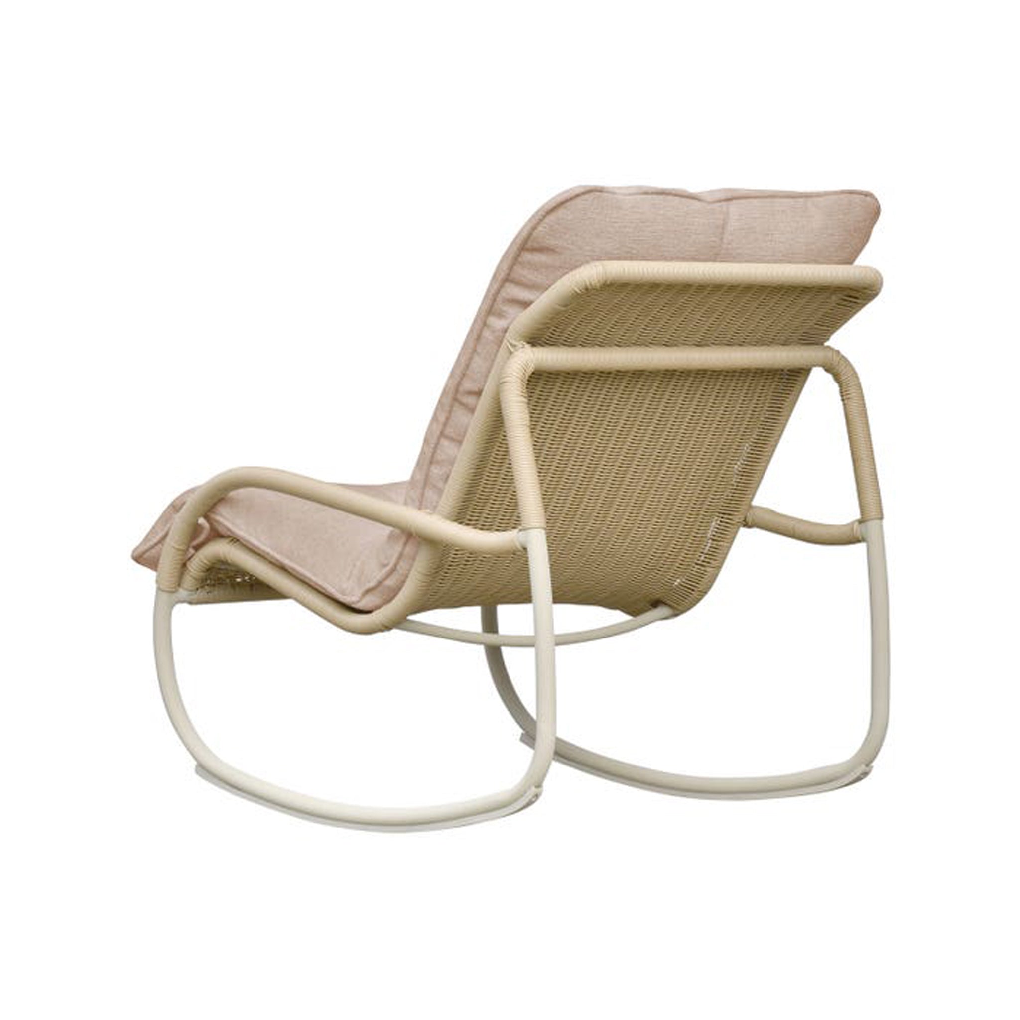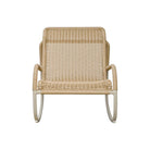 The Livorno rocking chair's sleek aluminum frame harmoniously blends with synthetic wicker, creating an understated luxe feel. The plush cushion molds to your body, inviting relaxation. Remove the cushion to reveal intricate woven seating, offering a minimalist alternative.