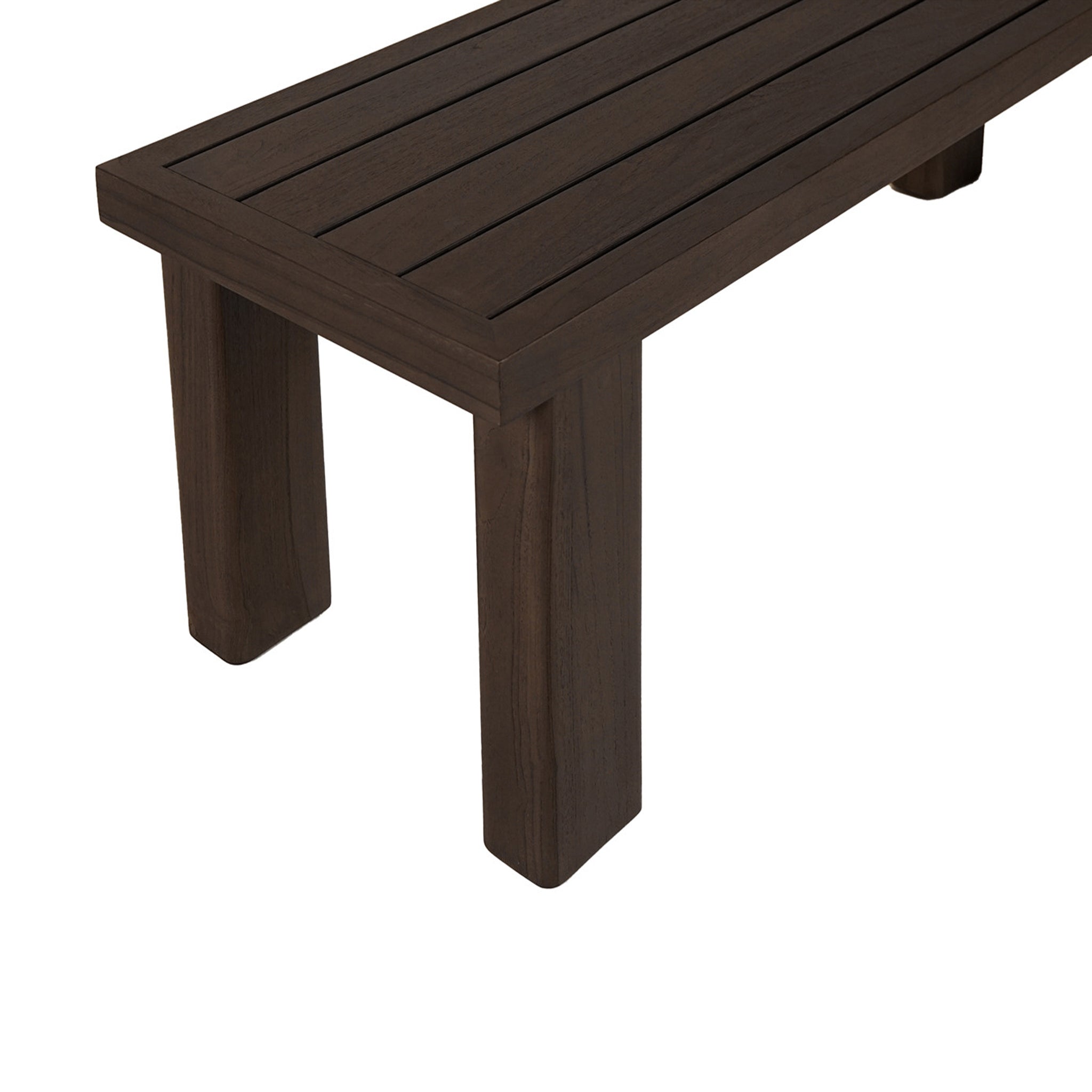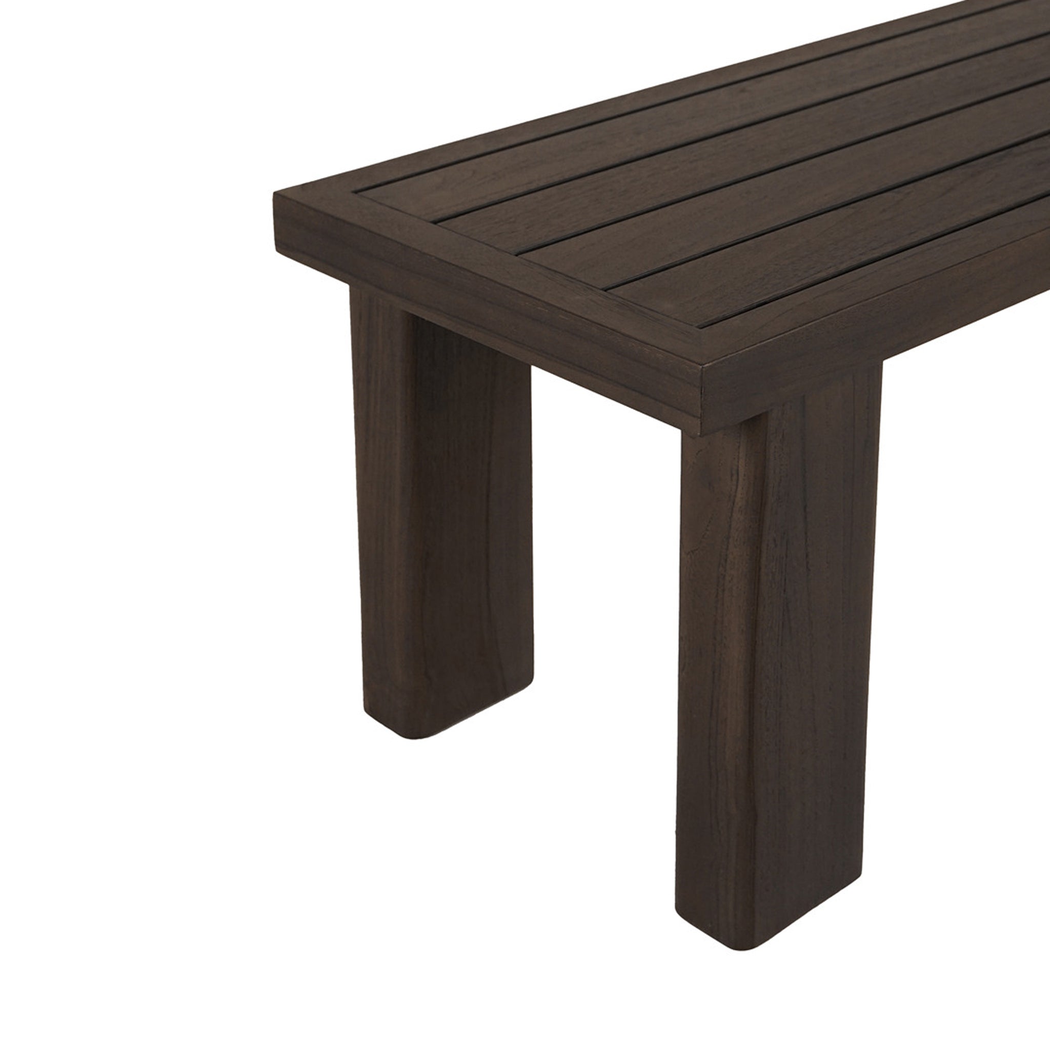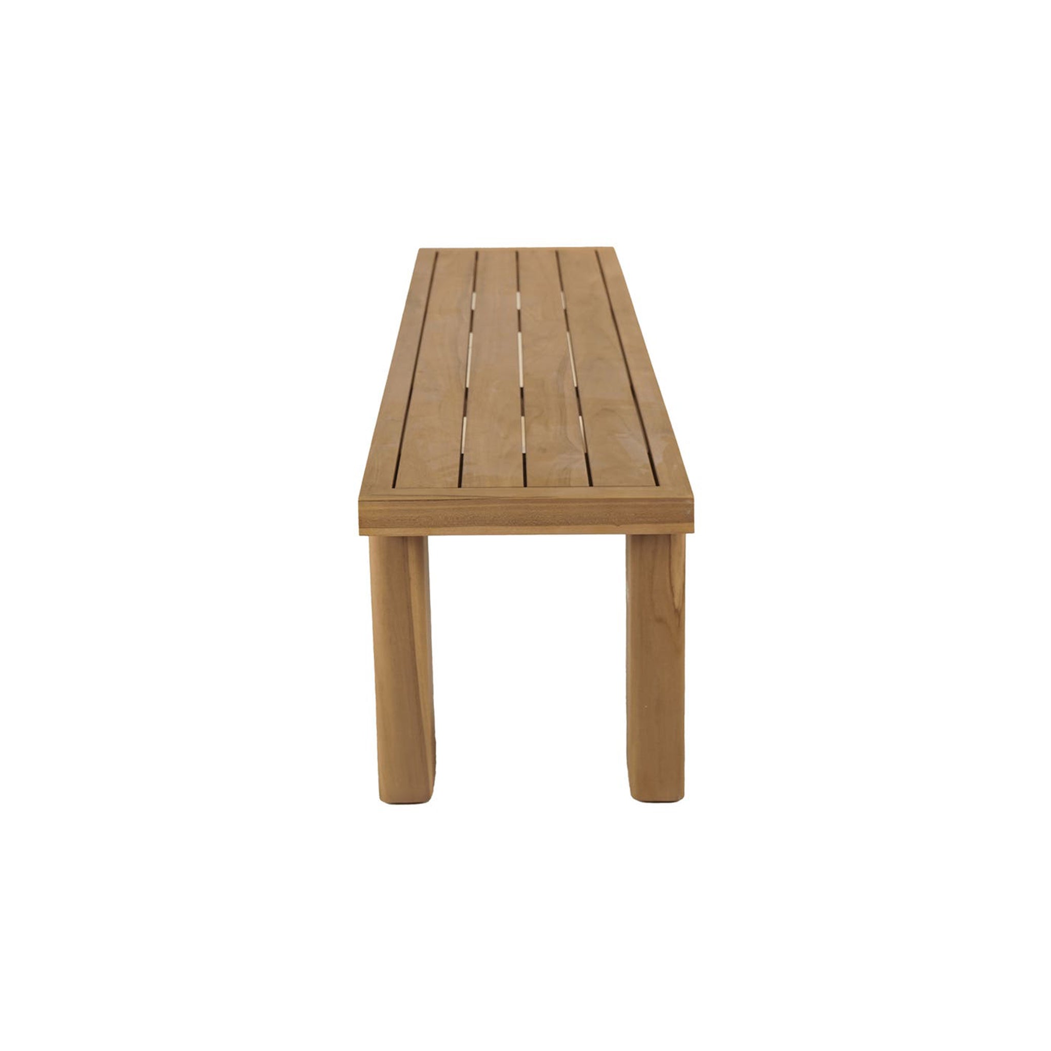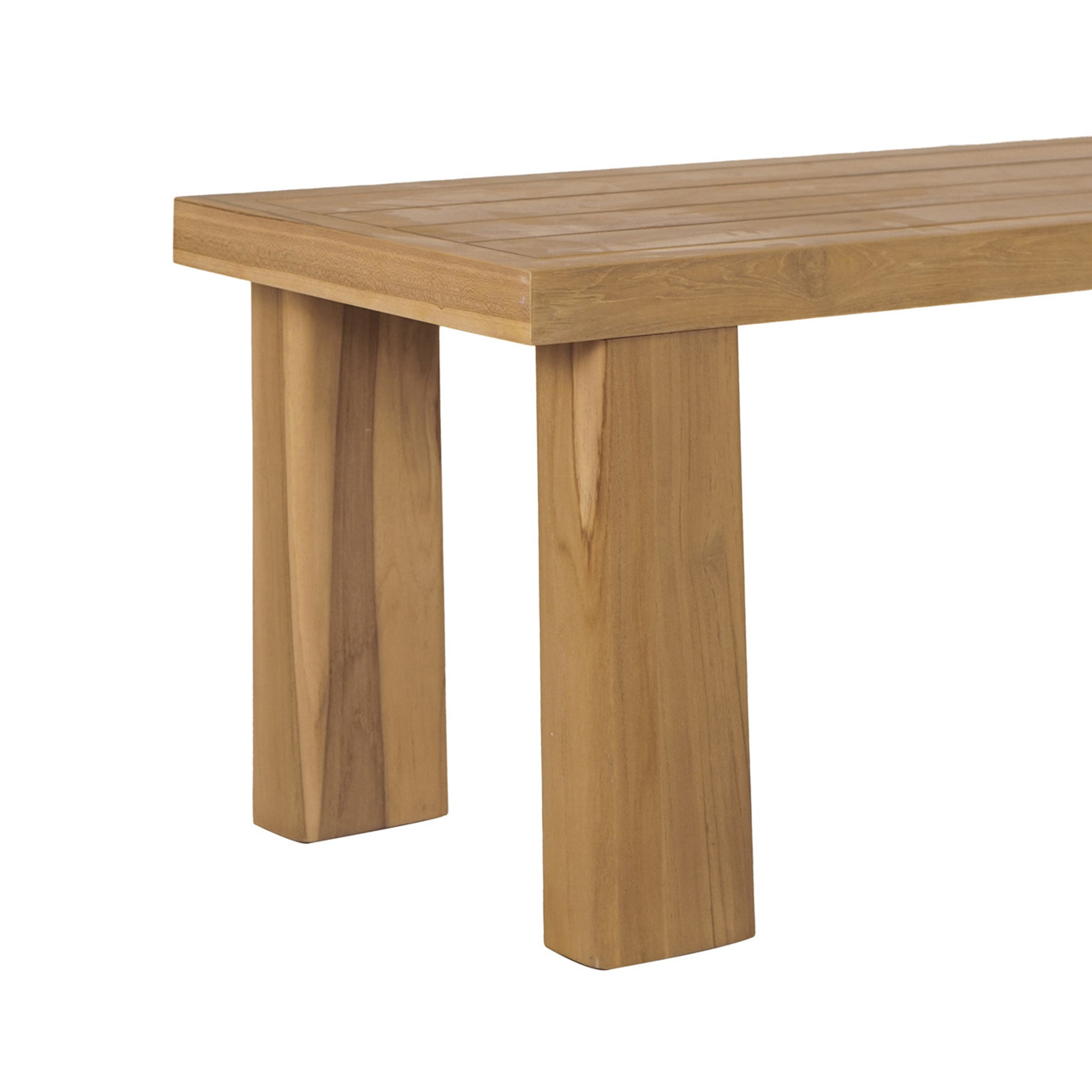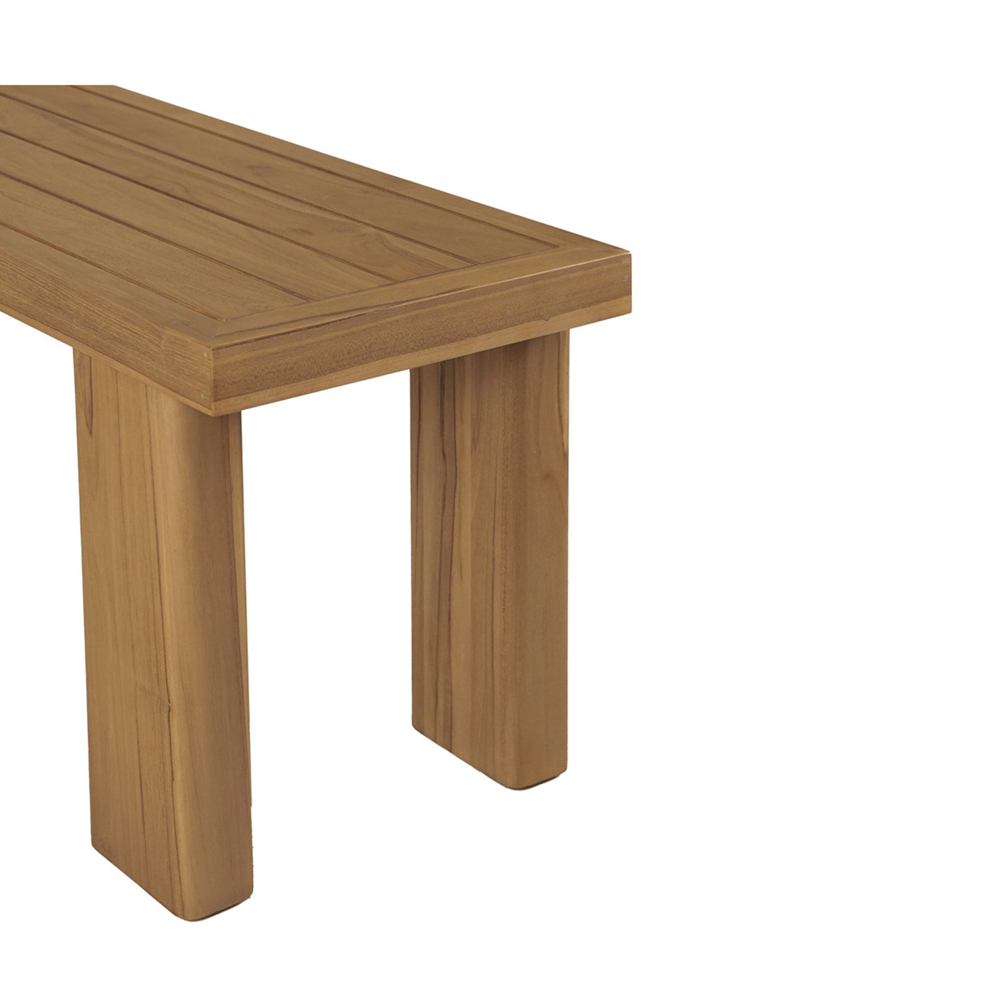 The Marzia outdoor bench complements outdoor dining with refined simplicity. This modern slatted bench, crafted from solid teak with a natural finish, matches the silhouette of the Marzia dining table. Its clean lines and durable construction make it a versatile seating option for the patio, garden, or poolside area, adding a touch of sophistication to the outdoor space.