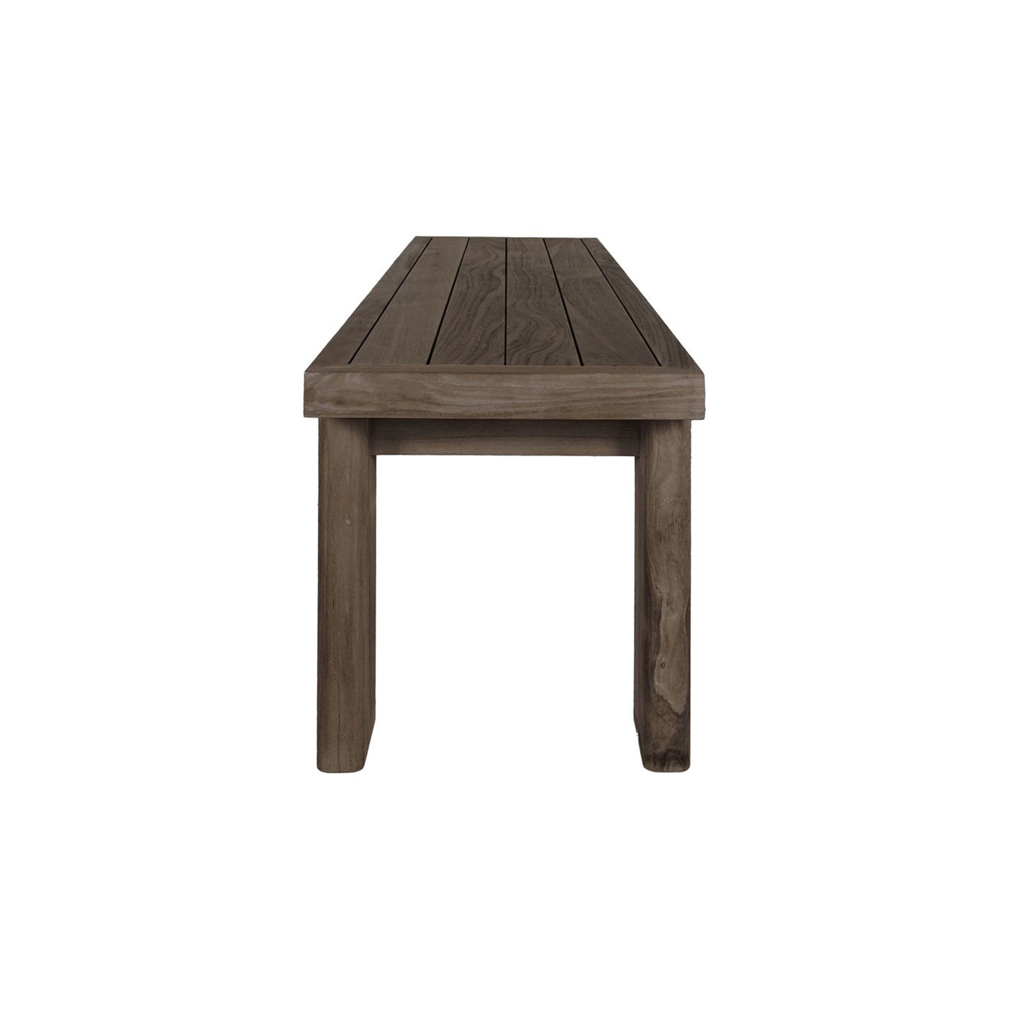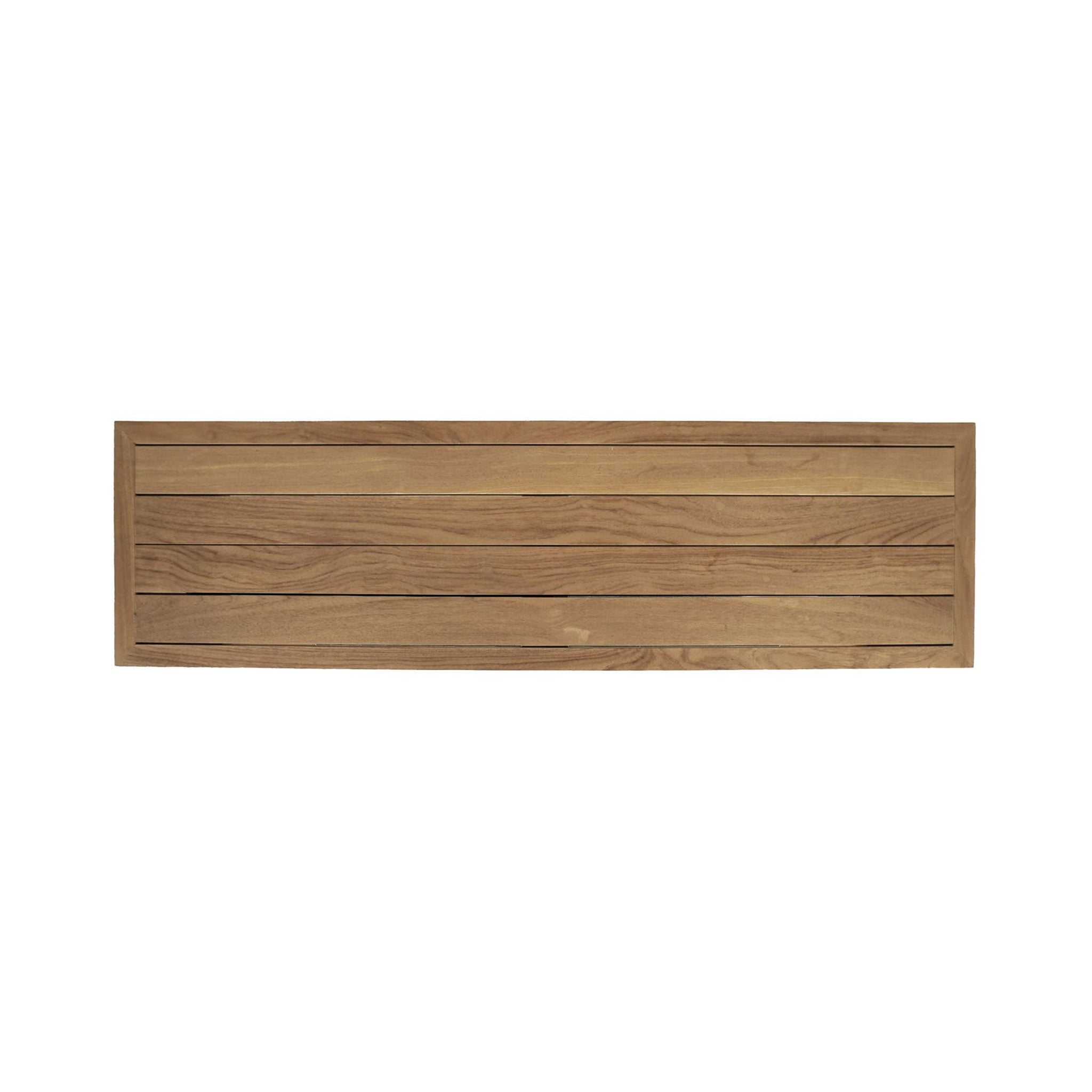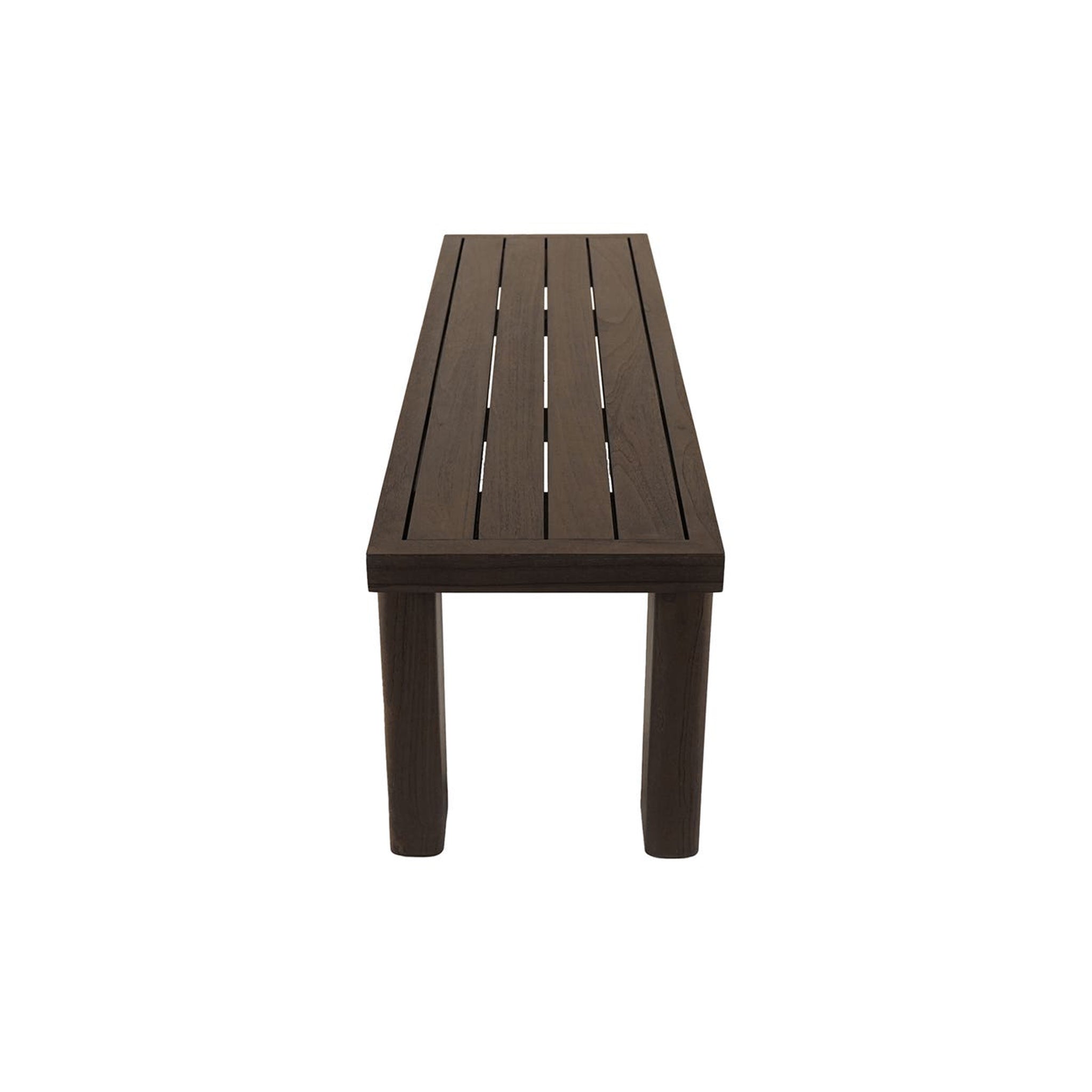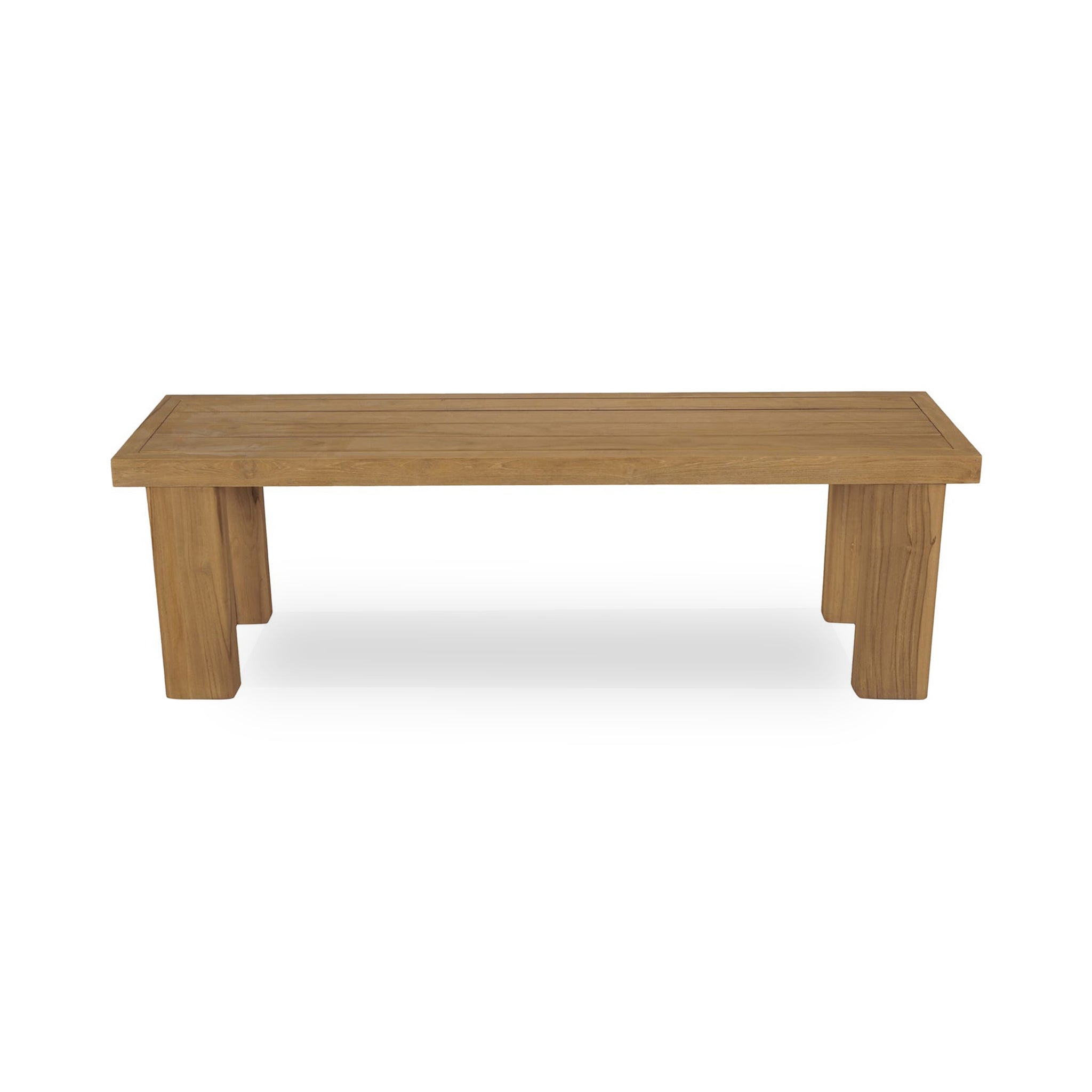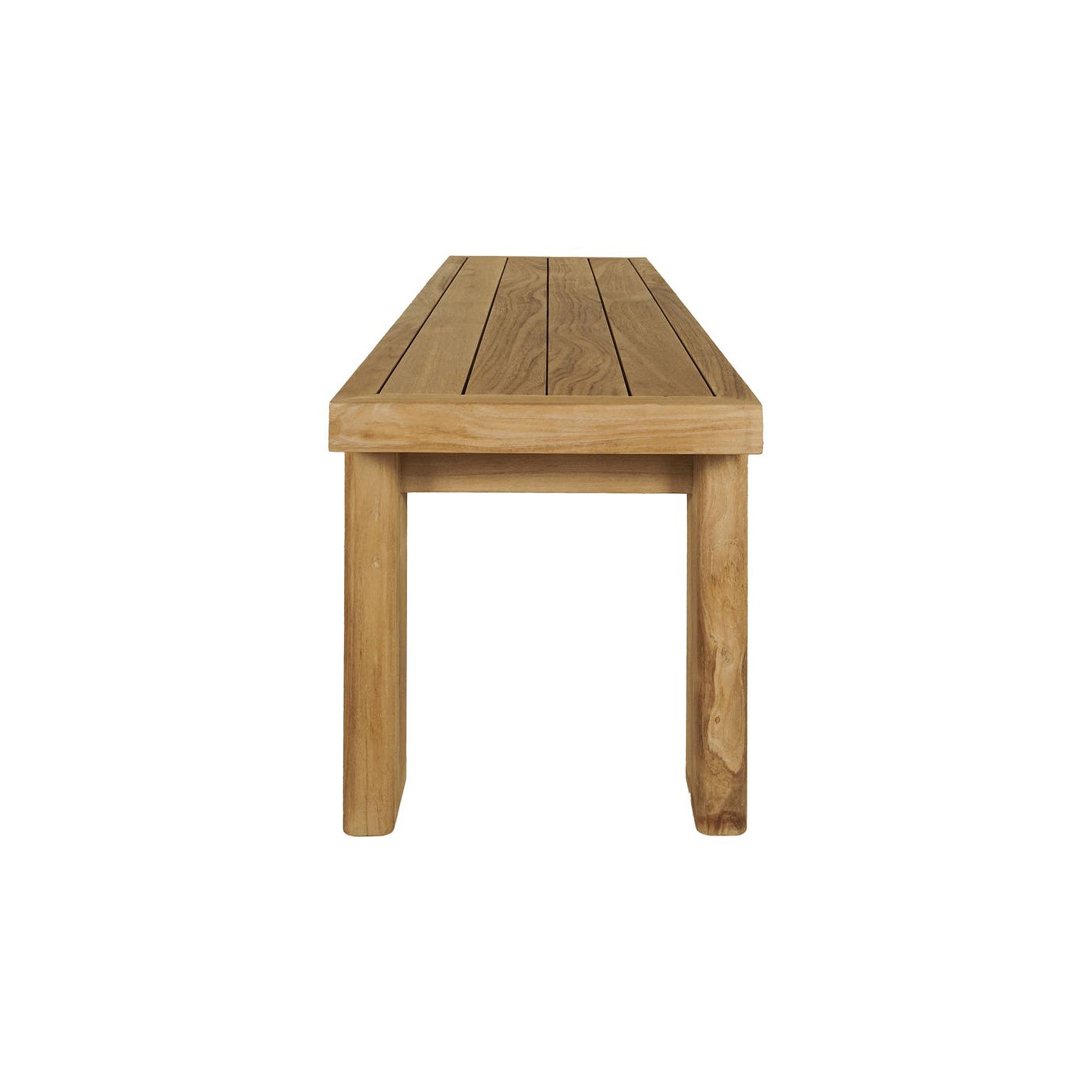 The Marzia outdoor bench complements outdoor dining with refined simplicity. This modern slatted bench, crafted from solid teak with a natural finish, matches the silhouette of the Marzia dining table. Its clean lines and durable construction make it a versatile seating option for the patio, garden, or poolside area, adding a touch of sophistication to the outdoor space.