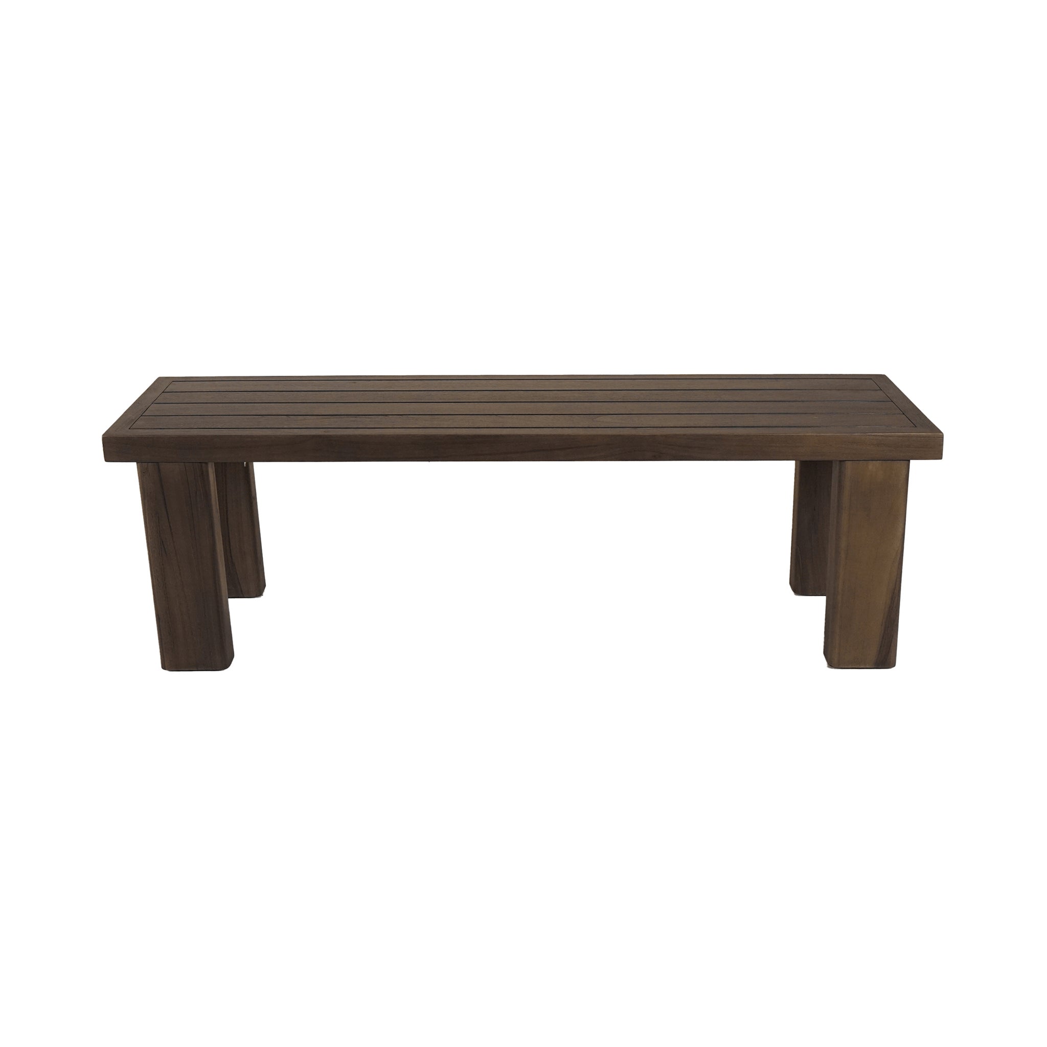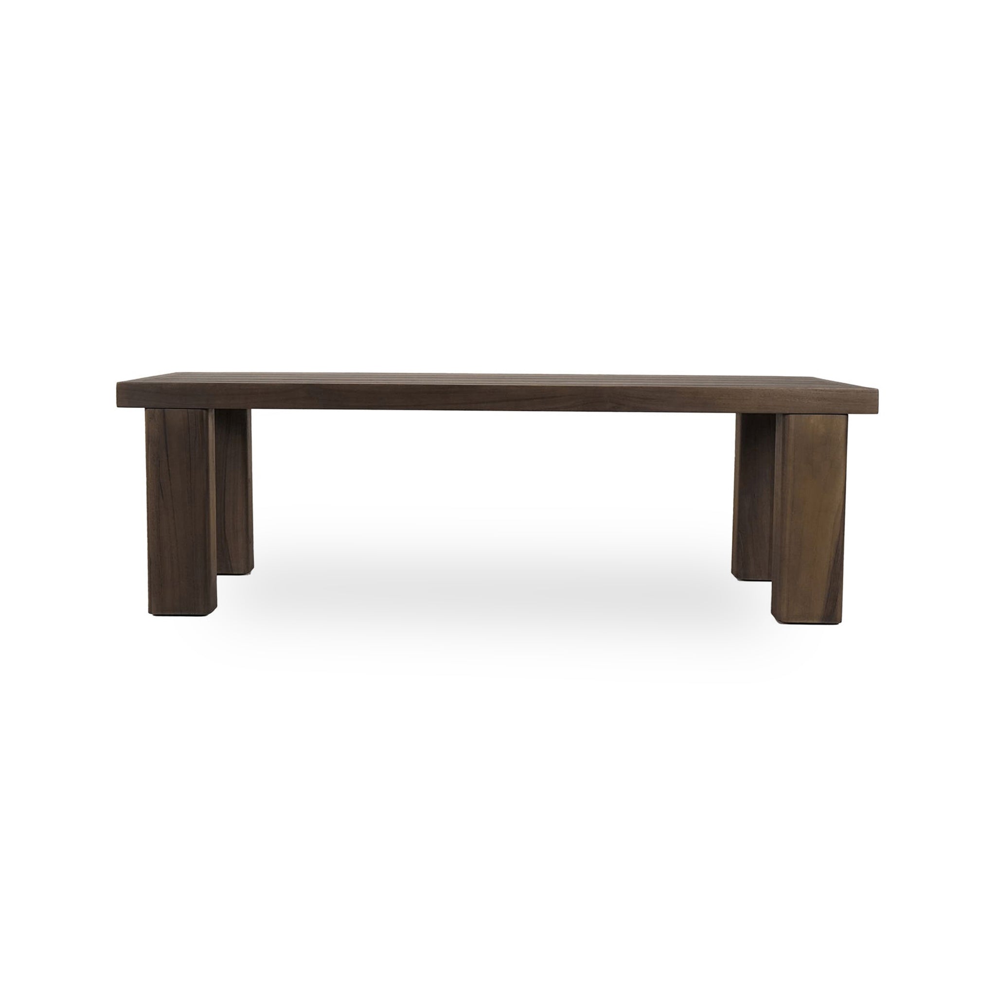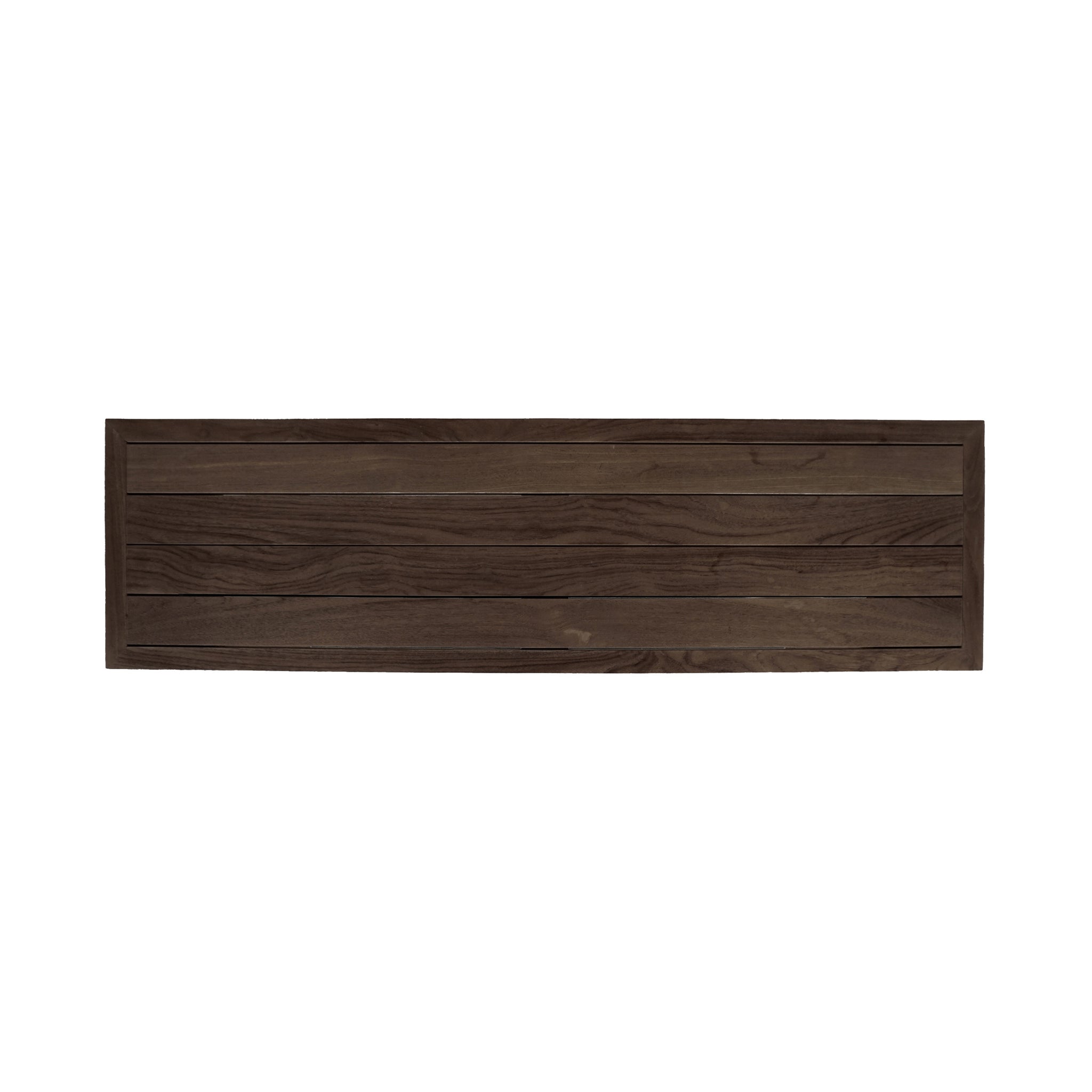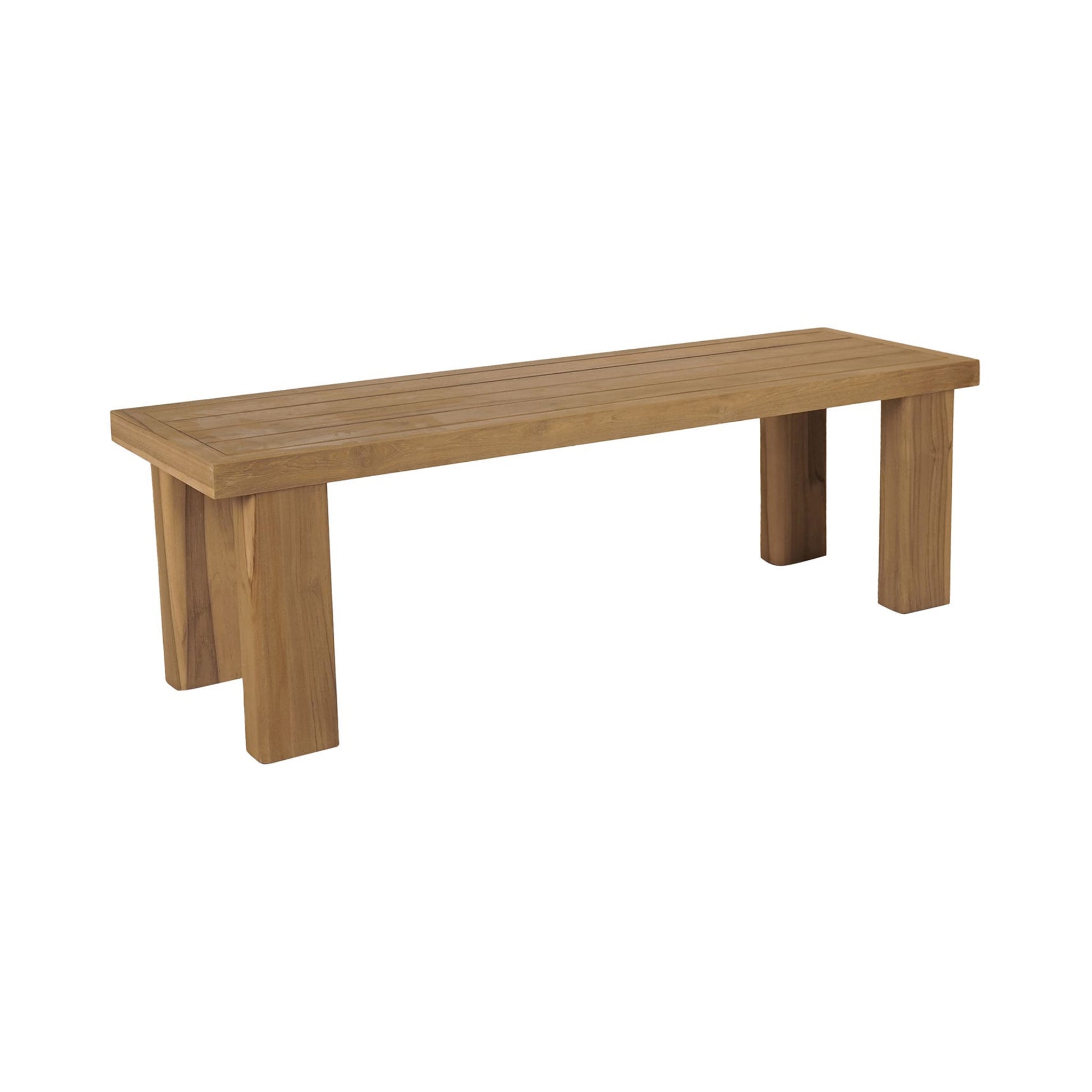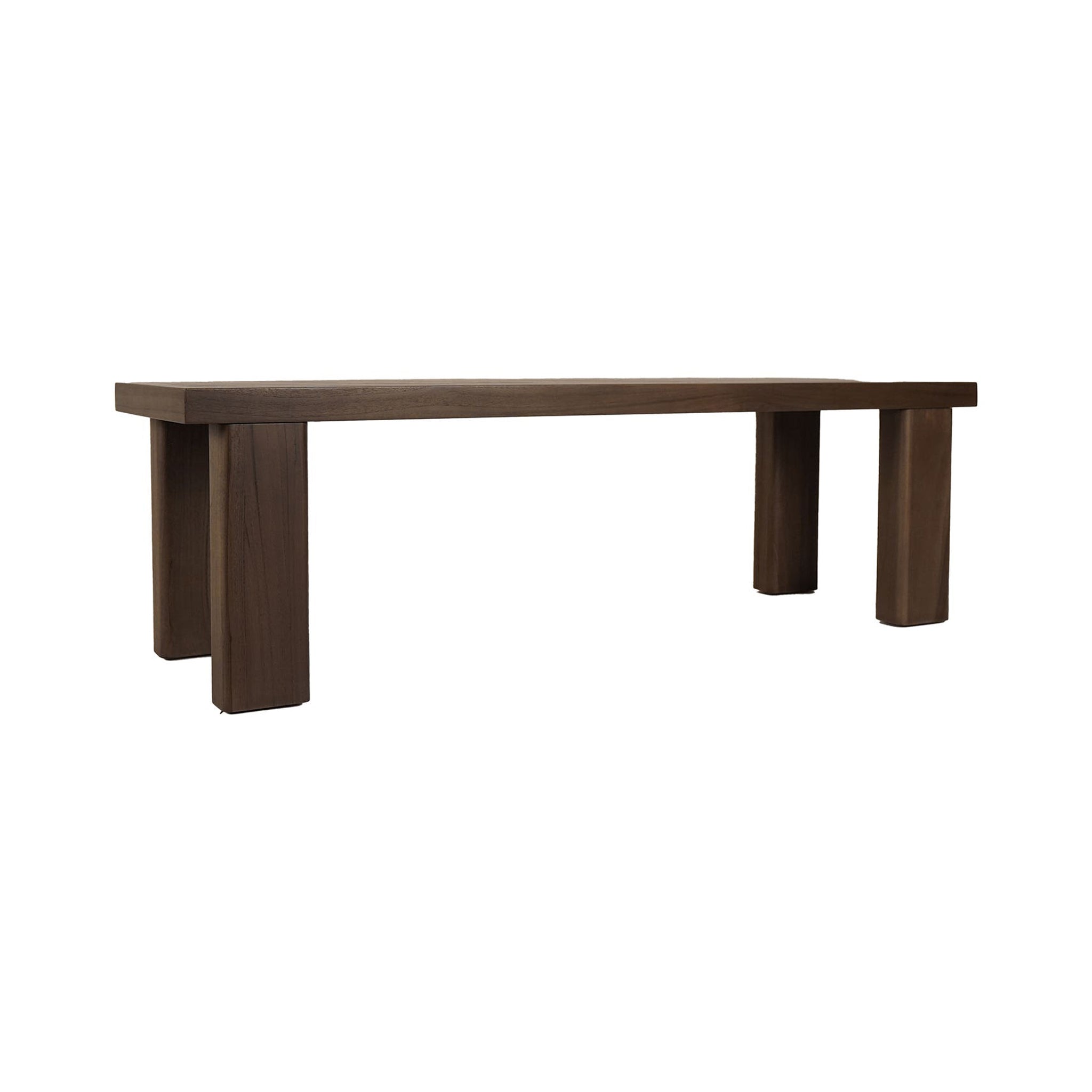 The Marzia outdoor bench complements outdoor dining with refined simplicity. This modern slatted bench, crafted from solid teak with a natural finish, matches the silhouette of the Marzia dining table. Its clean lines and durable construction make it a versatile seating option for the patio, garden, or poolside area, adding a touch of sophistication to the outdoor space.