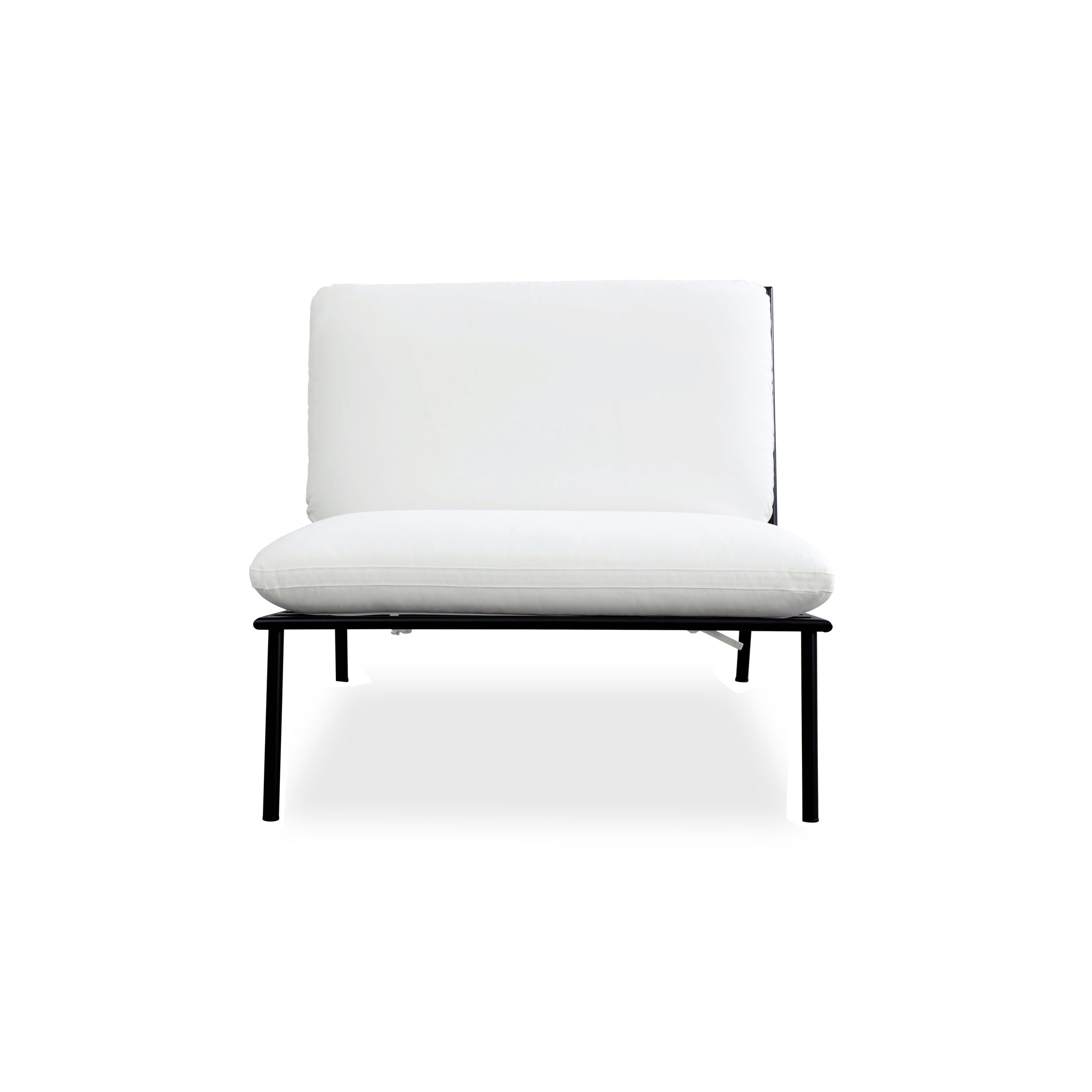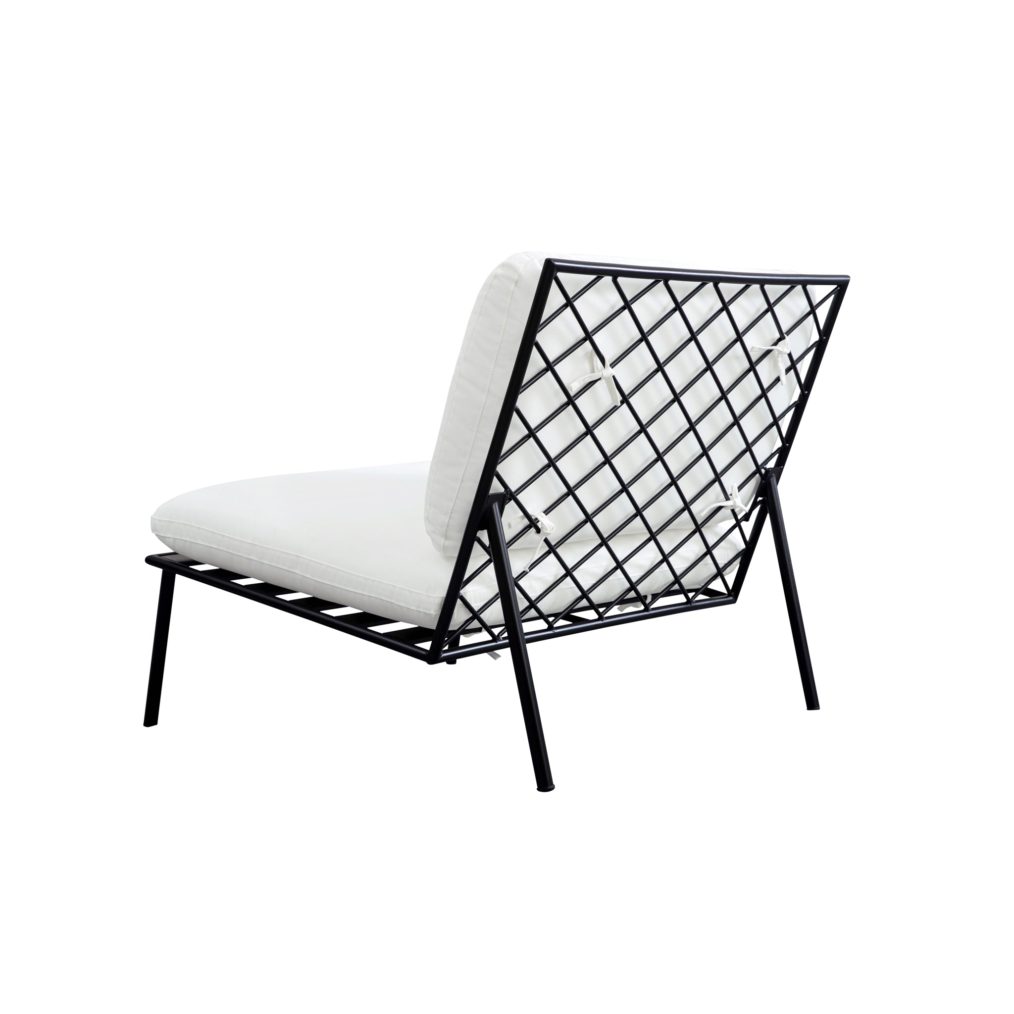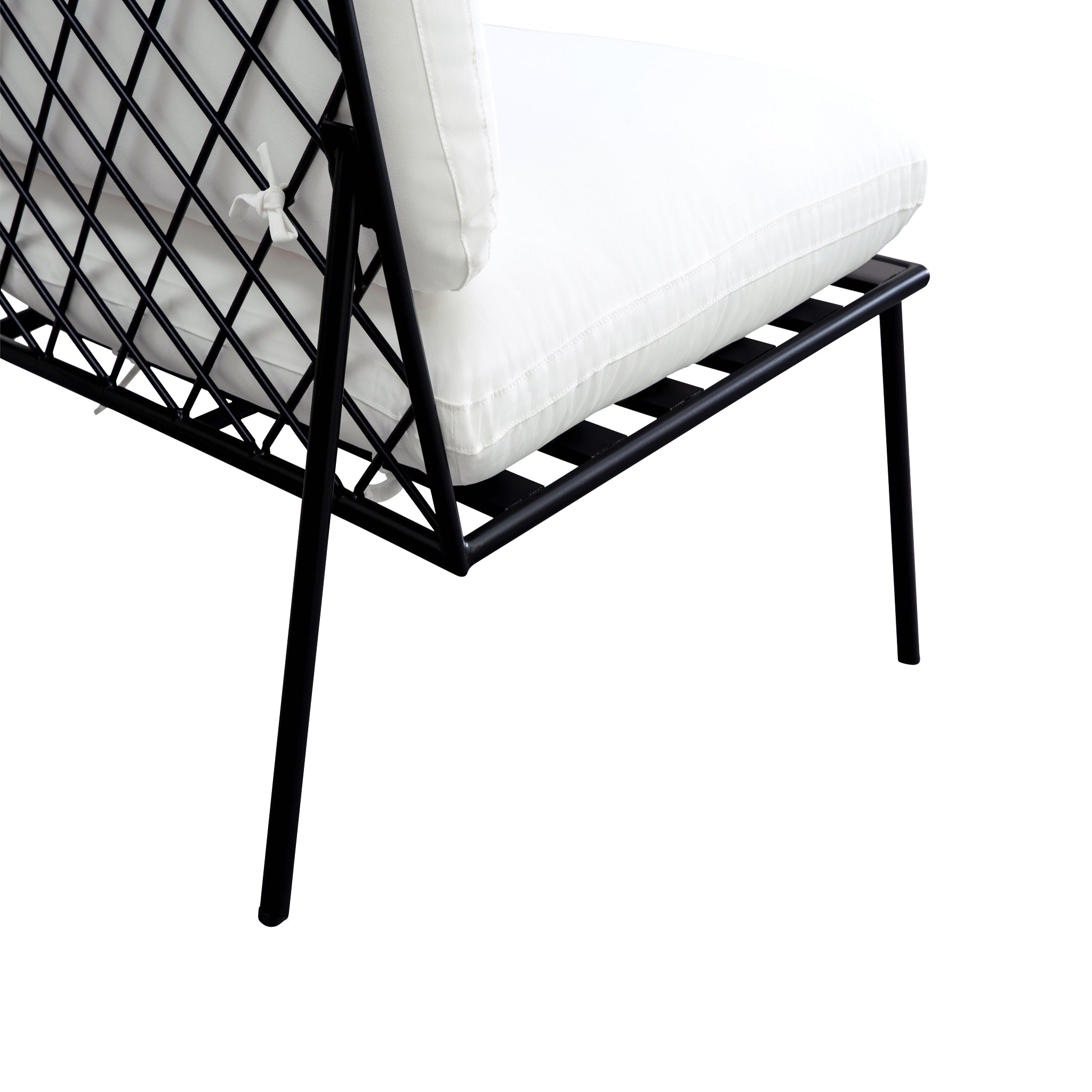 The Sarah outdoor accent chair's armless design includes quick-dry foam cushions covered in 100% Olefin fabric that resists fading and includes ties for stability. It features a durable stainless-steel frame with elegant crisscross detailing. This piece combines superior comfort with exceptional weather resilience, making it perfect for outdoor use.