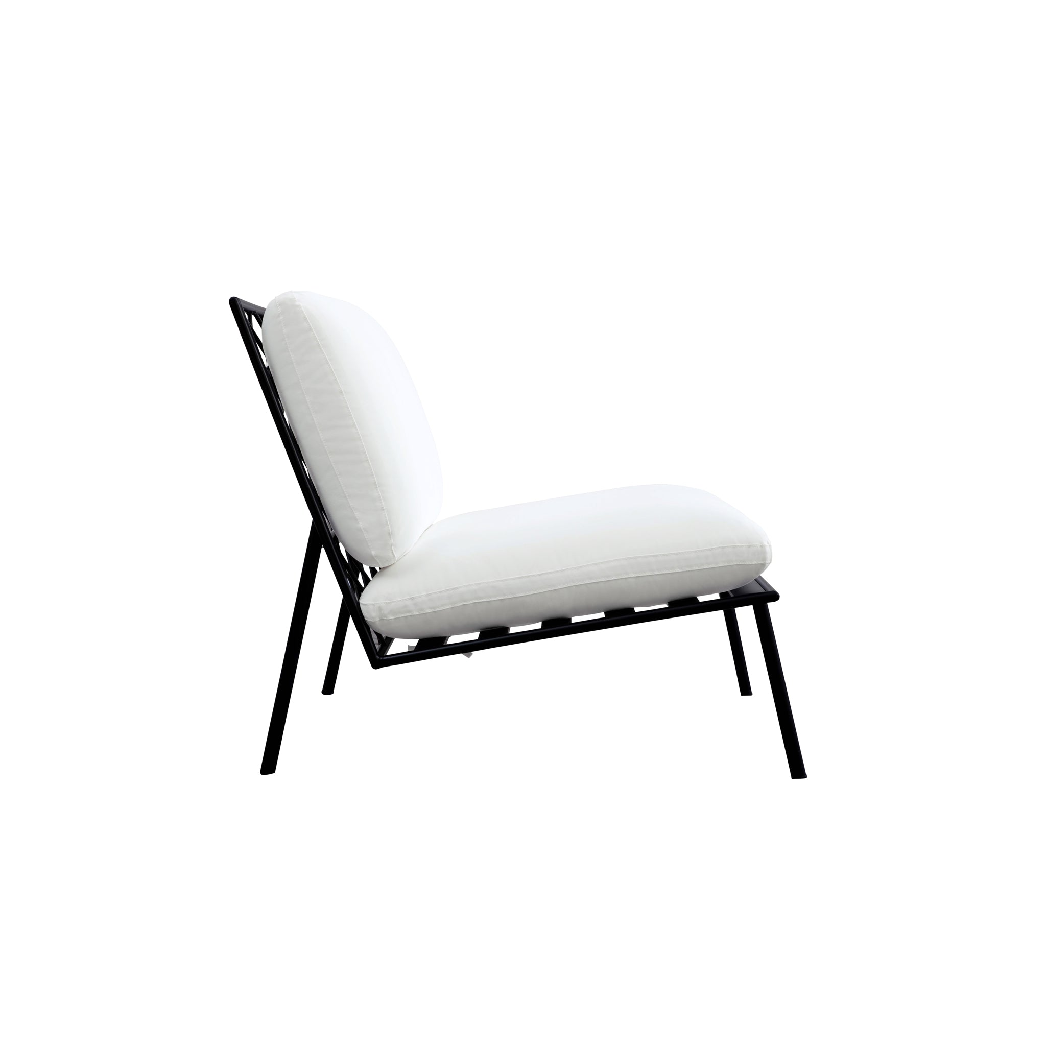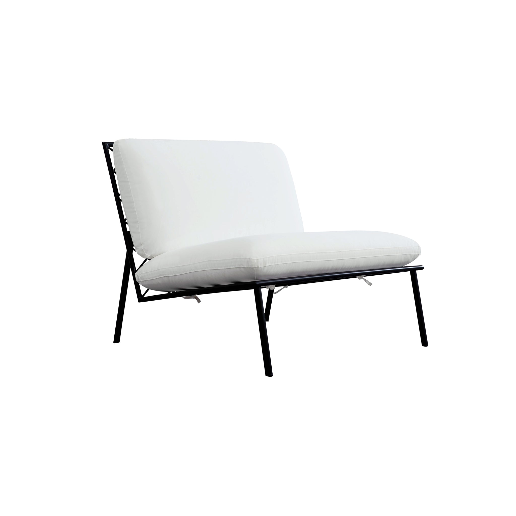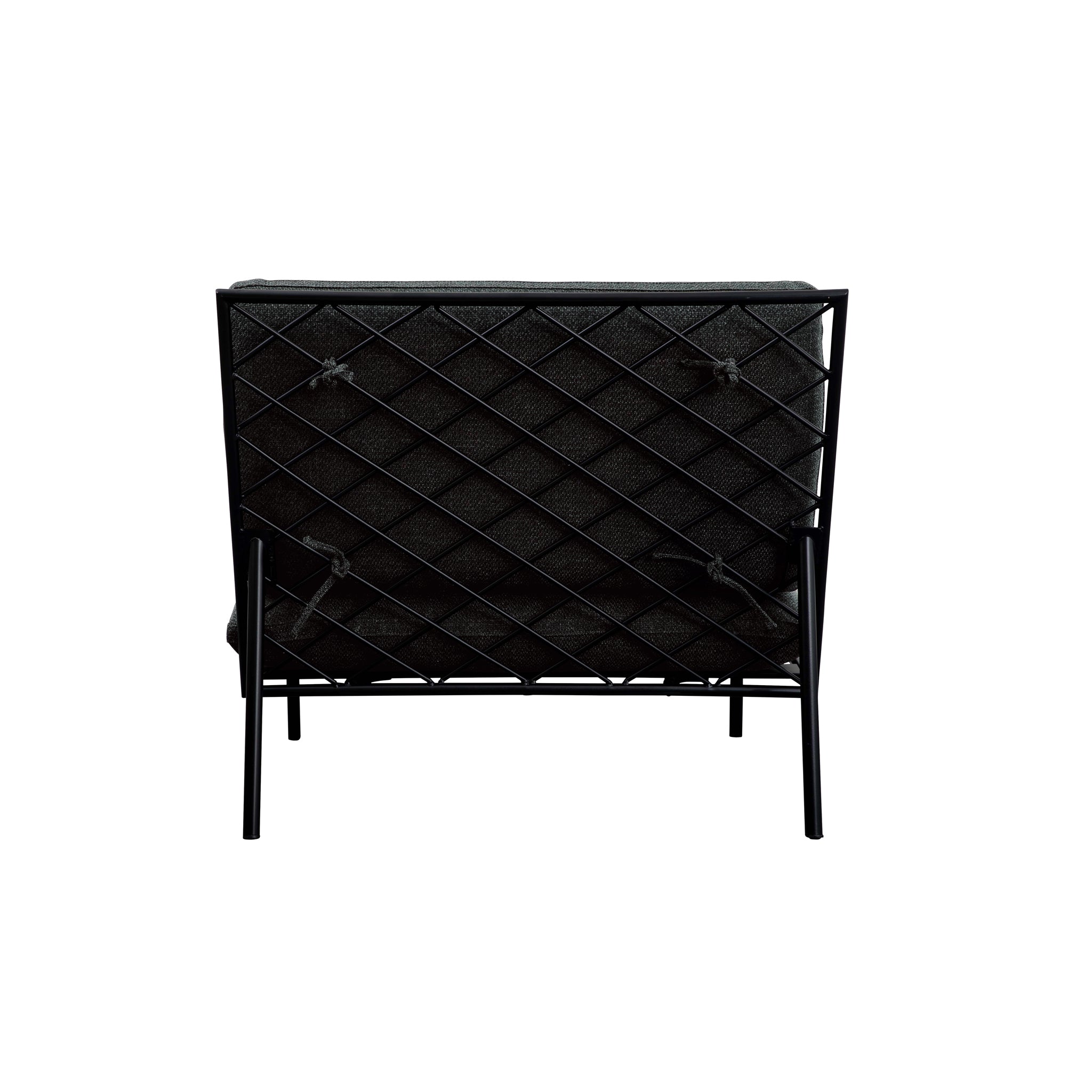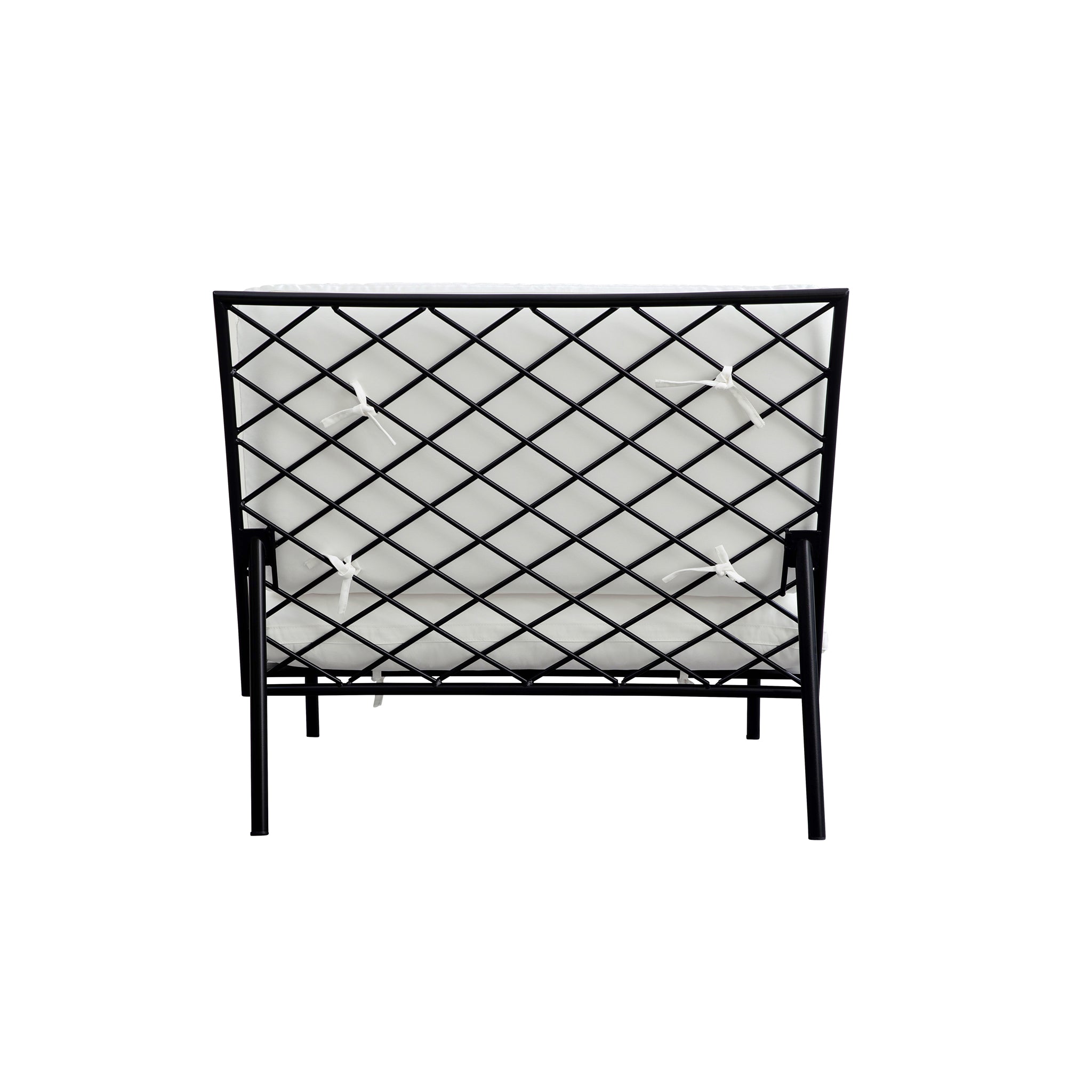 The Sarah outdoor accent chair's armless design includes quick-dry foam cushions covered in 100% Olefin fabric that resists fading and includes ties for stability. It features a durable stainless-steel frame with elegant crisscross detailing. This piece combines superior comfort with exceptional weather resilience, making it perfect for outdoor use.