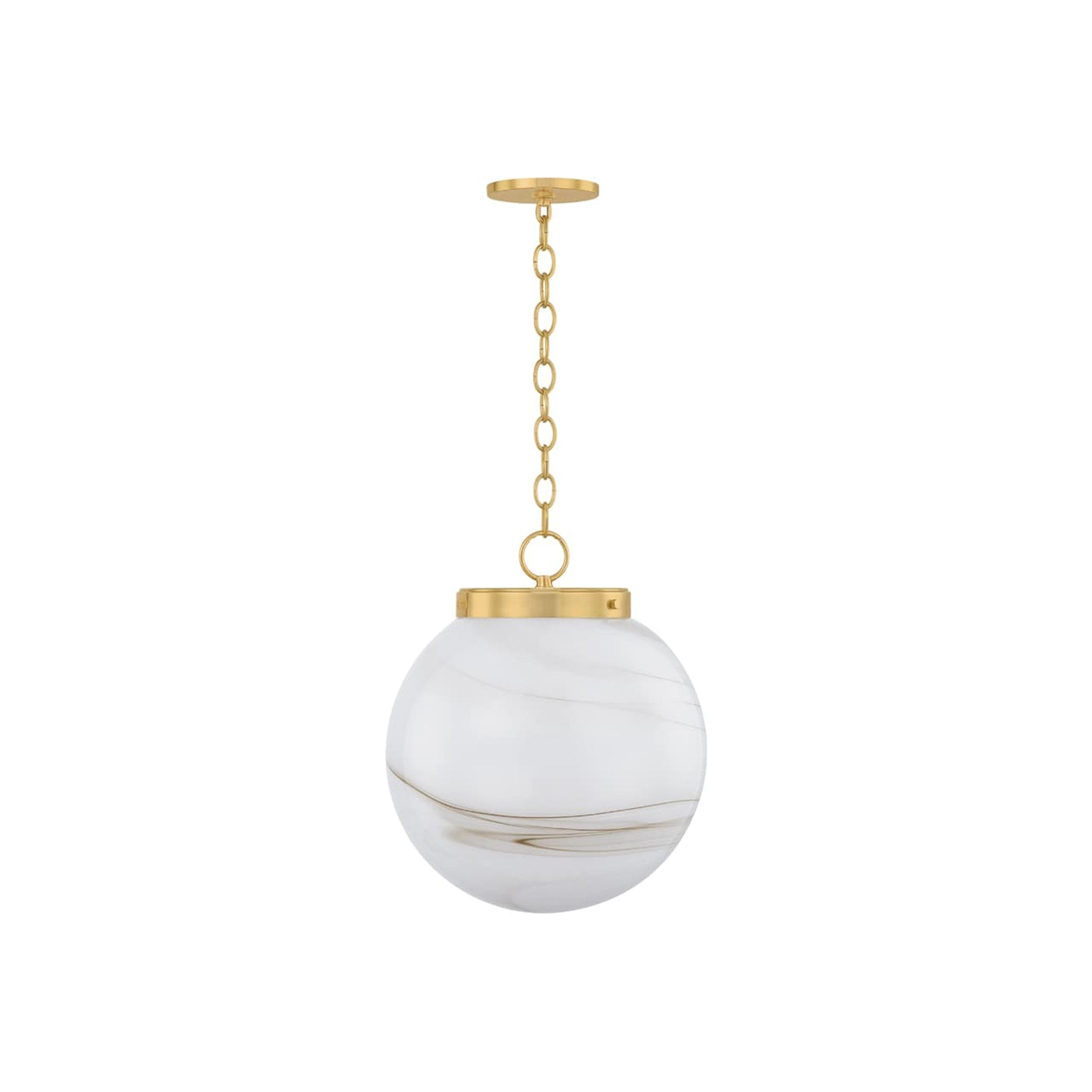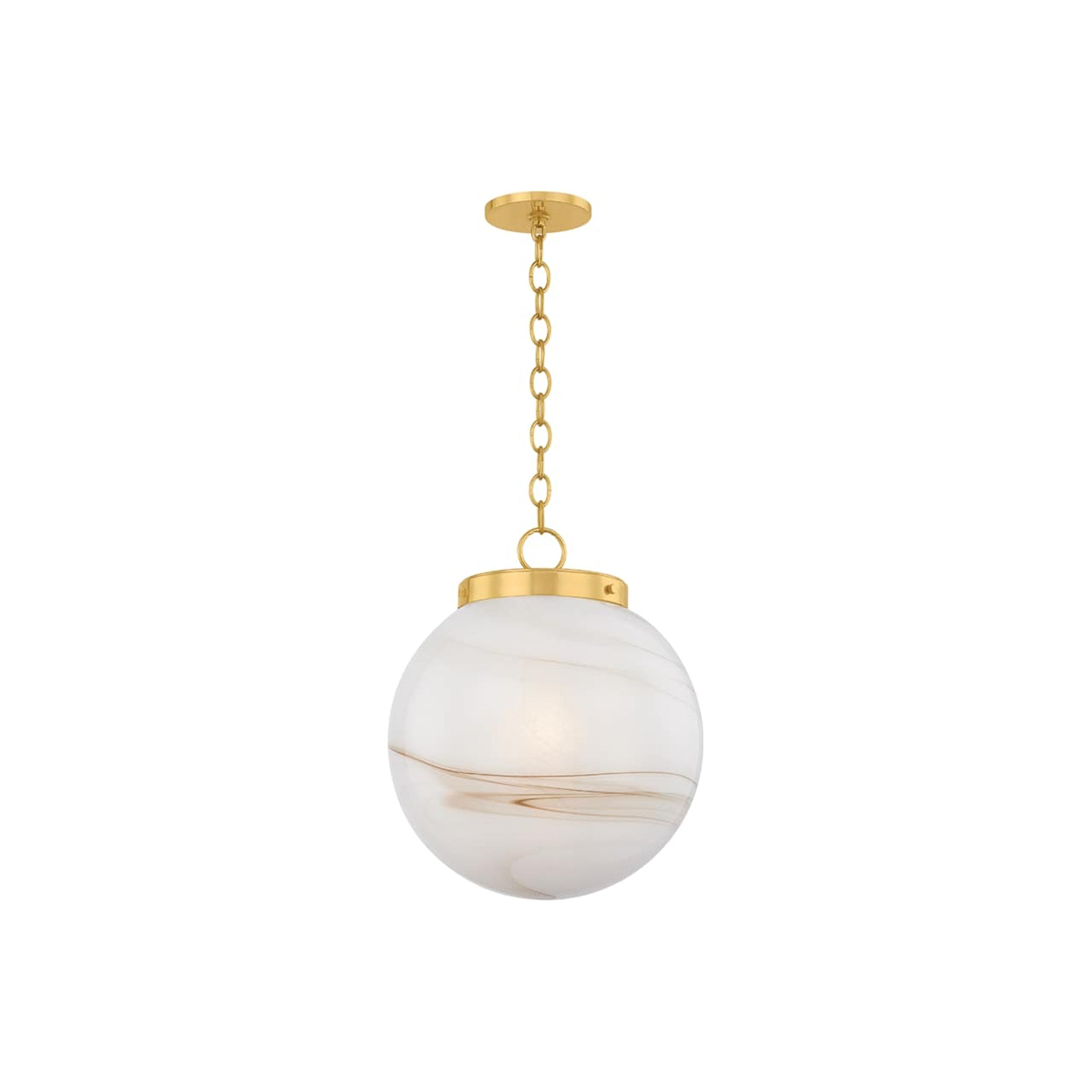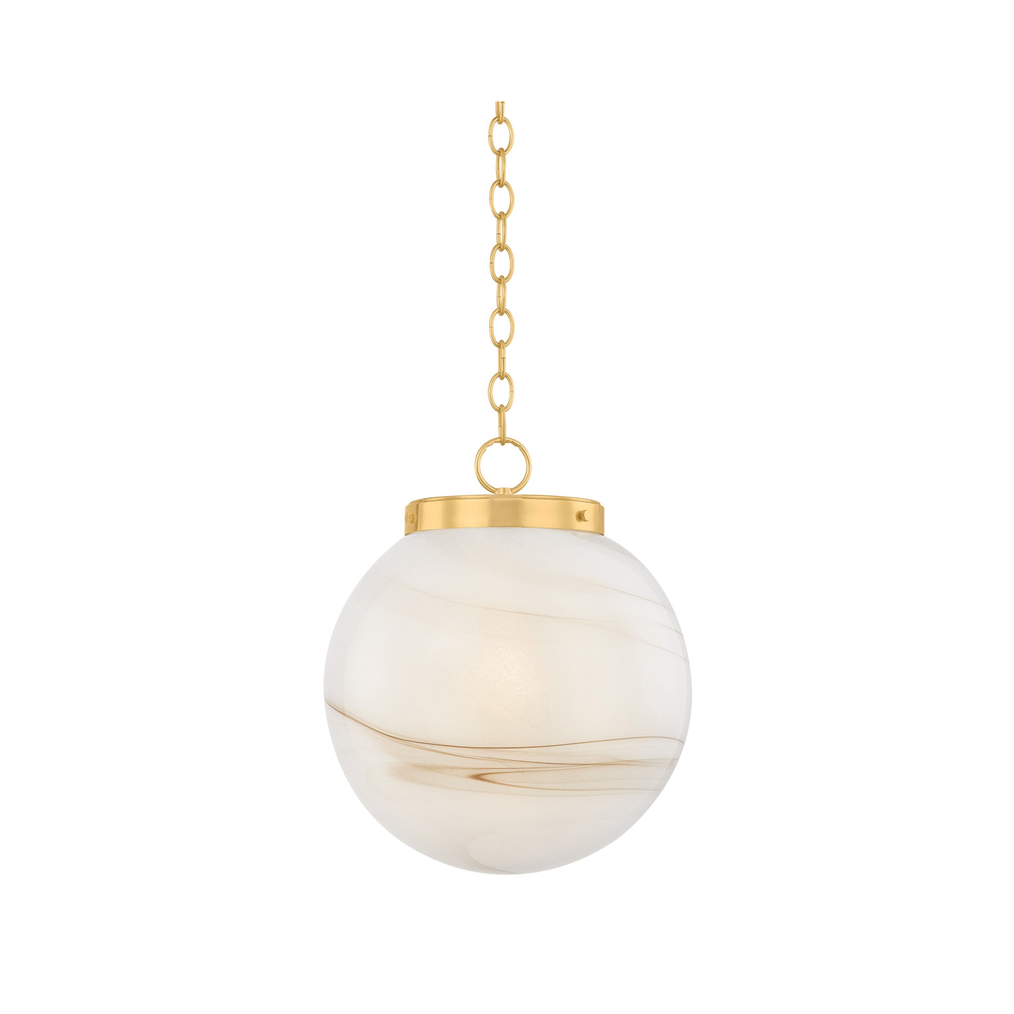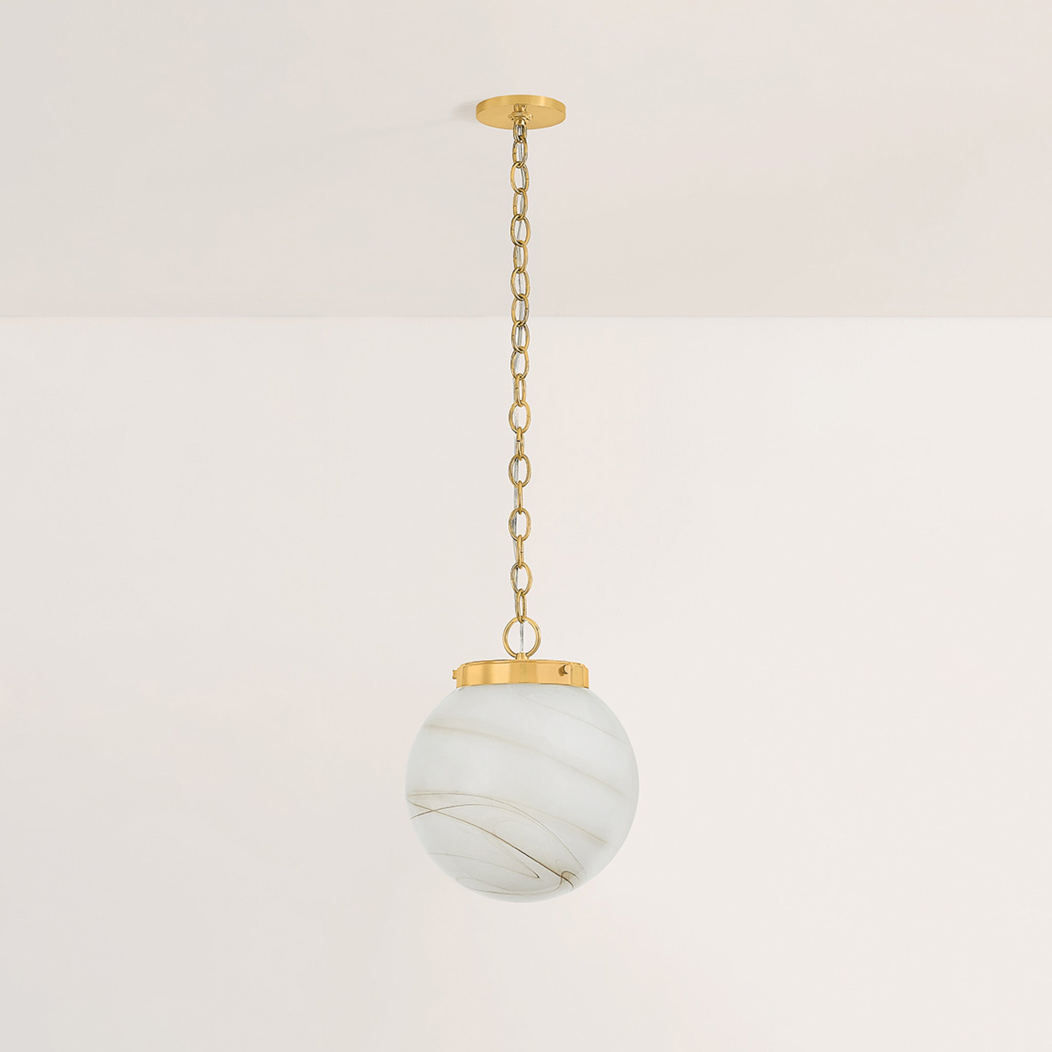 The Ambra pendant's simplistic silhouette allows its distinctive glass technique to shine. Hand-blown in Mitzi's factory, the Cappuccino Swirl glass showcases a stunning, marbled appearance with espresso-hued striations. A classic Aged Brass fitter and chain balances the dynamic glass of this pendant. Ambra is available in two sizes.