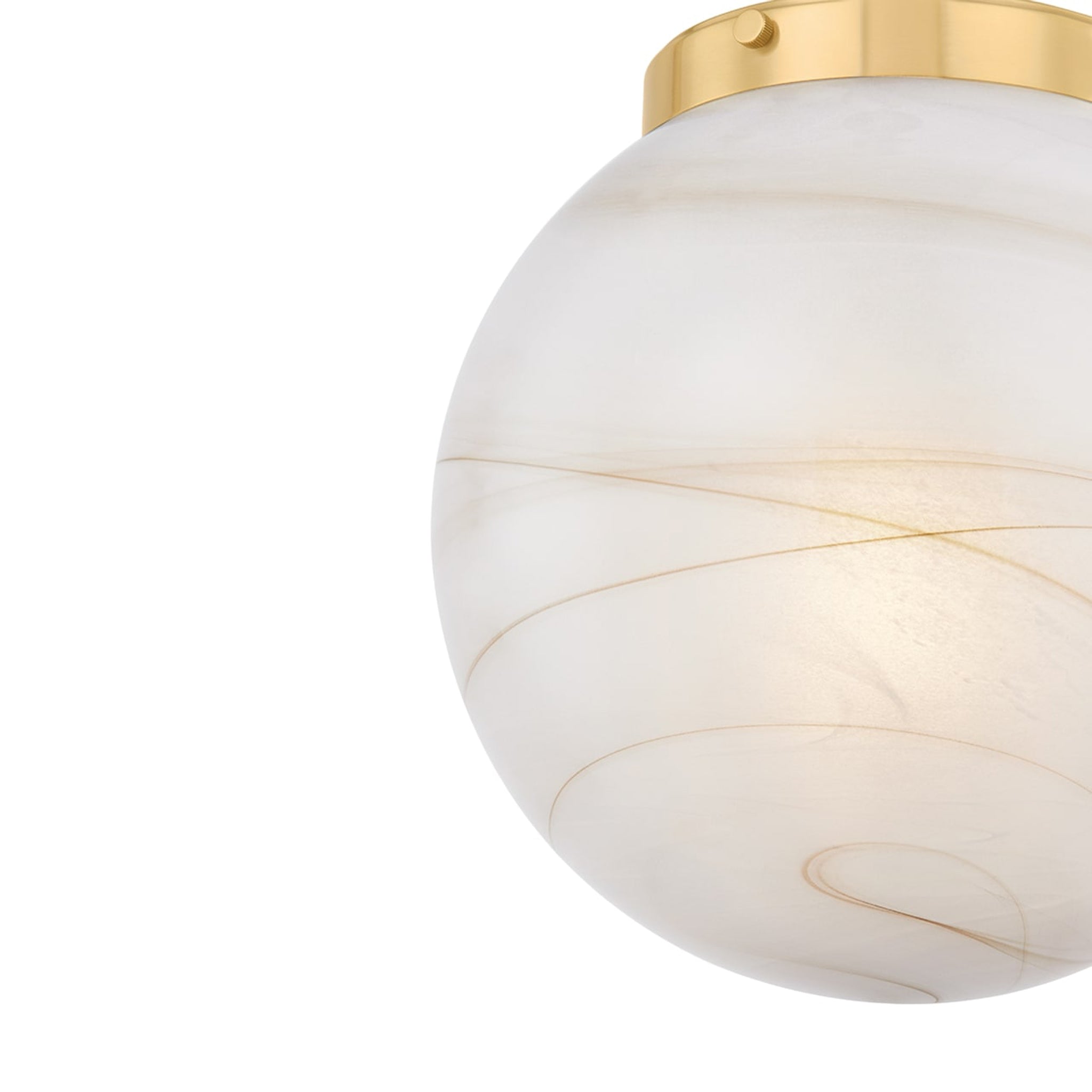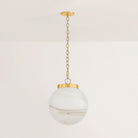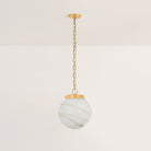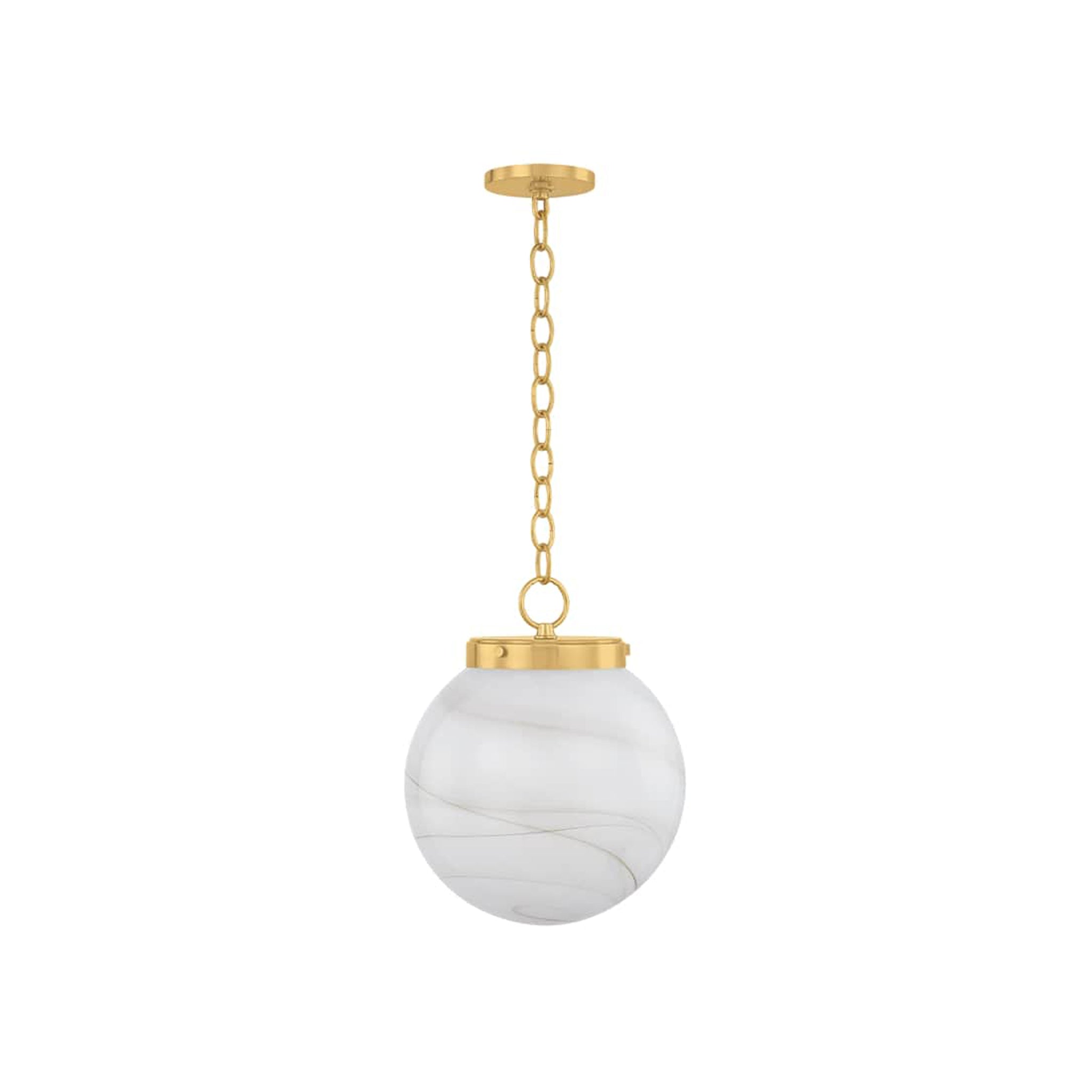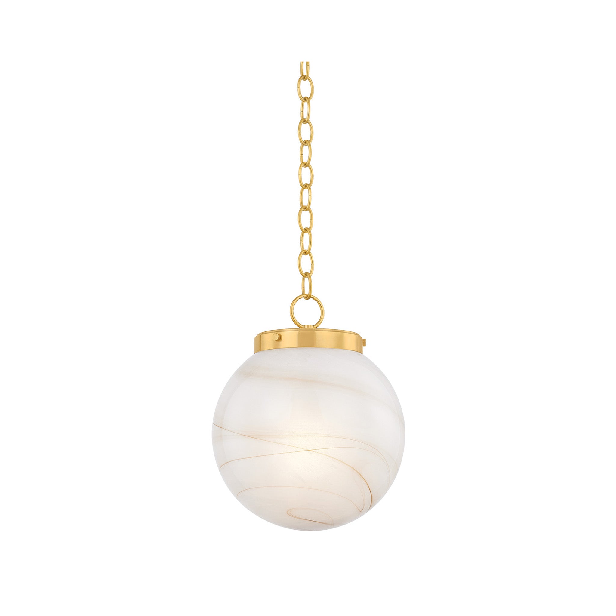 The Ambra pendant's simplistic silhouette allows its distinctive glass technique to shine. Hand-blown in Mitzi's factory, the Cappuccino Swirl glass showcases a stunning, marbled appearance with espresso-hued striations. A classic Aged Brass fitter and chain balances the dynamic glass of this pendant. Ambra is available in two sizes.