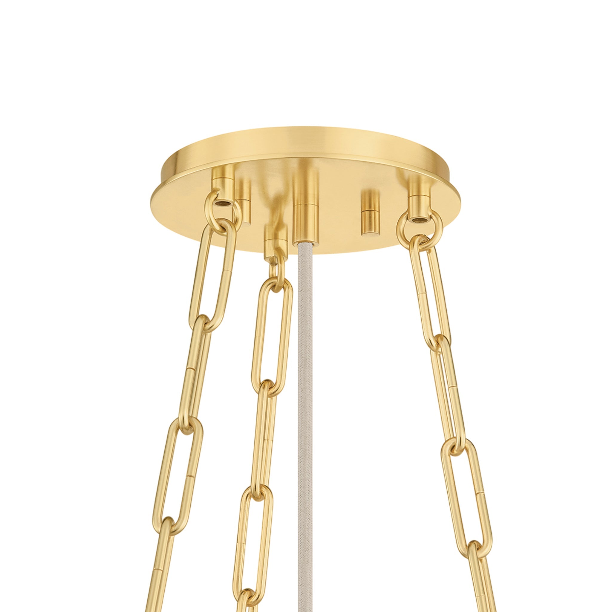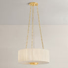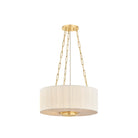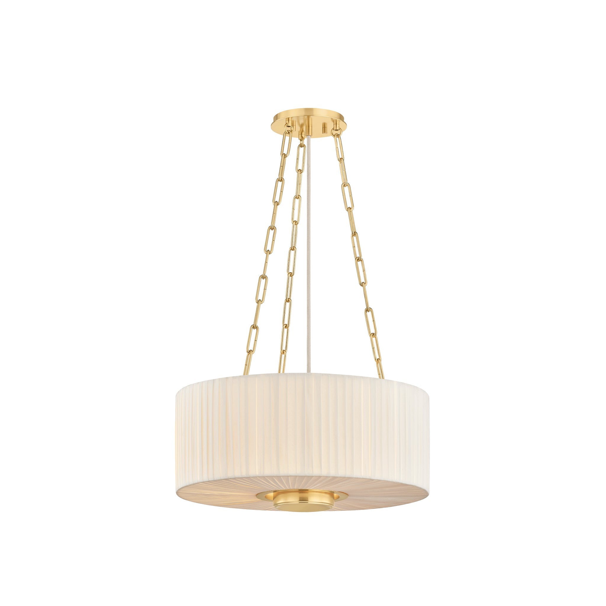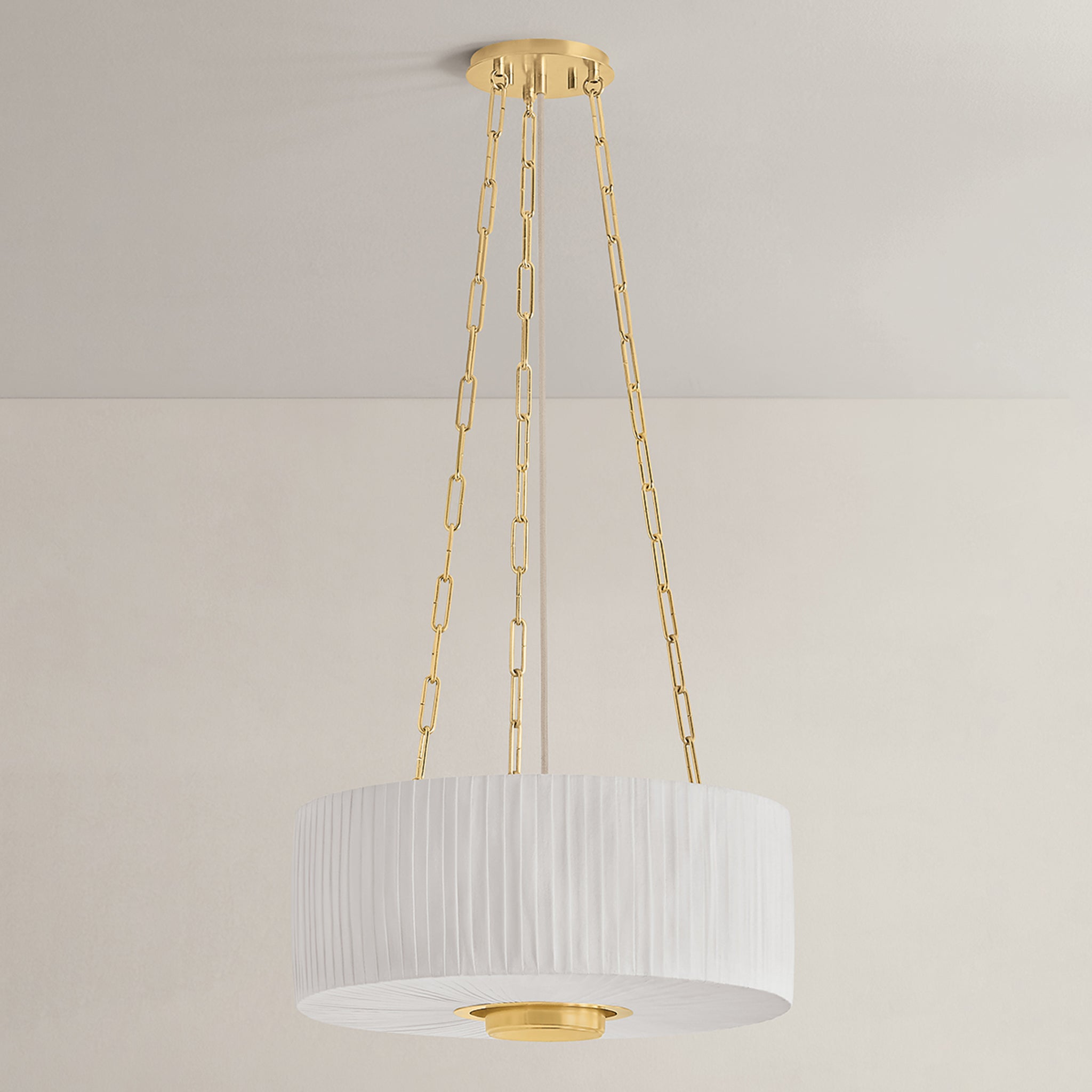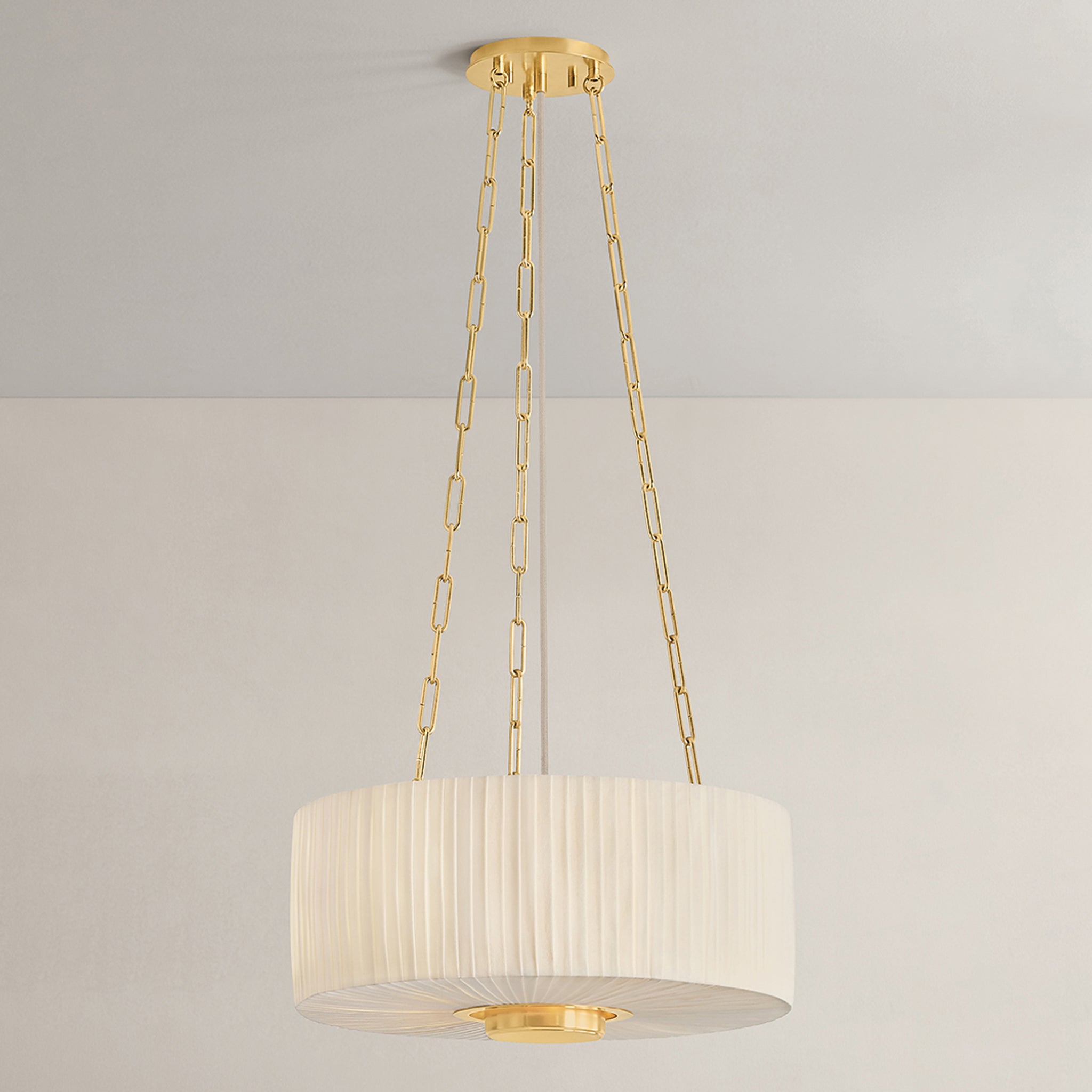 Camby balances oversized proportions with tailored details to create a sophisticated statement pendant. Supported by a triple-chain system, the pleated ivory linen shade channels a classic sense of style. An Aged Brass oculus anchors the piece, adding a focal point from below. Available in 3 and 4-light options, Camby pairs beautifully with many design schemes.