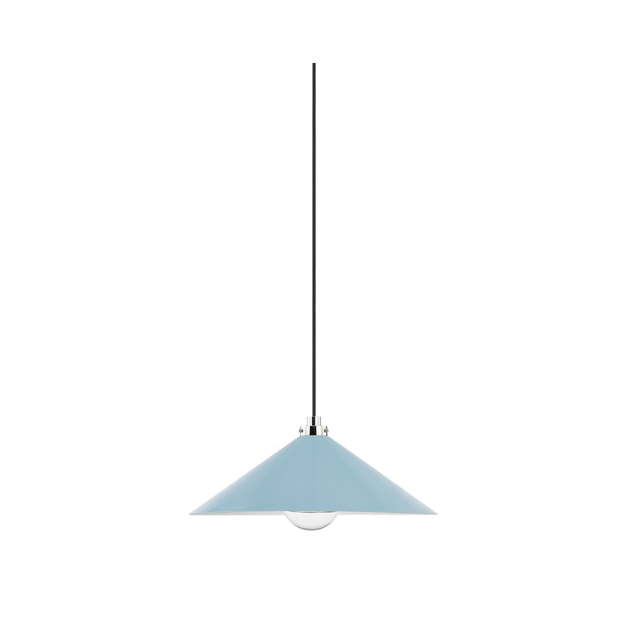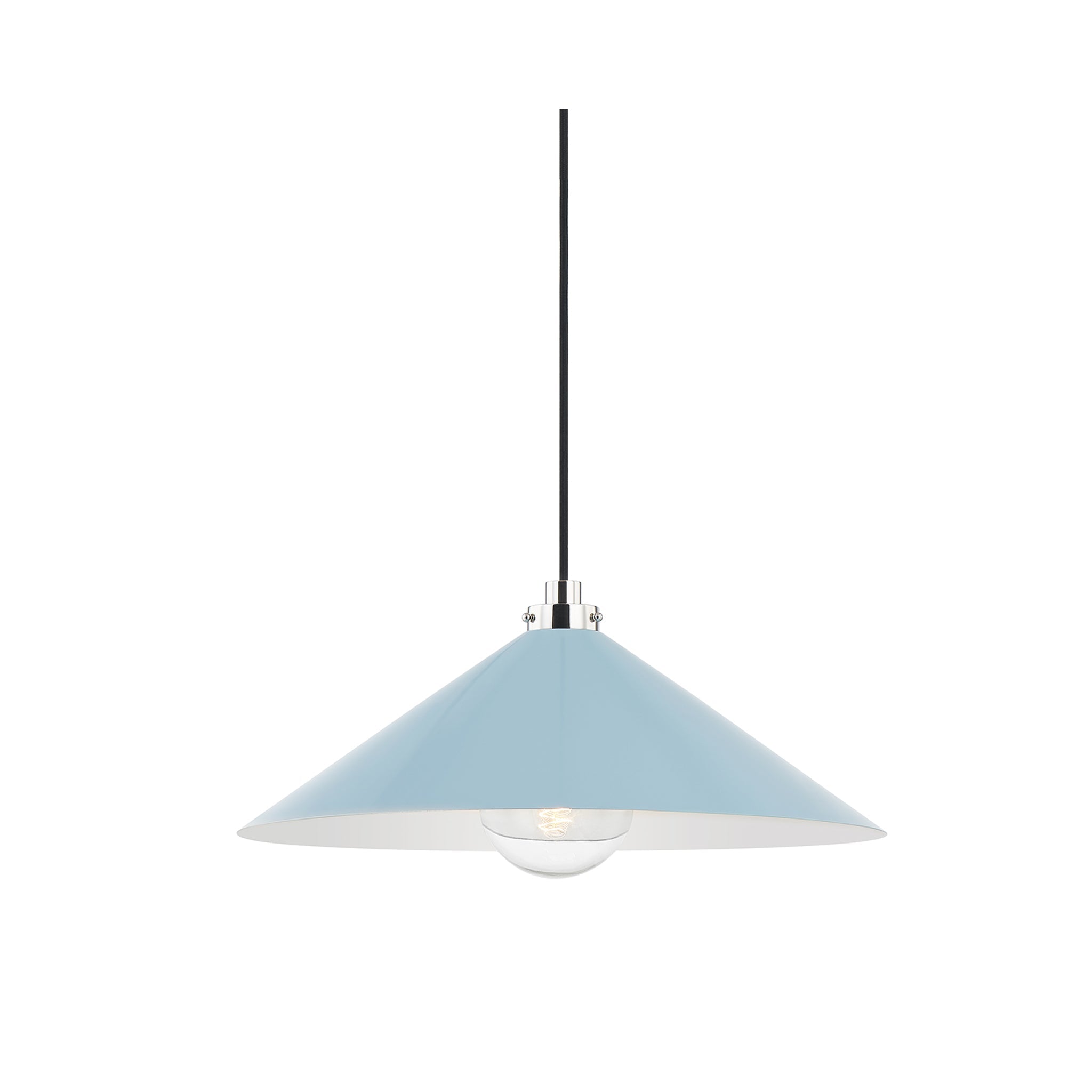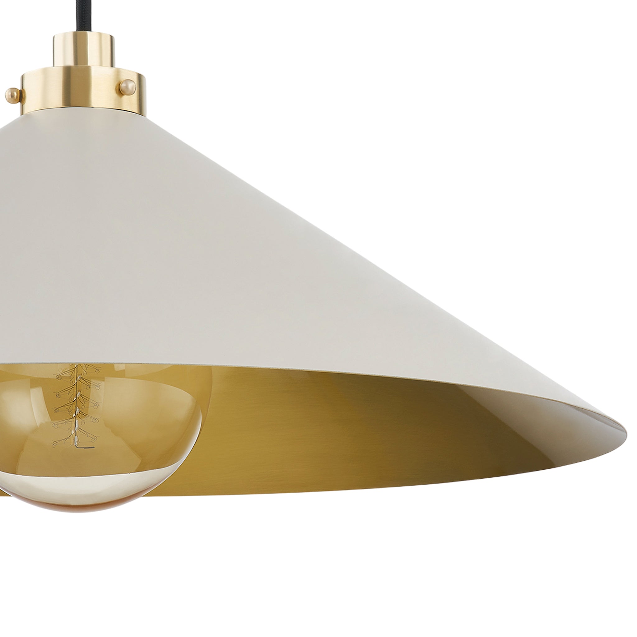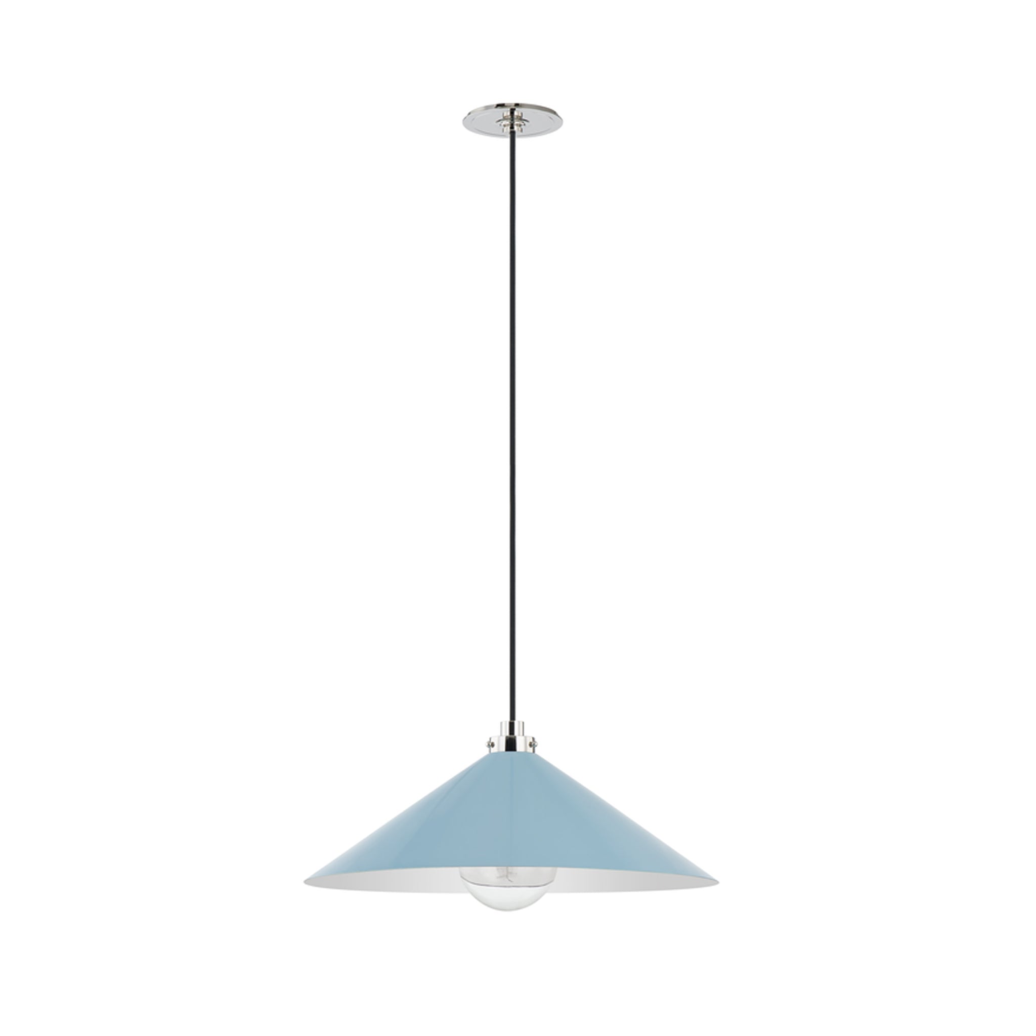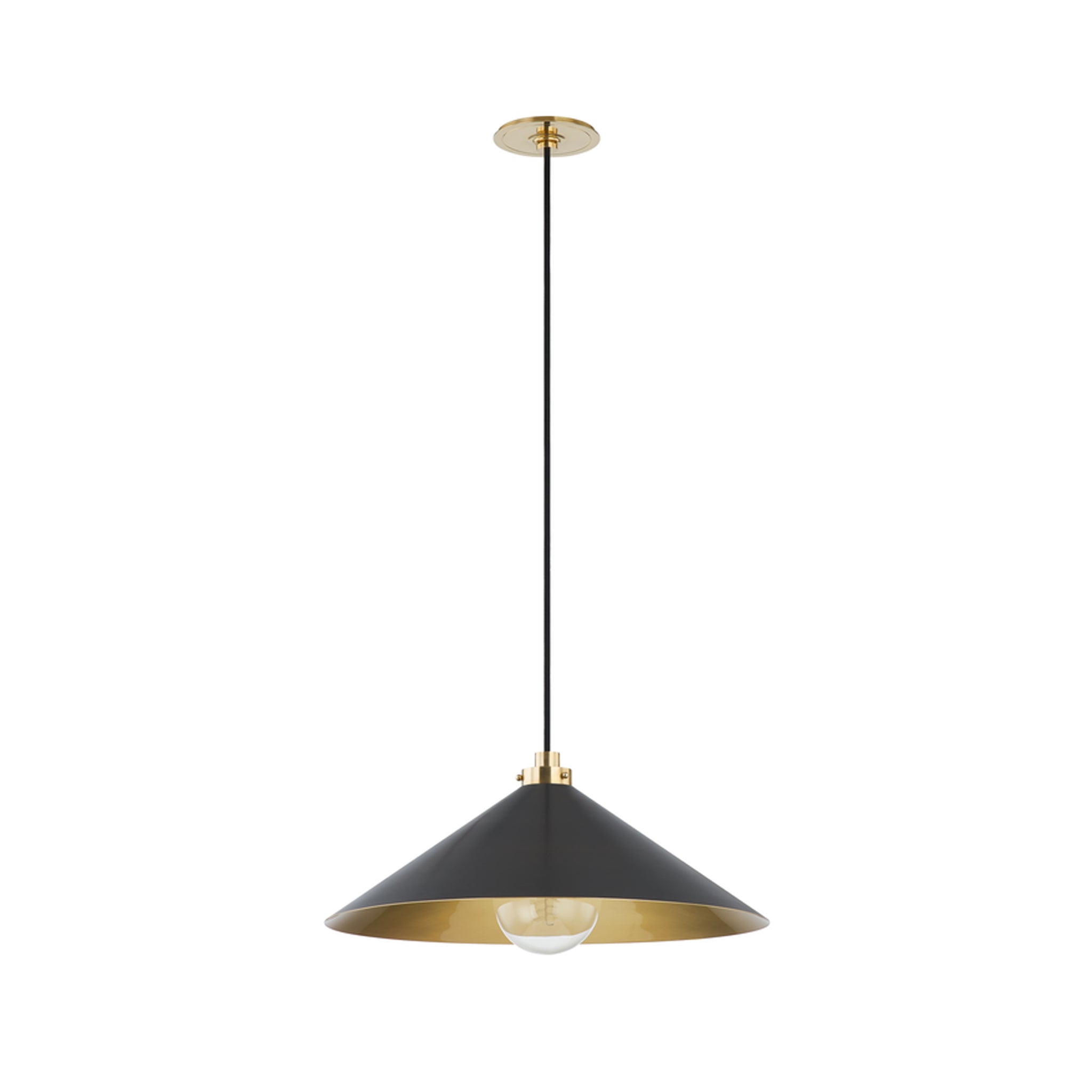 This classic metal shade design feels special with fresh finish combinations and sleek, heritage-inspired details. The contrastiing Aged Brass accents and modern gooseneck arm allow the pendants and sconce an updated, yet classic feel. The tapered shade over a five-light candelabra give the chandelier new traditional appeal. Each fixture features an Aged Brass or Polished Nickel shade that is metal on the inside and painted Off-Clivedon Large Pendant, Distressed Bronze or Bird Blue on the outside. Mark D. Sikes for Hudson Valley Lighting.