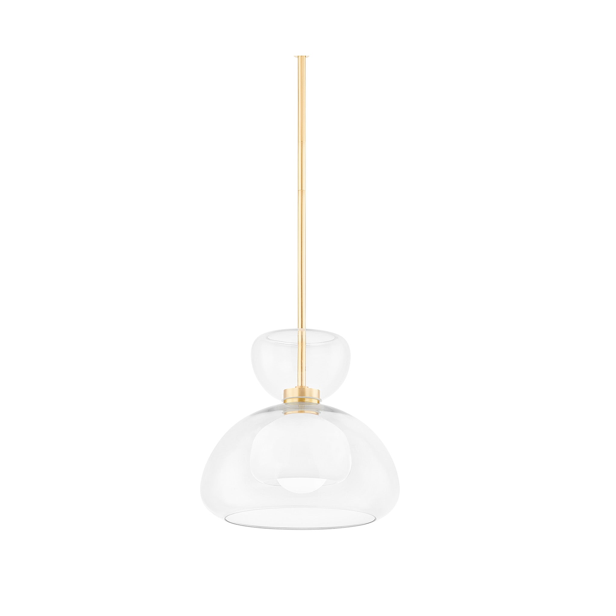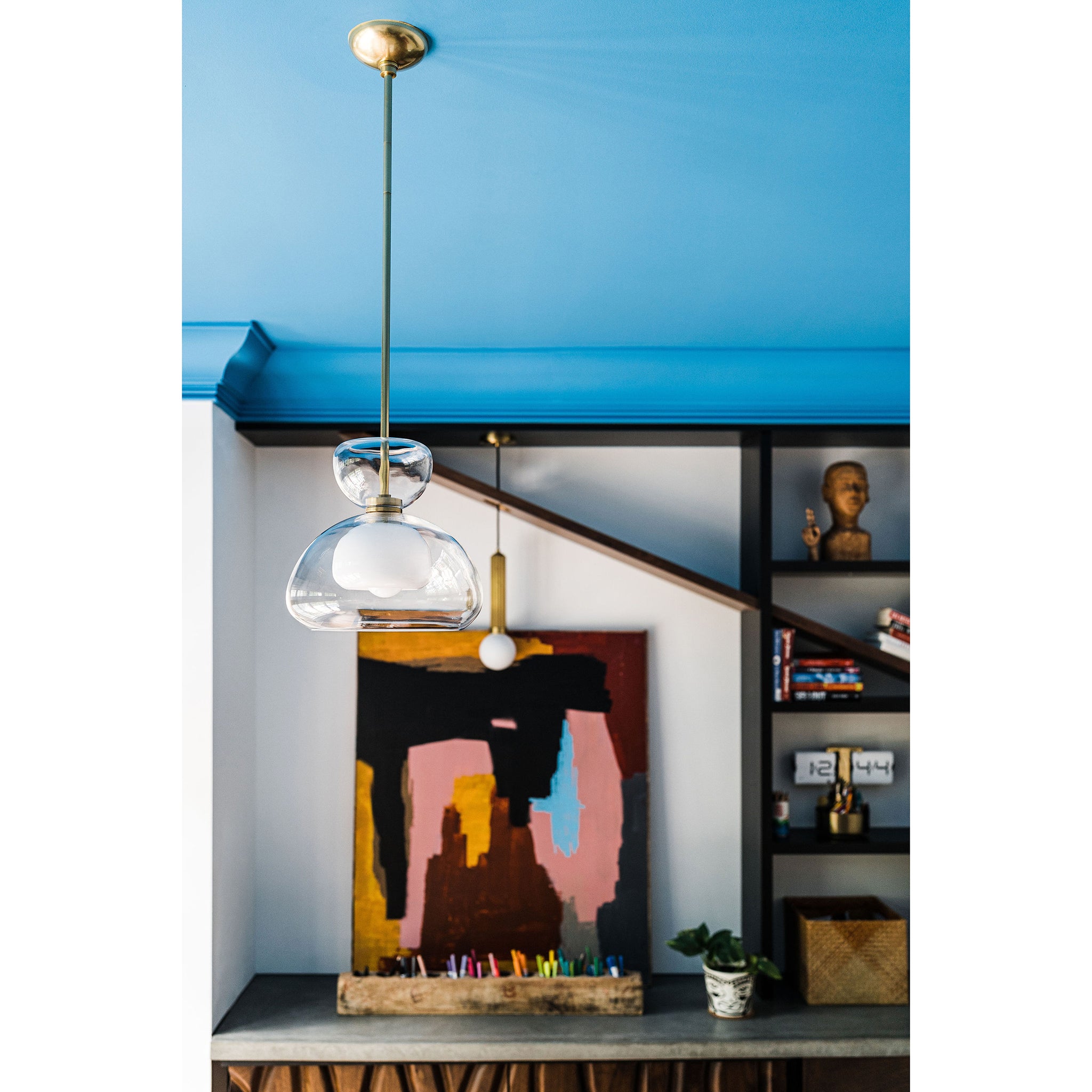 Cortney is a gorgeous combination of mixed glass with Aged Brass. An opal glossy glass shade is captured within a clear glass shade for a look that is both trendy and useable. Light flows through the open shades and reflects inside them. The opal glass table lamp, with its visible Aged Brass pull chain, adds a stylish pop and polish to any space. Also available as a wall sconce, semi-flush, and pendant. Part of our Home Ec. x Mitzi Tastemakers collection.