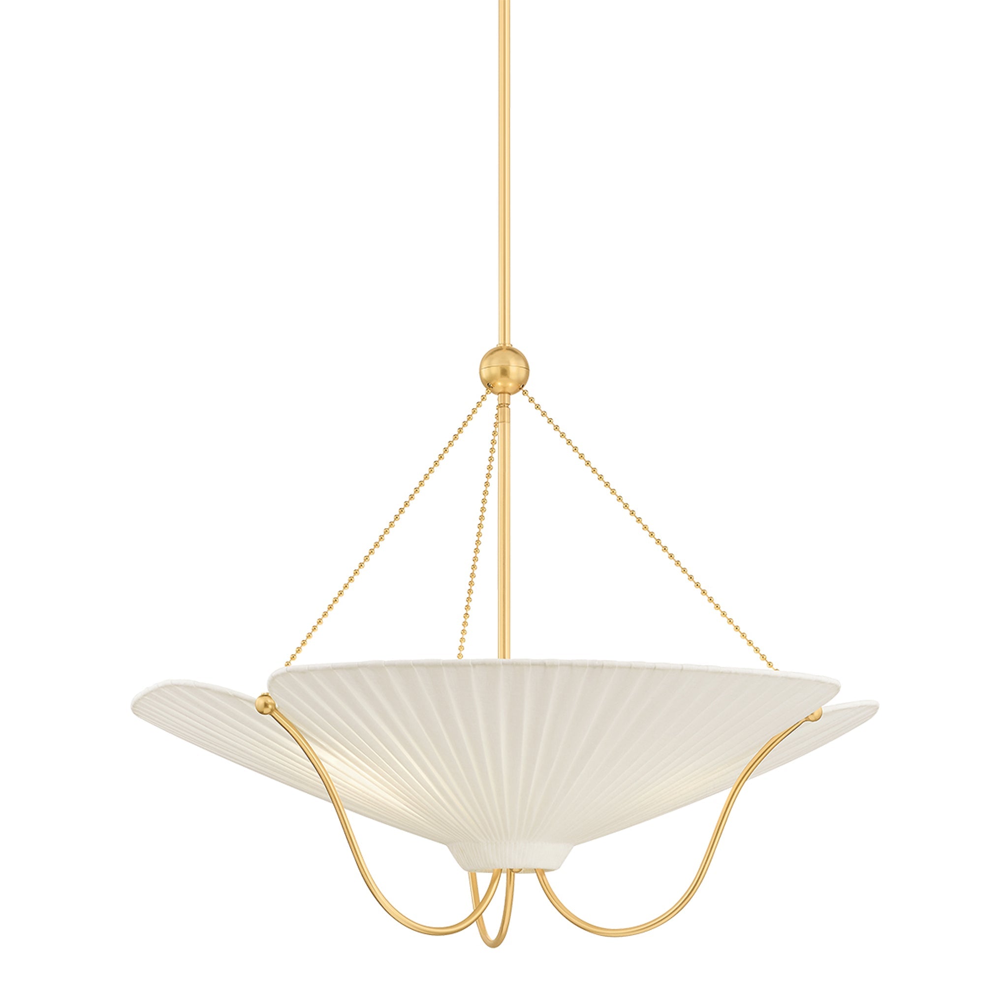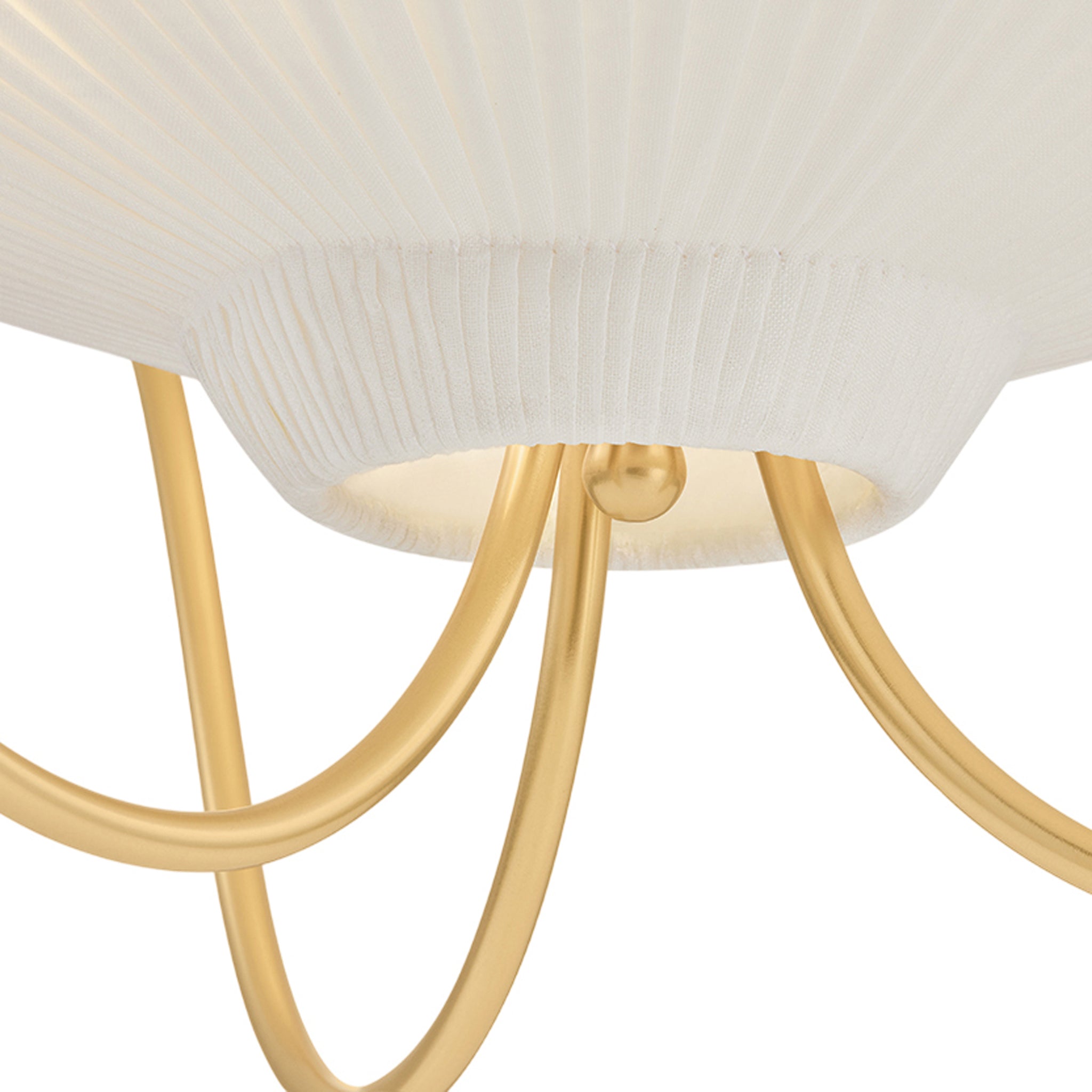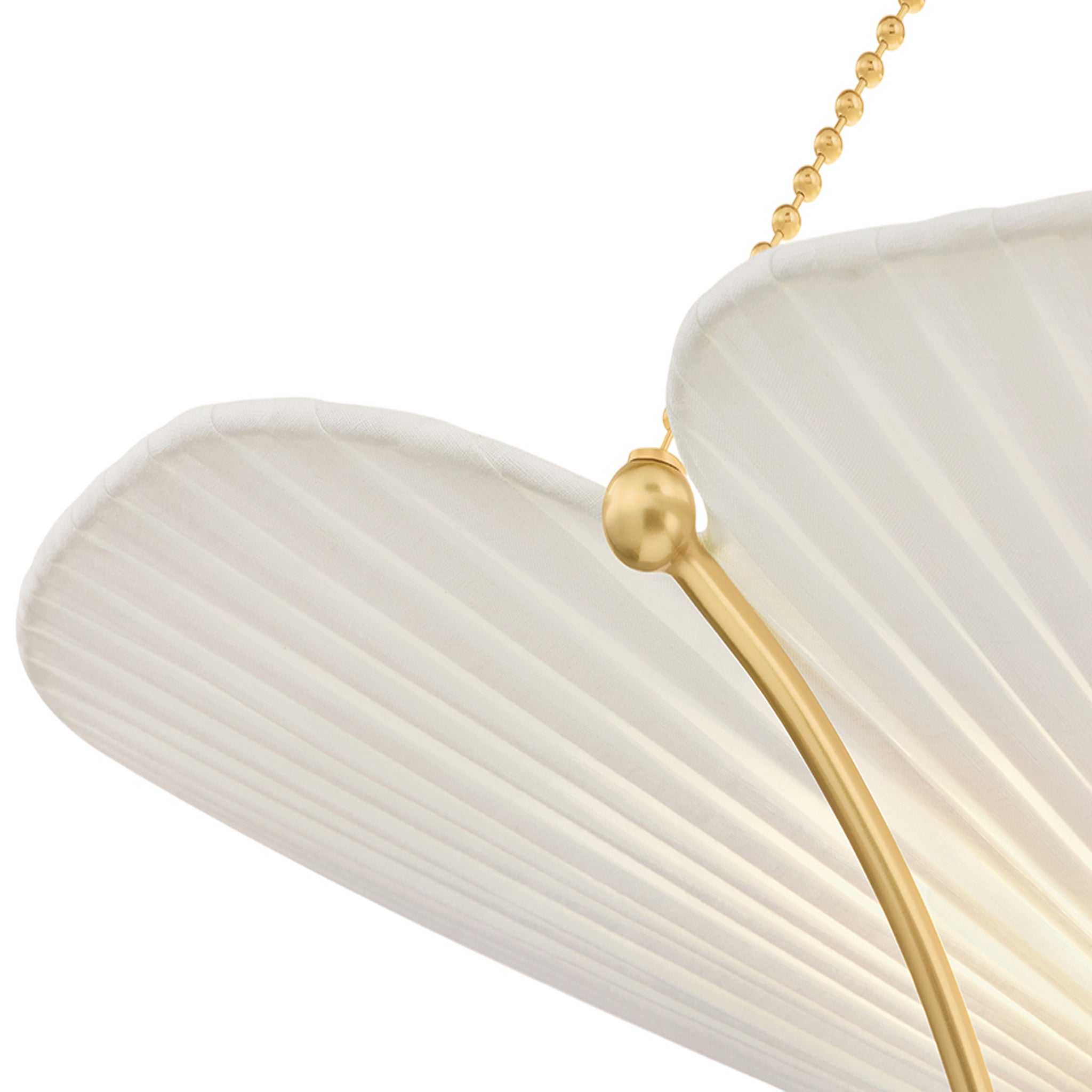 Drawing inspiration from the organic elegance of the Art Nouveau period, Gerhard reinterprets floral motifs with architectural clarity. Gracefully arched metalwork in a warm Aged Brass finish supports sheer ivory linen shades, crafted with a unique pleating technique that adds volume and dimension. Together, these elements form abstracted botanical shapes that feel both refined and expressive. Available as a semi flush mount and a 3 or 9-light pendant, this decorative up light serves as a captivating, sculptural focal point. Augusta Hoffman for Hudson Valley Lighting.