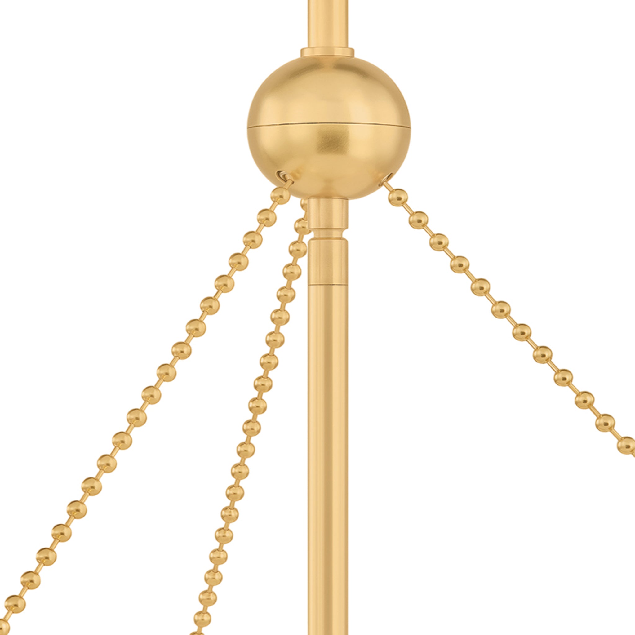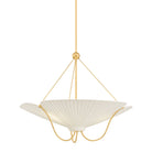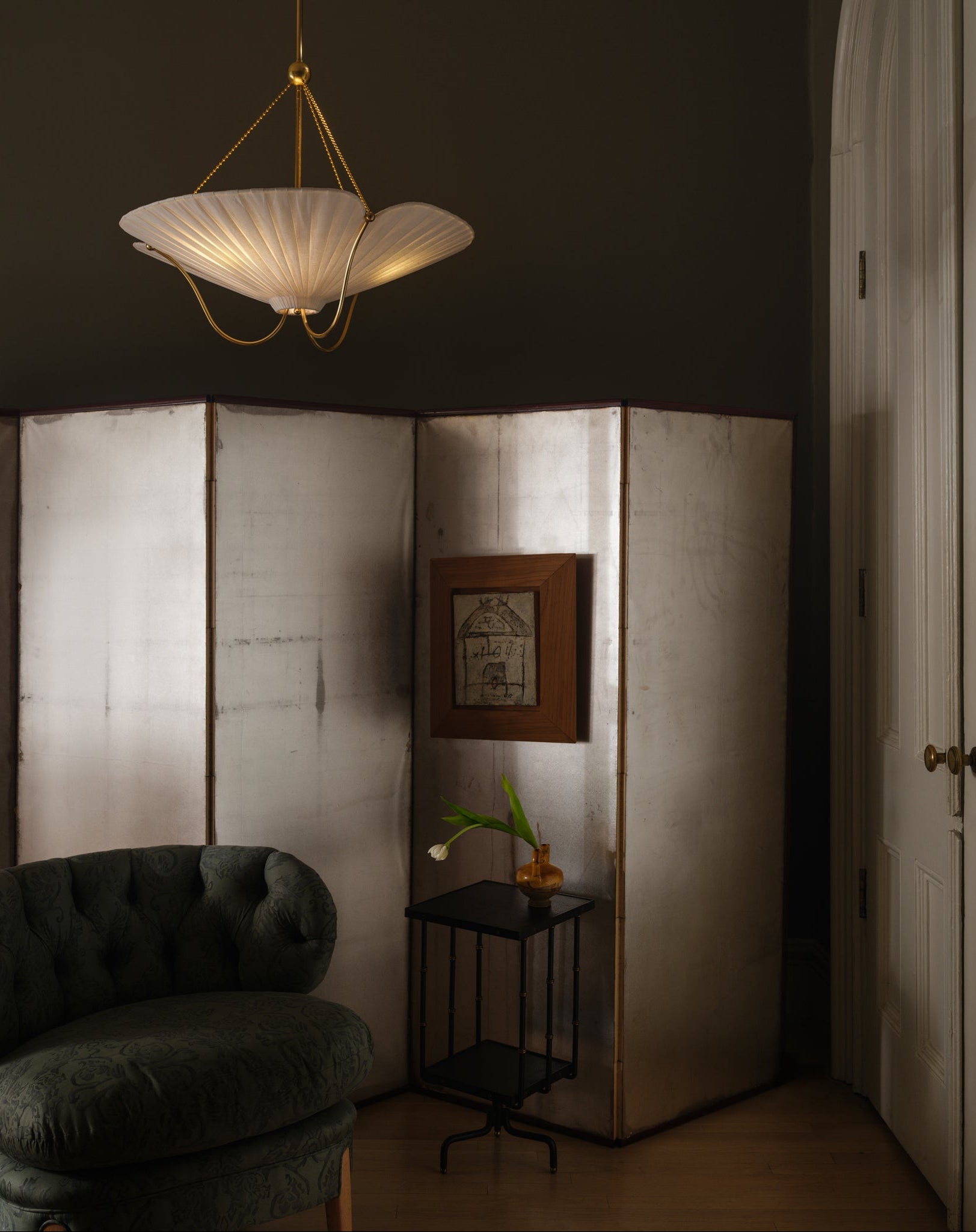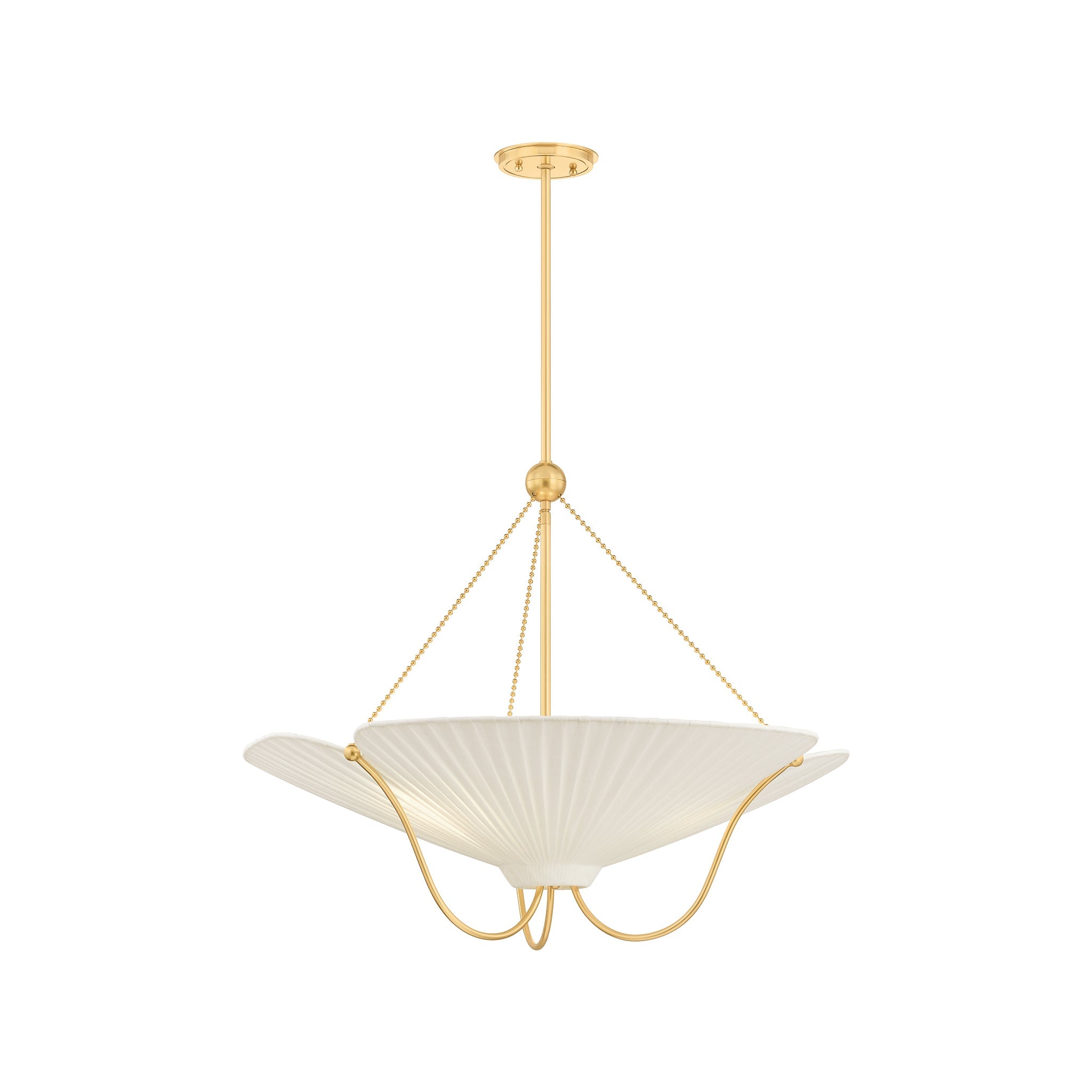 Drawing inspiration from the organic elegance of the Art Nouveau period, Gerhard reinterprets floral motifs with architectural clarity. Gracefully arched metalwork in a warm Aged Brass finish supports sheer ivory linen shades, crafted with a unique pleating technique that adds volume and dimension. Together, these elements form abstracted botanical shapes that feel both refined and expressive. Available as a semi flush mount and a 3 or 9-light pendant, this decorative up light serves as a captivating, sculptural focal point. Augusta Hoffman for Hudson Valley Lighting.