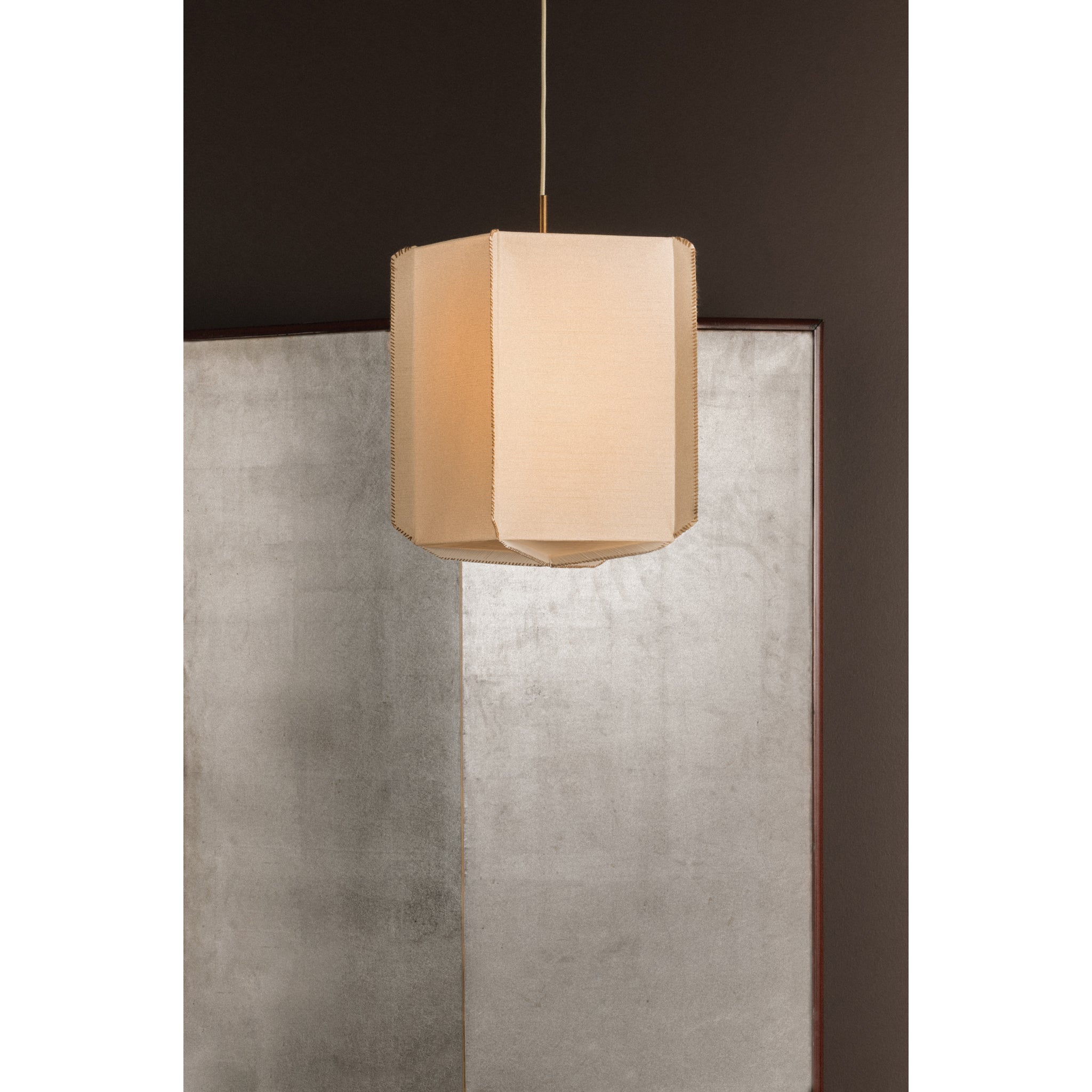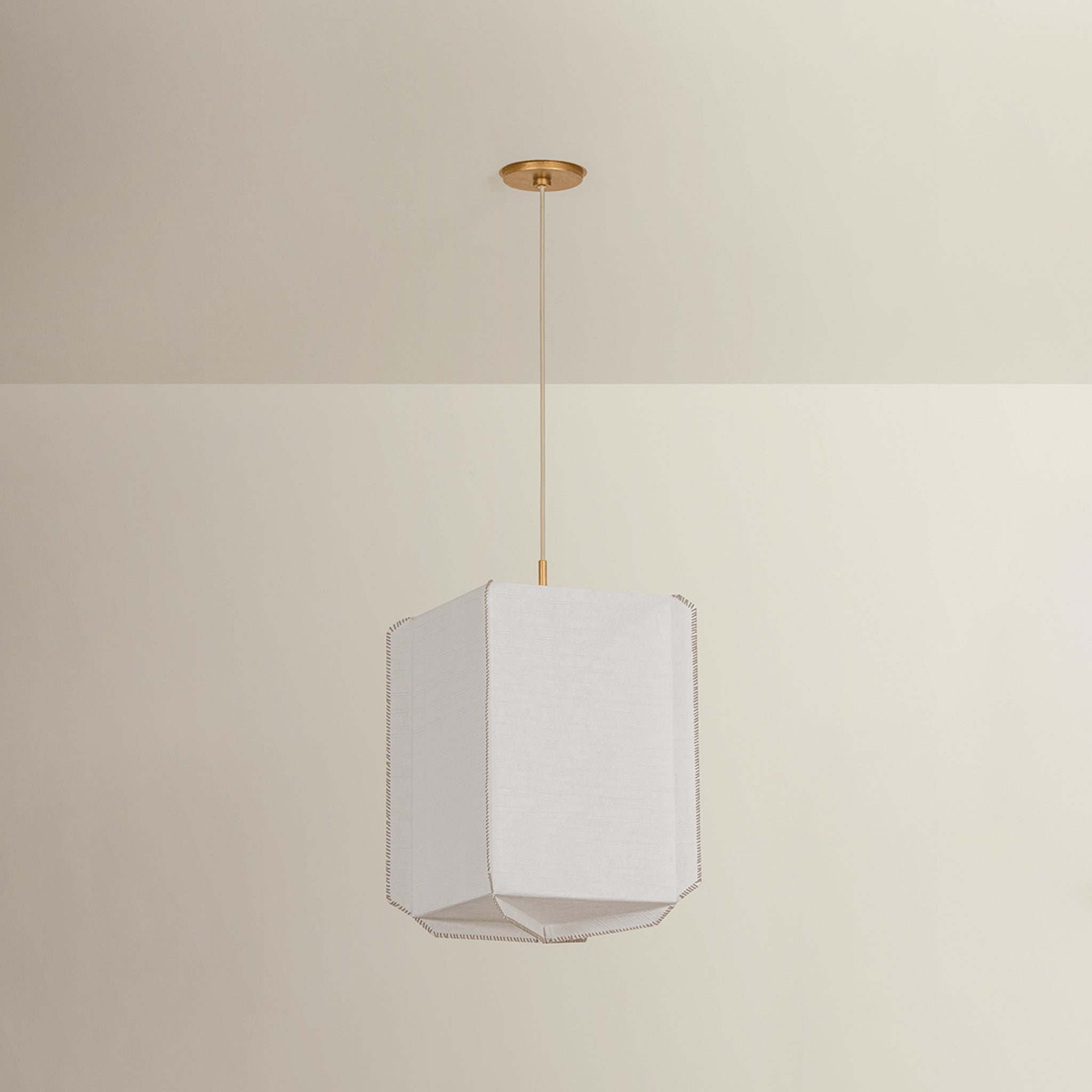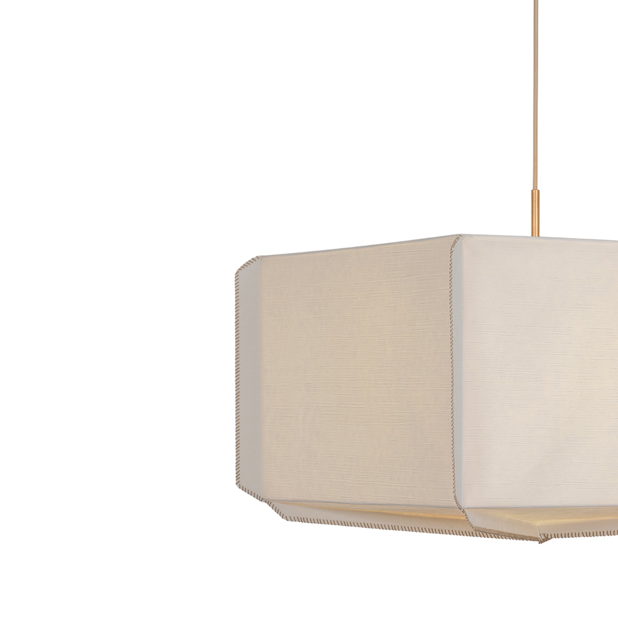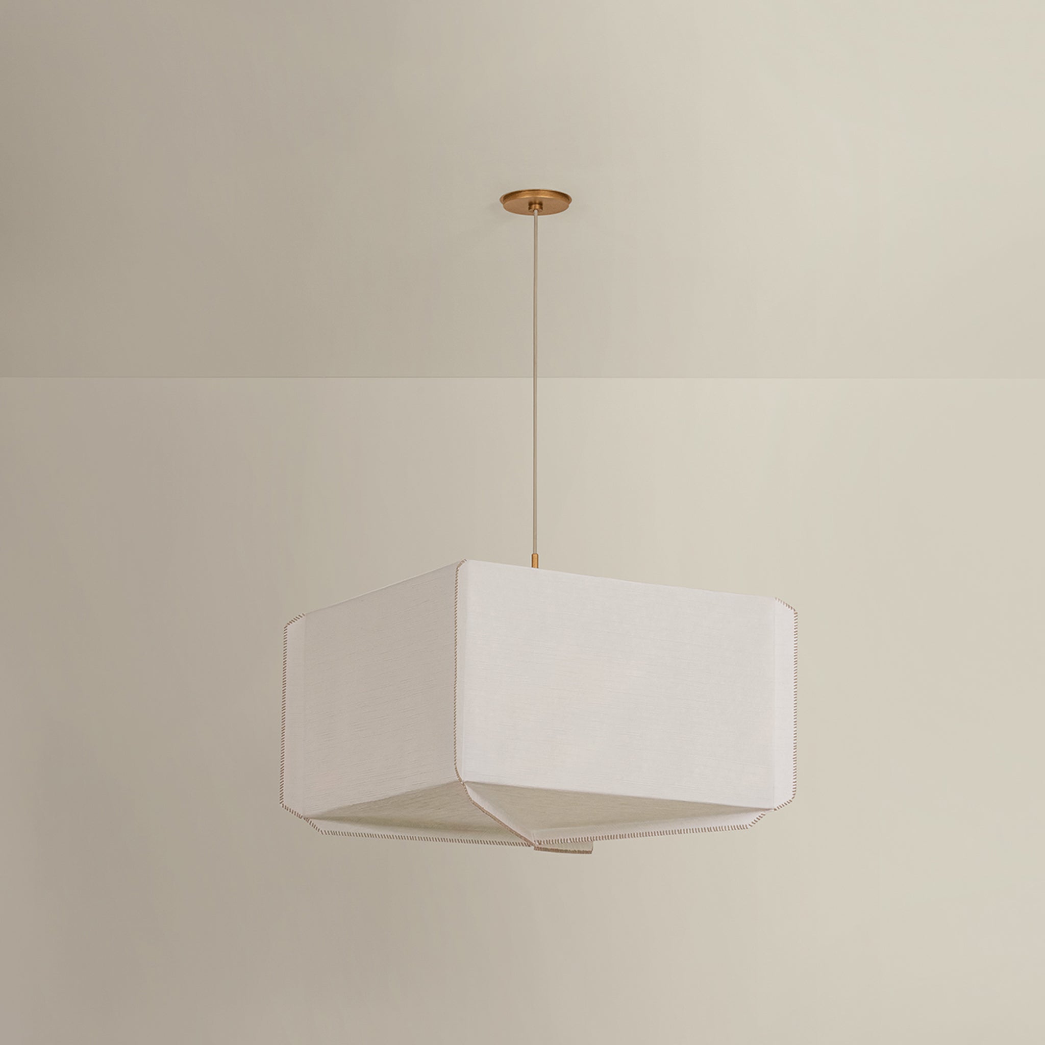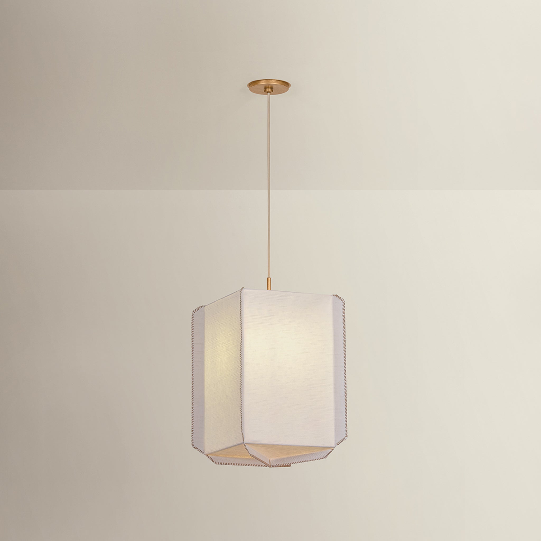 Louise celebrates the beauty of handcrafted materials through a soft yet structured silhouette. Made from delicate Japanese rice paper, the shade features mushroom-colored whipstitching along its edges-a quiet detail that highlights the care behind its construction. Gentle folds create subtle texture and geometric interest, giving the piece a warm, sculptural presence. Finished with Patina Gold Leaf hardware, Louise is available as a 1-light pendant with a slim profile and a wide, 3-light lantern-style pendant. Augusta Hoffman for Hudson Valley Lighting.