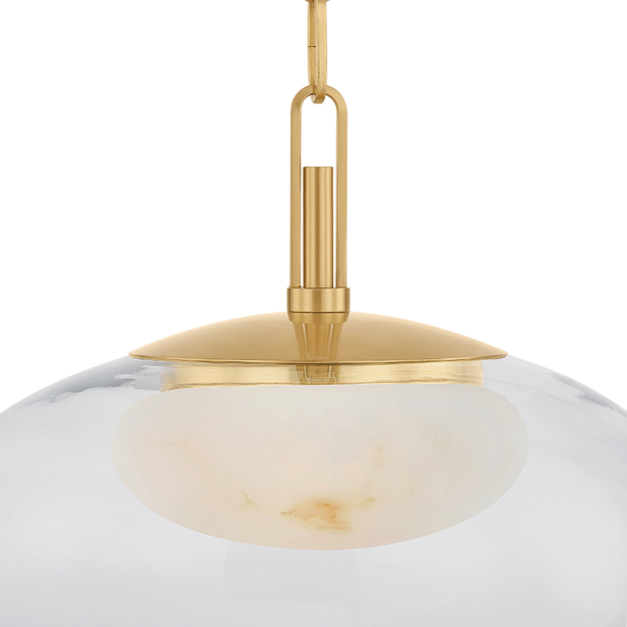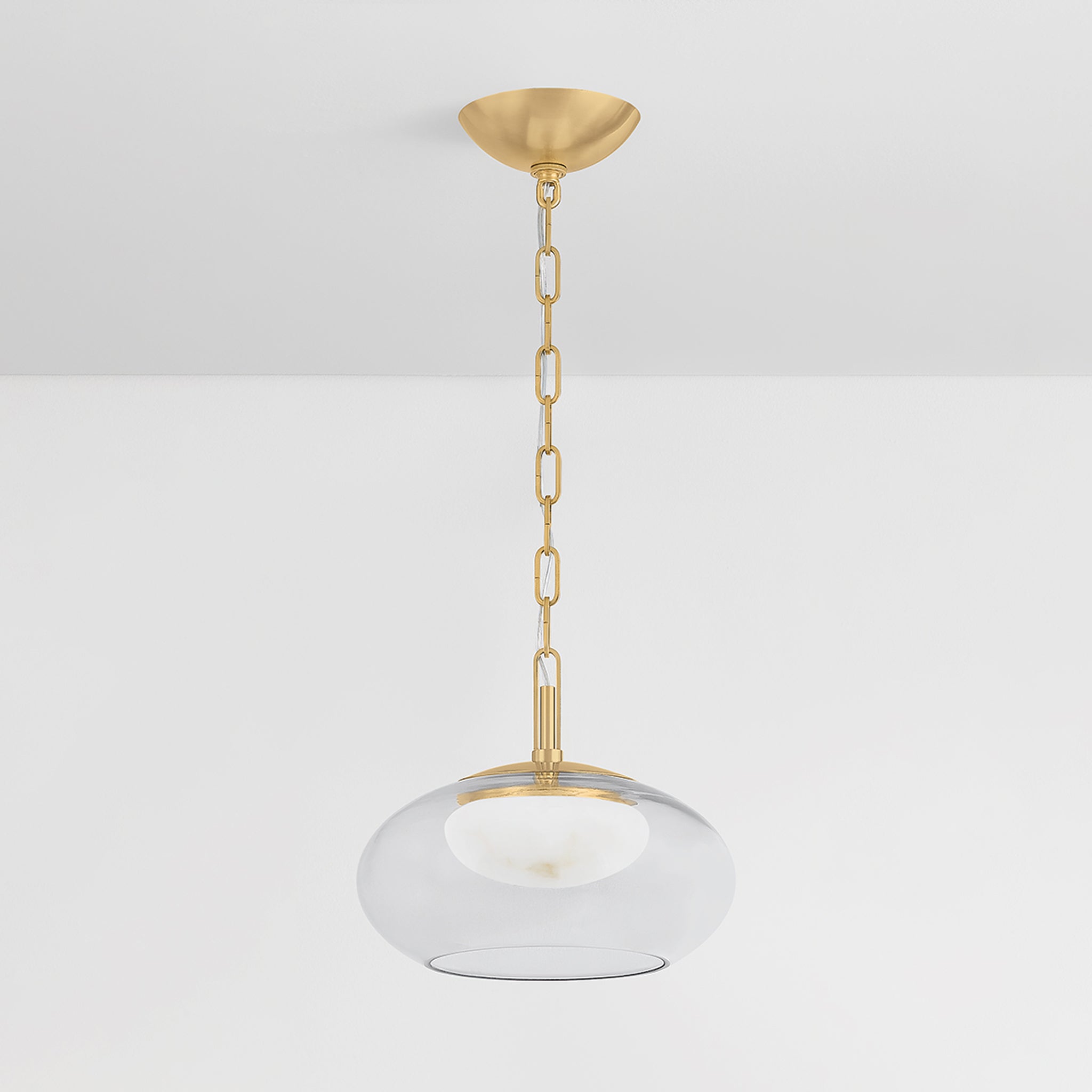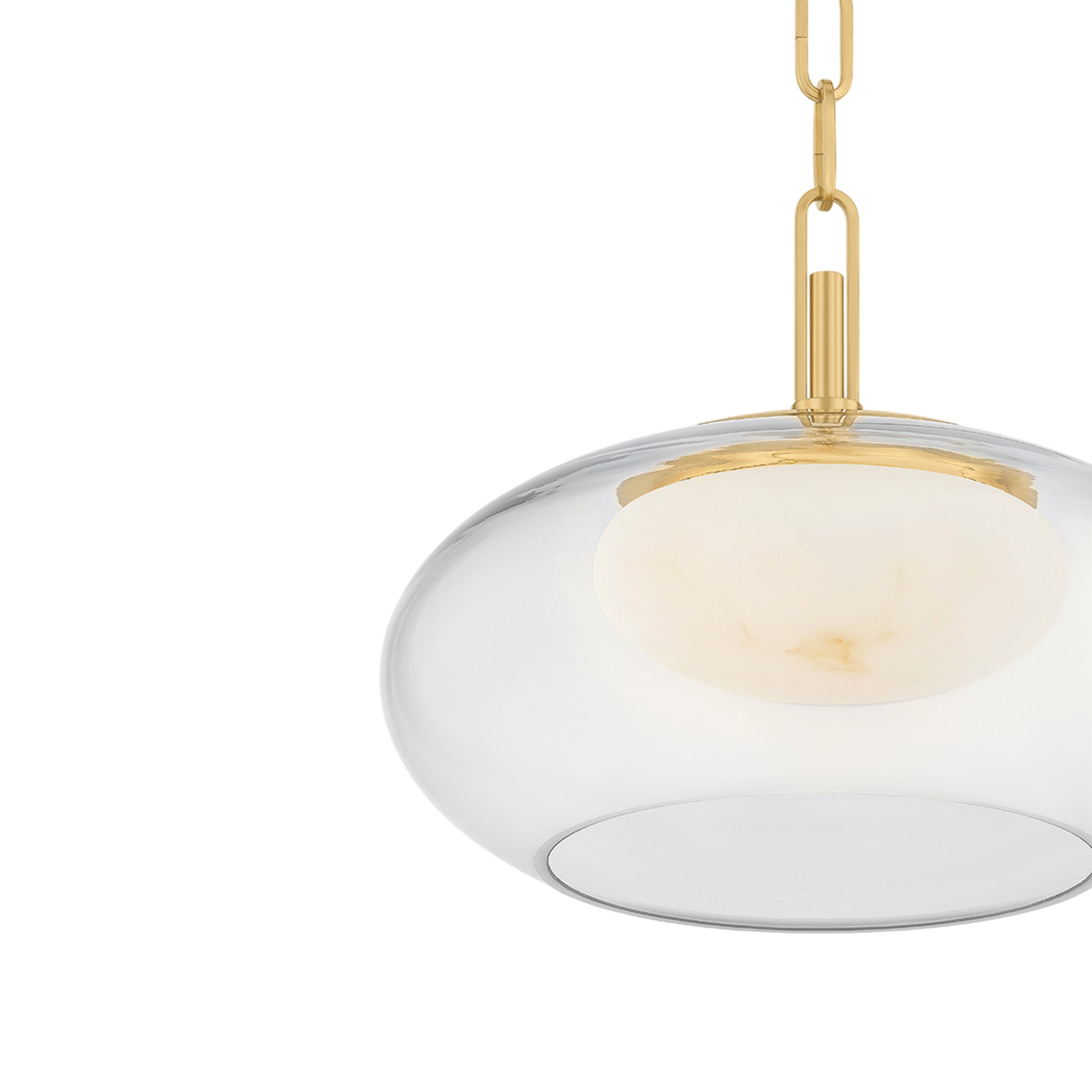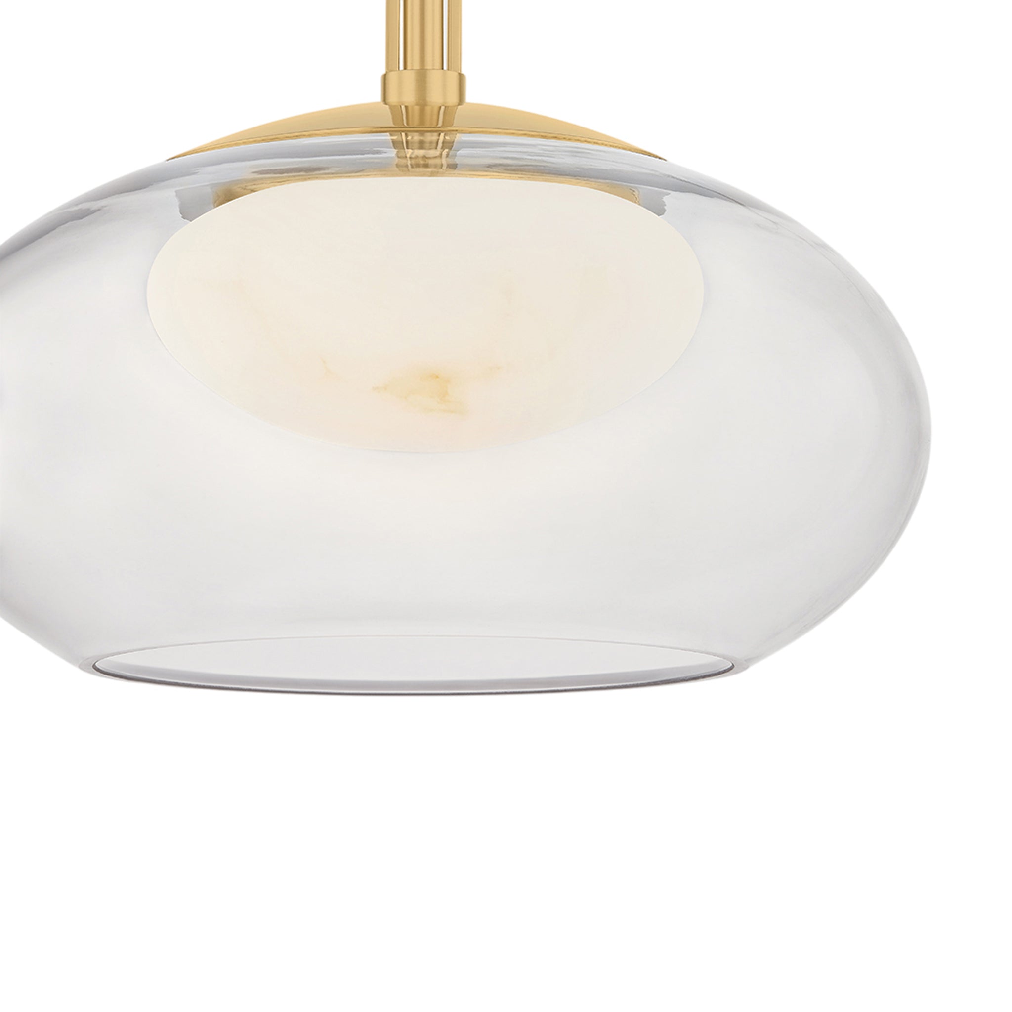 Moore stuns in its simplicity. Available in two sizes, this nested flush mount design features an outer clear glass shade that reveals alabaster within. The double layer gives the fixture an elevated, graceful presence that creates a warm diffusion of light. Finished in Aged Brass, the metalwork of Moore adds a timeless, luxurious note that complements any design style.