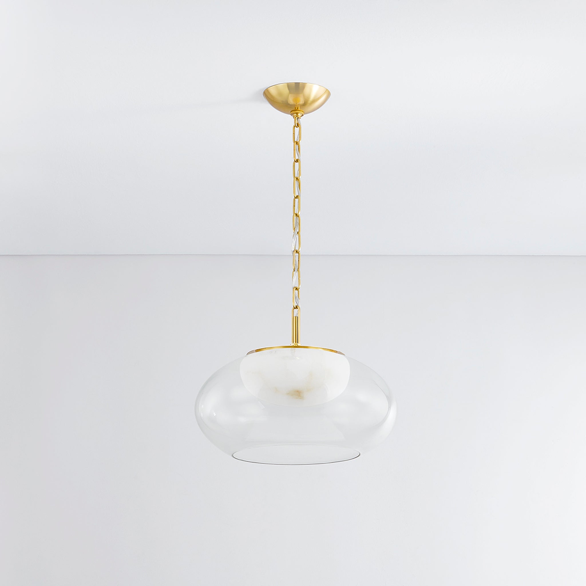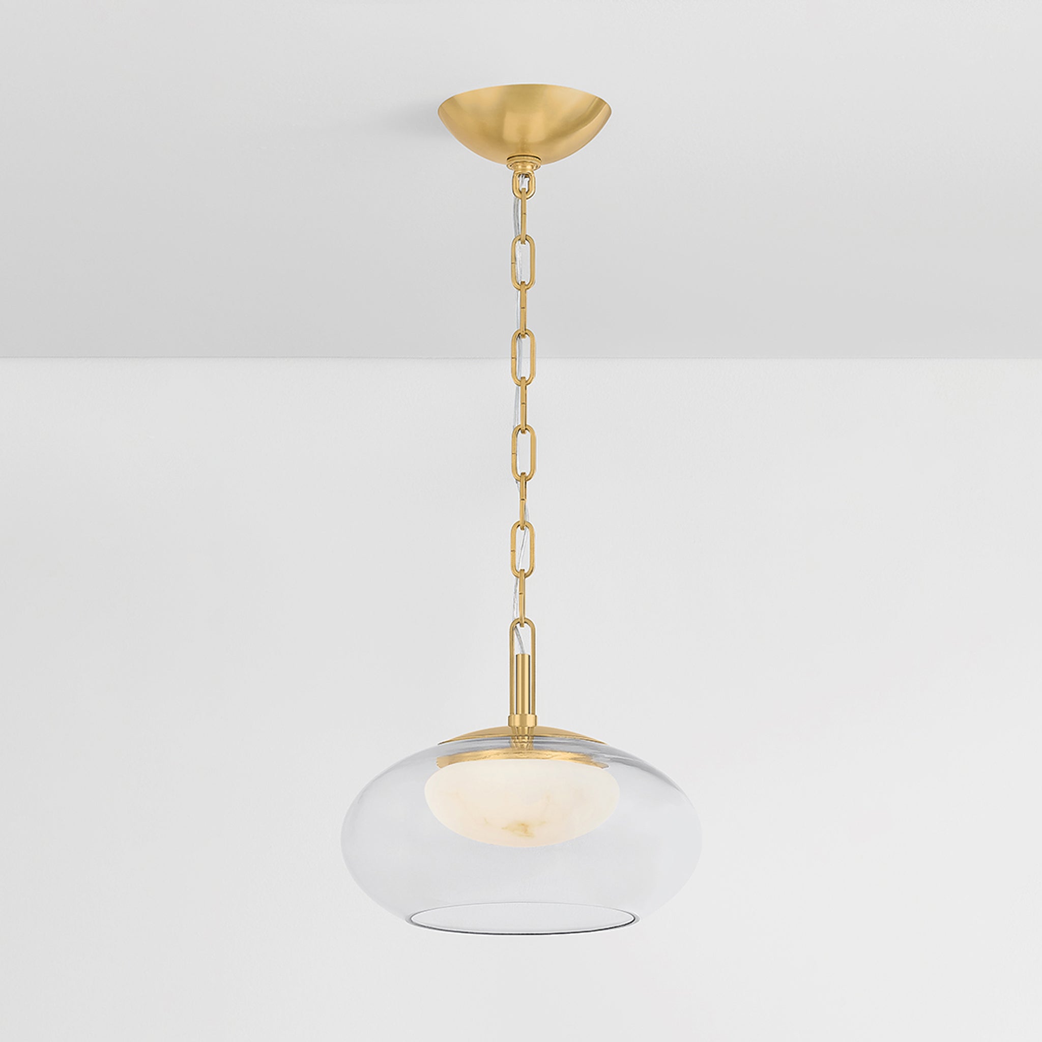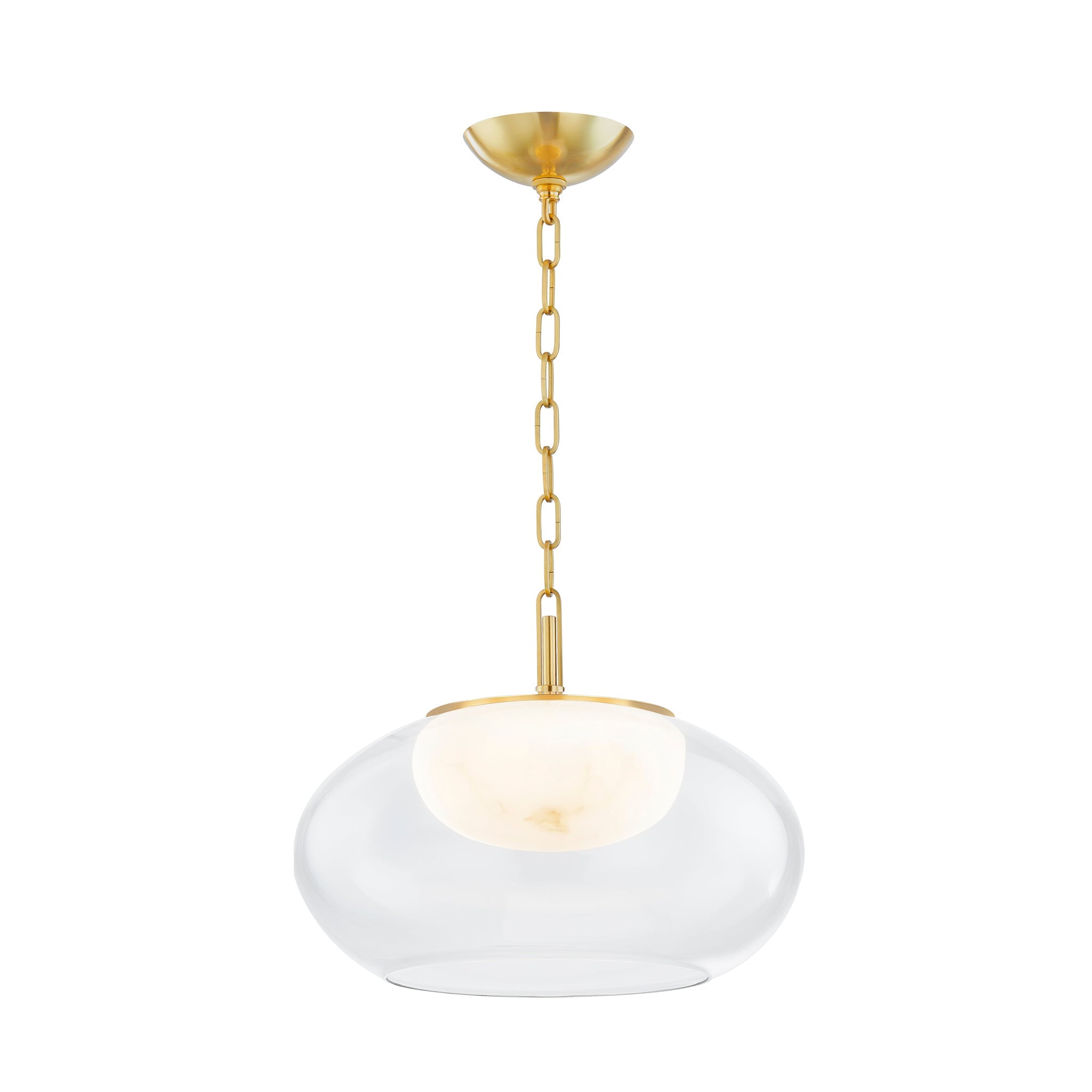 Moore stuns in its simplicity. Available in two sizes, this nested flush mount design features an outer clear glass shade that reveals alabaster within. The double layer gives the fixture an elevated, graceful presence that creates a warm diffusion of light. Finished in Aged Brass, the metalwork of Moore adds a timeless, luxurious note that complements any design style.