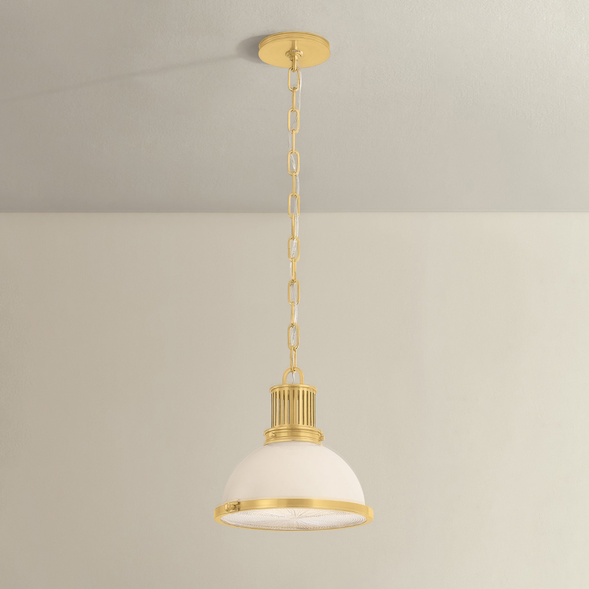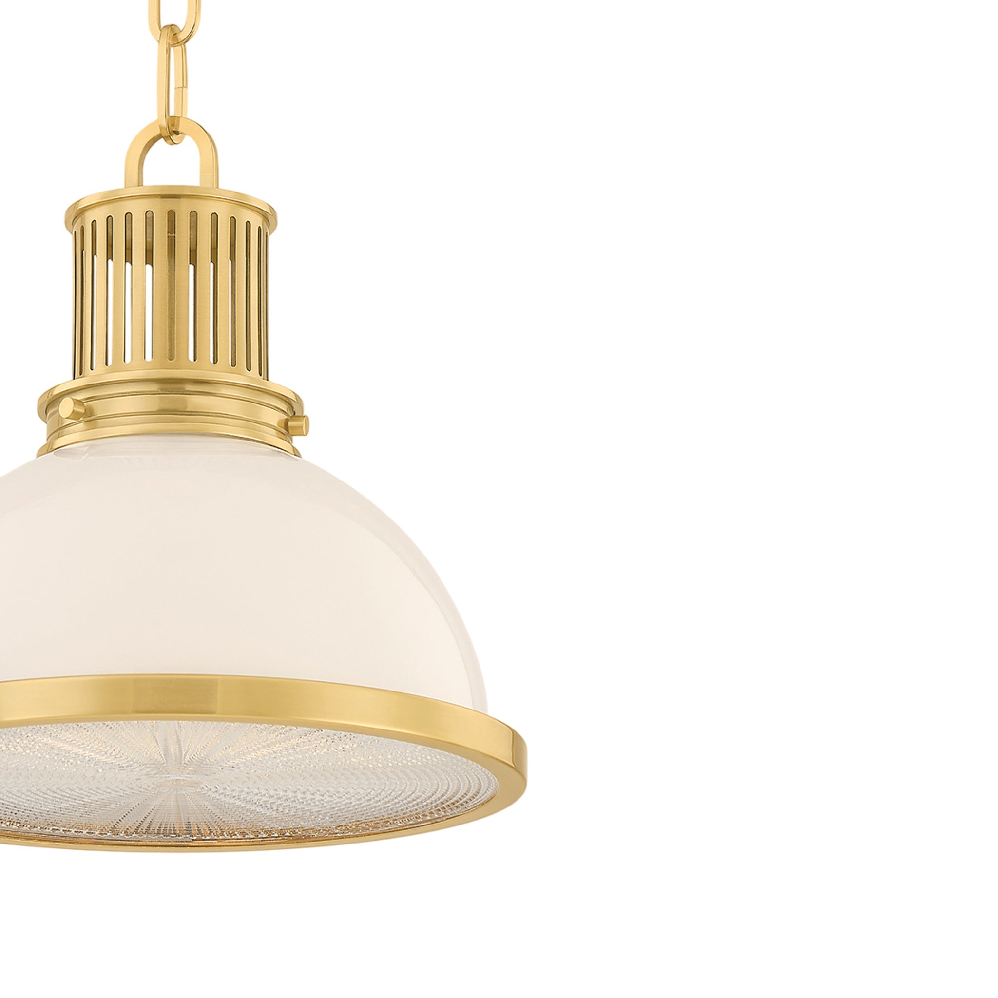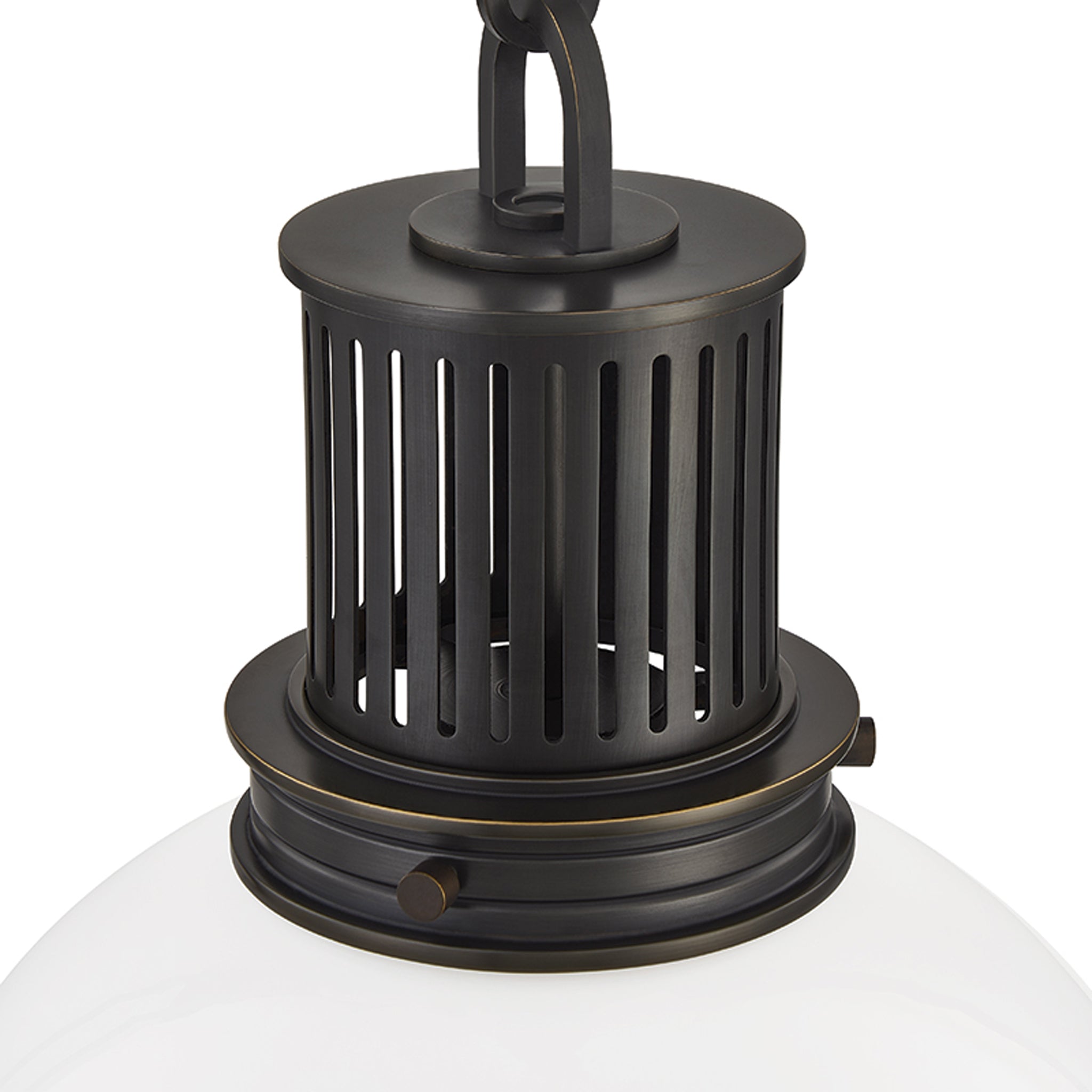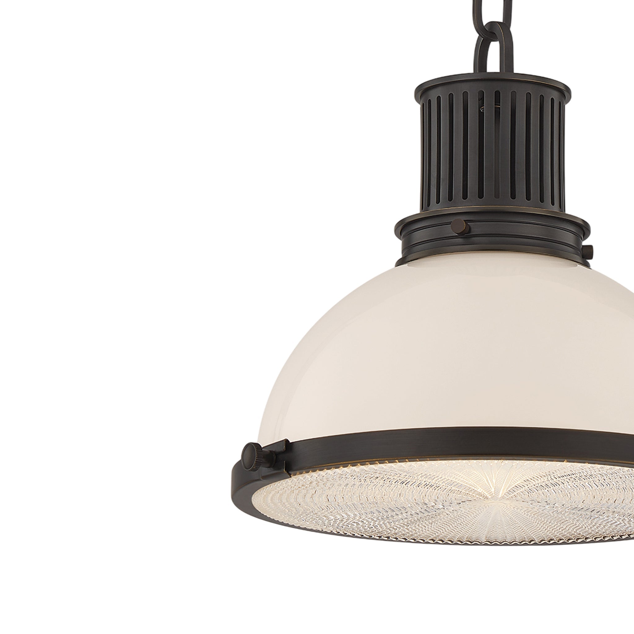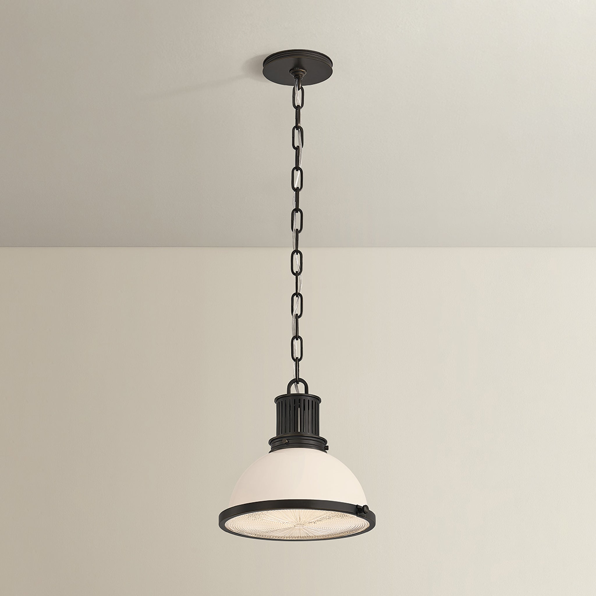 The retro-inspired Pinesbridge takes a classic RLM silhouette and reimagines it with geometric details. A large opal shiny glass shade is paired with a mesmerizing holophane glass diffuser featuring textural grooves. Machine-cut perforations around the top of the pendant add an industrial edge. Available in two sizes and finished in either Aged Brass or Distressed Bronze, this schoolhouse lamp revamp hangs with style in kitchens, hallways, and beyond.