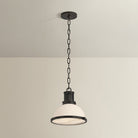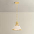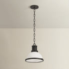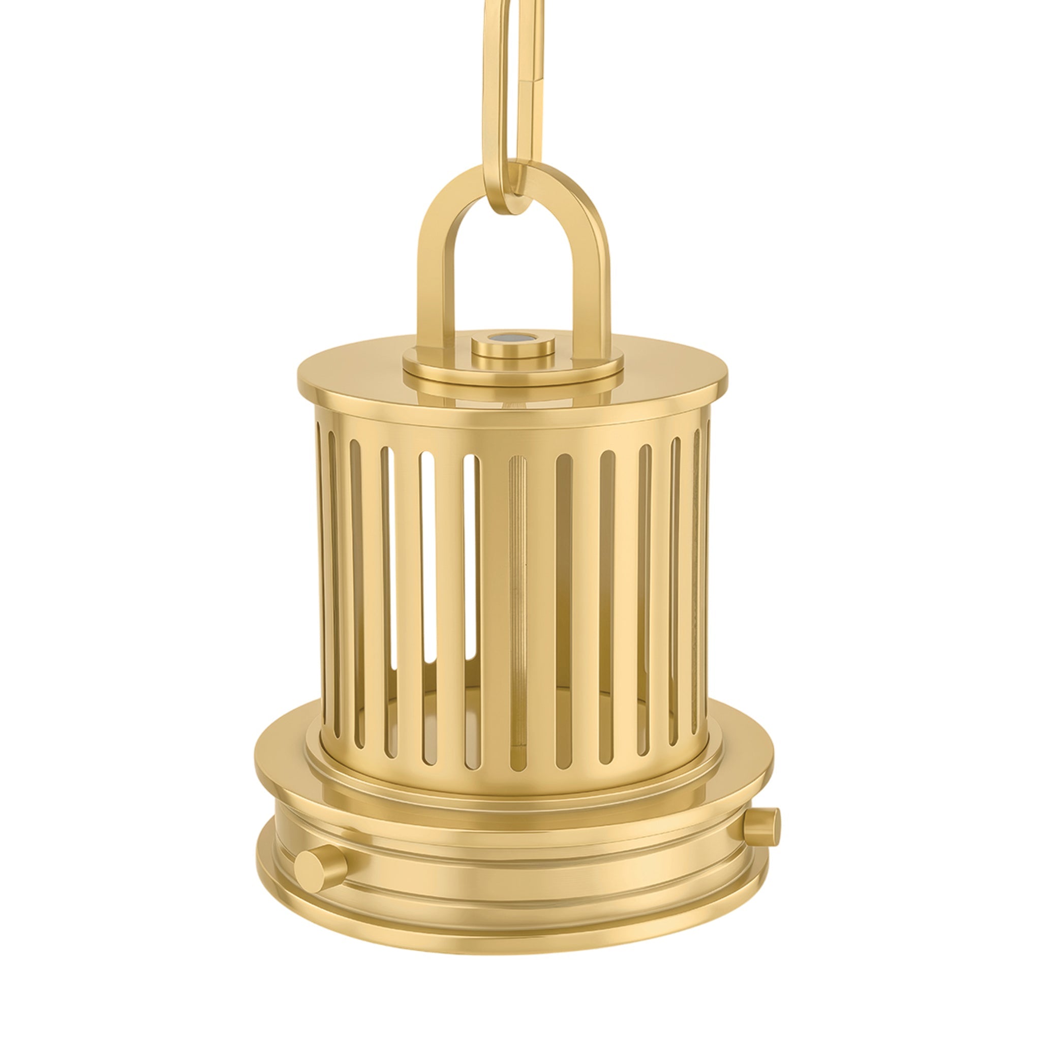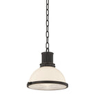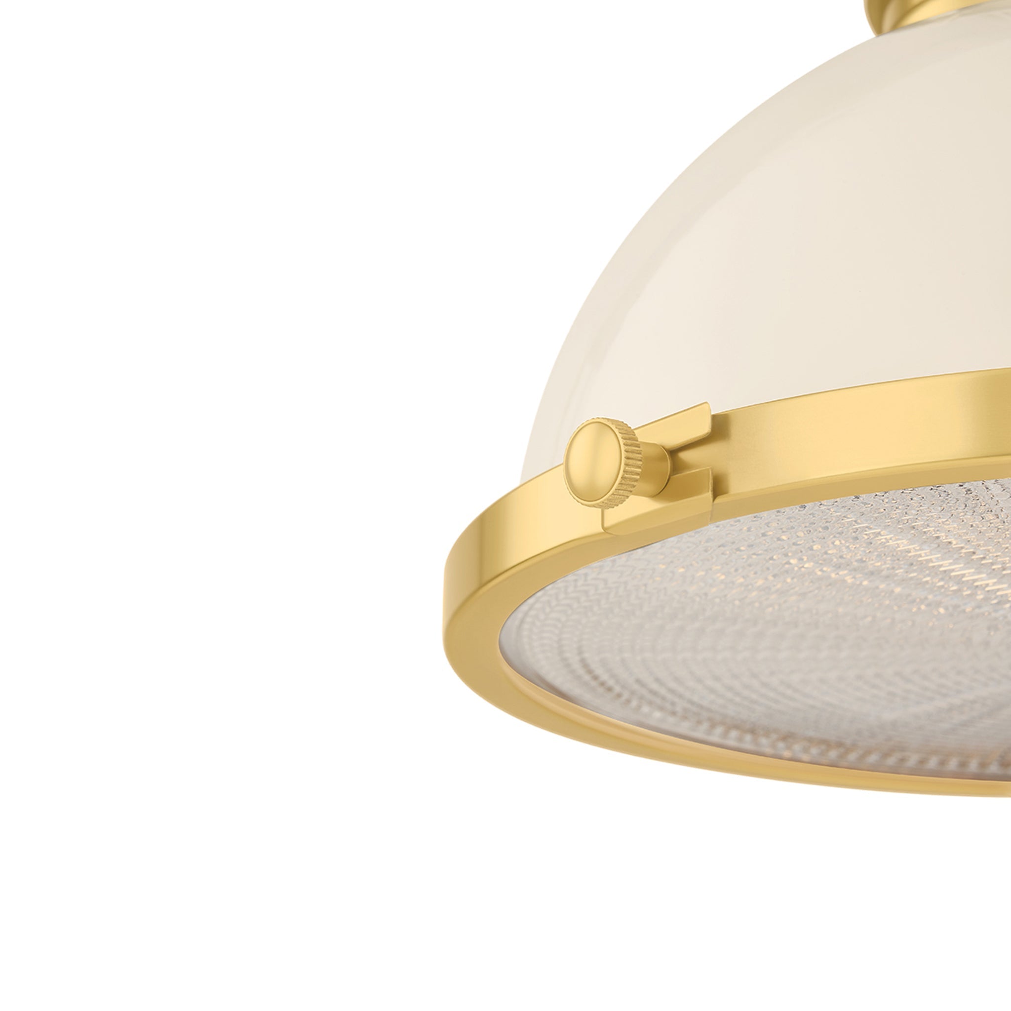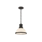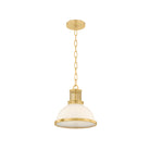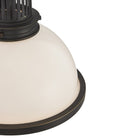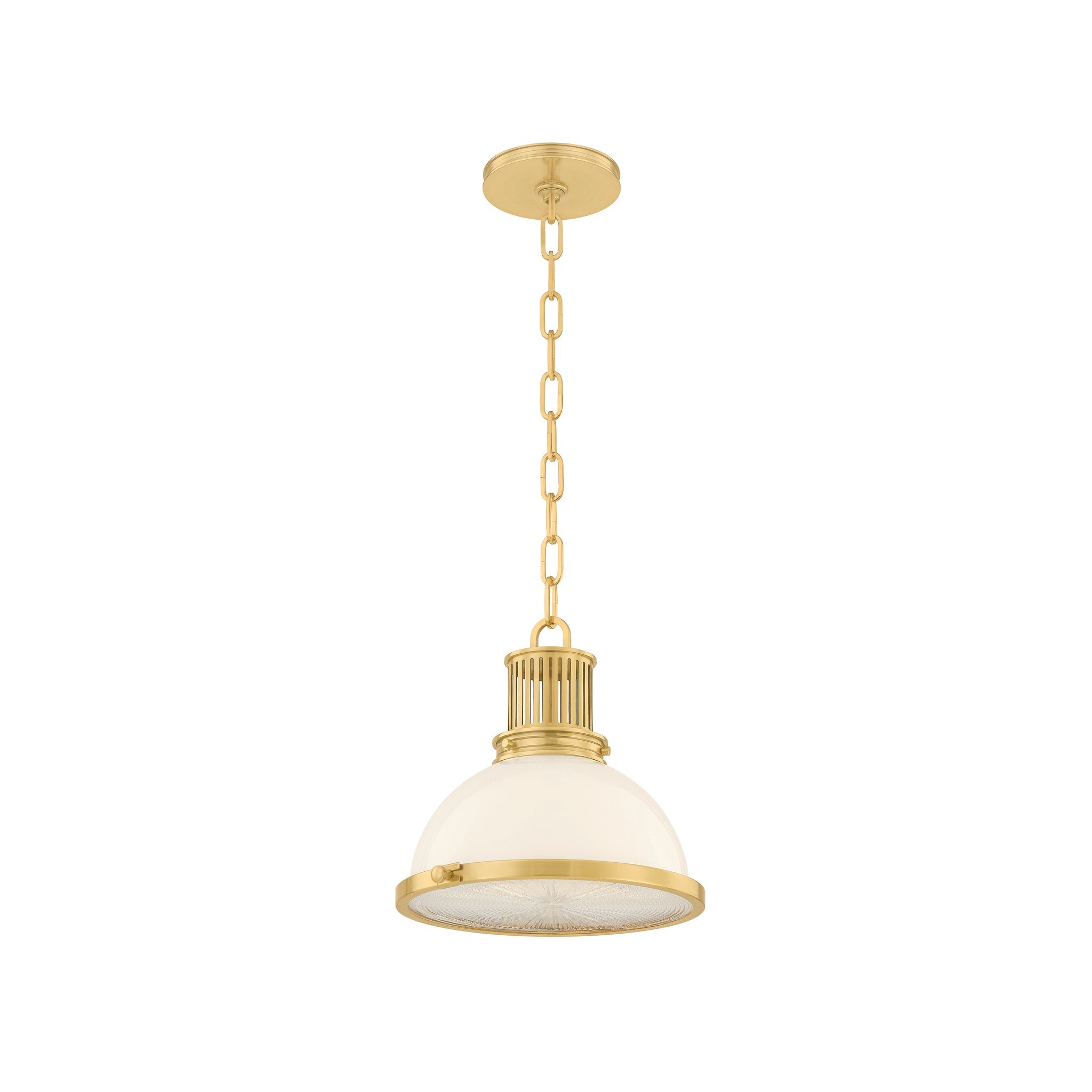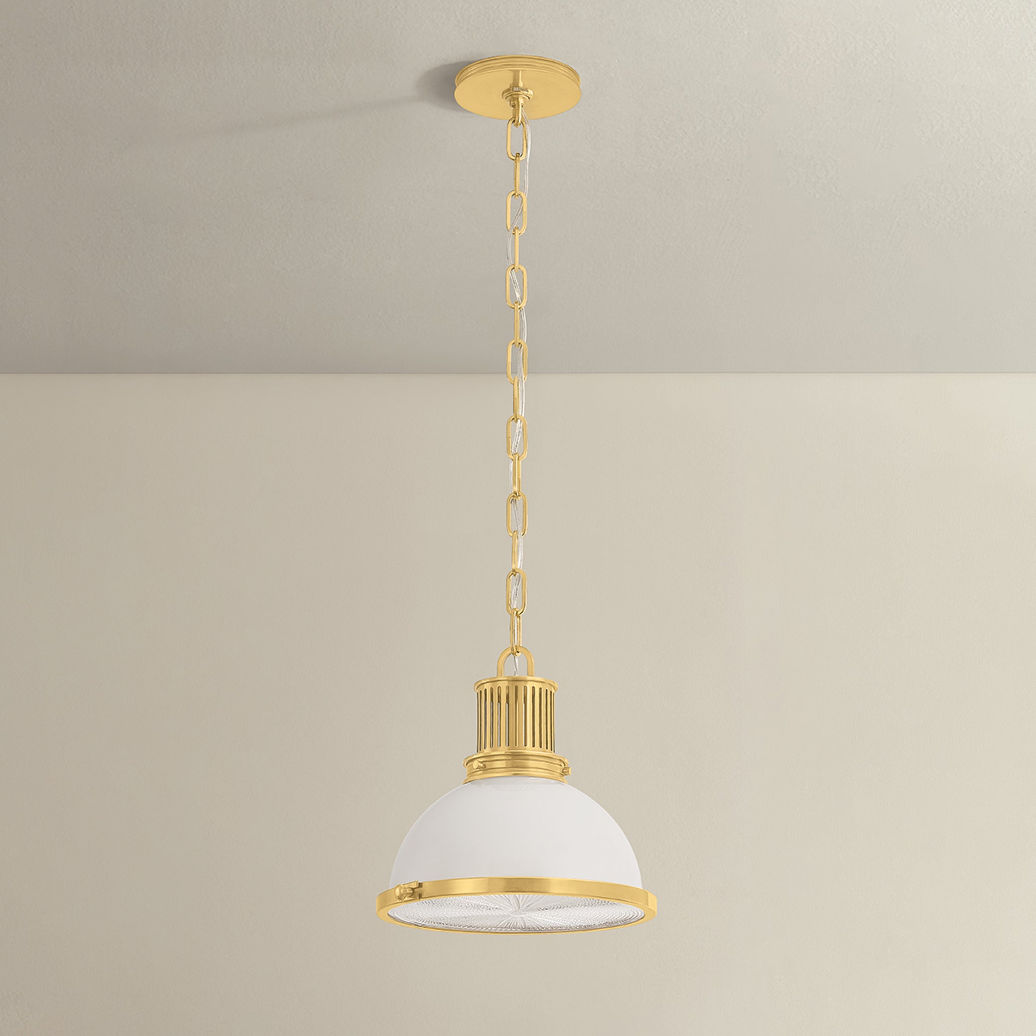 The retro-inspired Pinesbridge takes a classic RLM silhouette and reimagines it with geometric details. A large opal shiny glass shade is paired with a mesmerizing holophane glass diffuser featuring textural grooves. Machine-cut perforations around the top of the pendant add an industrial edge. Available in two sizes and finished in either Aged Brass or Distressed Bronze, this schoolhouse lamp revamp hangs with style in kitchens, hallways, and beyond.