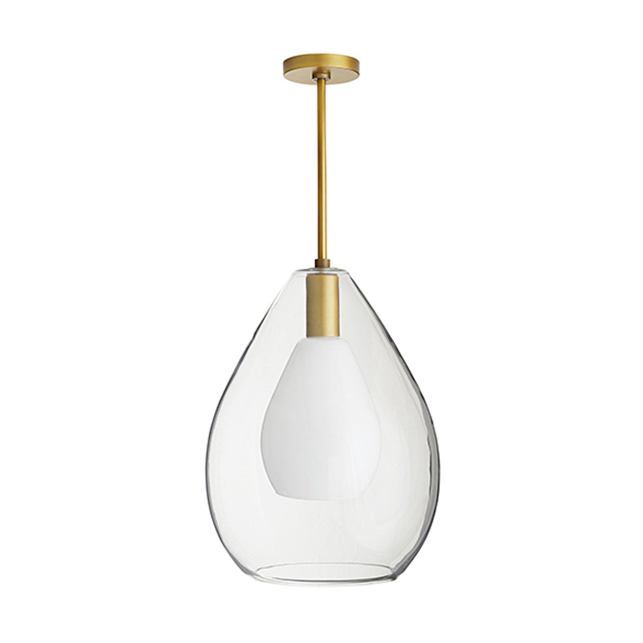 Two shades of hand-blown glass forms the drop of this pendant. Seemingly simple in its design, an inner teardrop-shaped shade conceals a standard bulb in opal glass, then a larger shade rests outside it, exposing the inner piece in clear glass. both hang from a stainless steel stem and mount, both finished in antique brass.