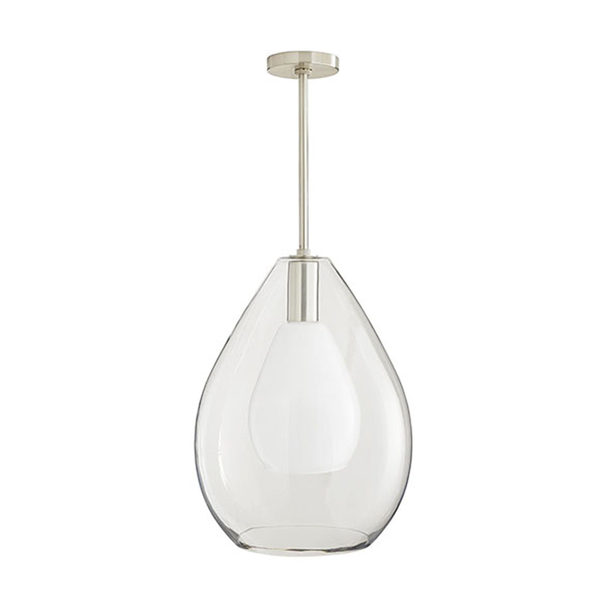Two shades of hand-blown glass forms the drop of this pendant. Seemingly simple in its design, an inner teardrop-shaped shade conceals a standard bulb in opal glass, then a larger shade rests outside it, exposing the inner piece in clear glass. both hang from a stainless steel stem and mount, both finished in brushed nickel.