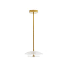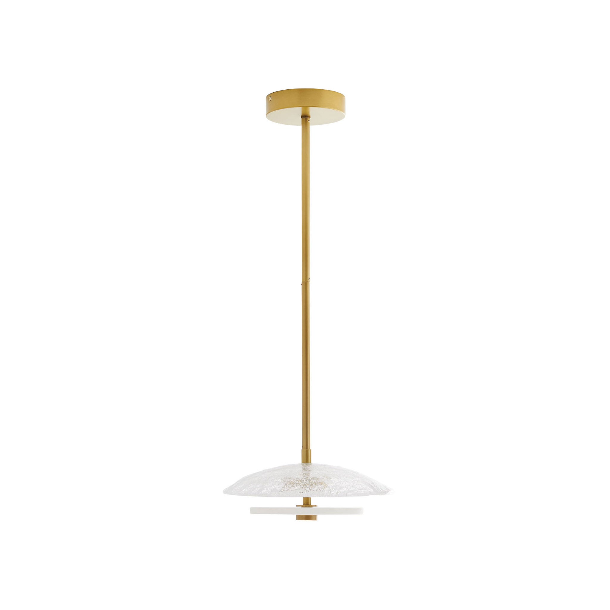 Modern design is elevated with this pendant's combination of materials and style. a curved, clear seedy slump glass shade hovers a white alabaster disc, which is equipped with an integrated led light, stacked on an antique brass iron pipe. the led disc offers a soft glow that picks up subtle bubbled details found in the shade. finish and glass will vary. additional pipe will available (pipe-180). damp-rated, although limited covered outdoor areas may affect finish.