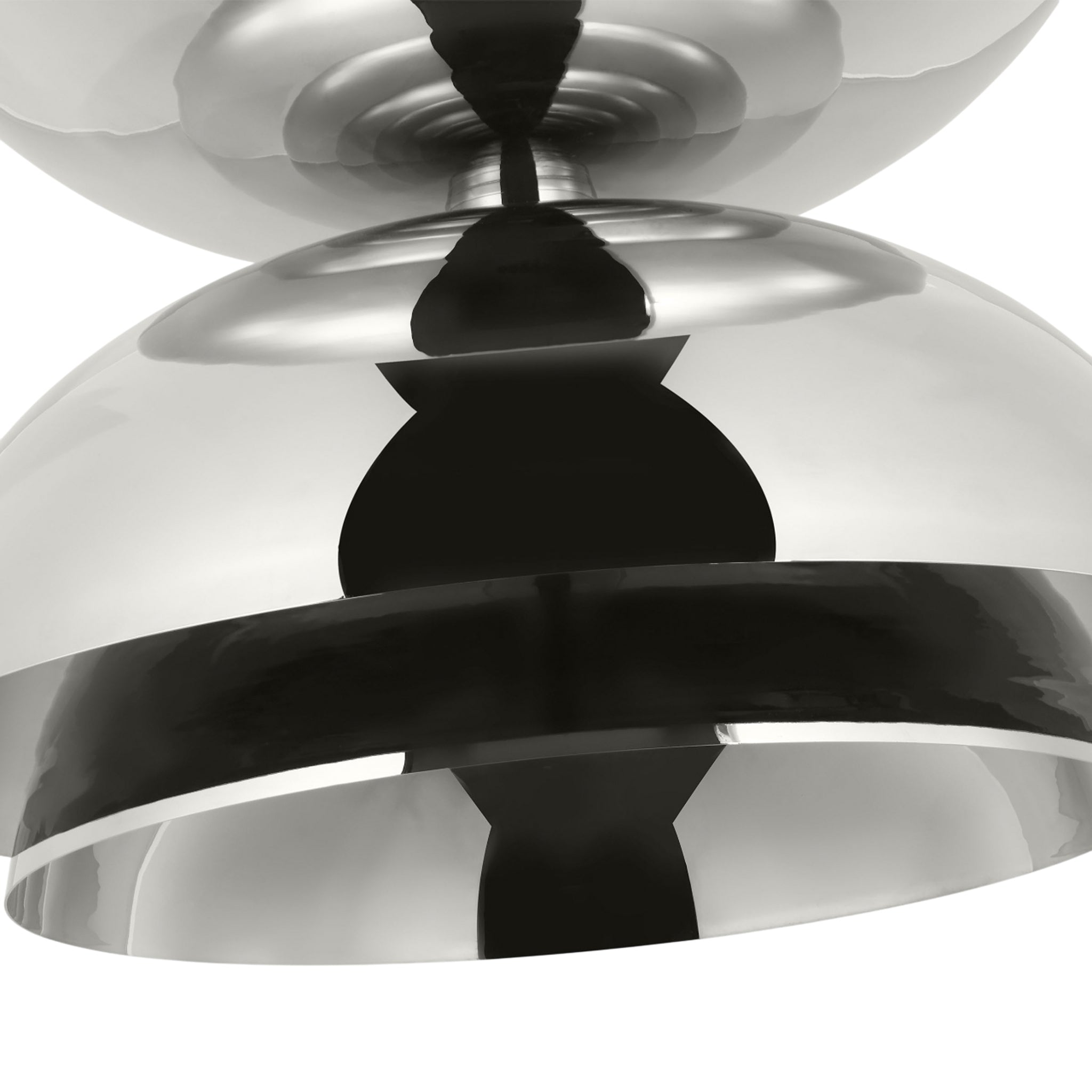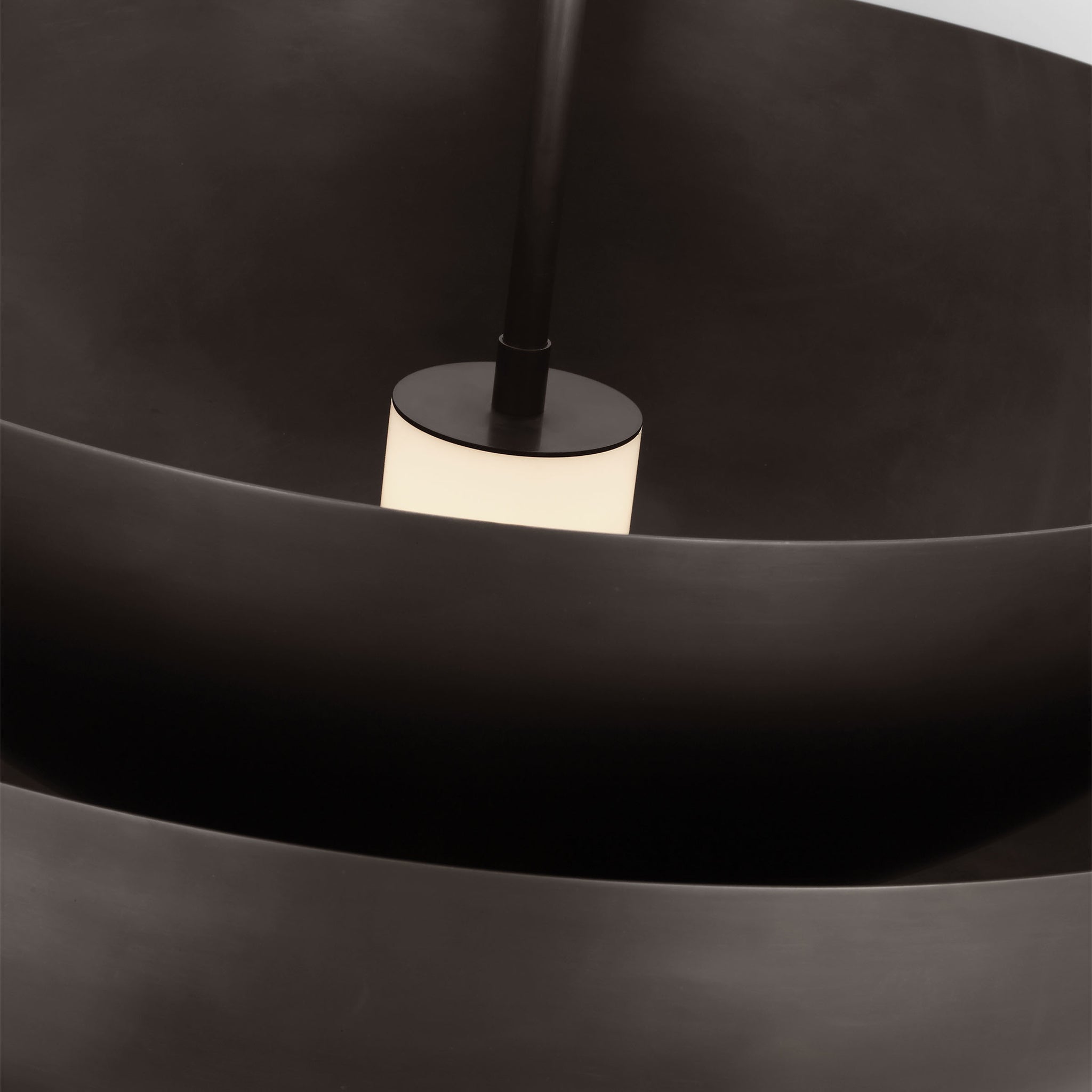 The Shanti by Sean Lavin is a statement-making piece you'll want to set the tone in your foyer, living room, or dining room. The design presents a fresh visual you can indulge in from any angle you look at it. Hanging from the end of a simple stem is a set large spun metal-shaped shades. Light sends the piece to another level as the multi-directional bulbs glaze the structure while creating a warm, radiant glow. Integrated LED modules bring the metal to life as they emit a bright and even layer of light through the top and bottom of the piece.