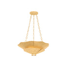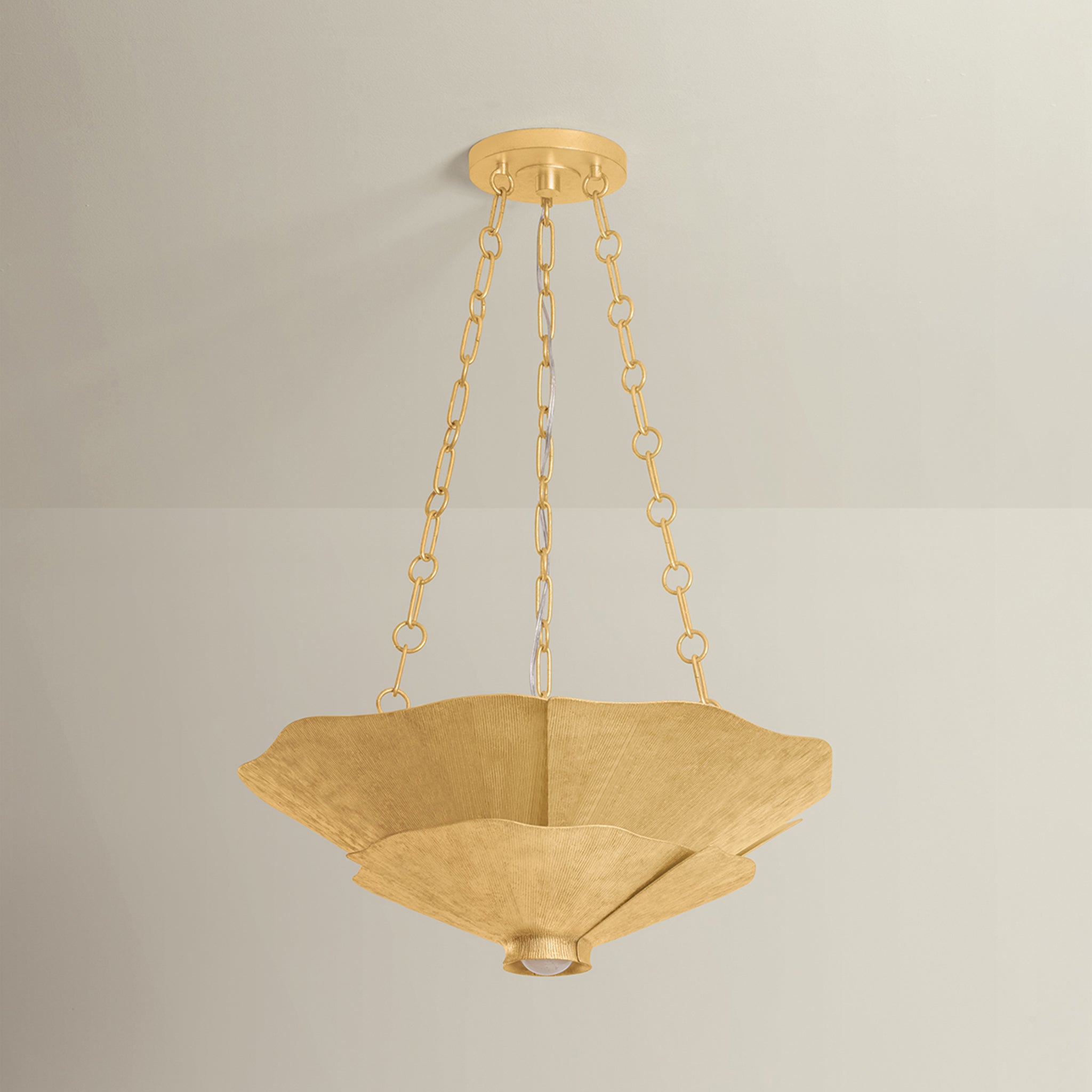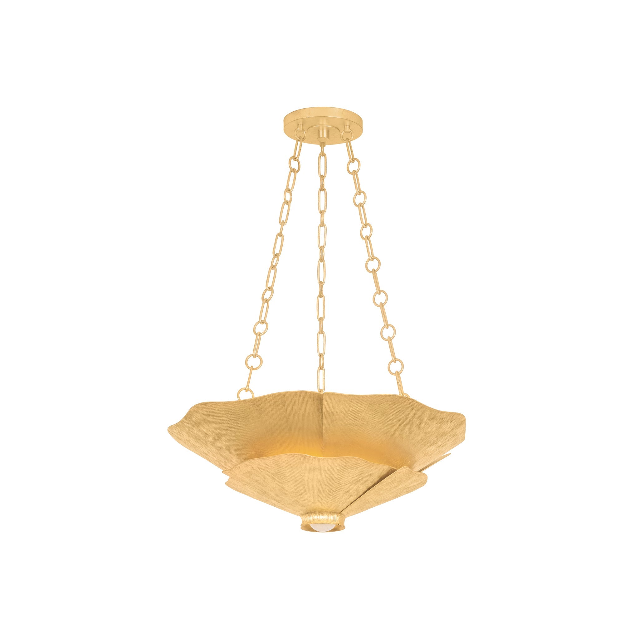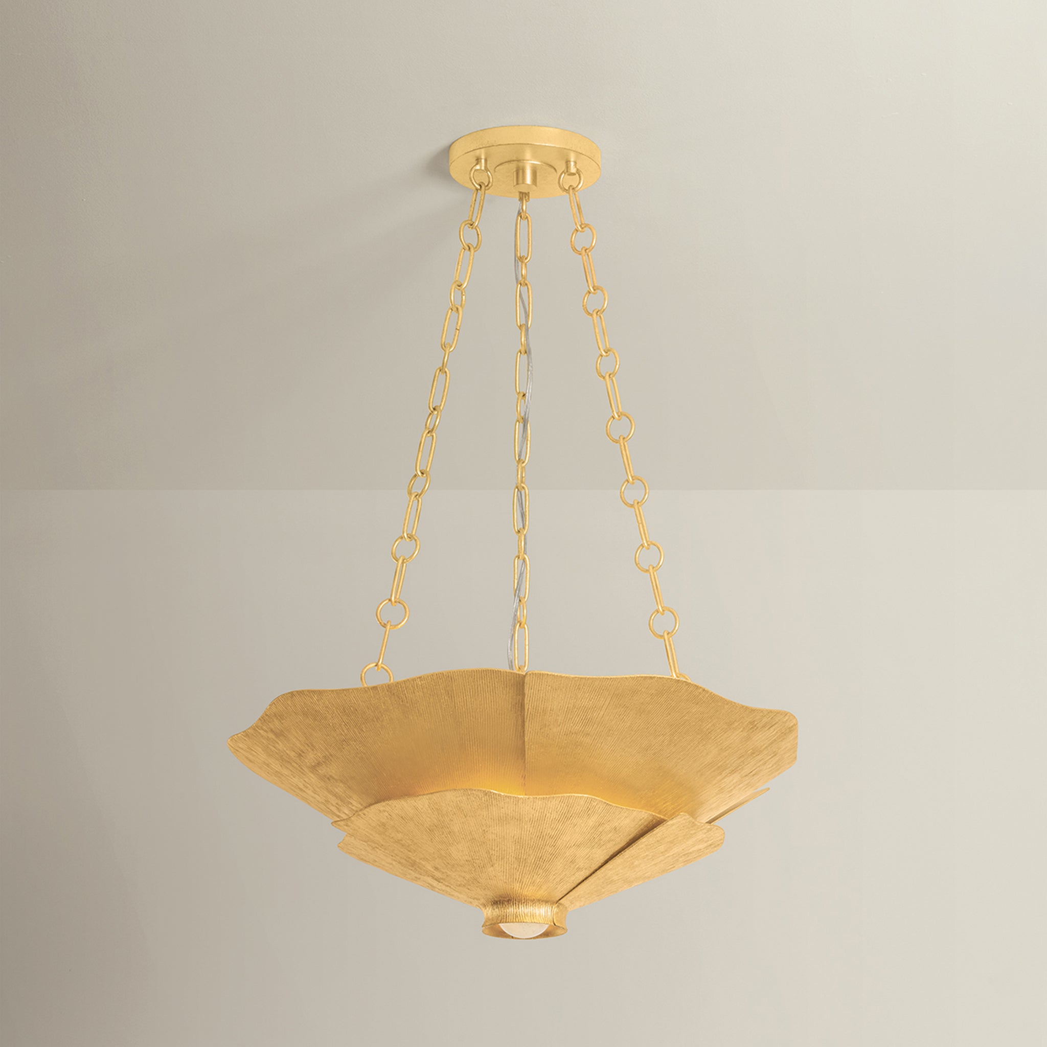 The expressive Spring Valley makes a modern floral statement. Two layers of artful 'petals' are detailed with irregular edges and realistic textured ribbing, giving this chandelier a multi-dimensional feel. As light emanates from the inner champagne cloud seedy glass shade, it enhances the warmth and beauty of the all-over Vintage Gold Leaf finish. For added dimensionality, light radiates from both ends. Available in a small size with 4 lights and a large size with 5 lights.