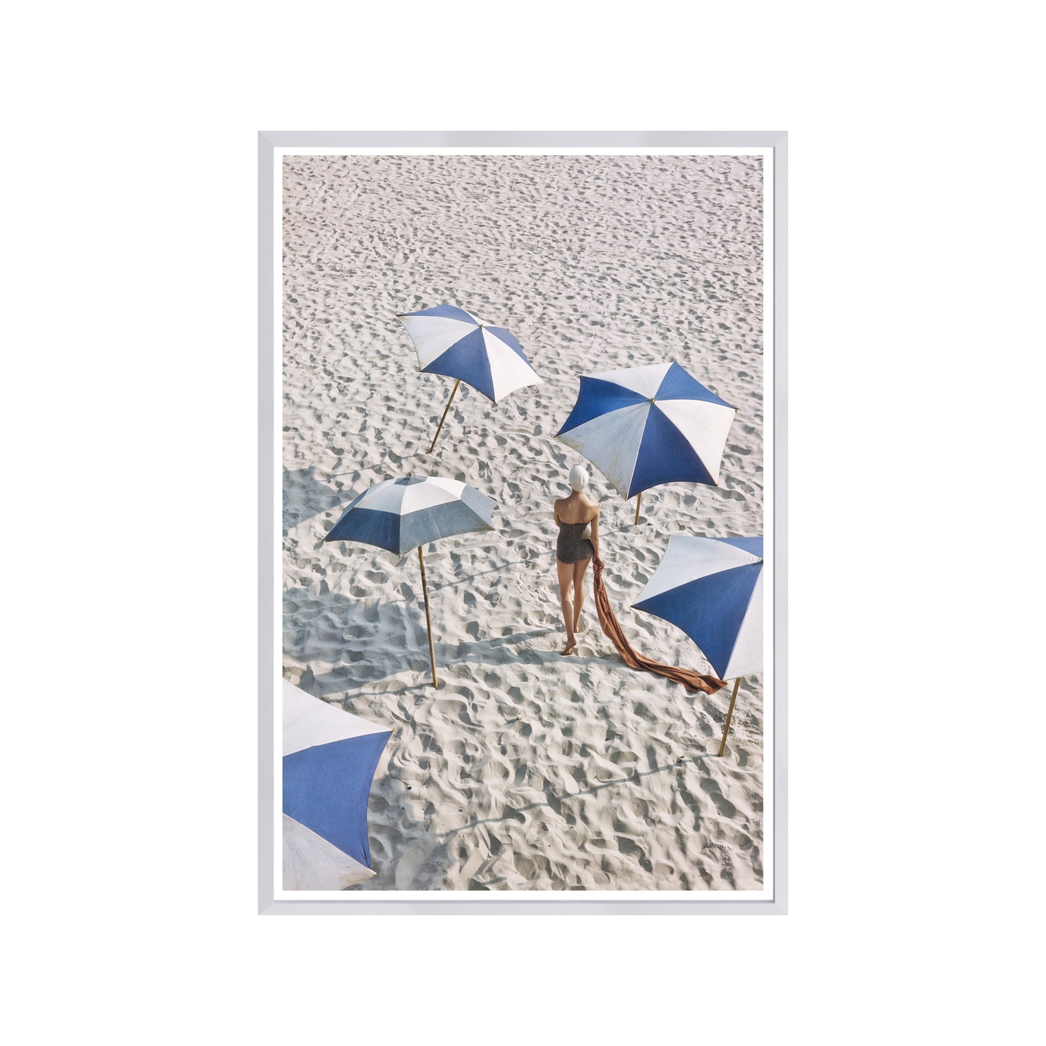 This photograph beautifully captures a swimsuit model in motion, shot from a dynamic, unexpected angle. The arrangement of umbrellas surrounding her creates an intriguing composition, guiding the viewer’s eye through the image as if following the path the model is taking.