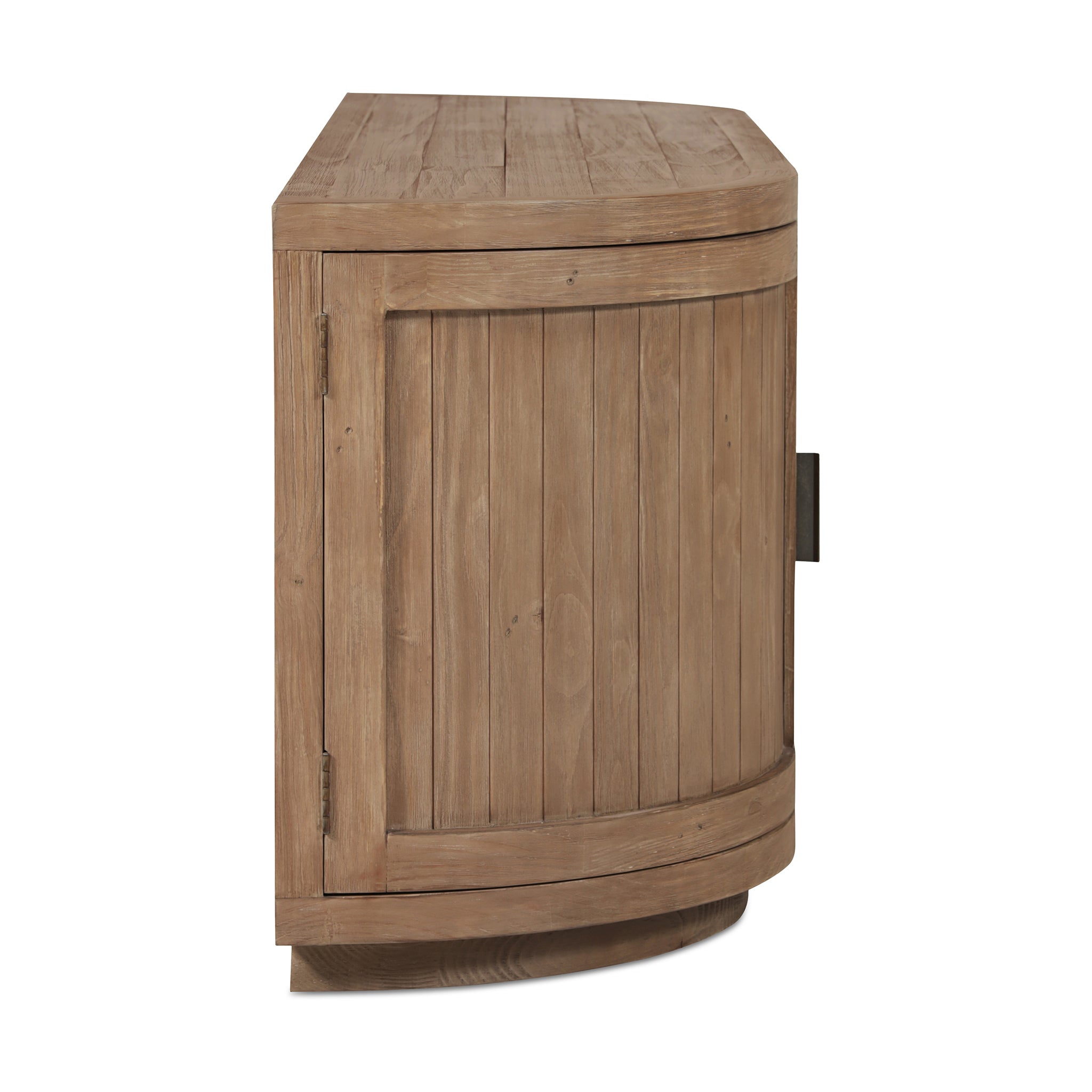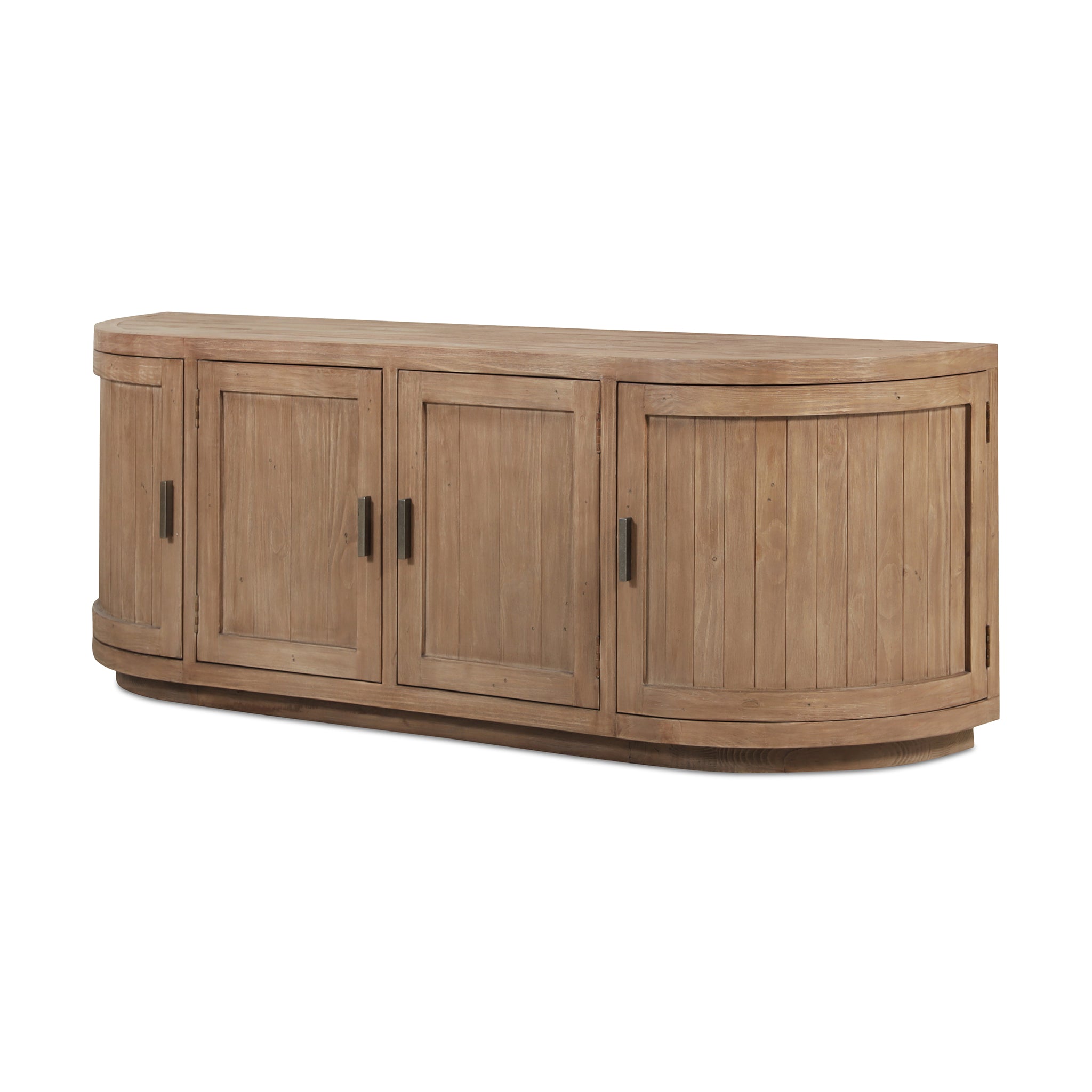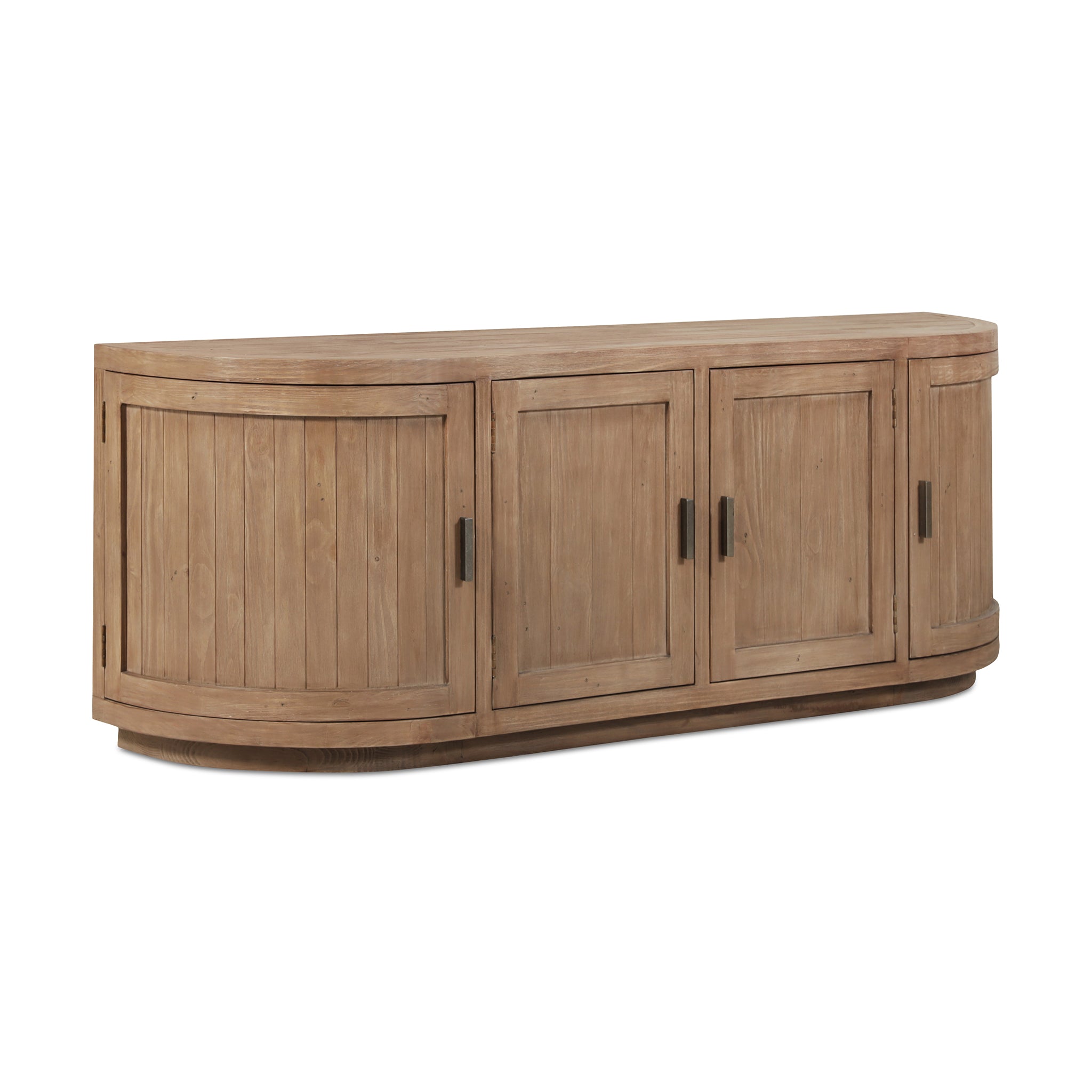 A blend of modern and vintage with its contemporary silhouette, the Carter media cabinet features curved doors that smooth the bold textures of reclaimed wood. Its striking form stands on a recessed base, offering a stark contrast that beautifully complements transitional settings. The minimalist handle detail emphasizes the piece's elegant curves, while ample storage simplifies the organization of media essentials inside.
