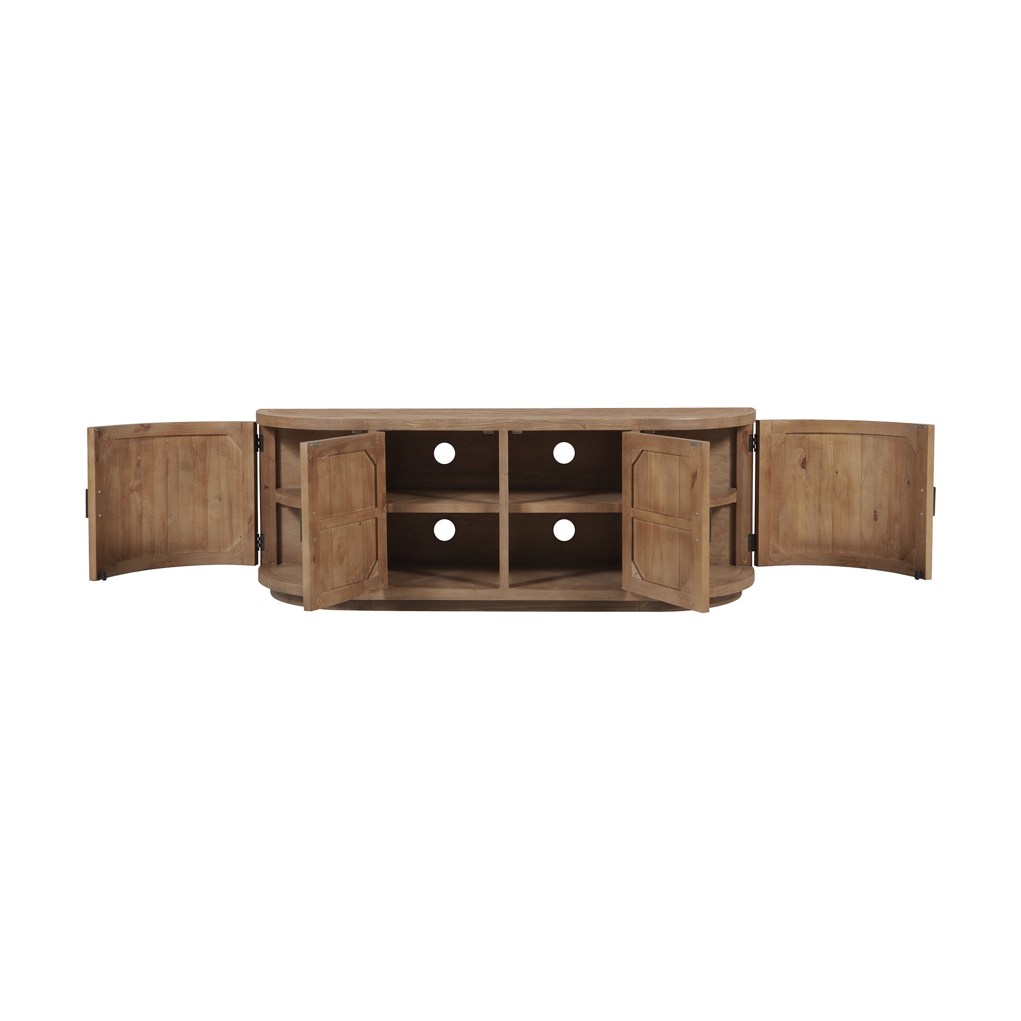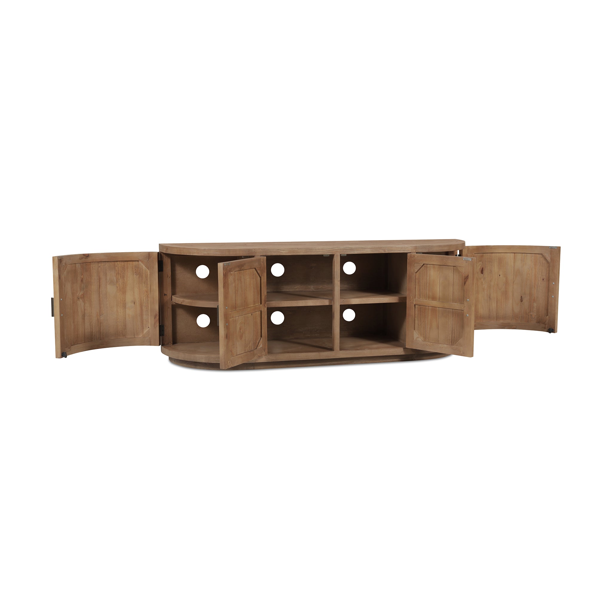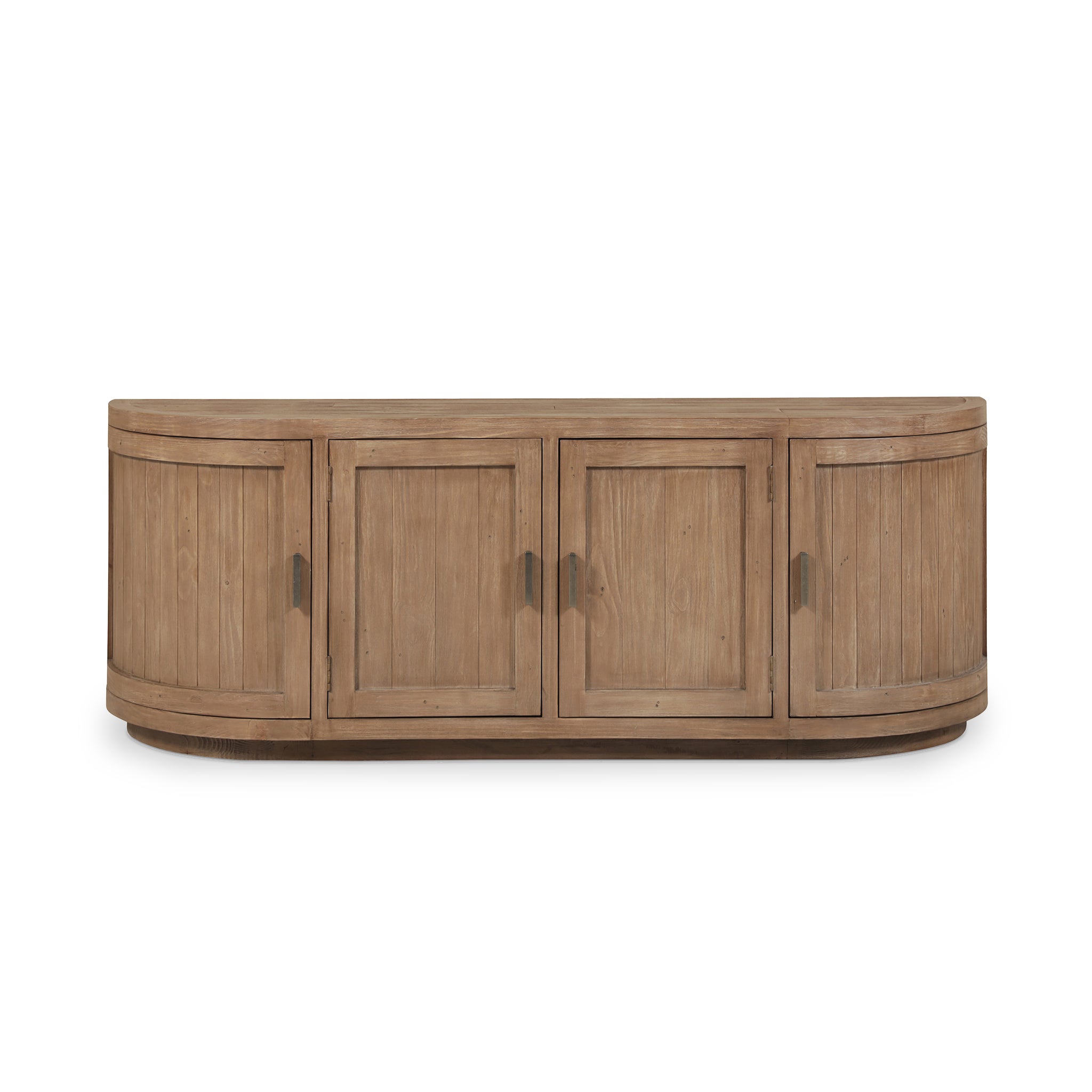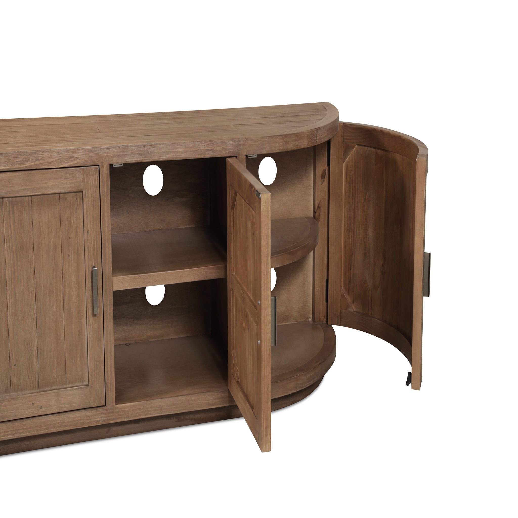 A blend of modern and vintage with its contemporary silhouette, the Carter media cabinet features curved doors that smooth the bold textures of reclaimed wood. Its striking form stands on a recessed base, offering a stark contrast that beautifully complements transitional settings. The minimalist handle detail emphasizes the piece's elegant curves, while ample storage simplifies the organization of media essentials inside.