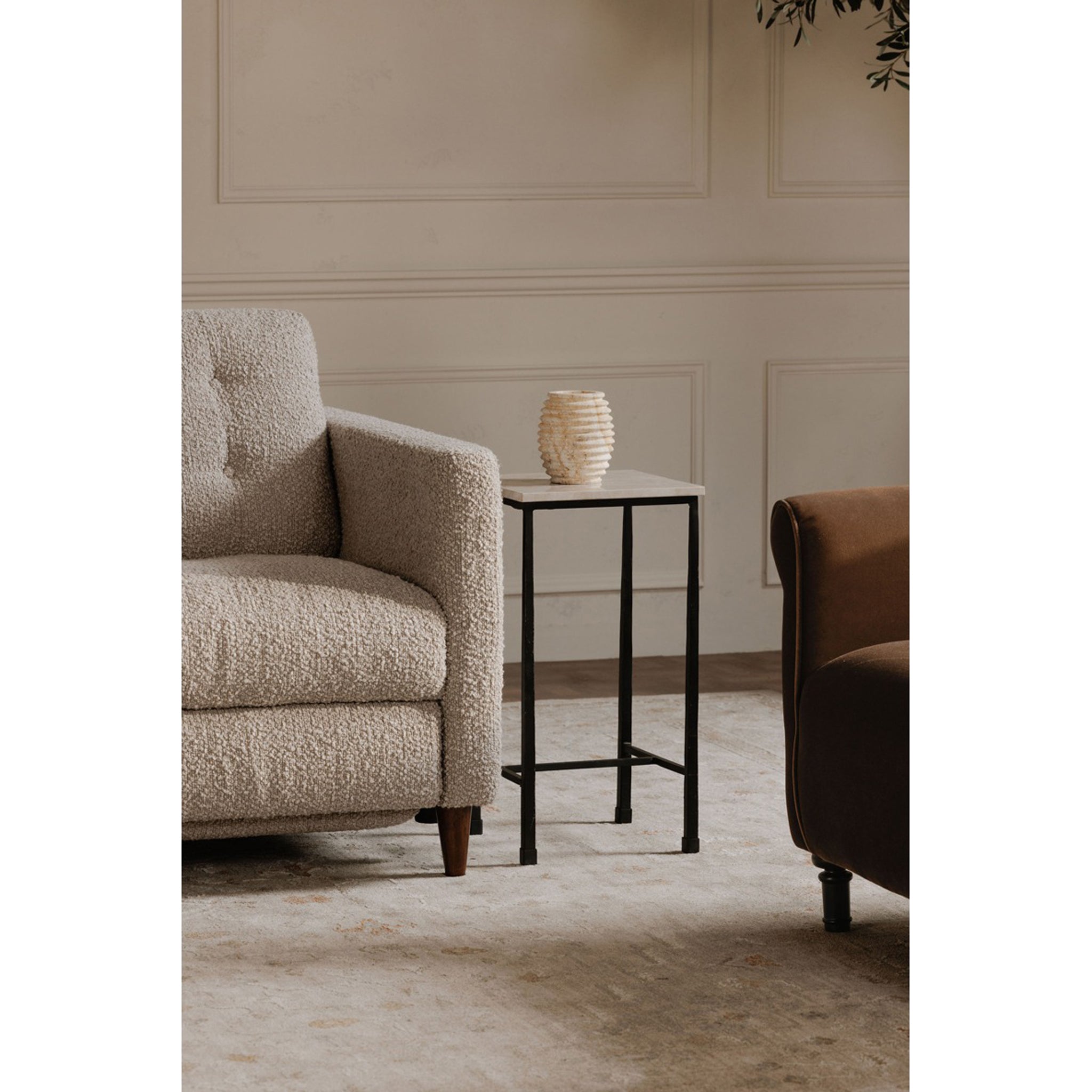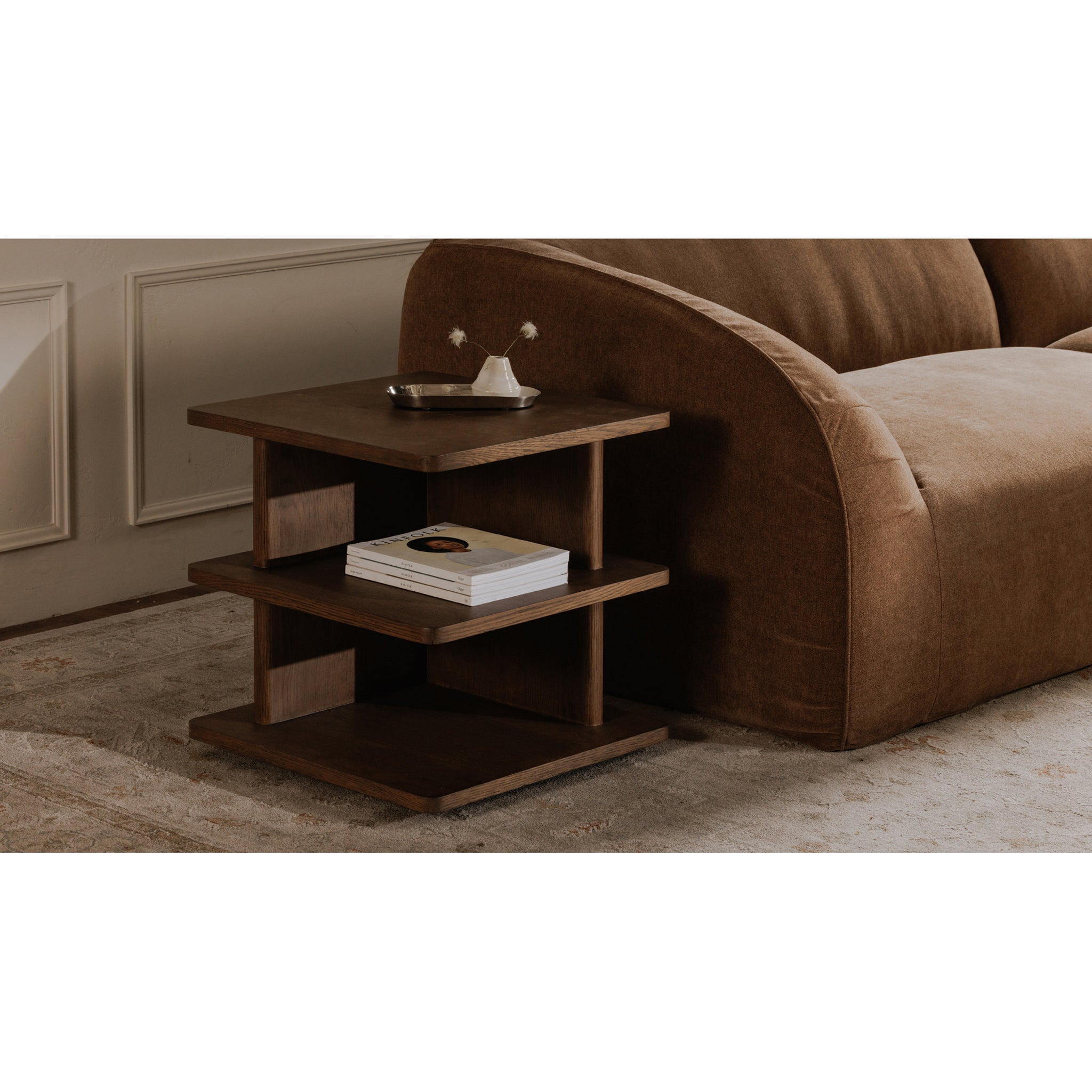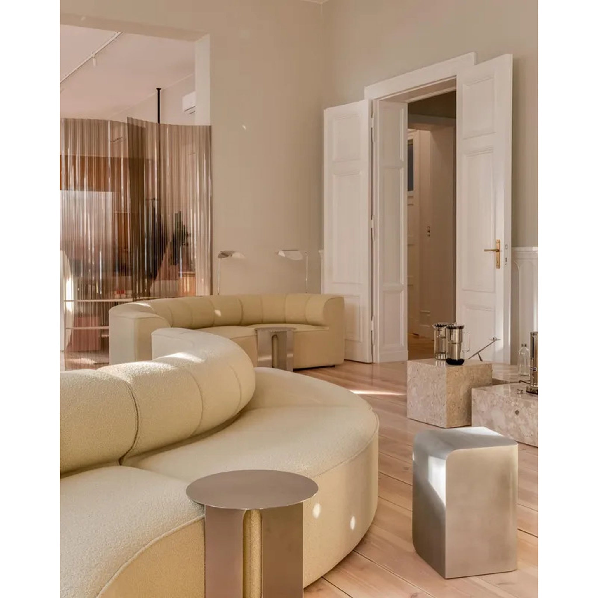 Create a cozy seating area in your living room by adding decorative accents and offering your family and guests convenience with perfectly placed side tables. The beauty of our designer side tables is that their sleek designs and versatile styles fit in absolutely anywhere, and they're small enough to be able to add multiple options to your living space. Contemporary aluminum and brass domes, retro, geometric accent tables, natural marble table stands and vintage looking, multifunctional magazine racks are some of the eye-catching options you can incorporate into your interior home decor. Our side tables and decorative stools are statement pieces on their own and make the perfect place to display a ceramic vase or candles to create a zen atmosphere. The finishing touches you choose for your living room design make all the difference, so find the ideal side table from our collection to complete the look you want.
