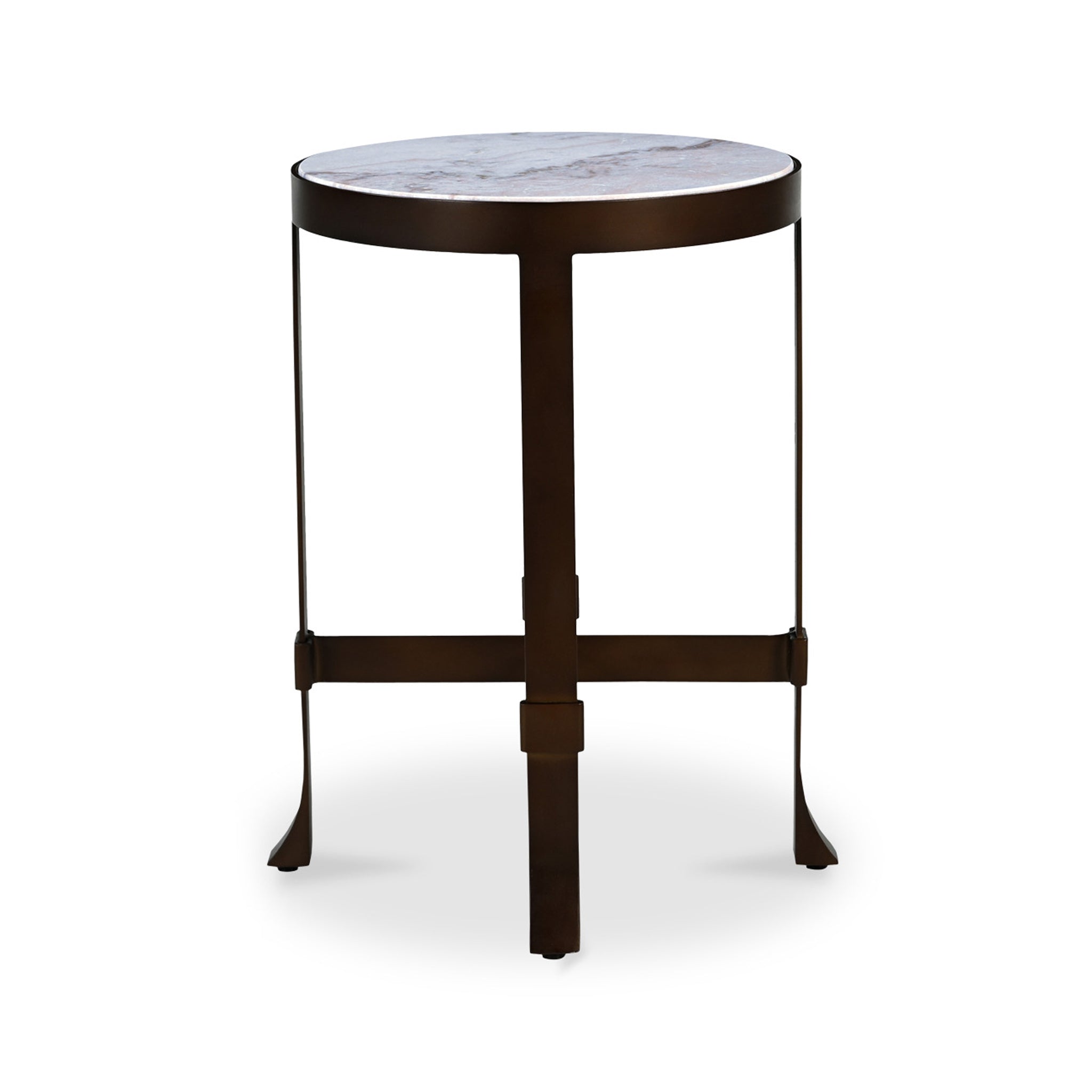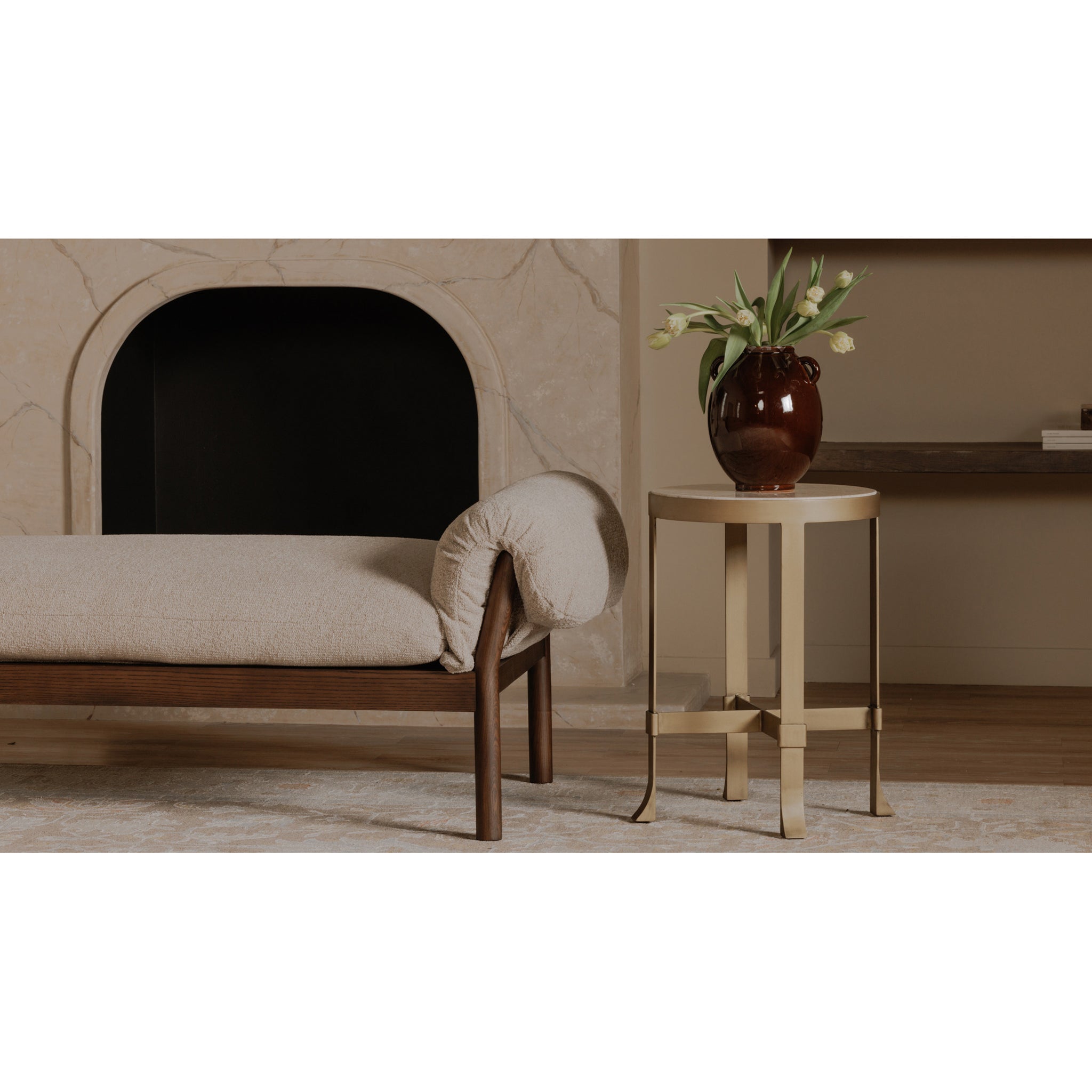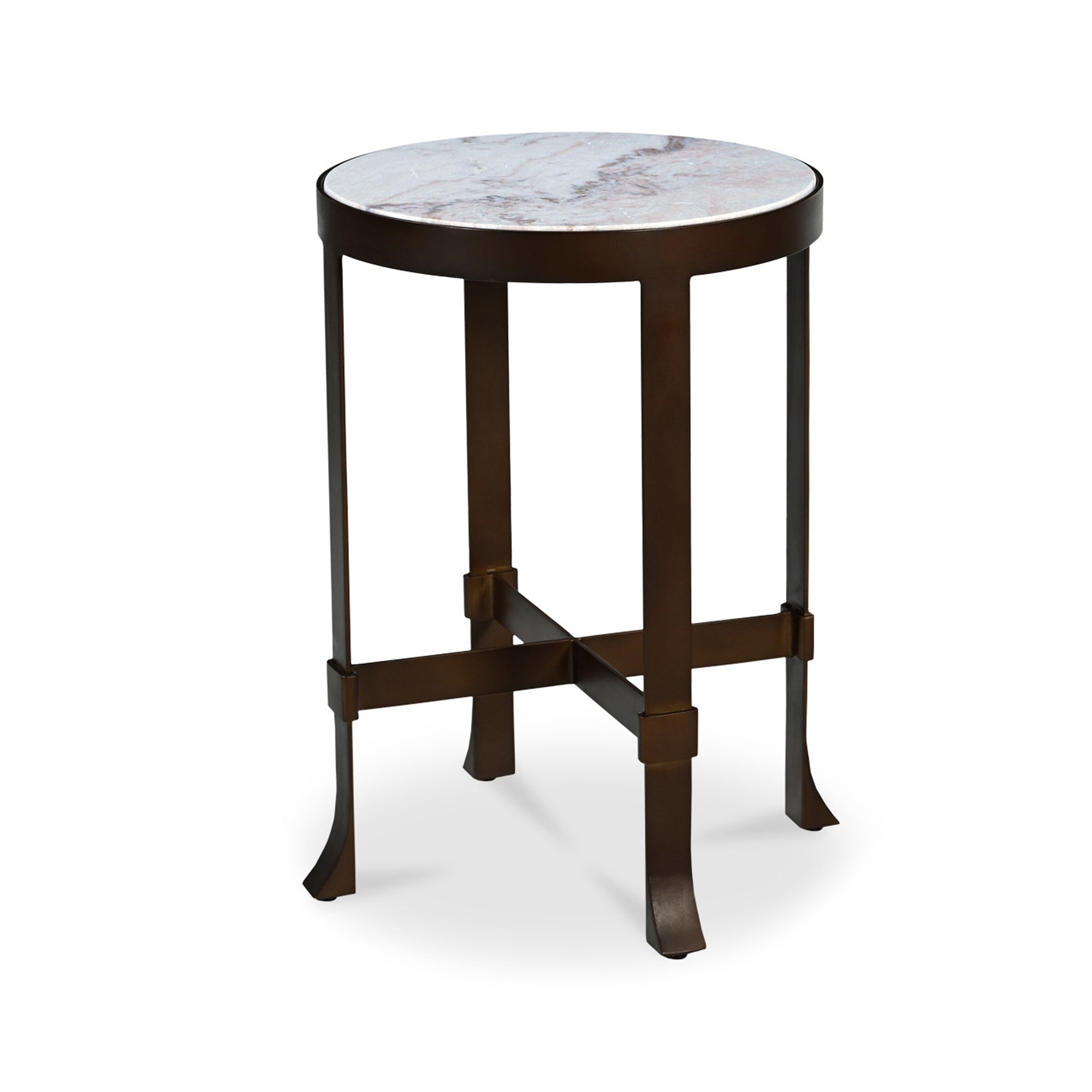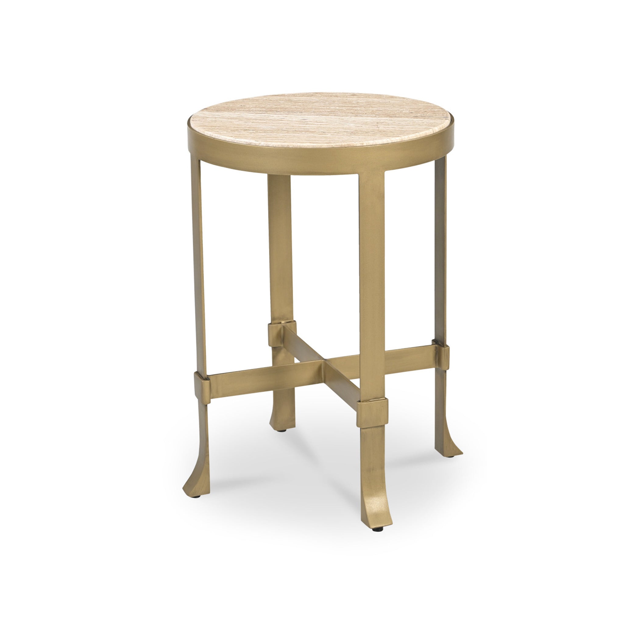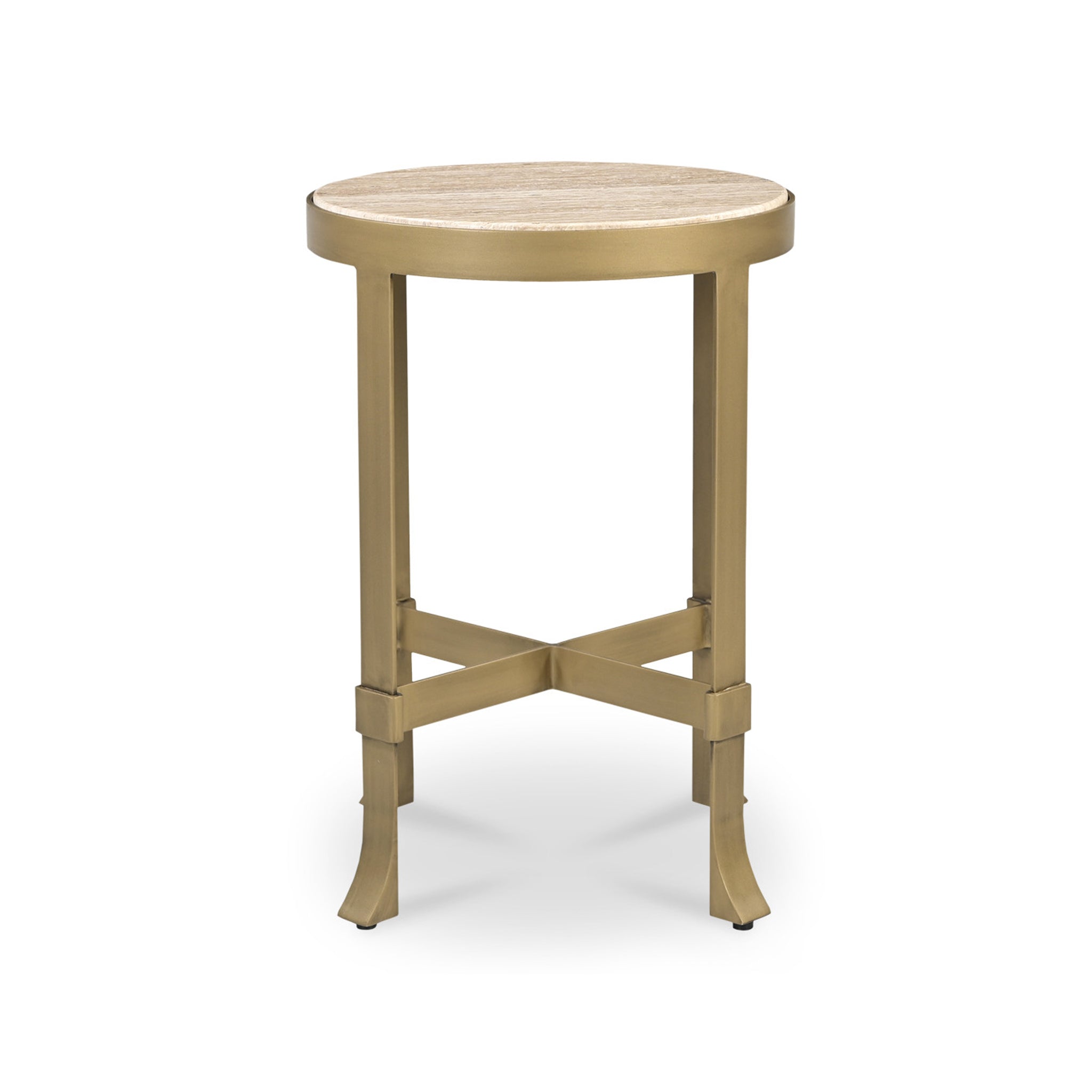 The Gisella side table blends timeless sleek iron, as its organic top rests within a subtle metal rim. The antique gold base, featuring gentle curves and distinctive buckle-like detail, showcases meticulous craftsmanship in a timeless hue.