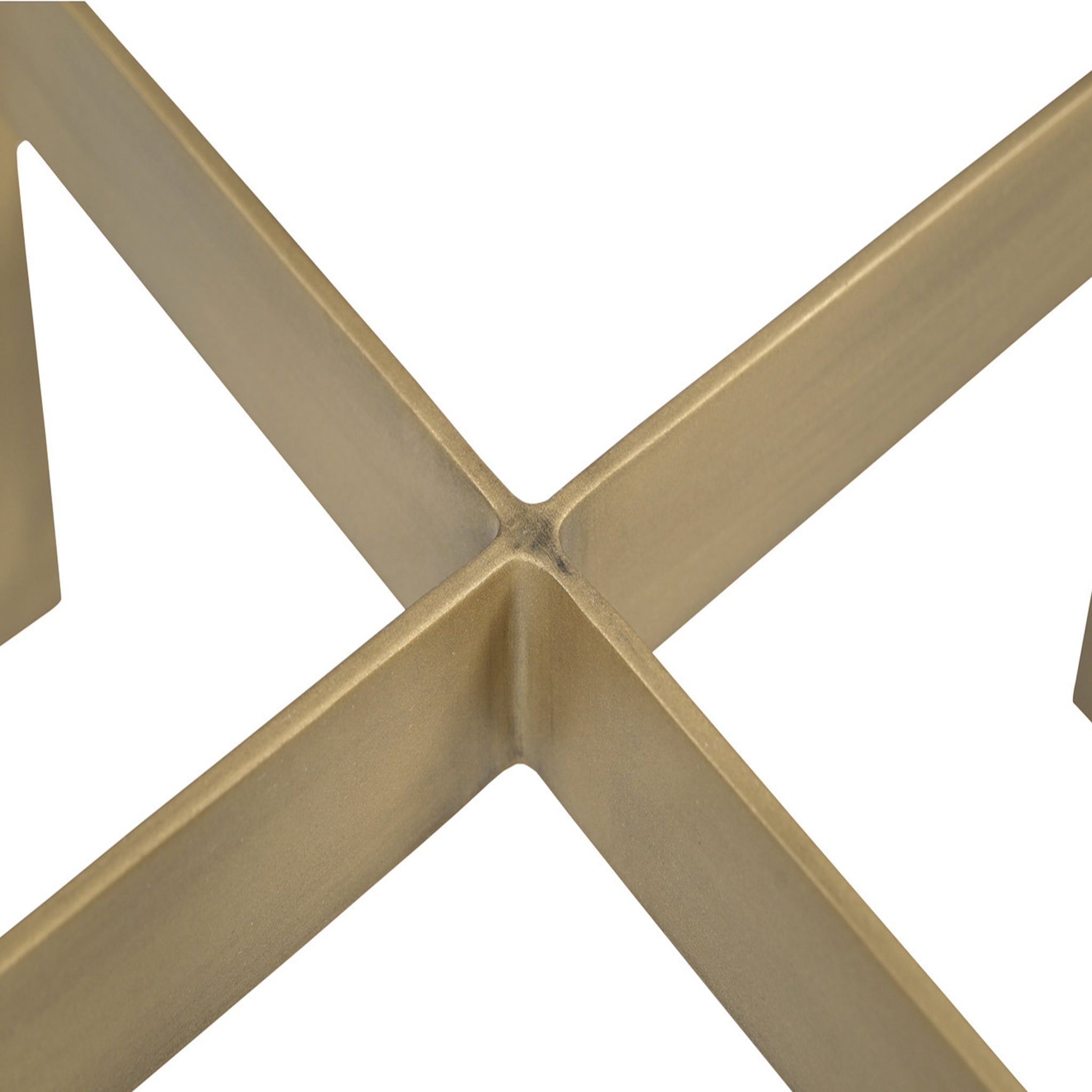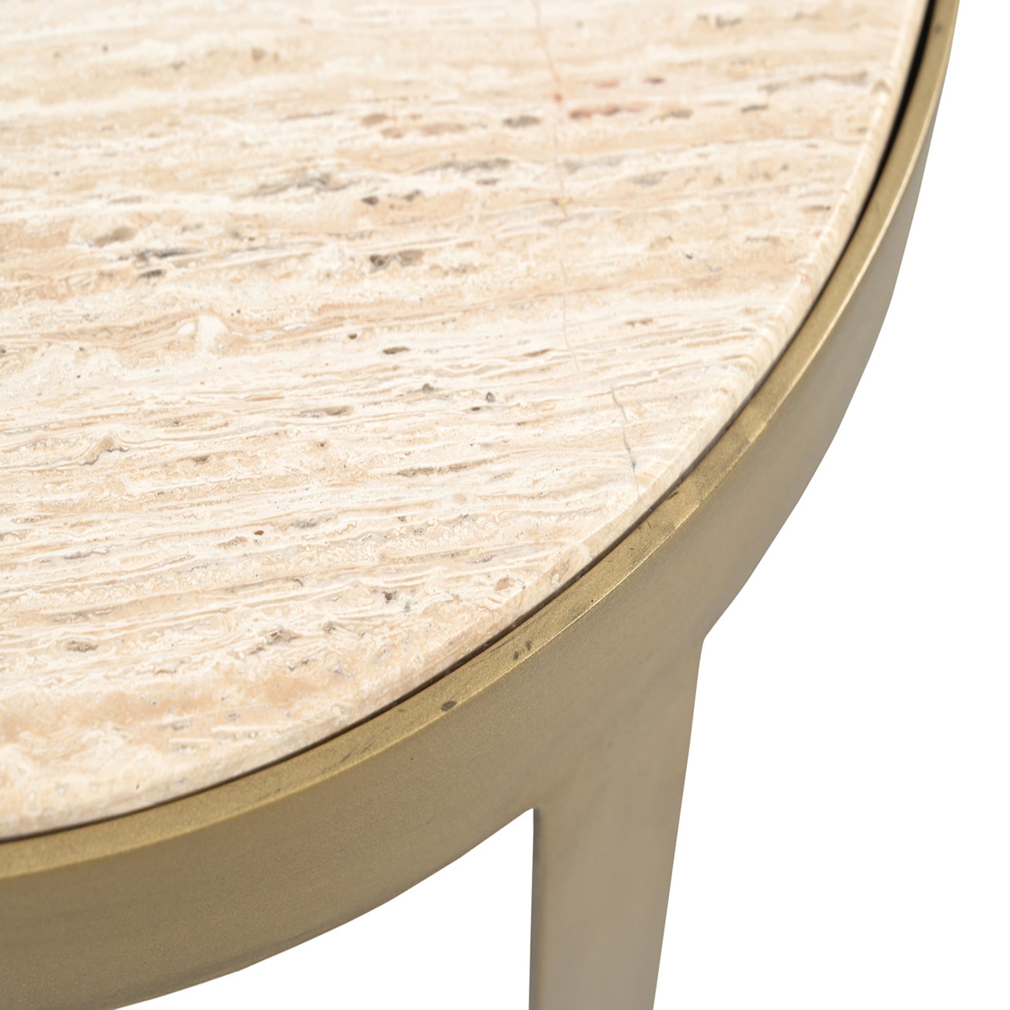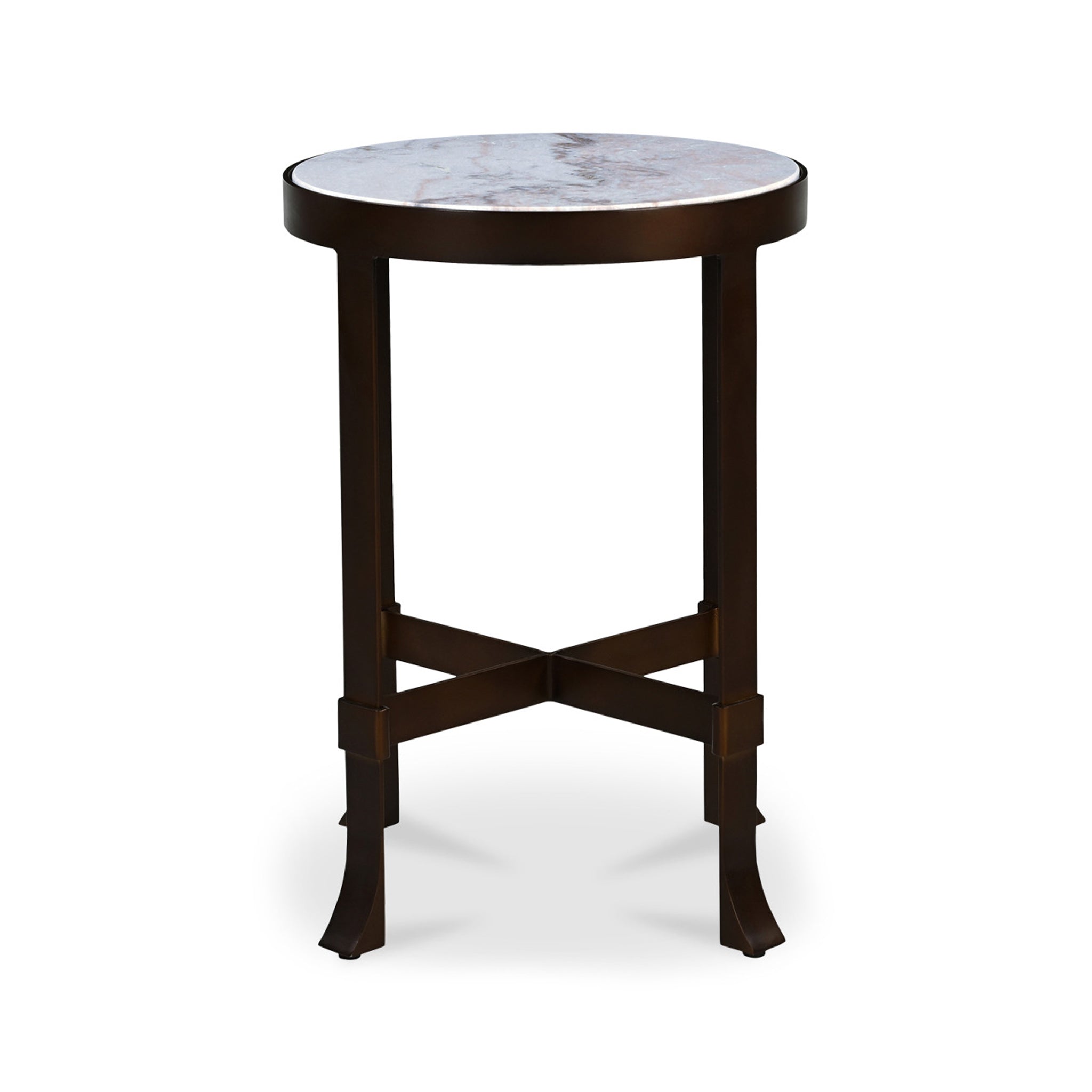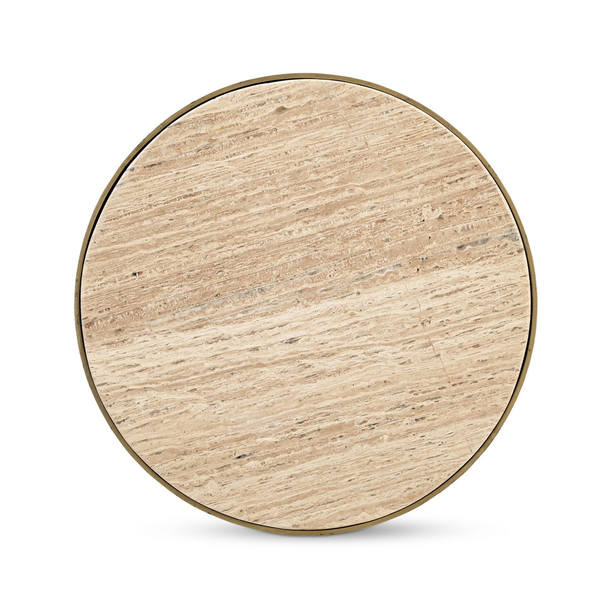 The Gisella side table blends timeless sleek iron, as its organic top rests within a subtle metal rim. The antique gold base, featuring gentle curves and distinctive buckle-like detail, showcases meticulous craftsmanship in a timeless hue.