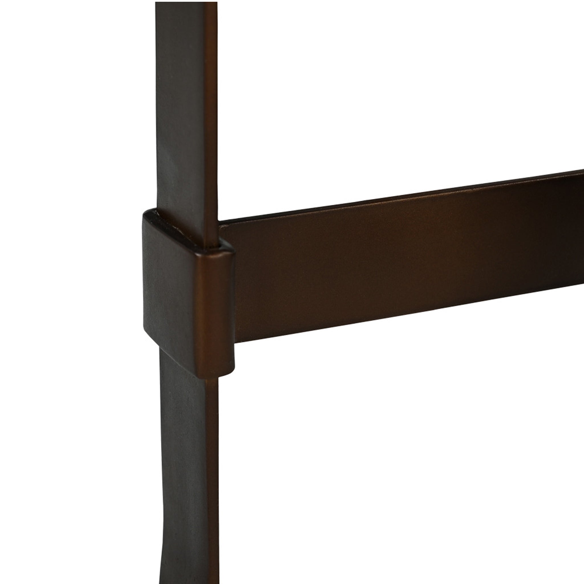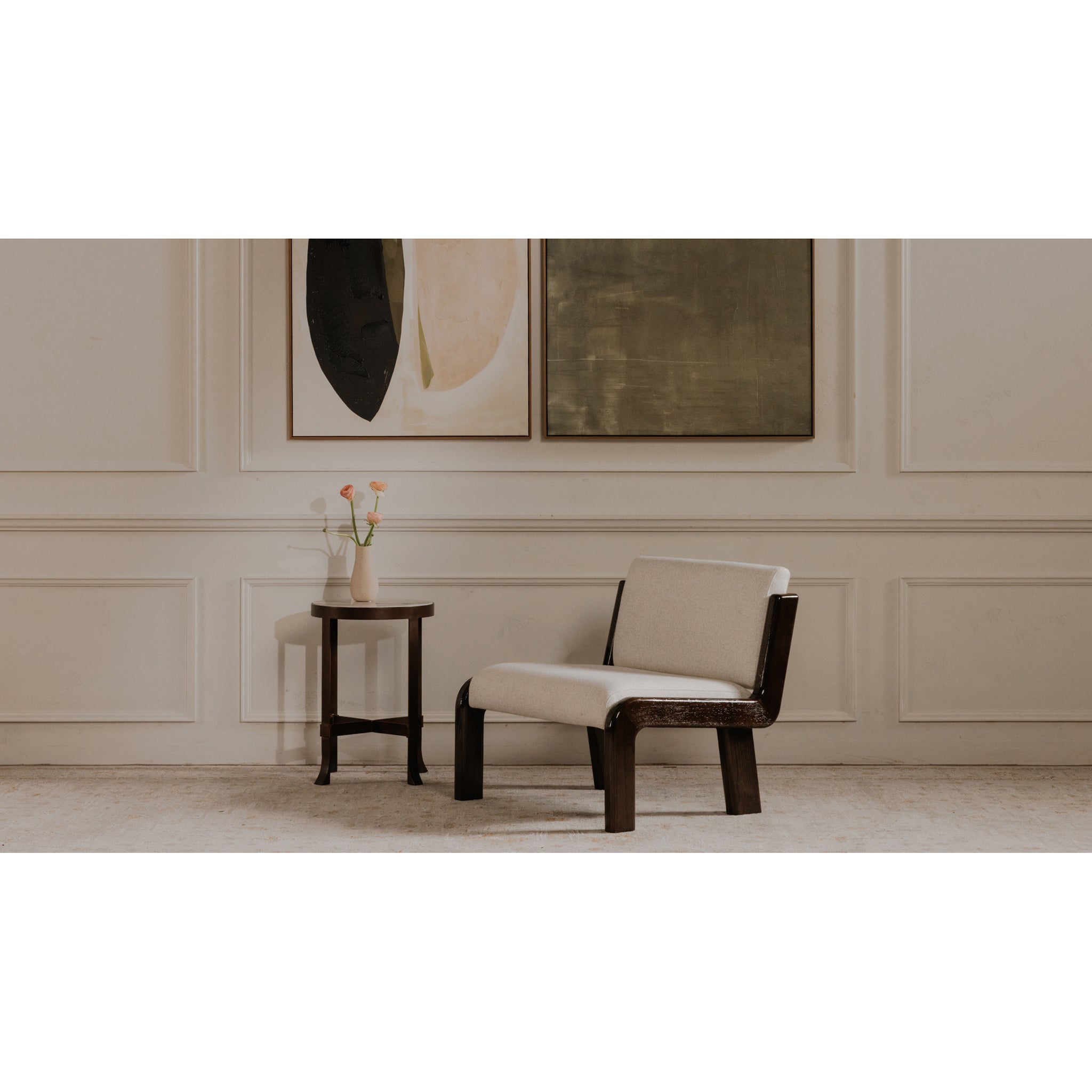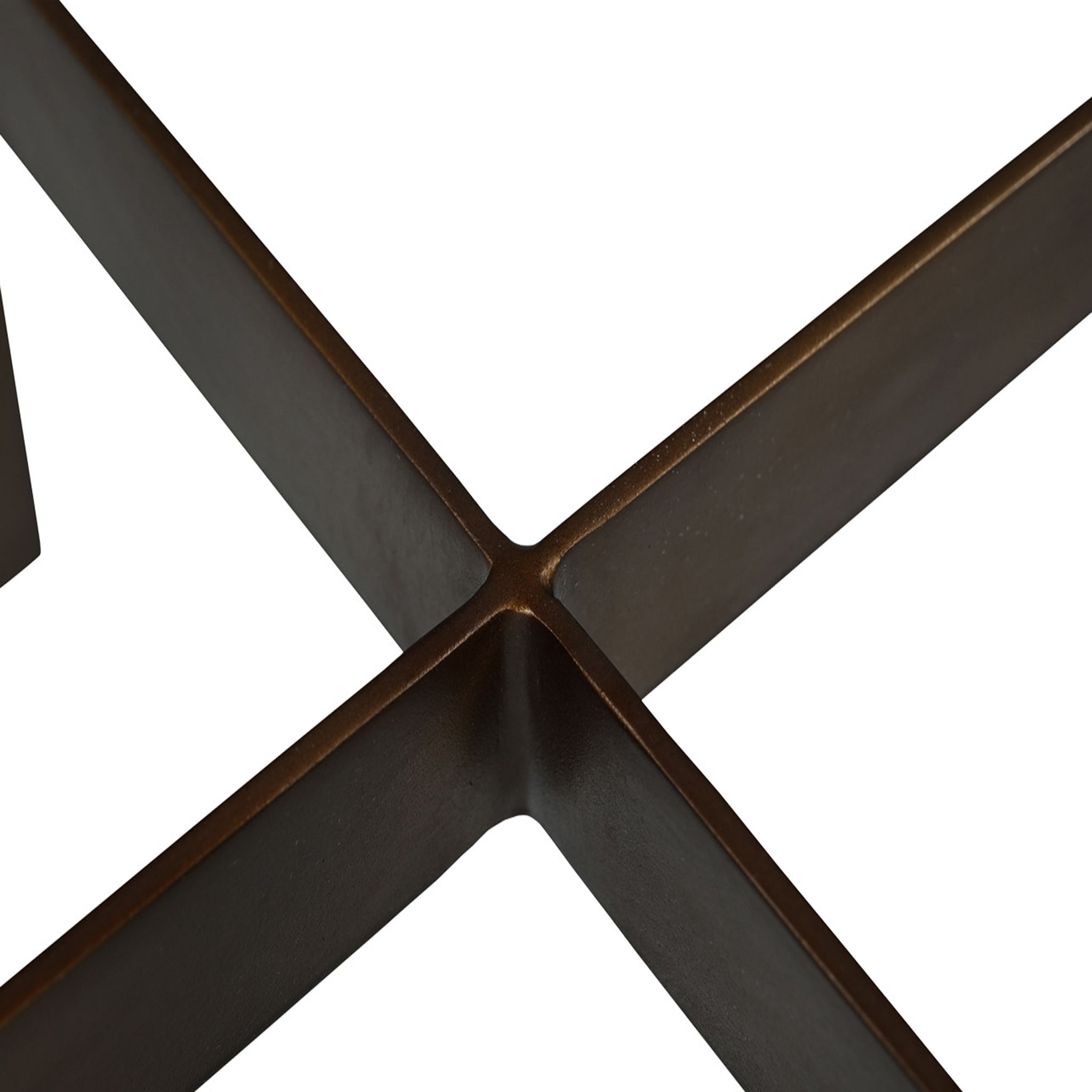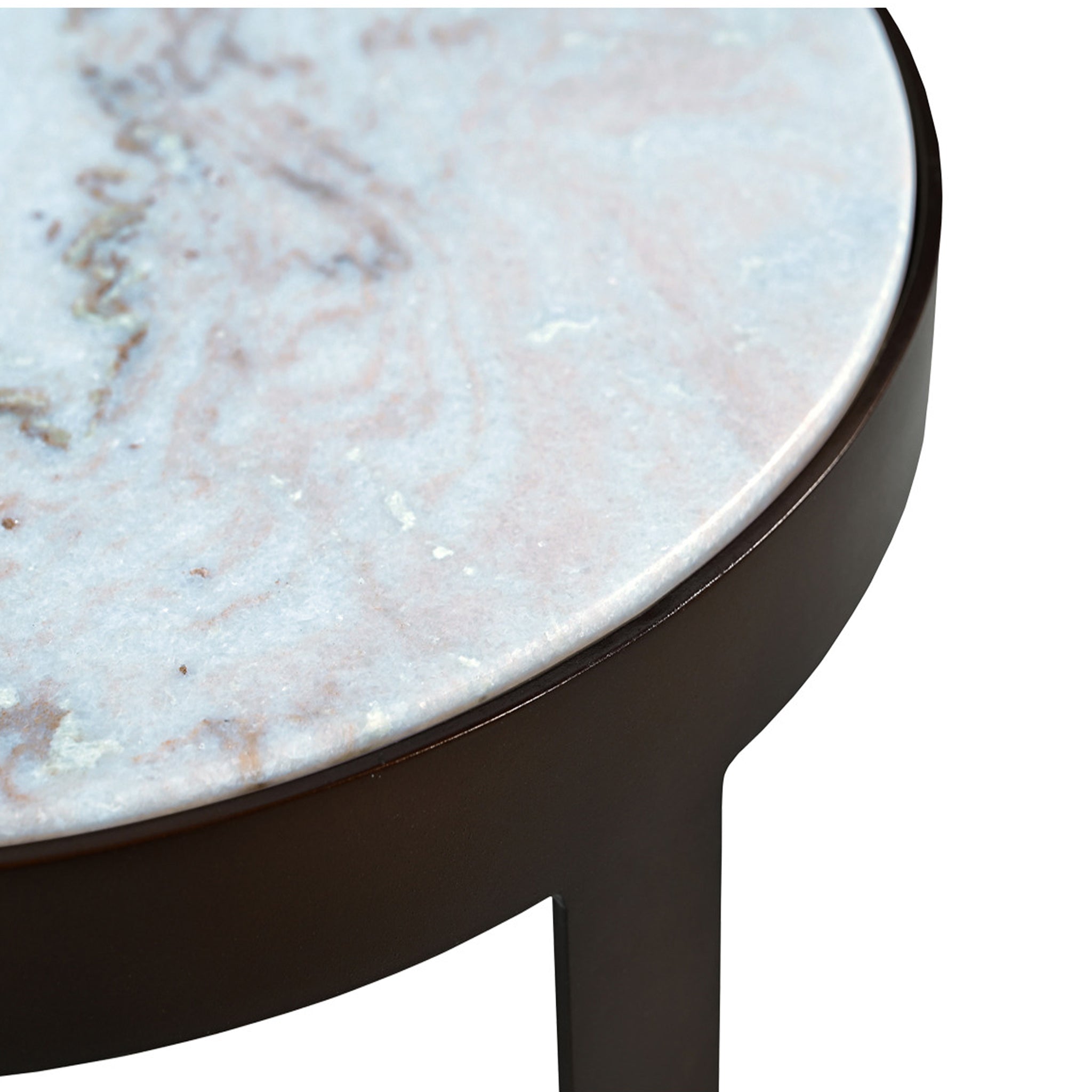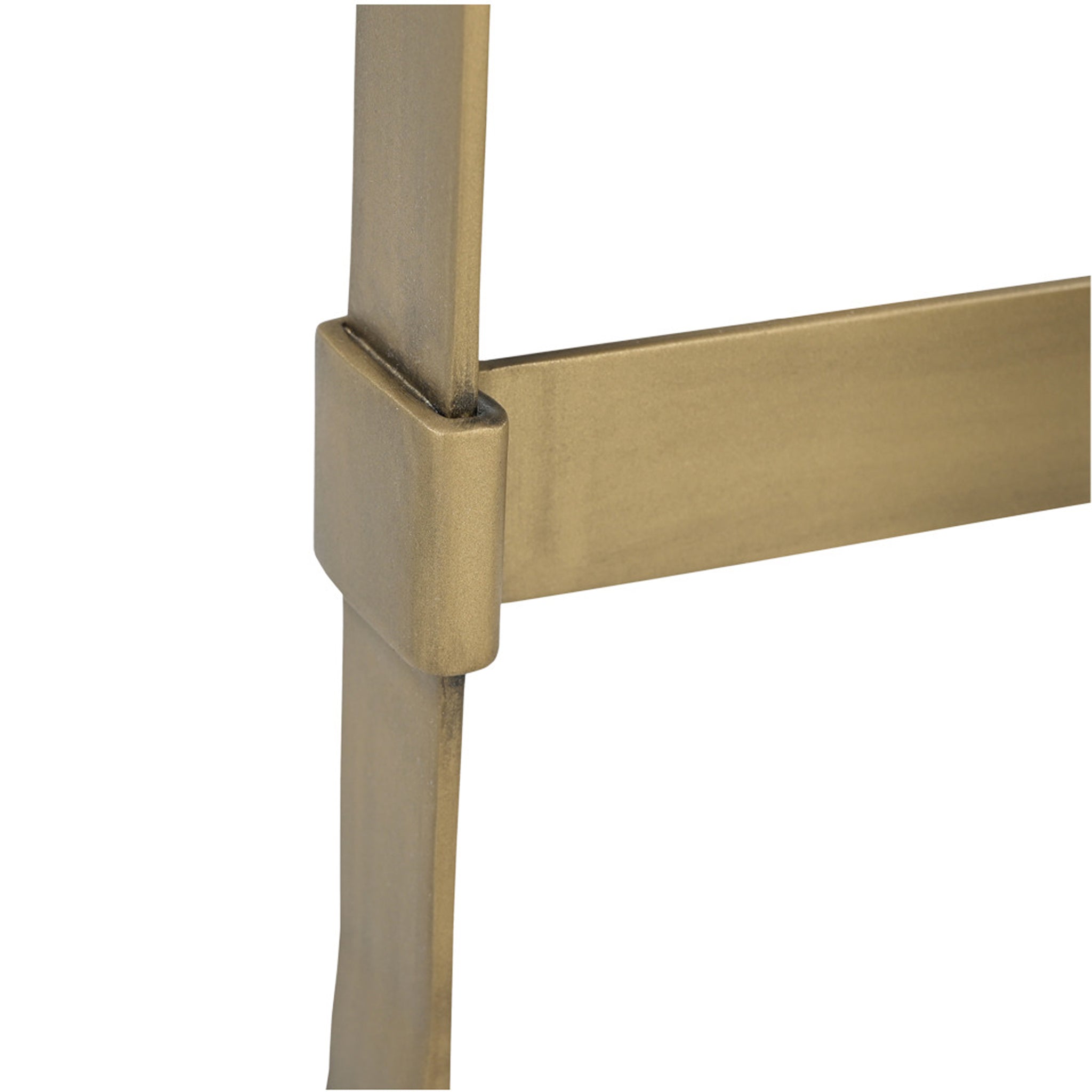 The Gisella side table blends timeless sleek iron, as its organic top rests within a subtle metal rim. The antique gold base, featuring gentle curves and distinctive buckle-like detail, showcases meticulous craftsmanship in a timeless hue.