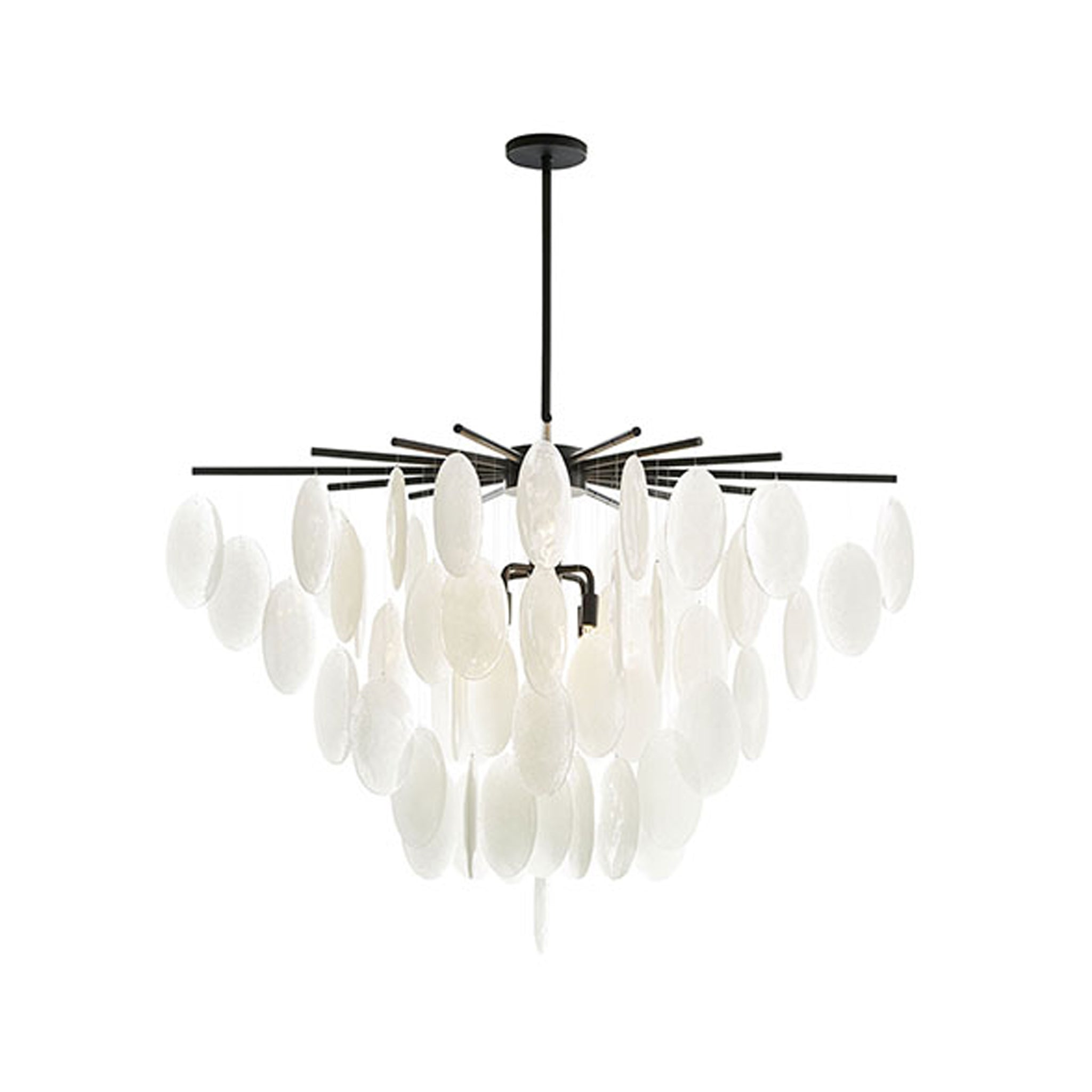 This eight-light chandelier is slightly whimsical. Frosted, seedy glass discs bring a modern feel to this stunning wind chime design. A blackened iron frame anchors the piece while adding a hint of industrialism. Finish may vary. Shown with a clear tubular bulb.